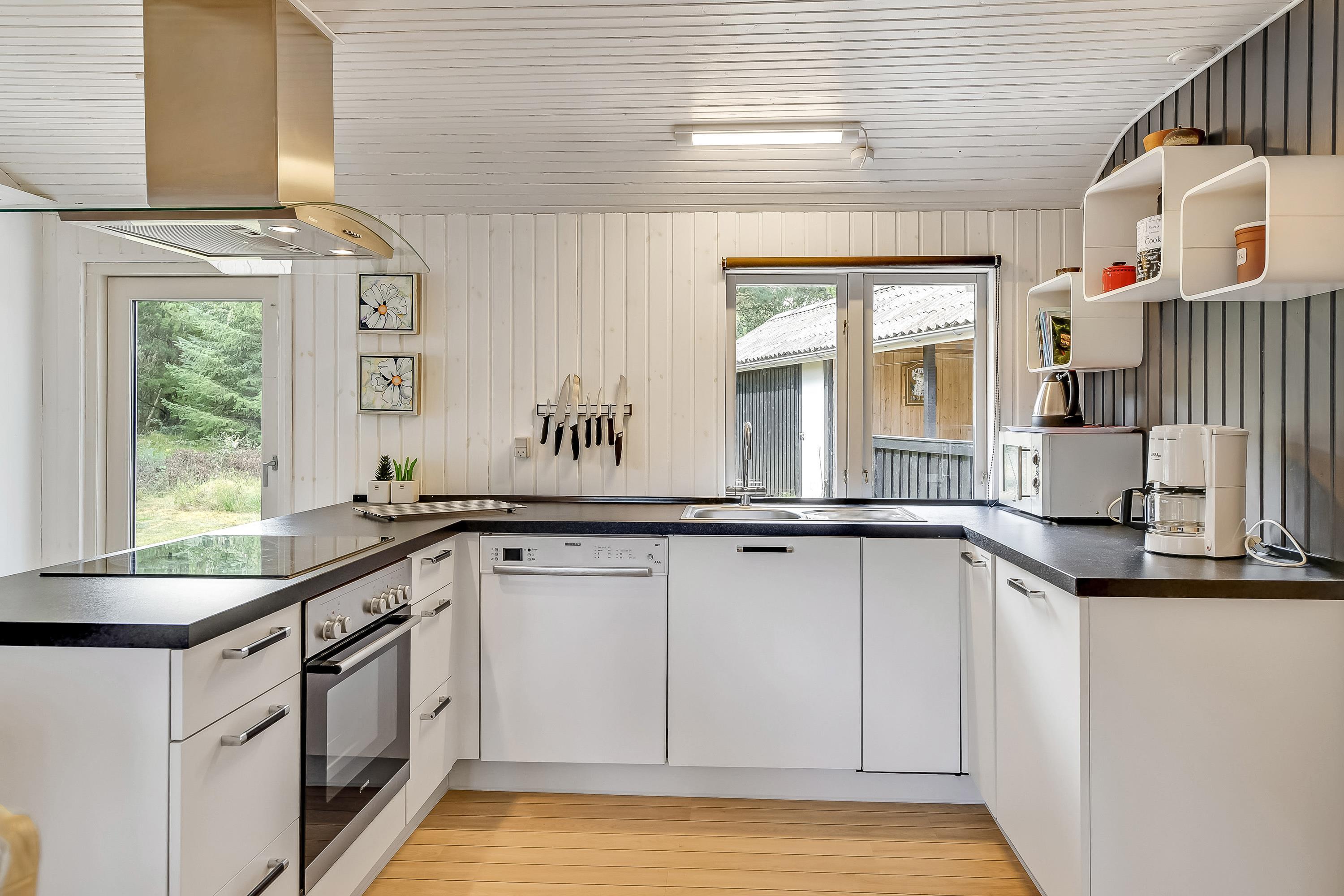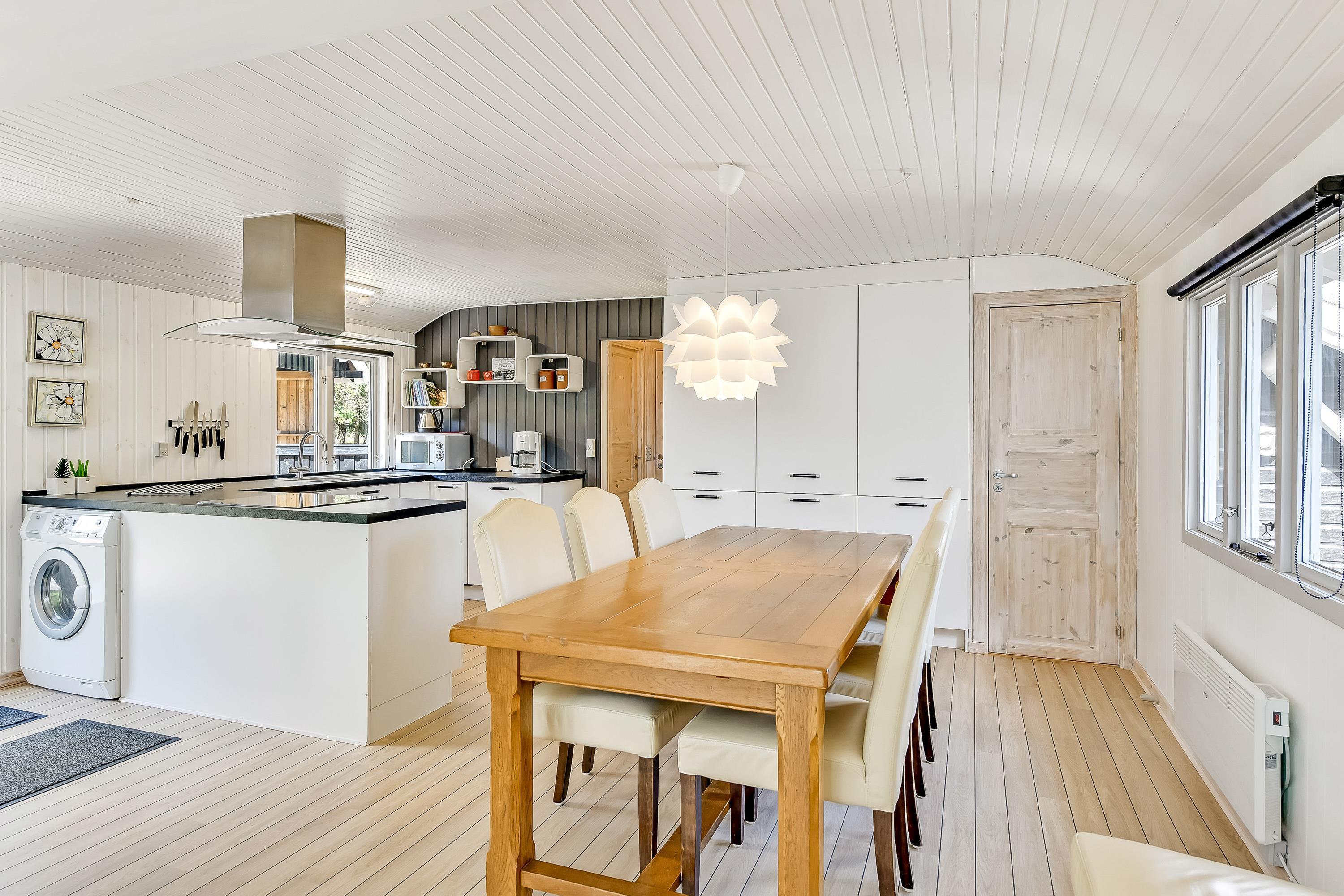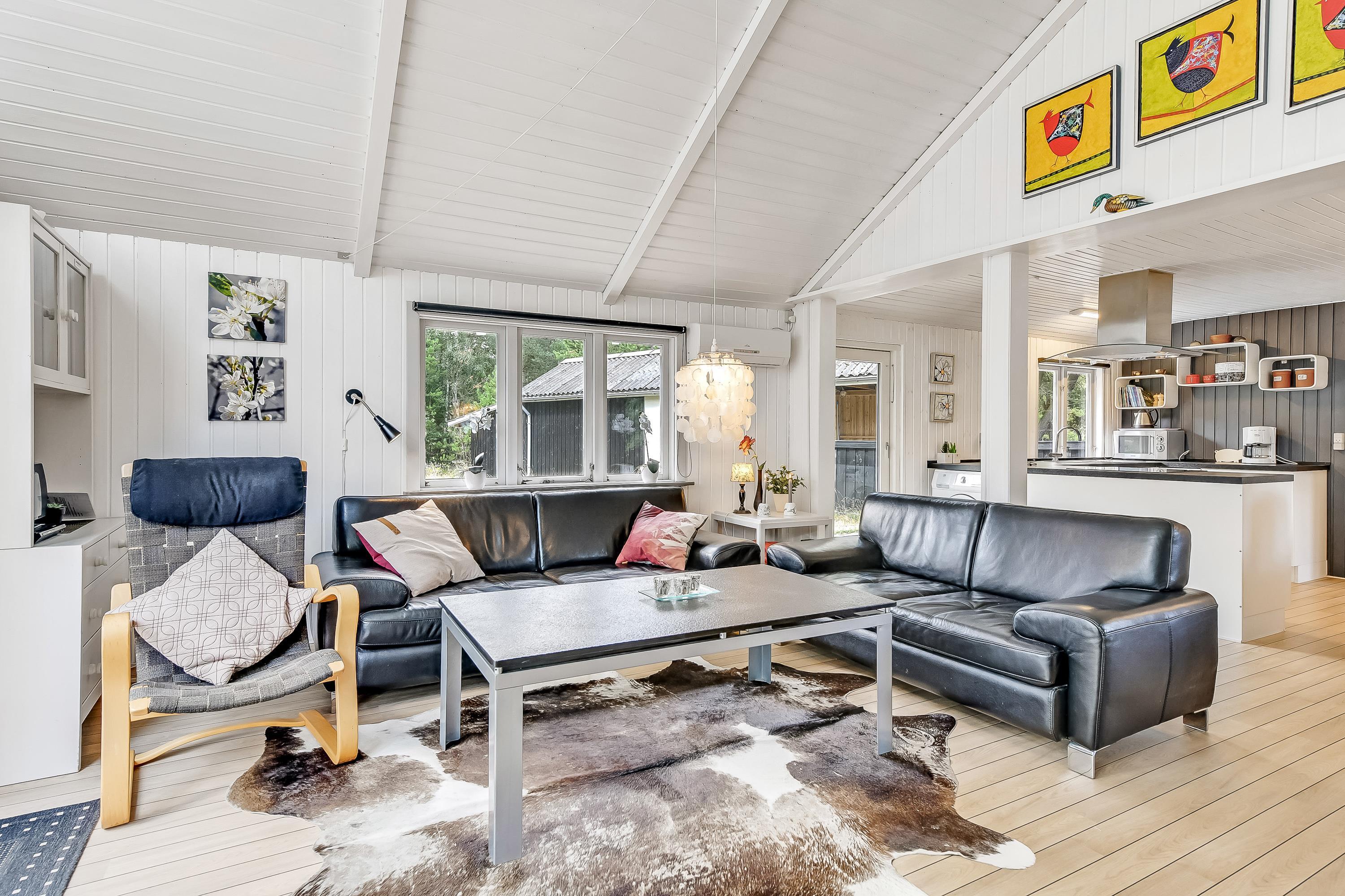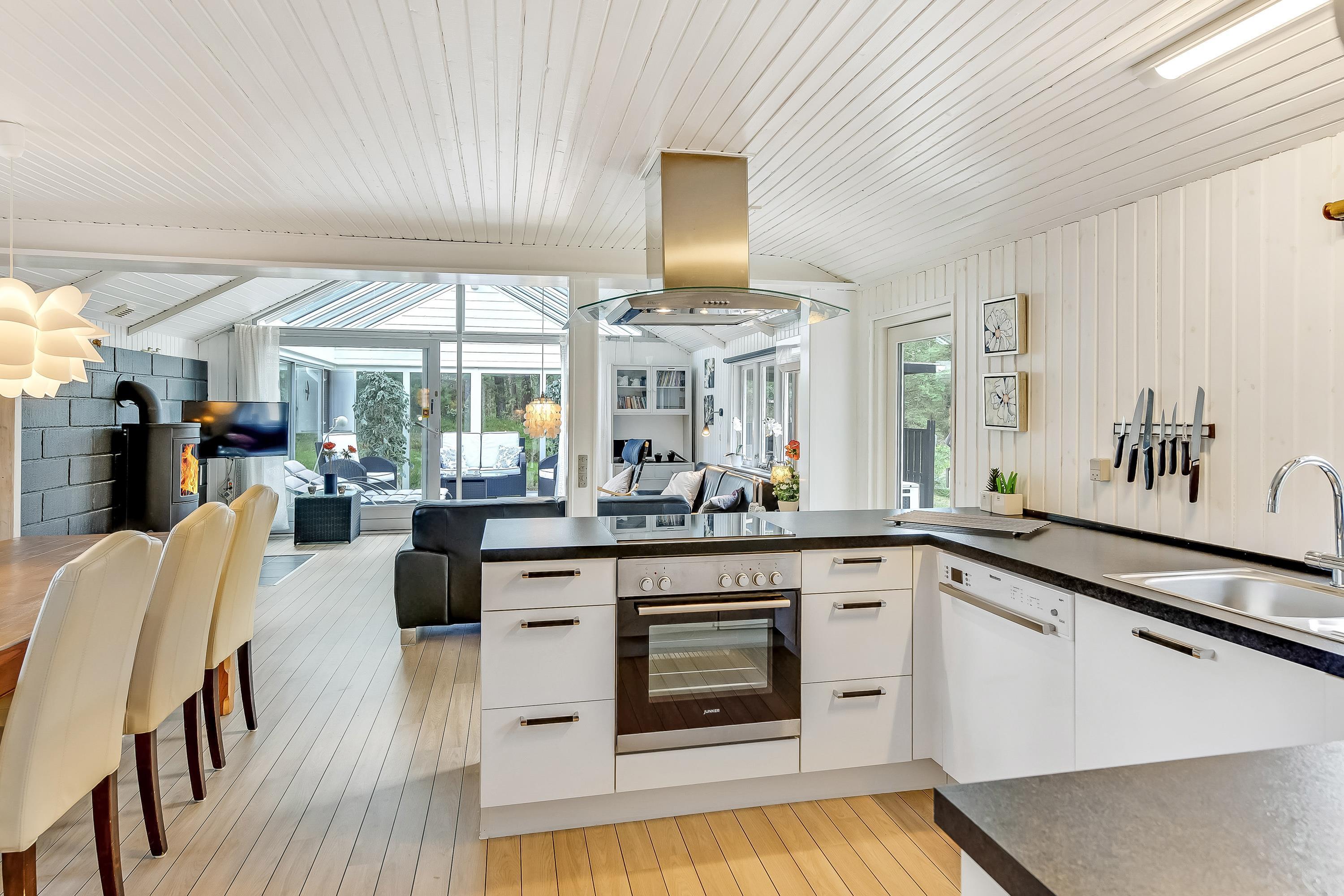 Det lyse køkken er åbent ud til den hyggelige stue, hvor brændeovnens knistren og hyggeskabende varme er et hit, når vinden suser i træerne udenfor og mørket sænker sig. Så kan I slænge jer med en god krimi i de bekvemme sofaer eller se en god film på det store fladskærms-tv.