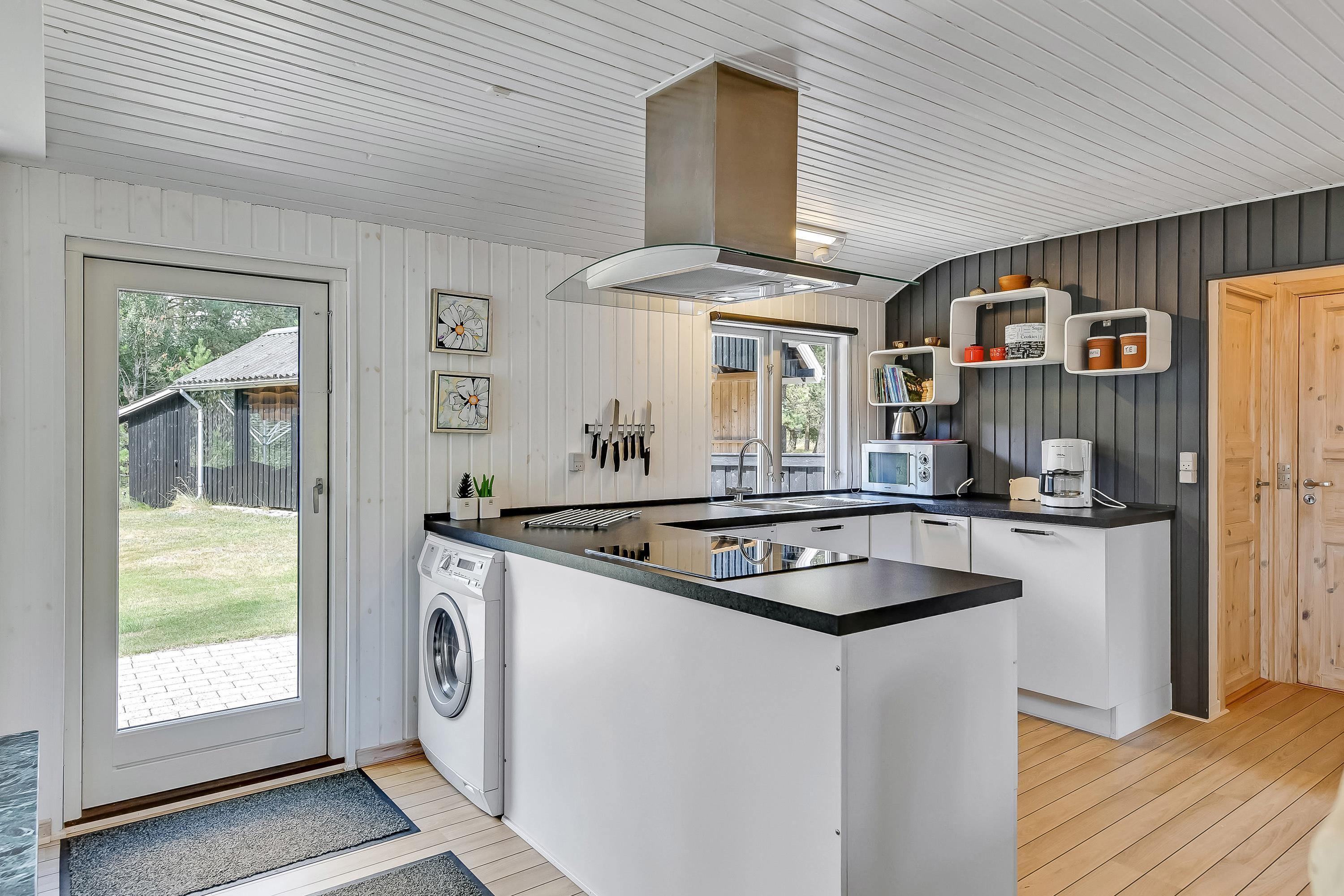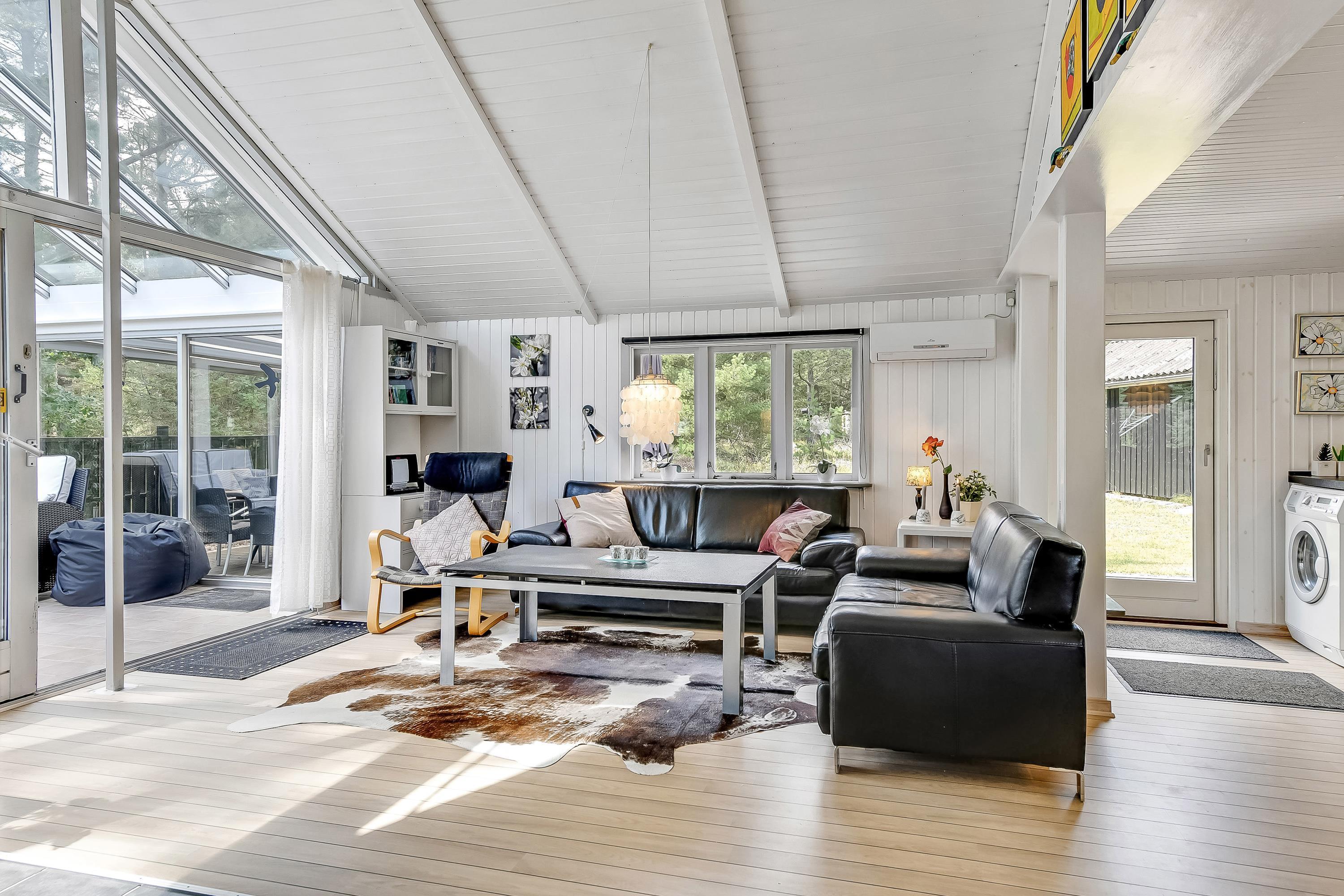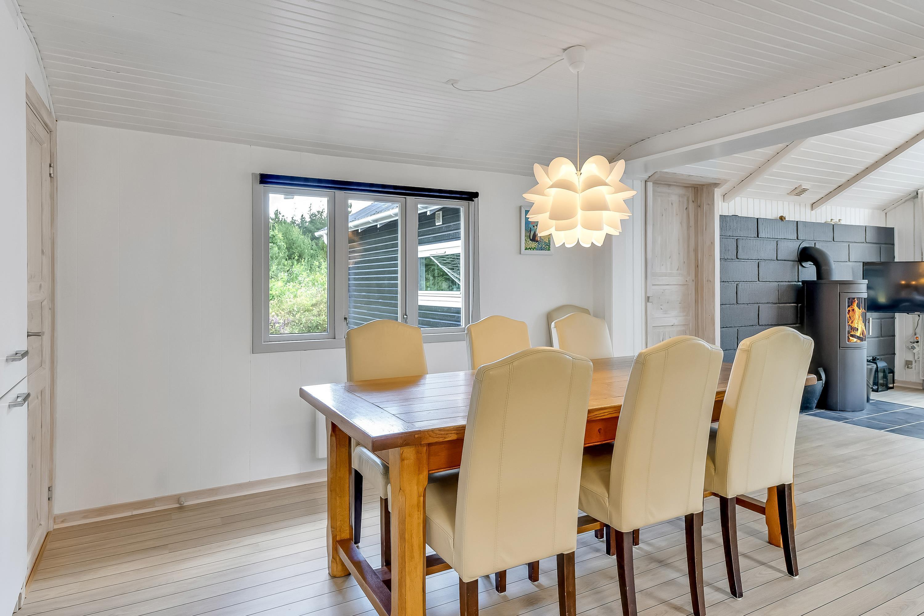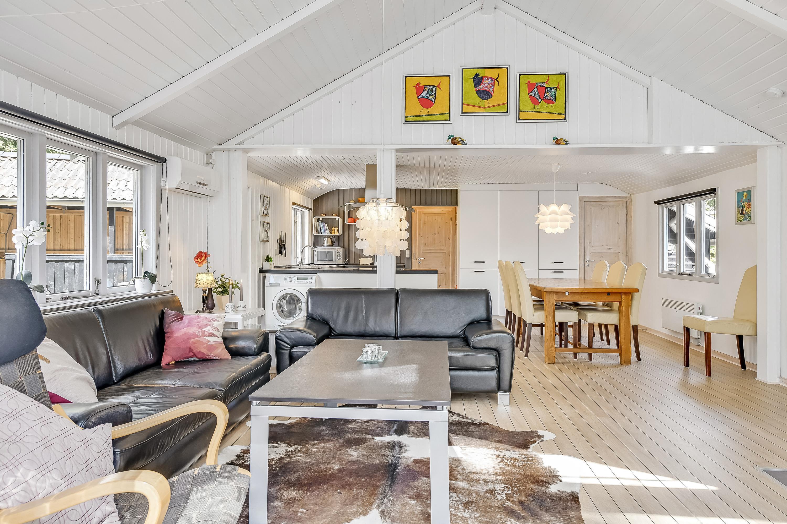Det lyse køkken er åbent ud til den hyggelige stue, hvor brændeovnens knistren og hyggeskabende varme er et hit, når vinden suser i træerne udenfor og mørket sænker sig. Så kan I slænge jer med en god krimi i de bekvemme sofaer eller se en god film på det store fladskærms-tv.
