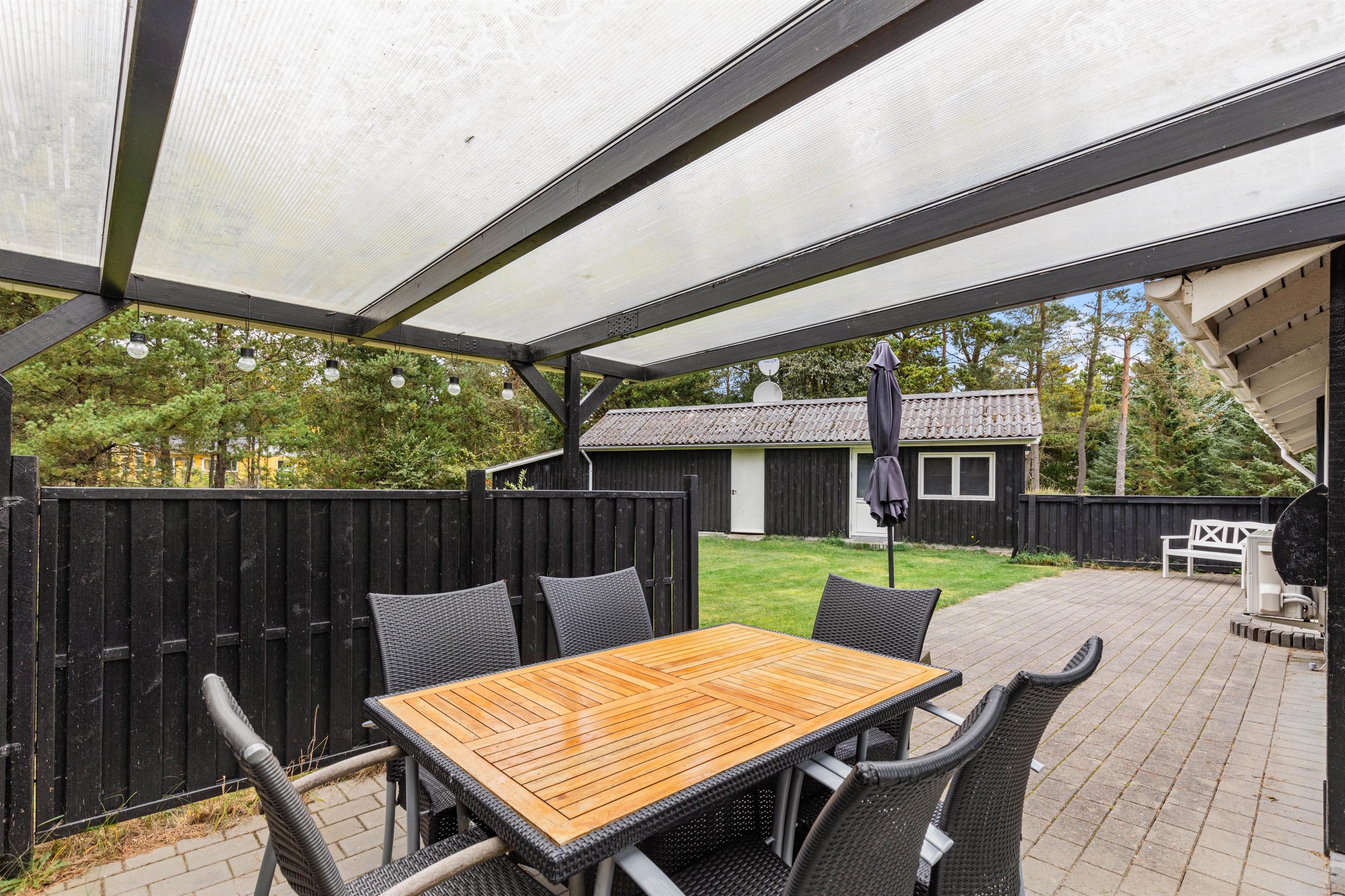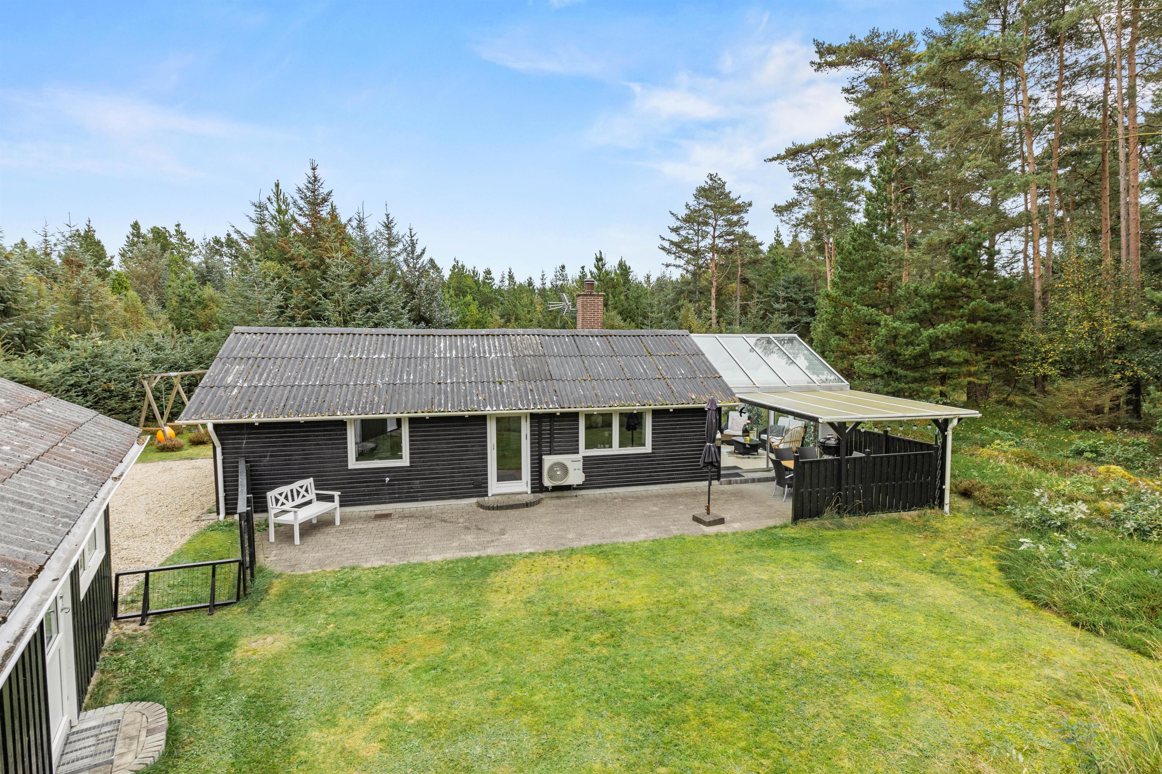 Overdækket terrasse med blik på naturgrund og legeredskaber