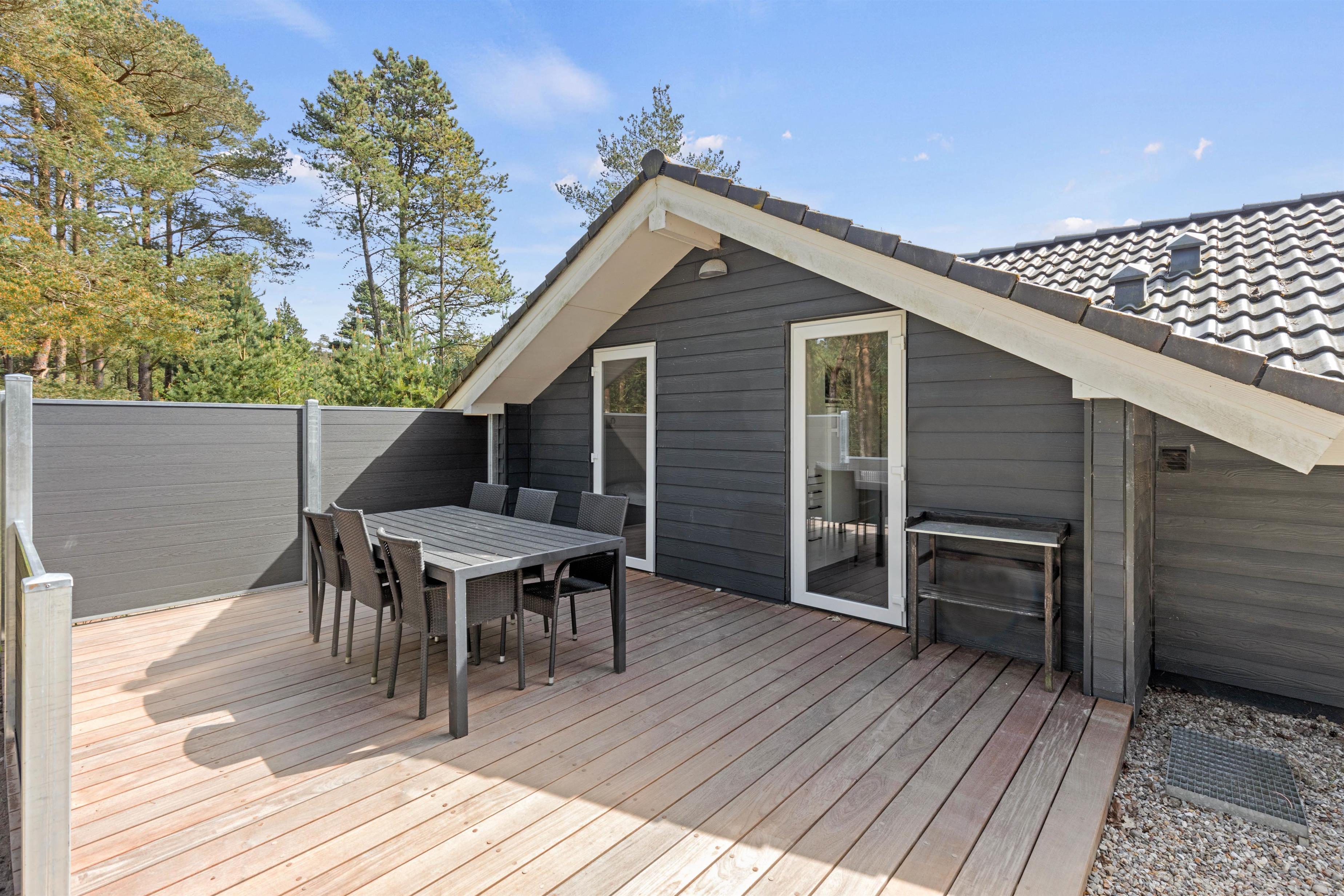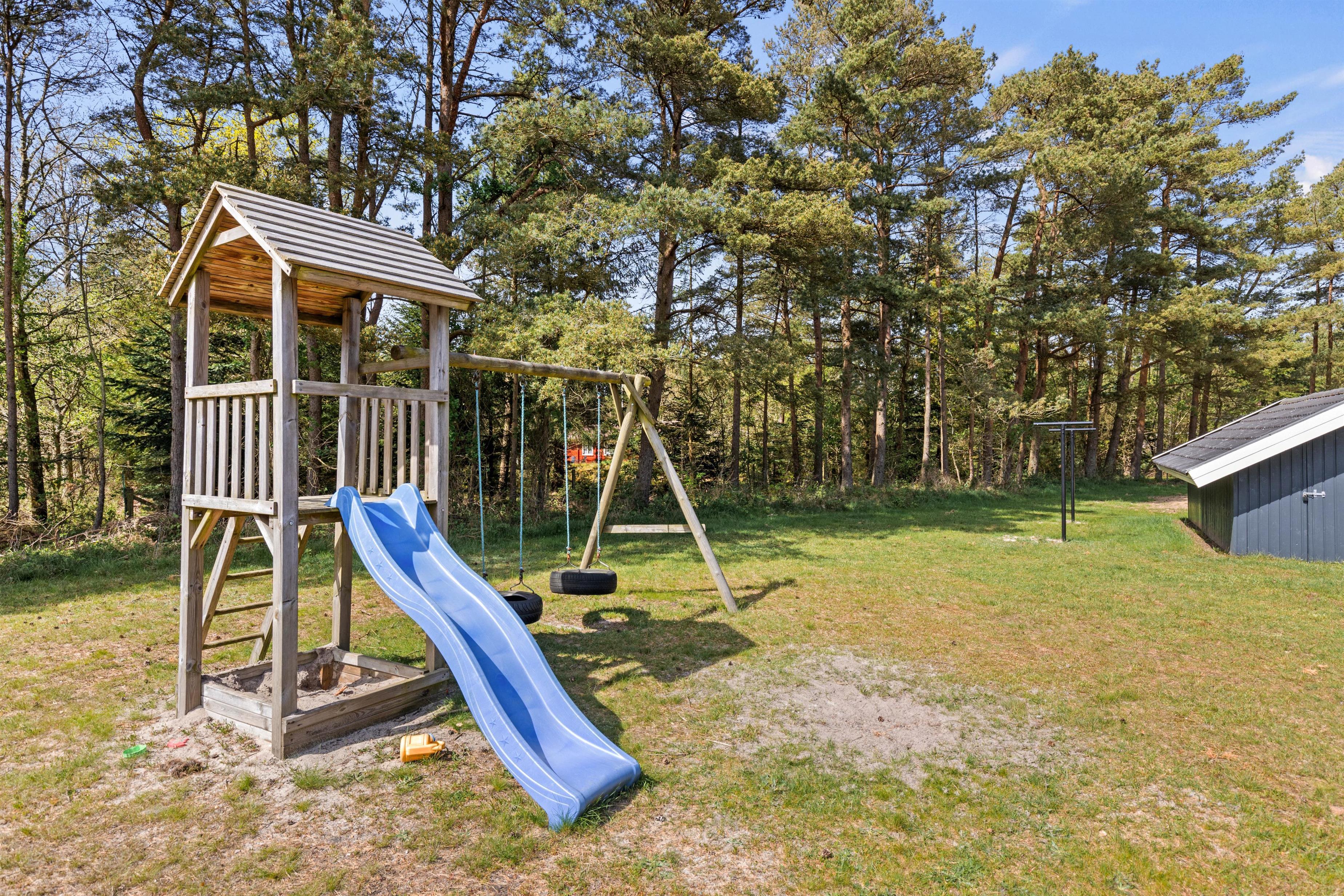 Hele den 2771 km store grund er omkranset af træer, så I kan sidde ugeneret på den store træterrasse og nyde solen og udelivet. De mange terrasser indbyder til gode måltider fra grillen og afslapning på liggestolene. På grunden er der god plads til leg med hunden eller for børnene, der også kan brænde lidt energi af i lege- og gyngestativet.