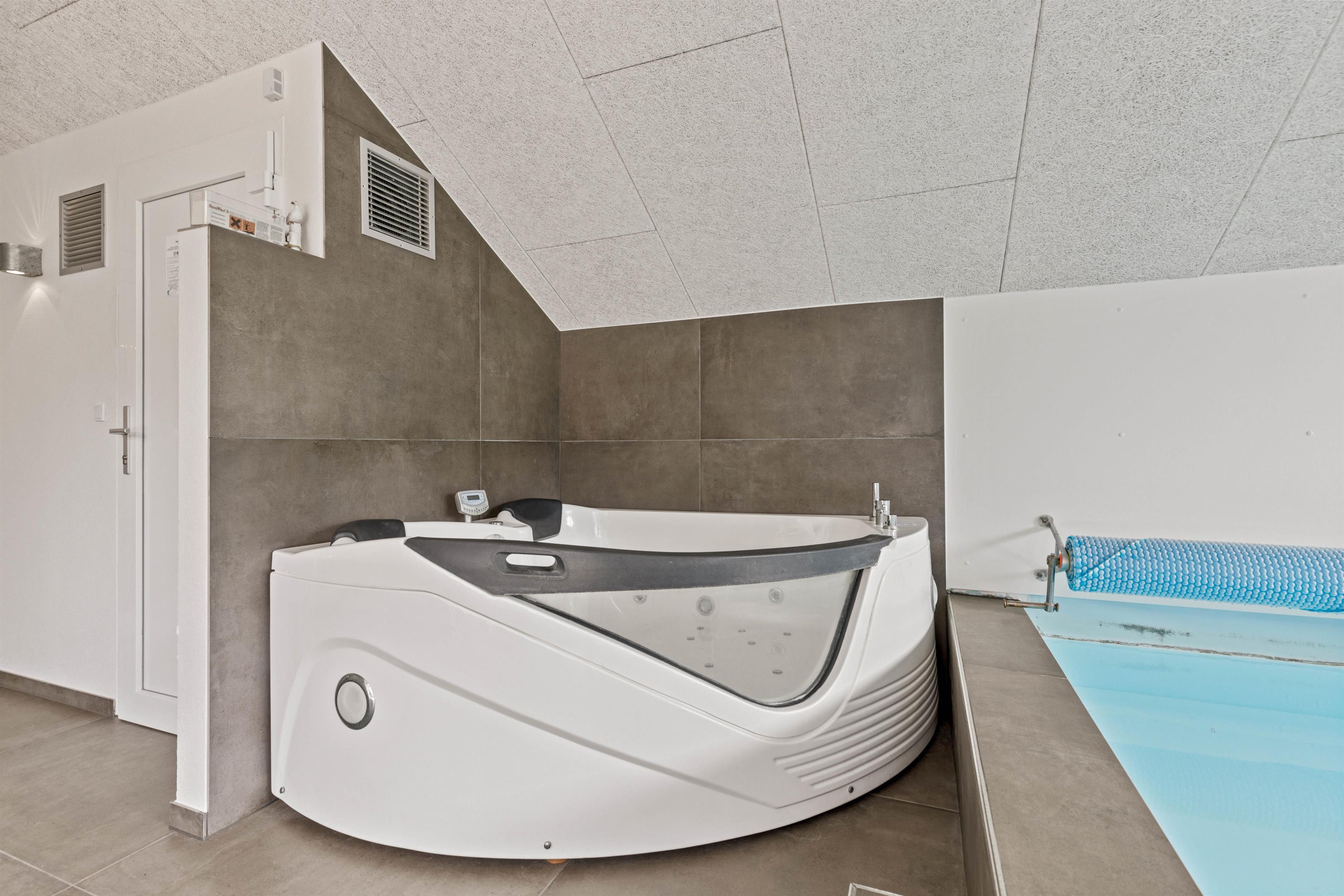 Den flotte afdeling med spa, pool og sauna vil kunne fornøje de vandglade gæster i mange timer, og skulle en af jer trænge til en pause, er der direkte kig ud i poolrummet fra stuen, så I kan følge med i løjerne.