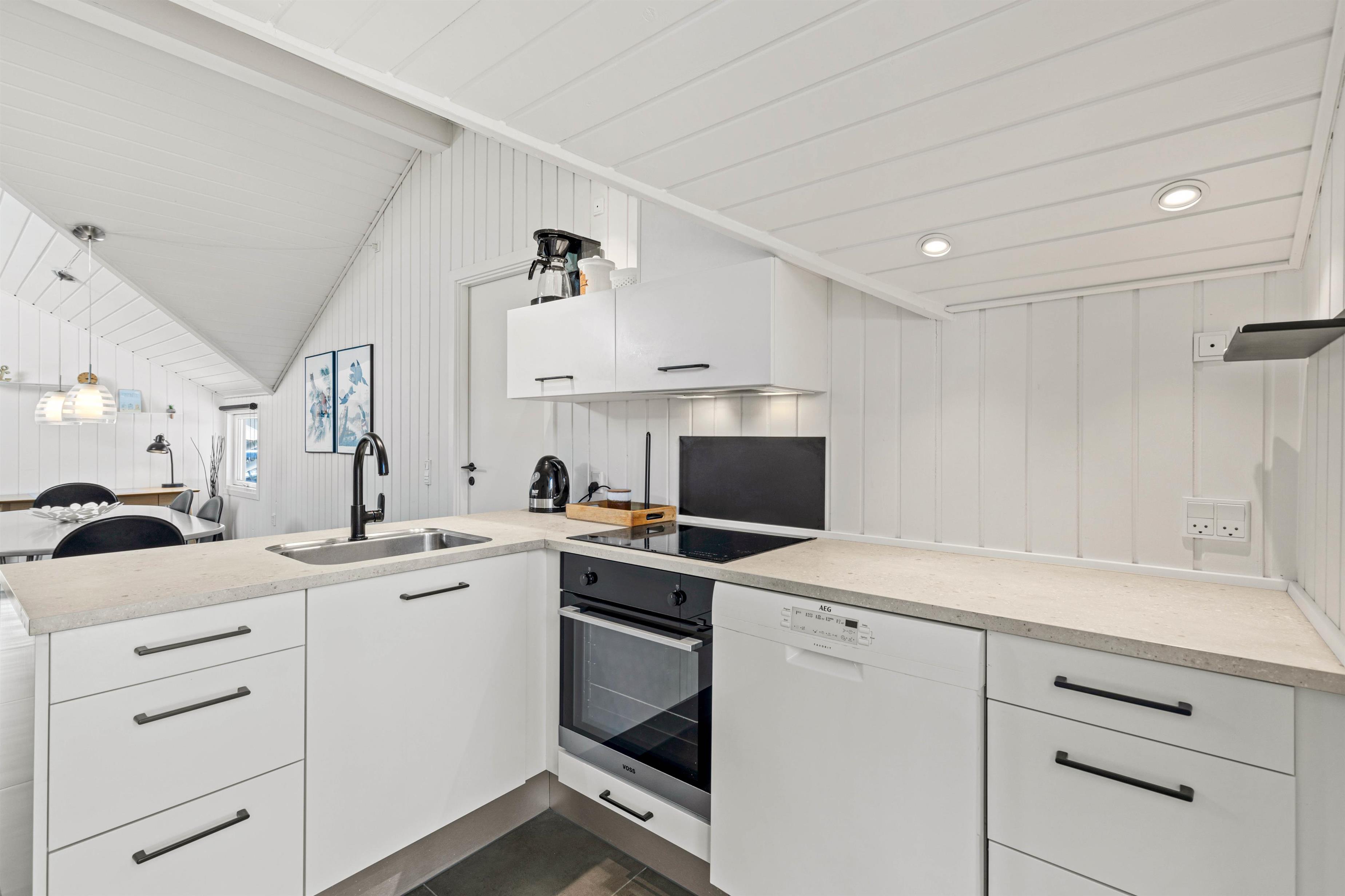 De 118 m2 er indrettet godt og uden spildplads, så alle kvadratmeter kan bruges på hygge og samvær. Vinkelkøkkenet er udstyret med alle nødvendige hvidevarer: opvaskemaskine, mikroovn, ovn og induktionskogeplade og vender ud mod feriehusets fællesrum.