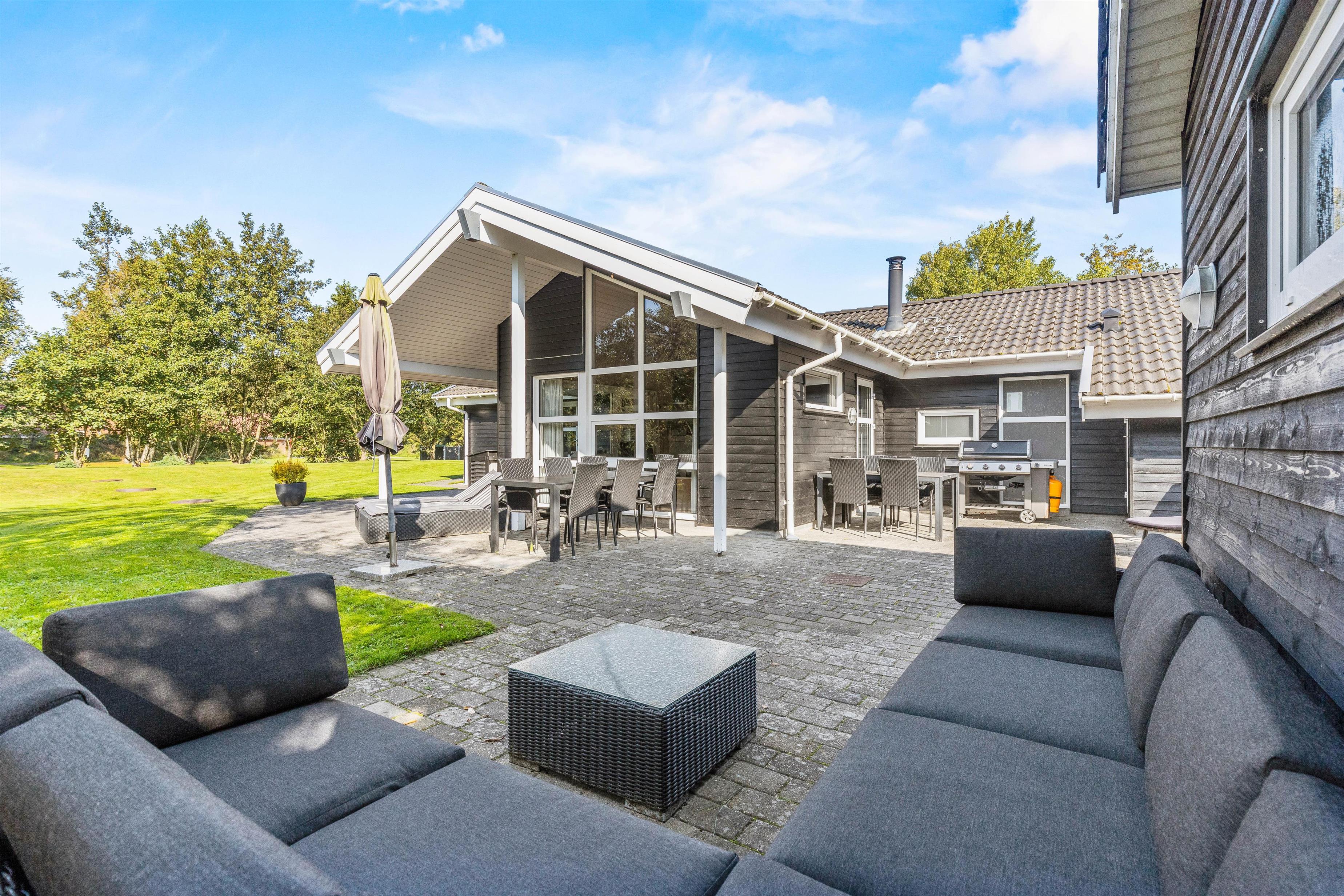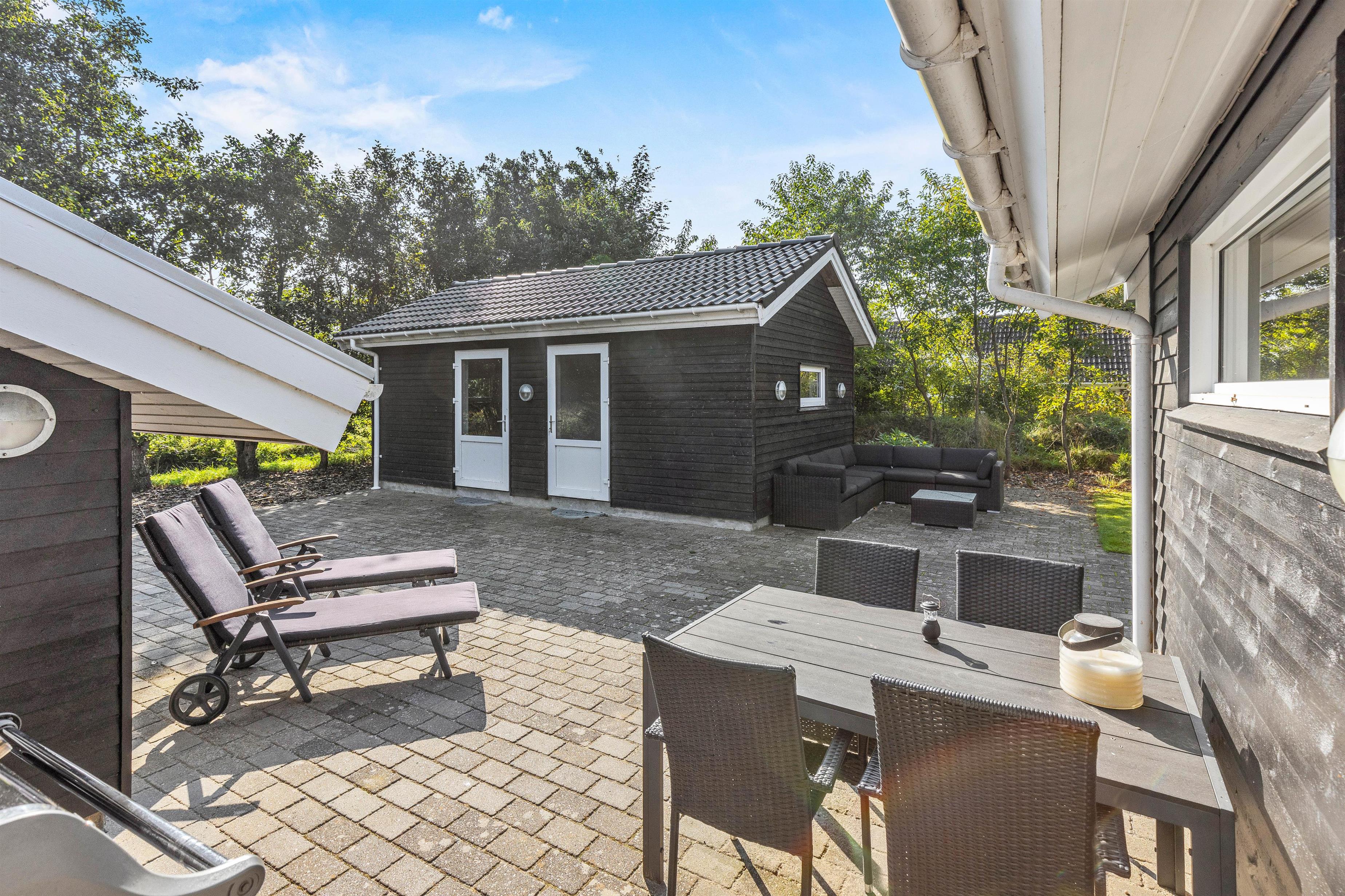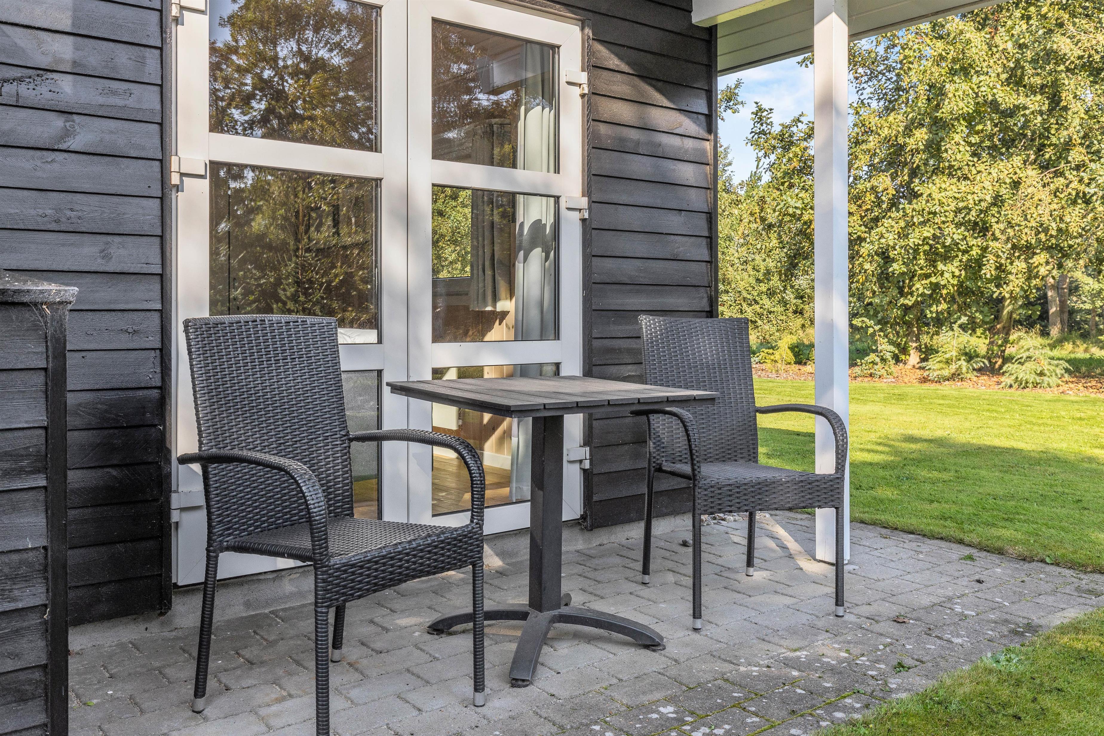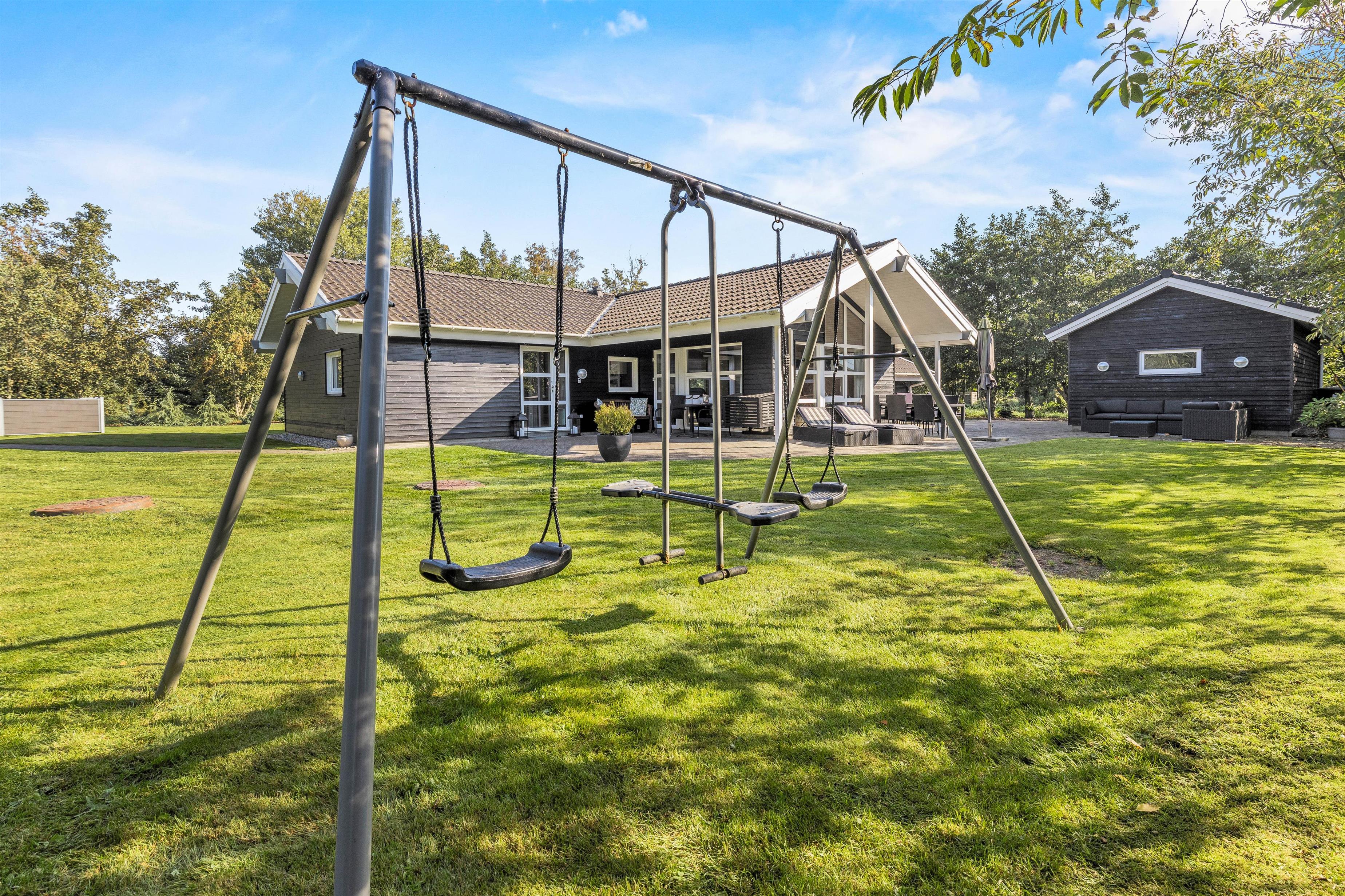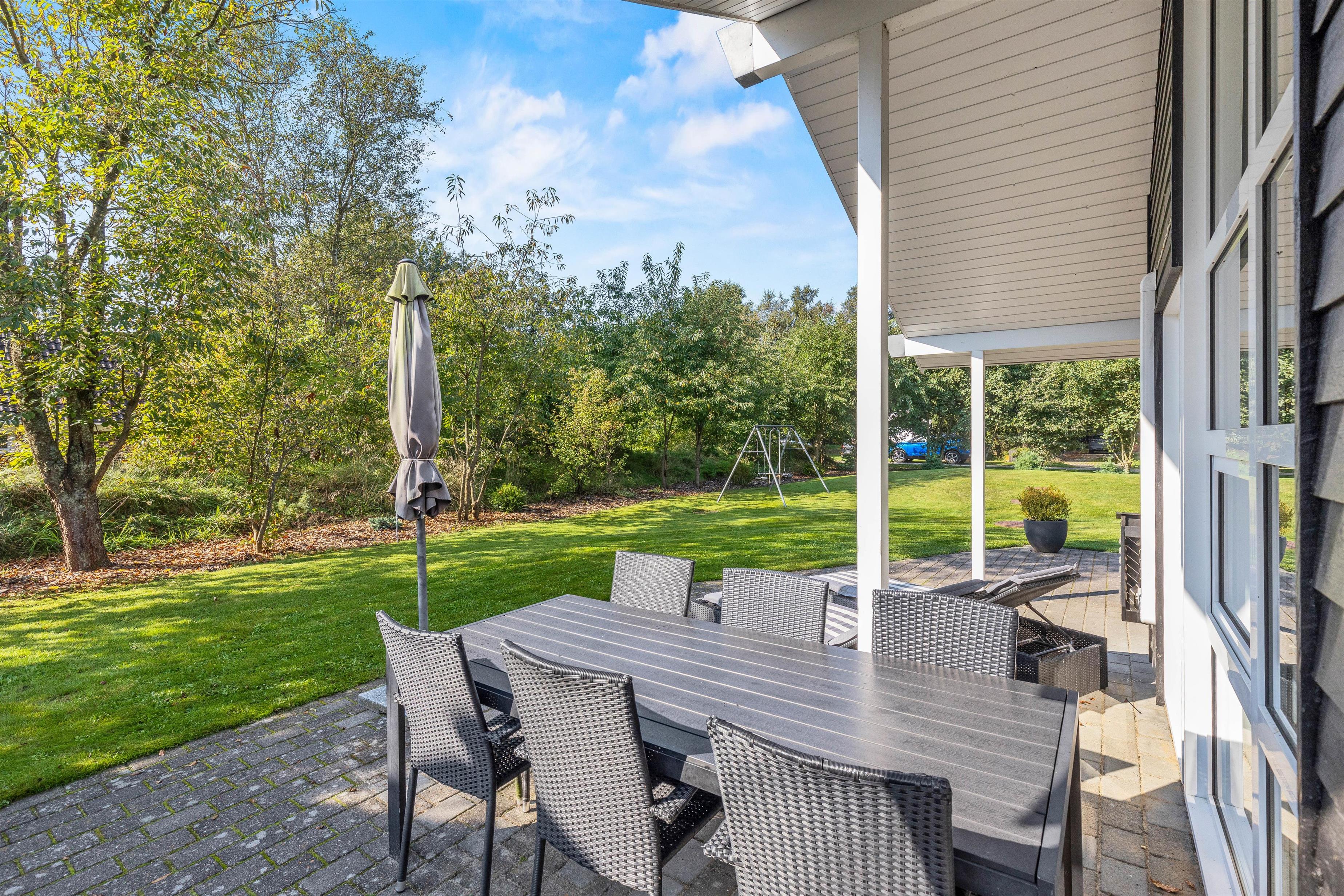 På den afskærmede terrasse kan I nyde solen på de komfortable liggestole, imens børnene leger i sandkassen eller gyngerne. Nyd frokosten udendørs ved spisepladsen under den overdækkede del af terrassen, og slut eventuelt dagen af med en grillaften, imens solen går ned. Har I energi til det, kan I spille et vikingespil på græsplænen, imens skyggerne bliver lange.