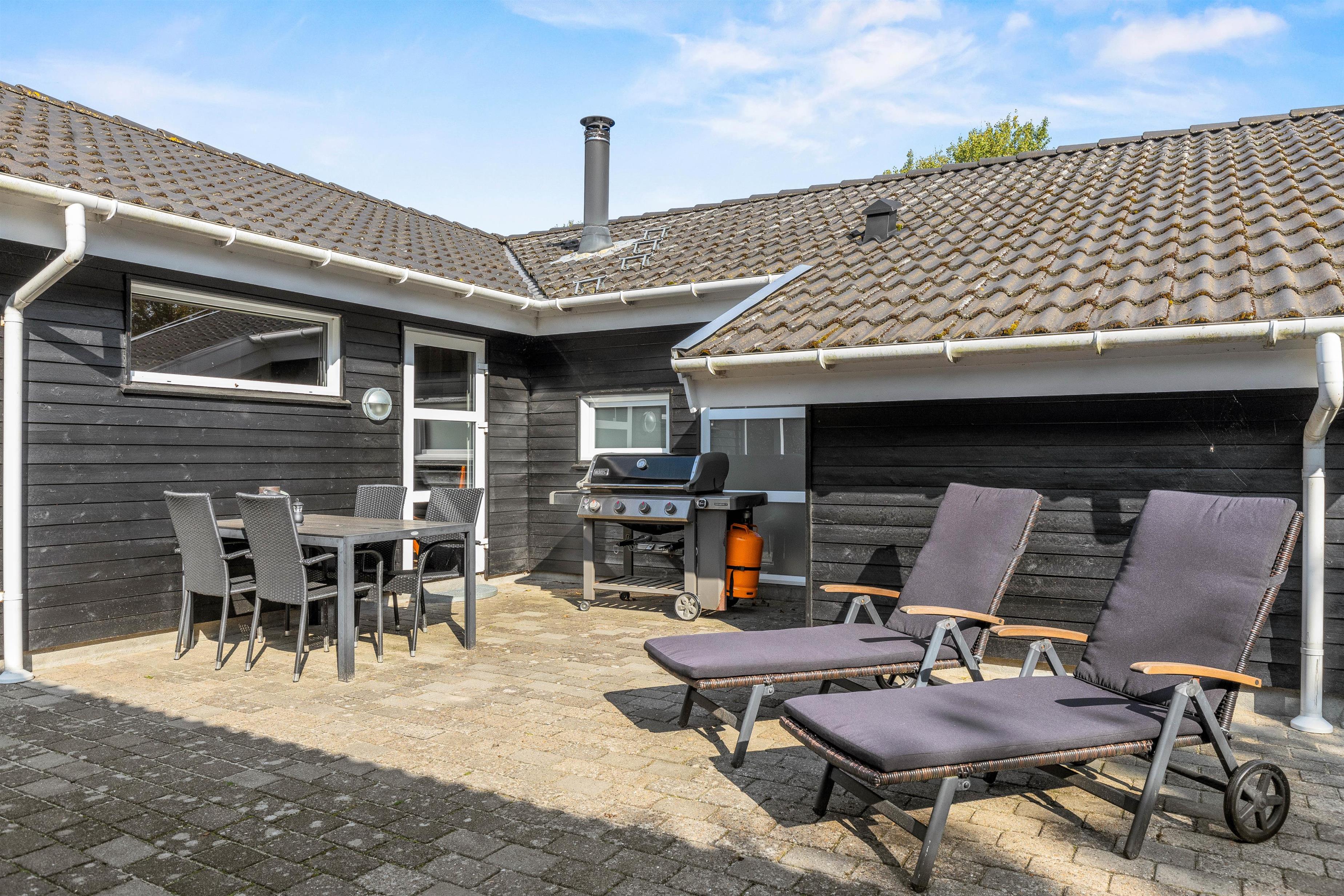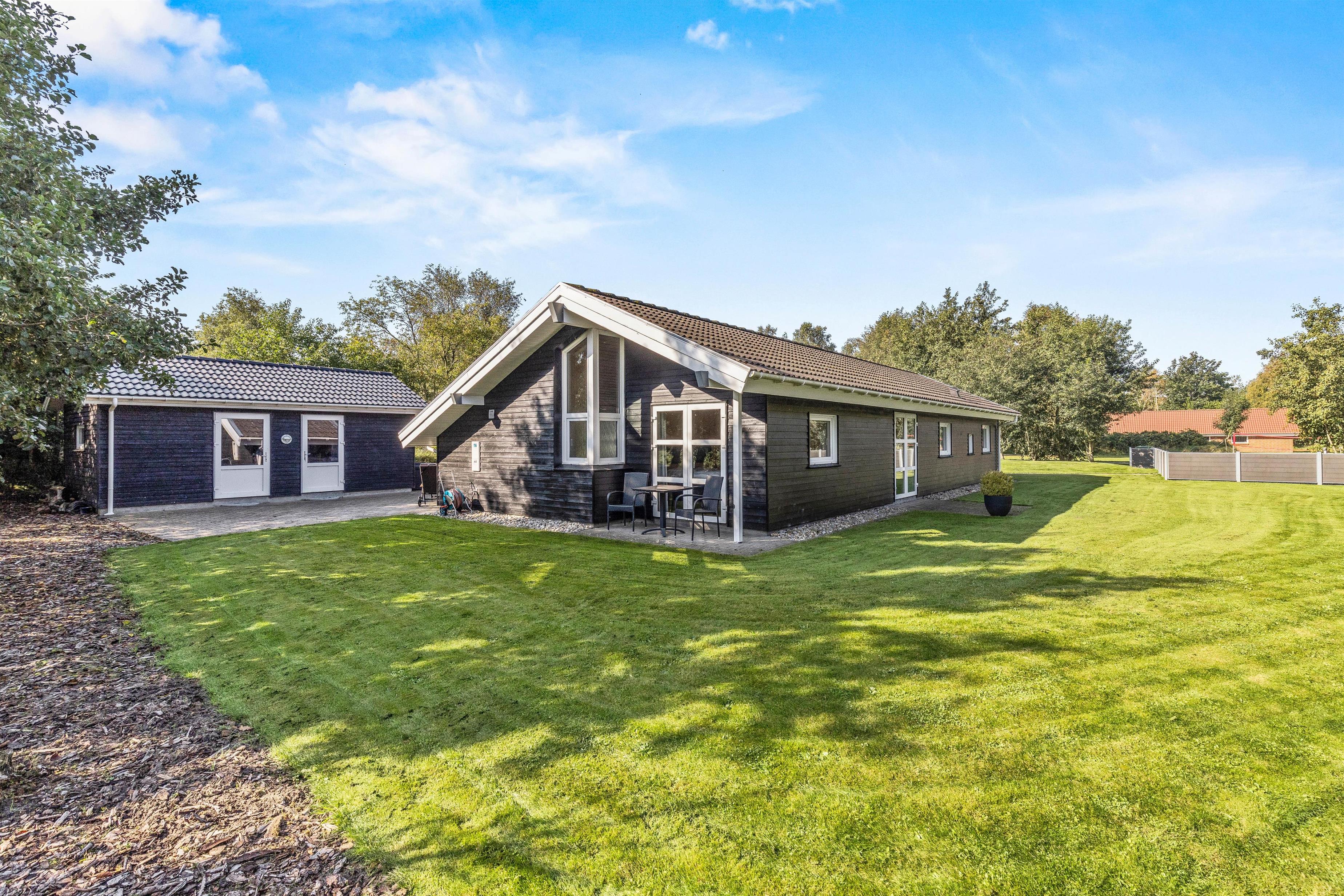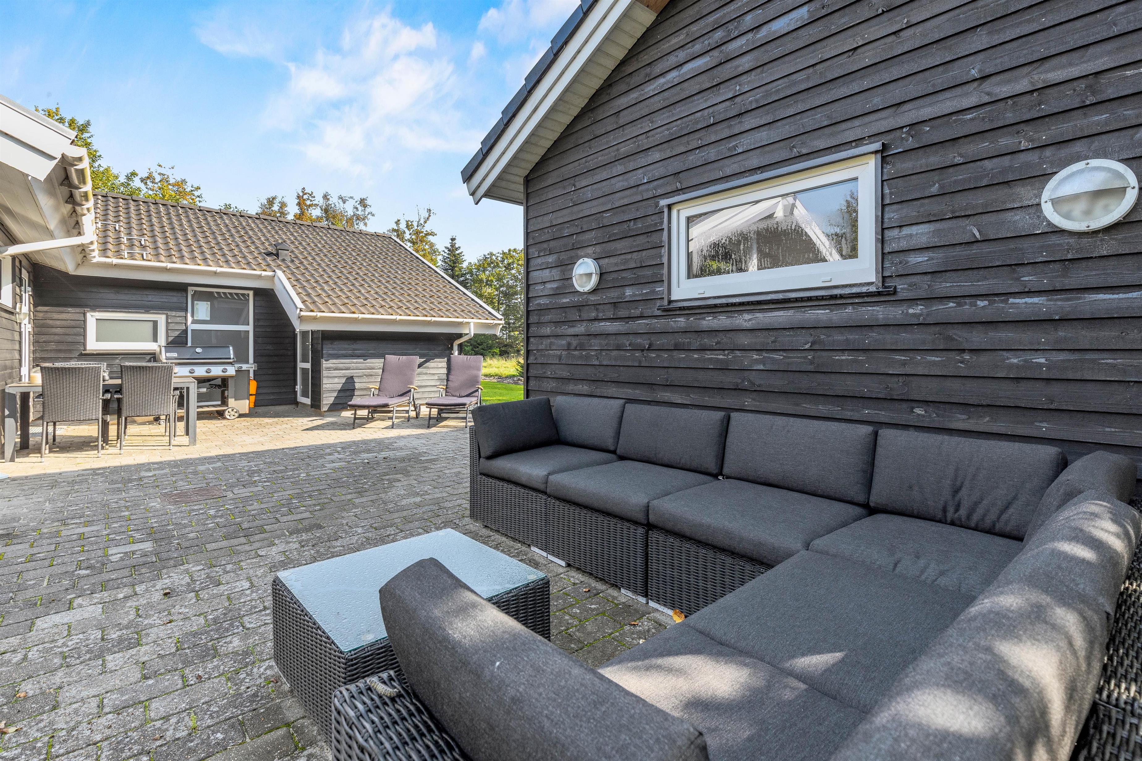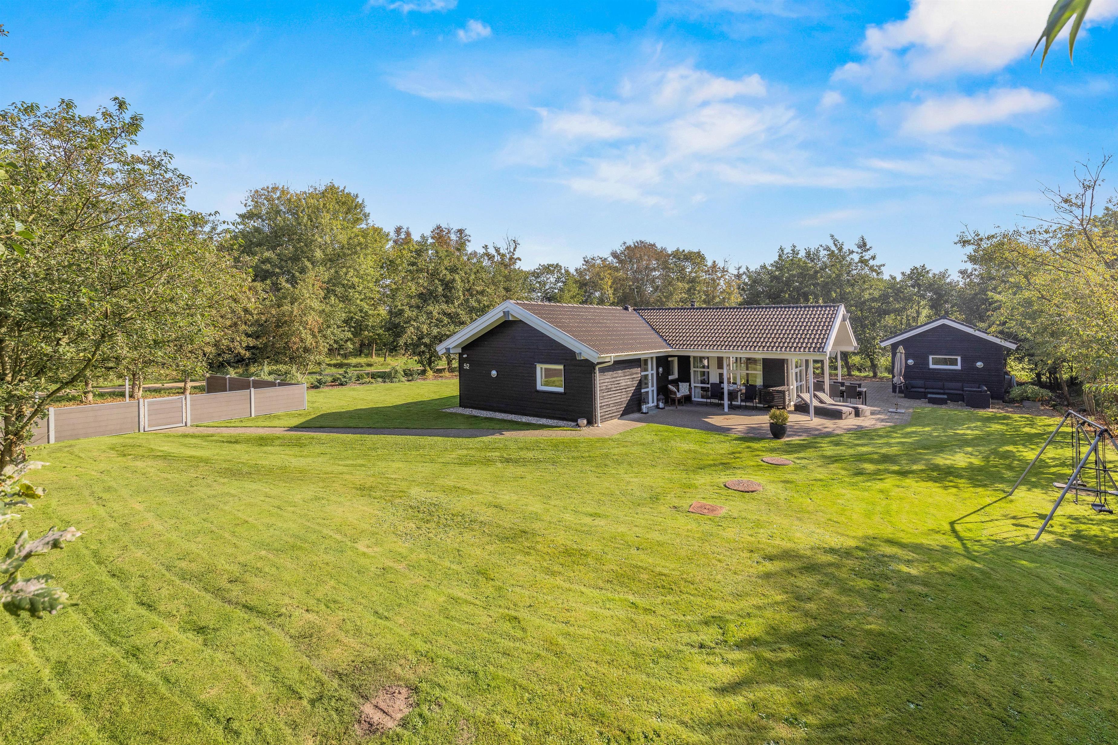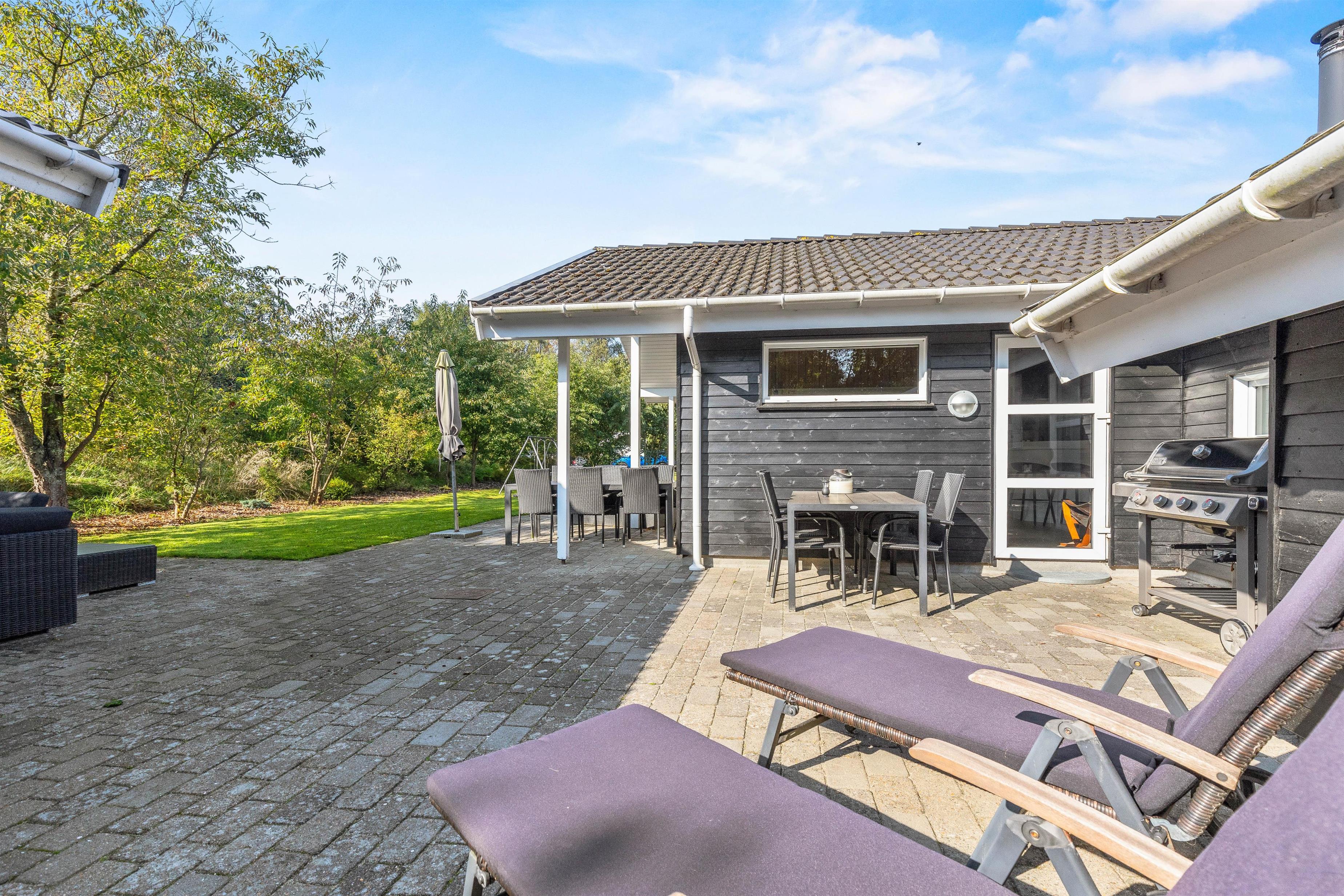 På den afskærmede terrasse kan I nyde solen på de komfortable liggestole, imens børnene leger i sandkassen eller gyngerne. Nyd frokosten udendørs ved spisepladsen under den overdækkede del af terrassen, og slut eventuelt dagen af med en grillaften, imens solen går ned. Har I energi til det, kan I spille et vikingespil på græsplænen, imens skyggerne bliver lange.