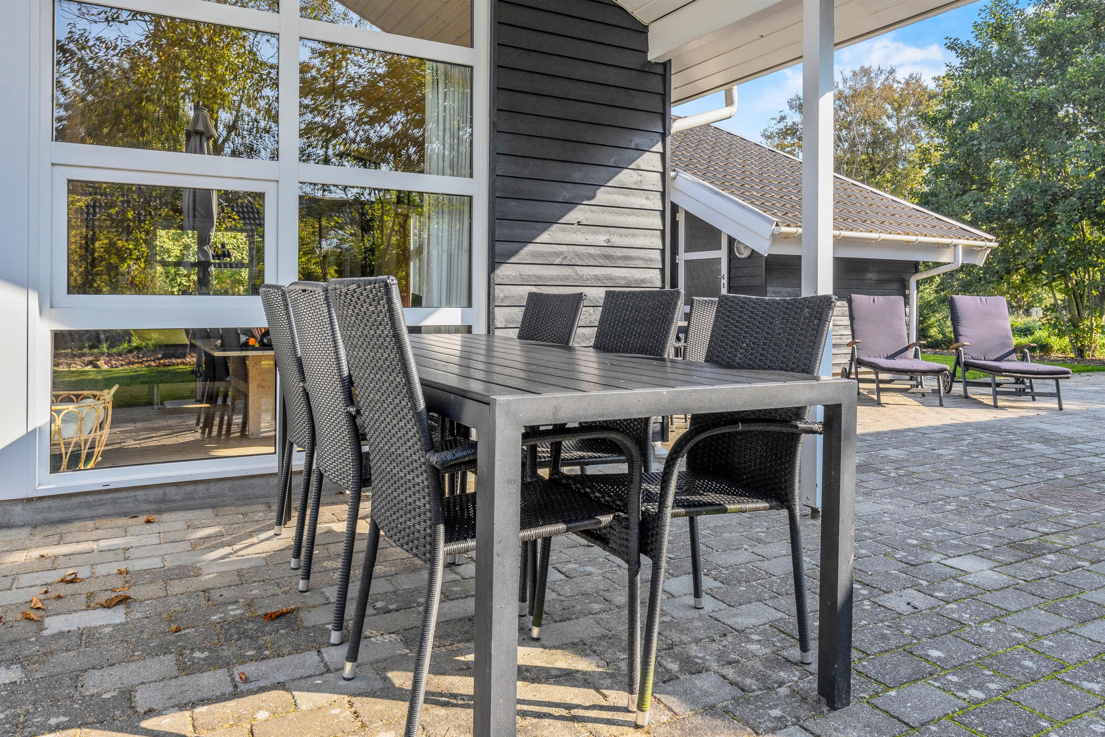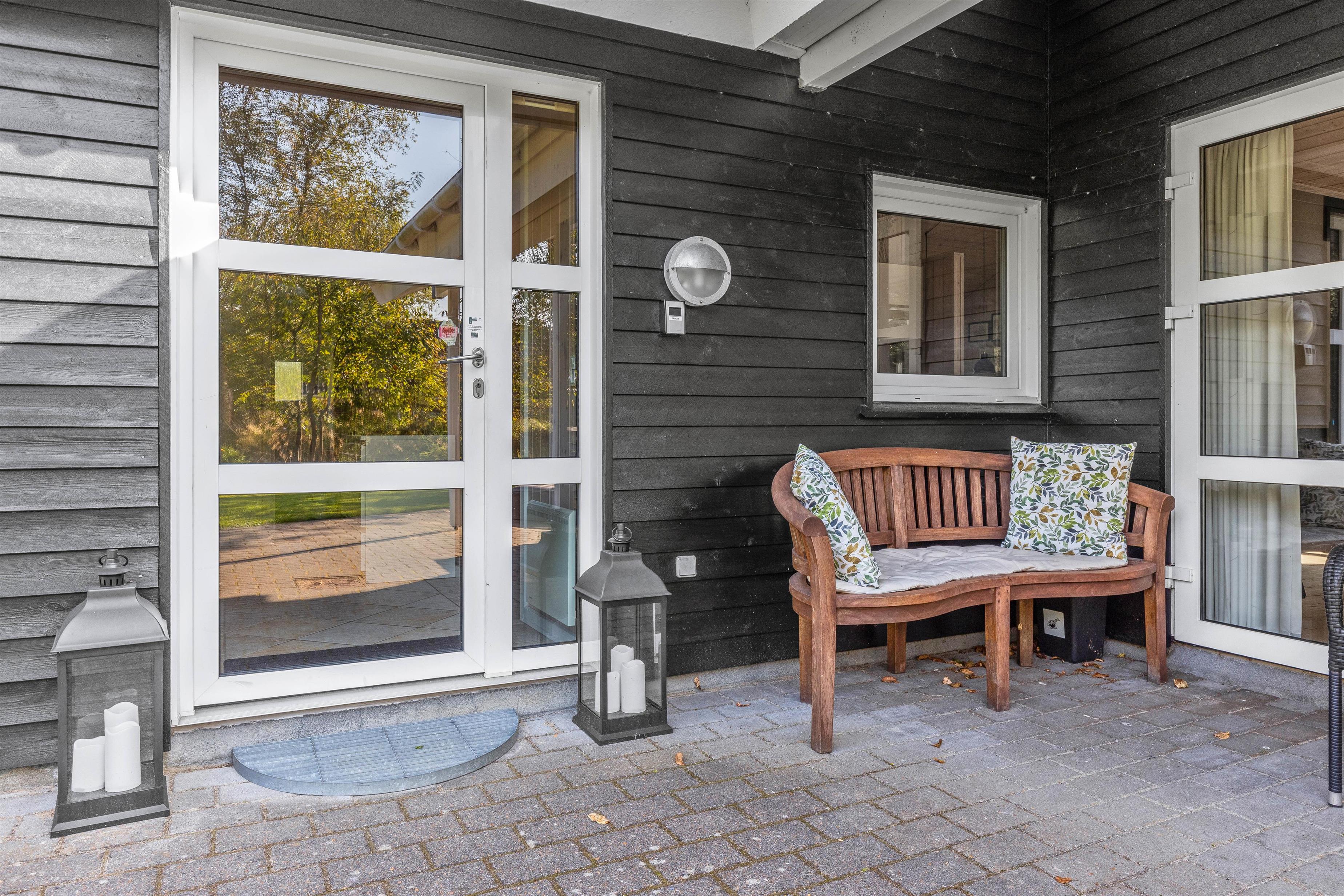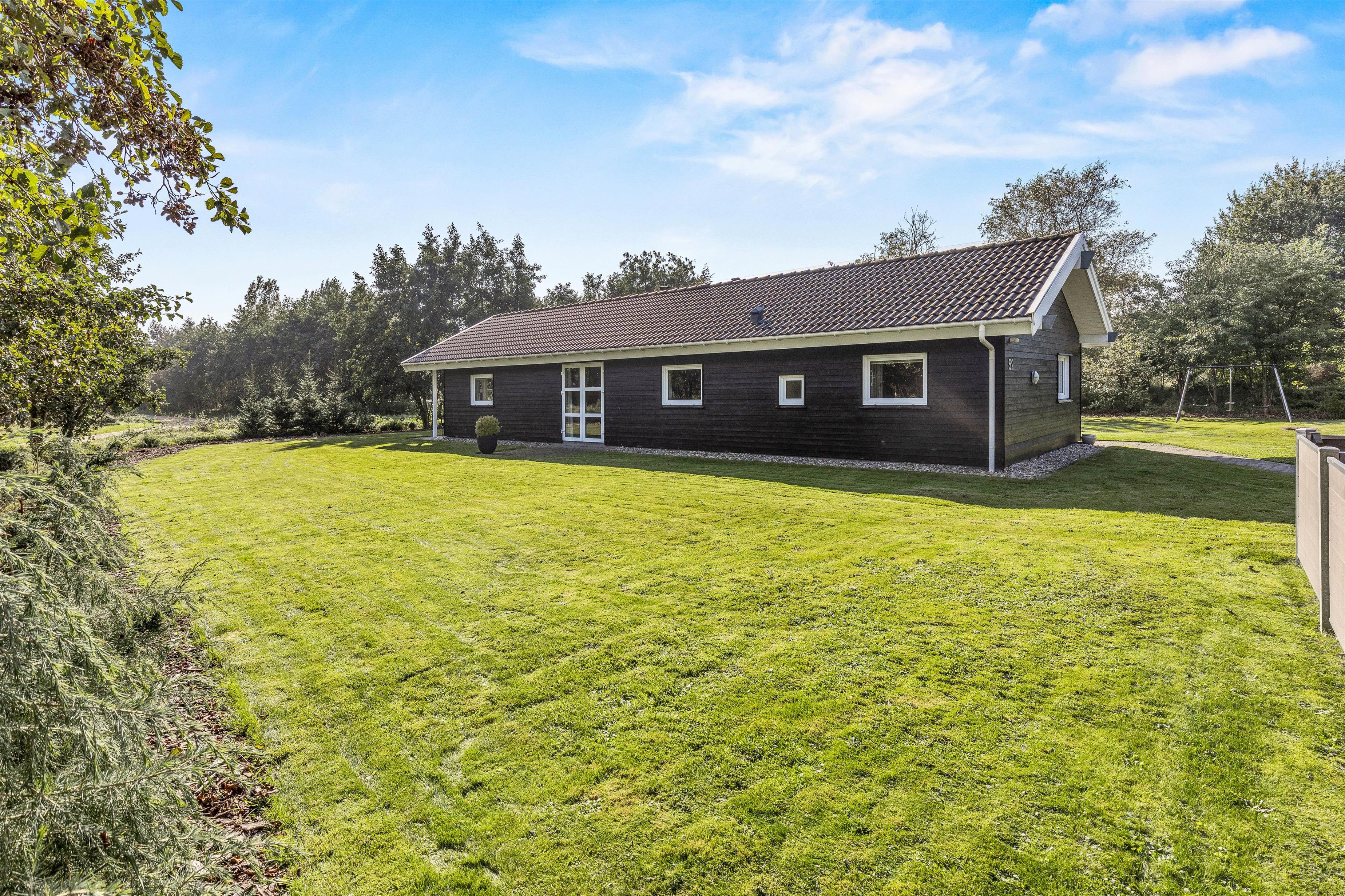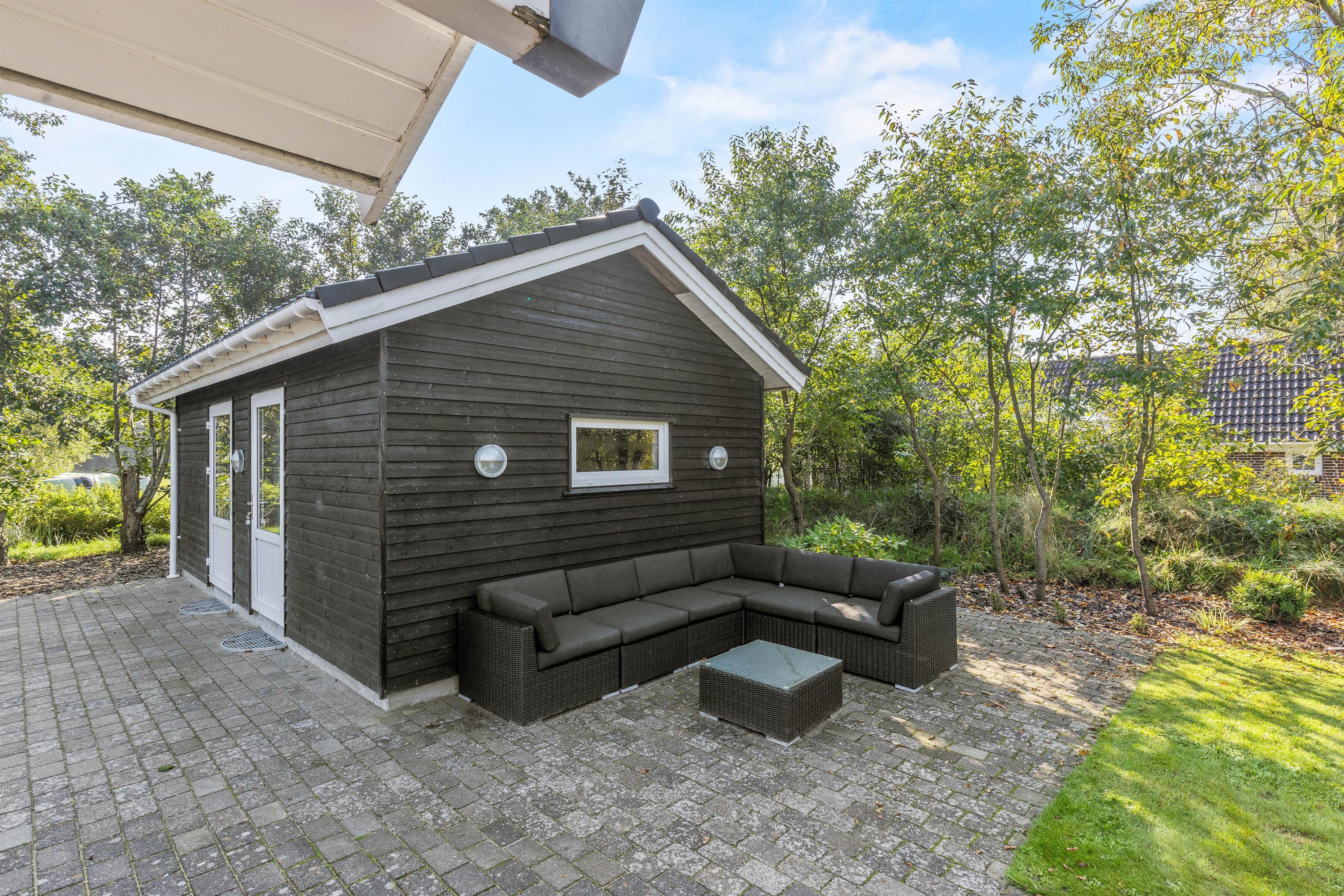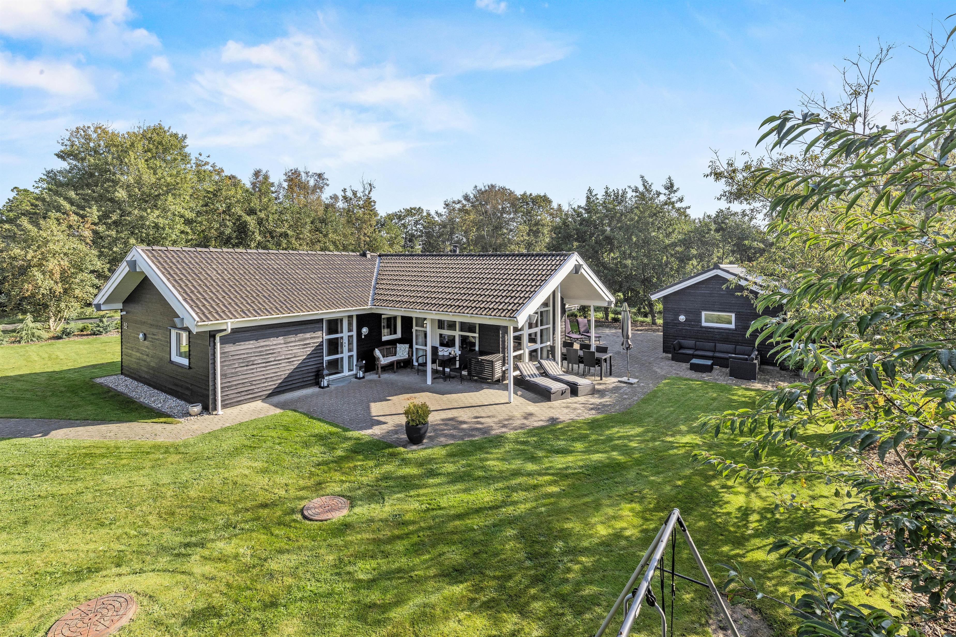 På den afskærmede terrasse kan I nyde solen på de komfortable liggestole, imens børnene leger i sandkassen eller gyngerne. Nyd frokosten udendørs ved spisepladsen under den overdækkede del af terrassen, og slut eventuelt dagen af med en grillaften, imens solen går ned. Har I energi til det, kan I spille et vikingespil på græsplænen, imens skyggerne bliver lange.