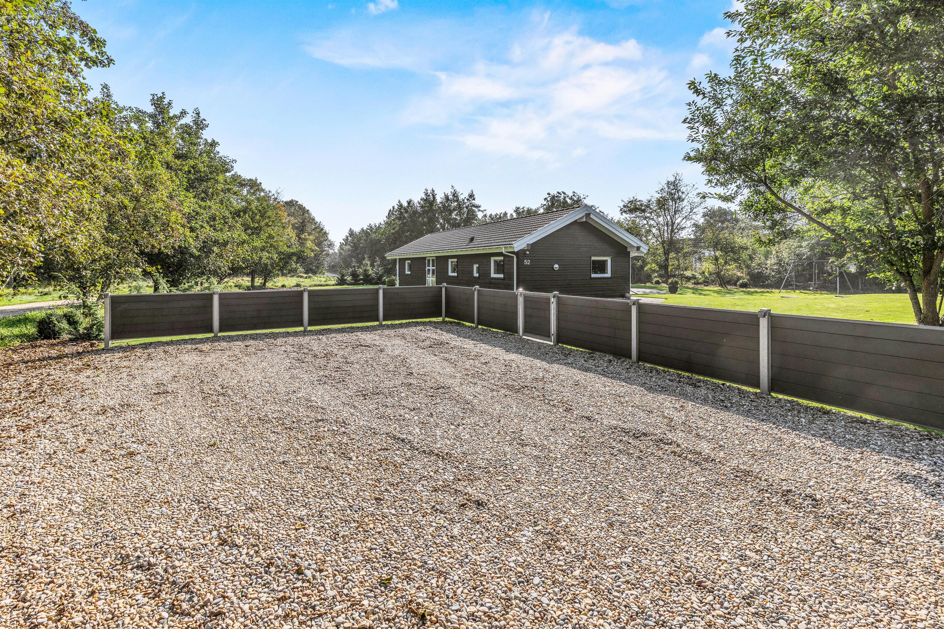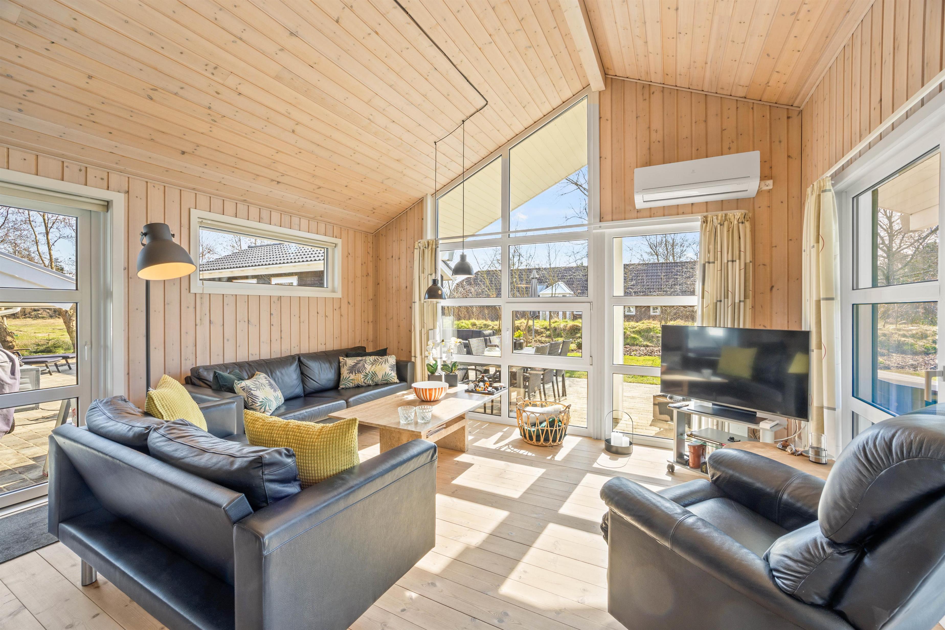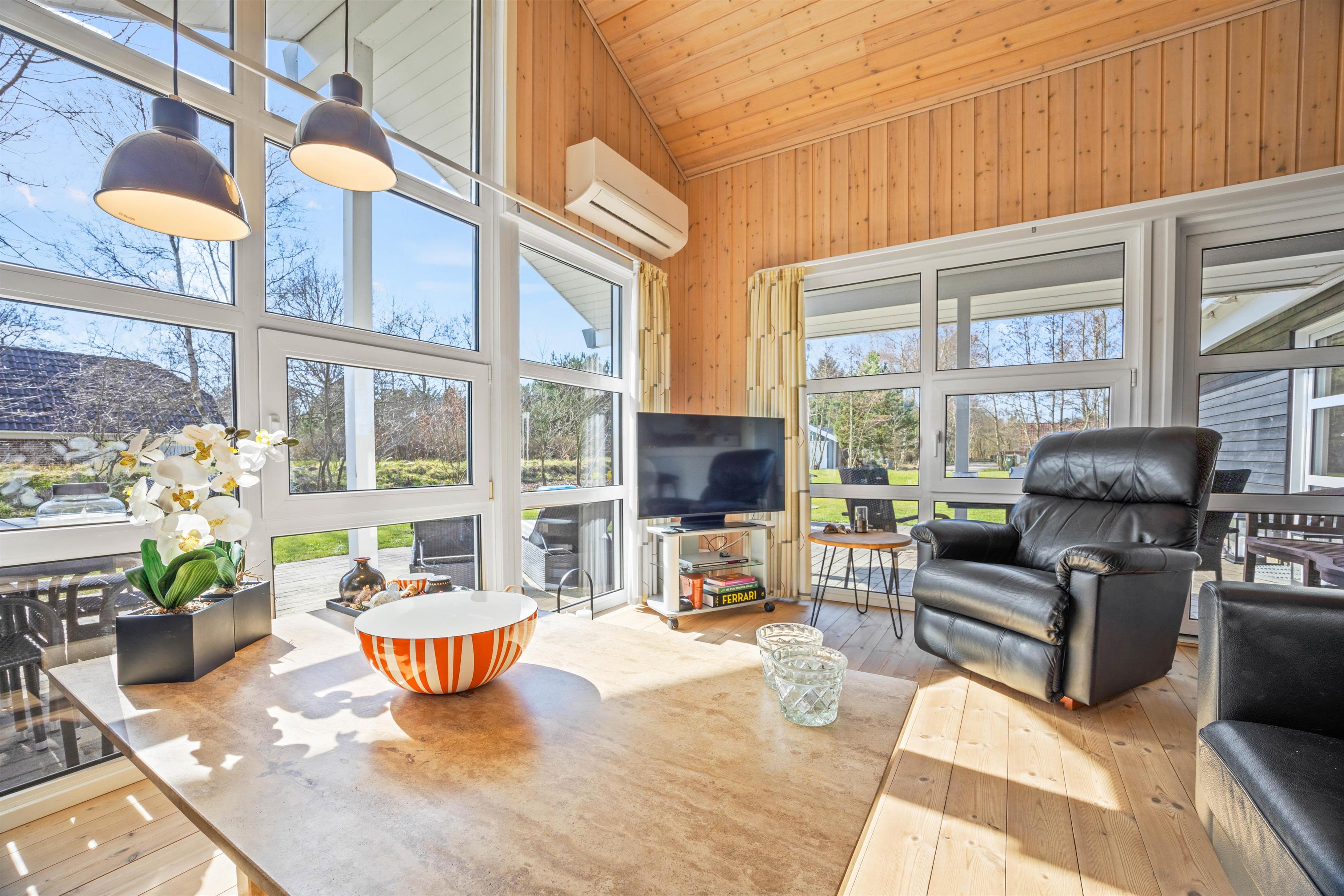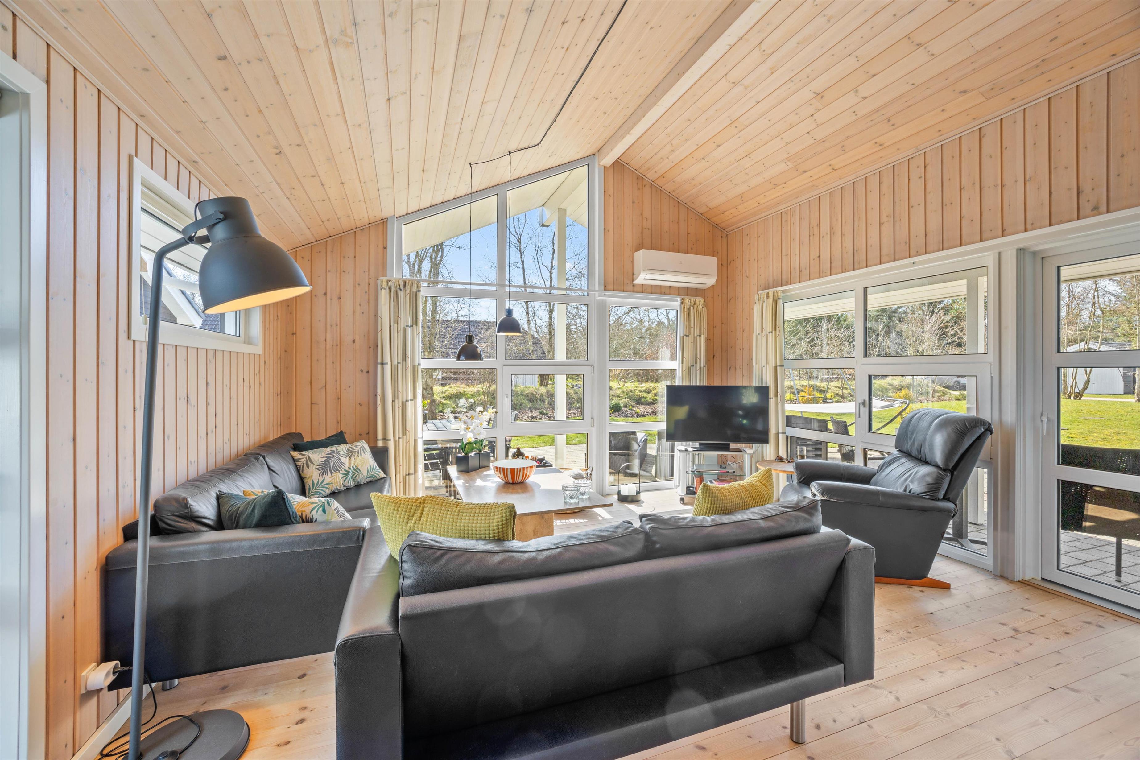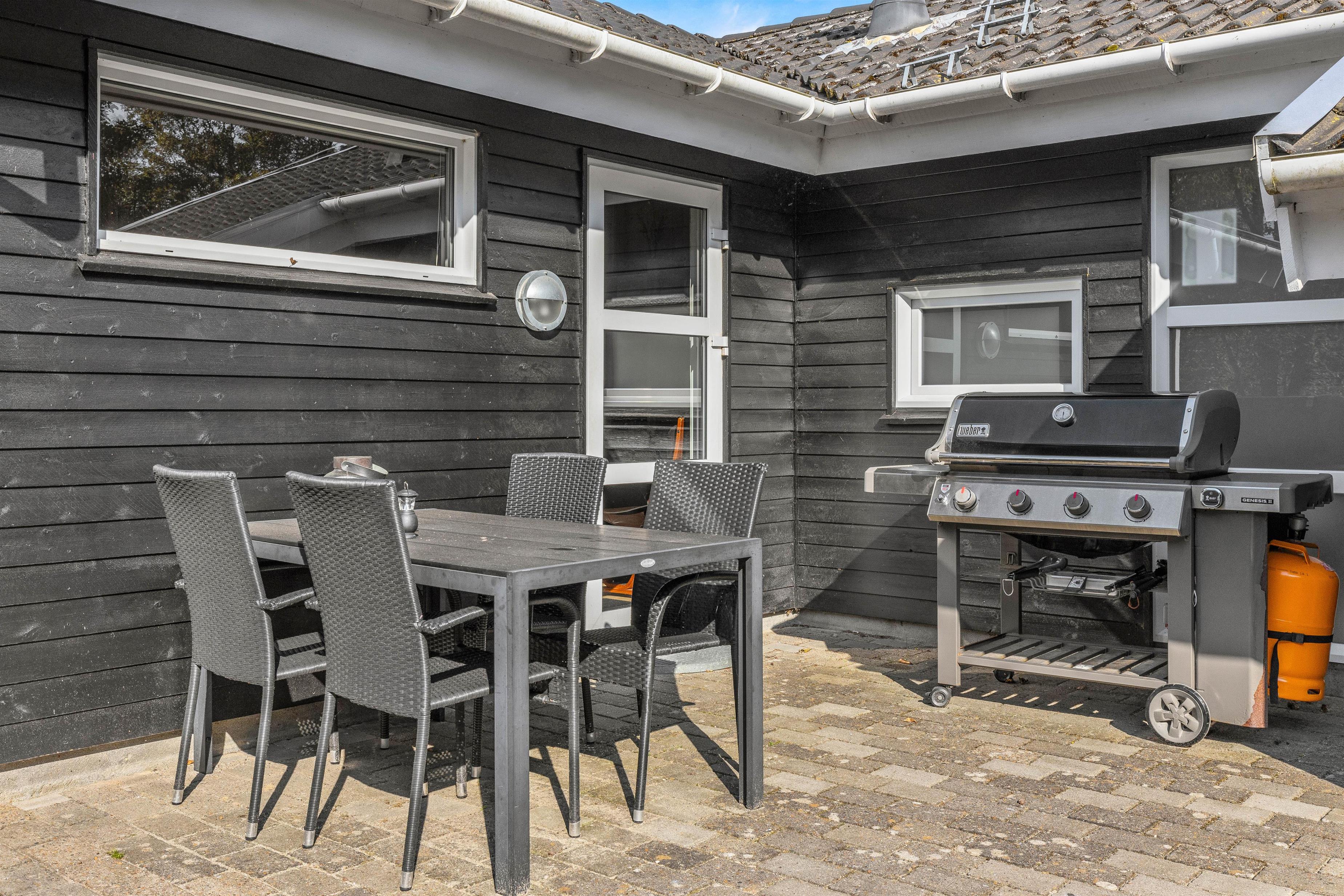På den afskærmede terrasse kan I nyde solen på de komfortable liggestole, imens børnene leger i sandkassen eller gyngerne. Nyd frokosten udendørs ved spisepladsen under den overdækkede del af terrassen, og slut eventuelt dagen af med en grillaften, imens solen går ned. Har I energi til det, kan I spille et vikingespil på græsplænen, imens skyggerne bliver lange.