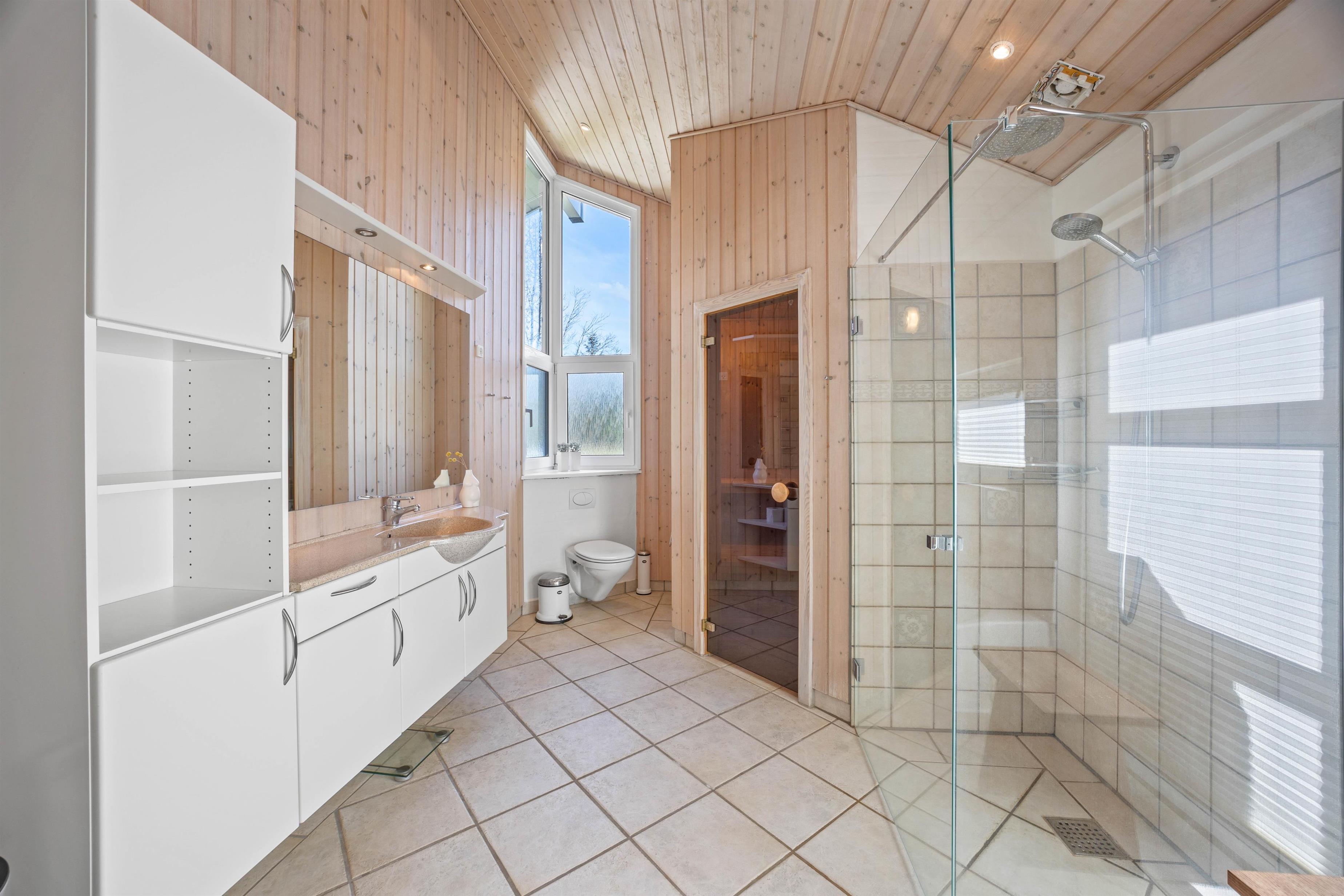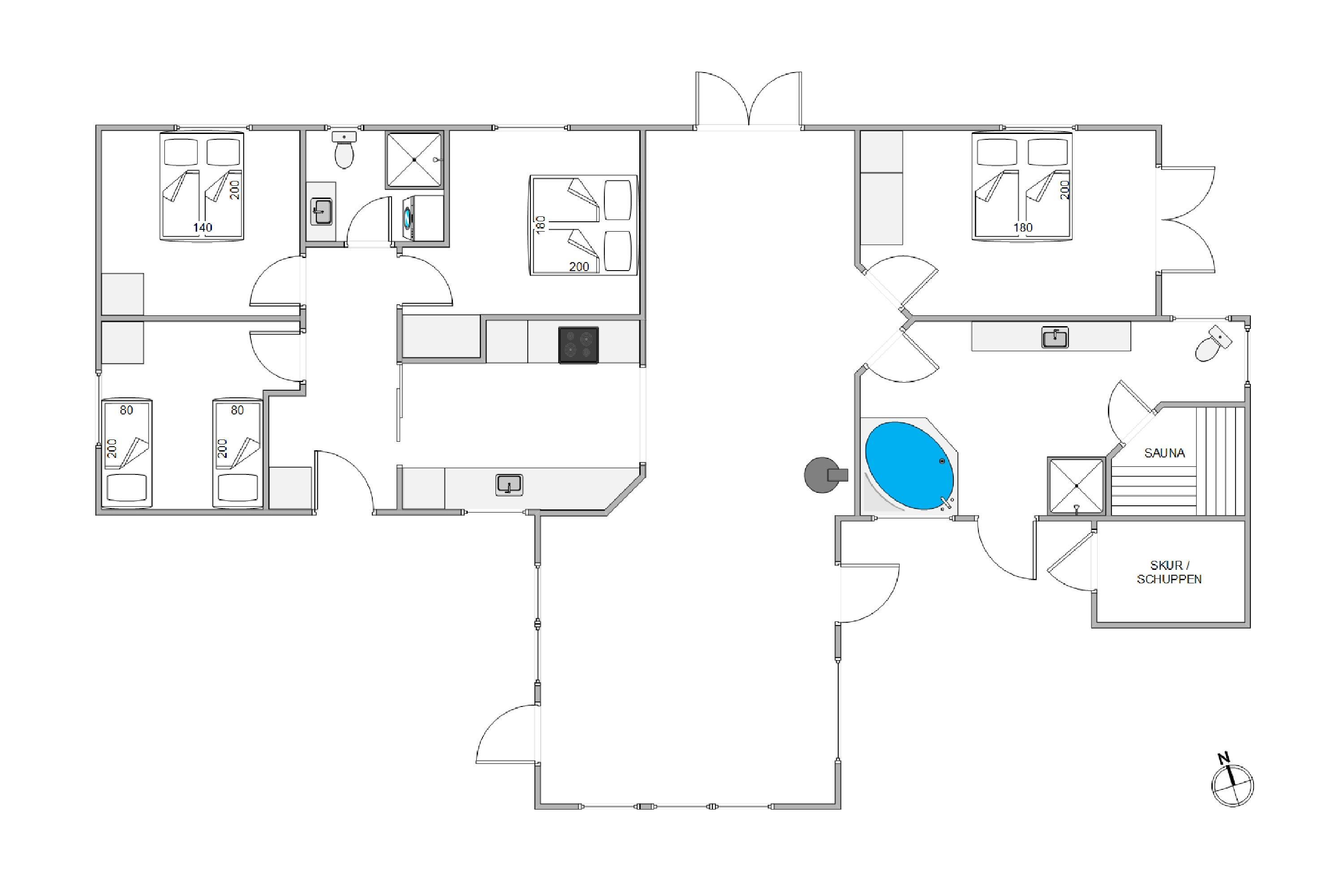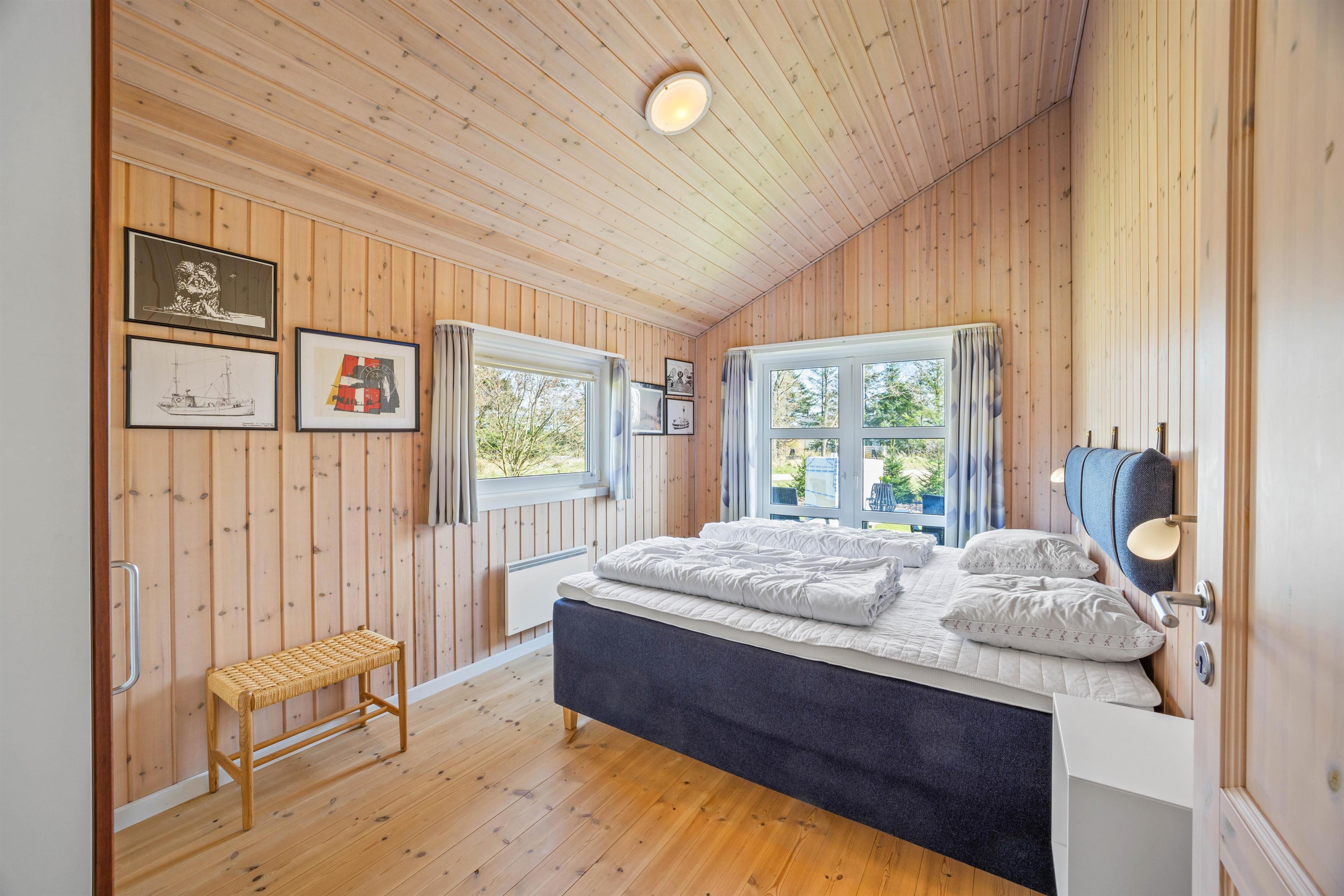 De 2 badeværelser betyder, at I ikke behøver at stå i kø til morgenbadet. Her kan I også forkæle jer selv med wellness i sauna og spa. De 4 soveværelser indeholder 8 gode sengepladser – i de 3 af soveværelserne er der dobbeltsenge, og i det 4. er der 2 enkeltsenge, hvor I kan hvile rigtig godt ud efter den friske havluft og en god feriedag.