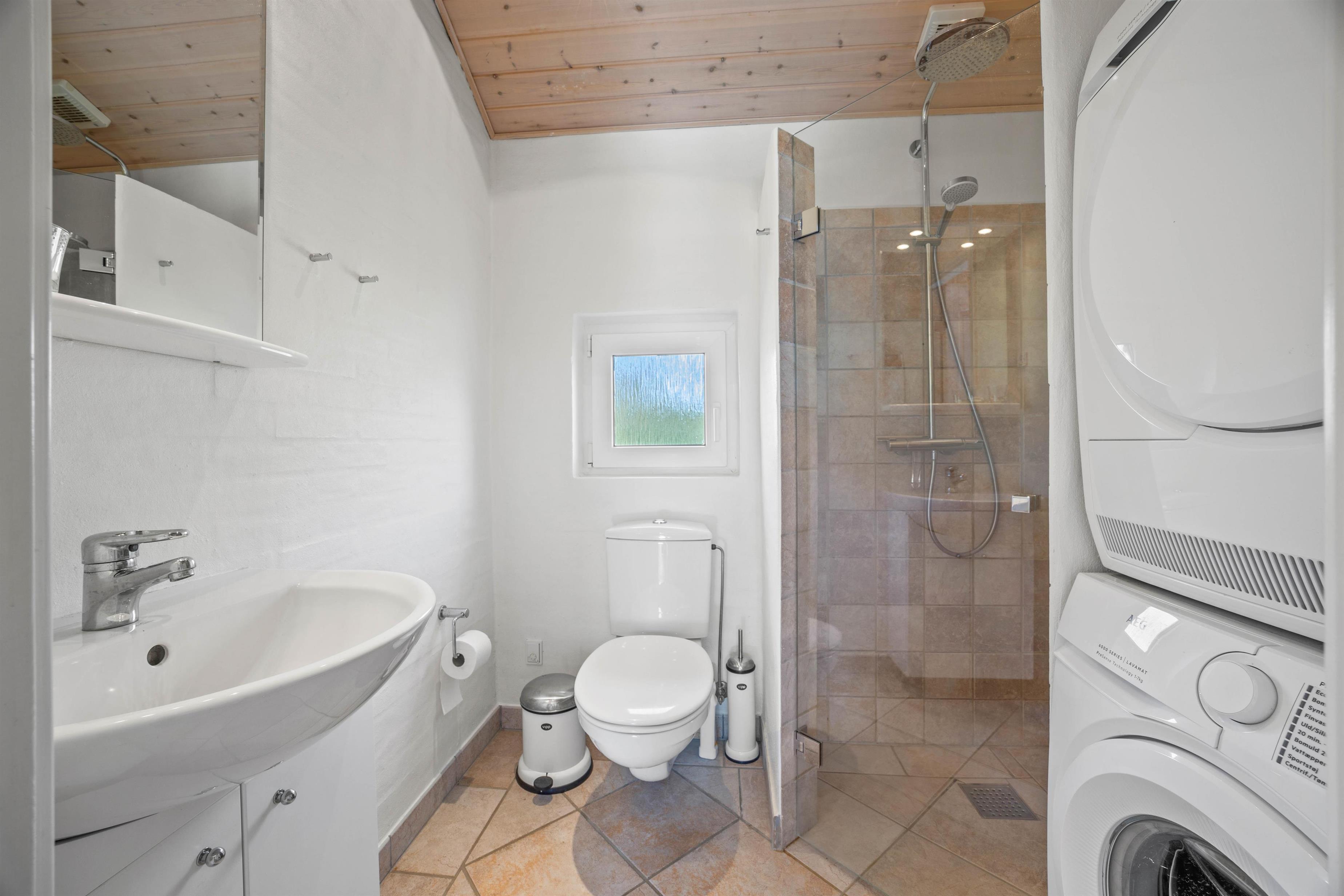 En energibesparende varmepumpe hjælper til med at opvarme sommerhuset, ligesom der er vaskemaskine og tørretumbler til rådighed.