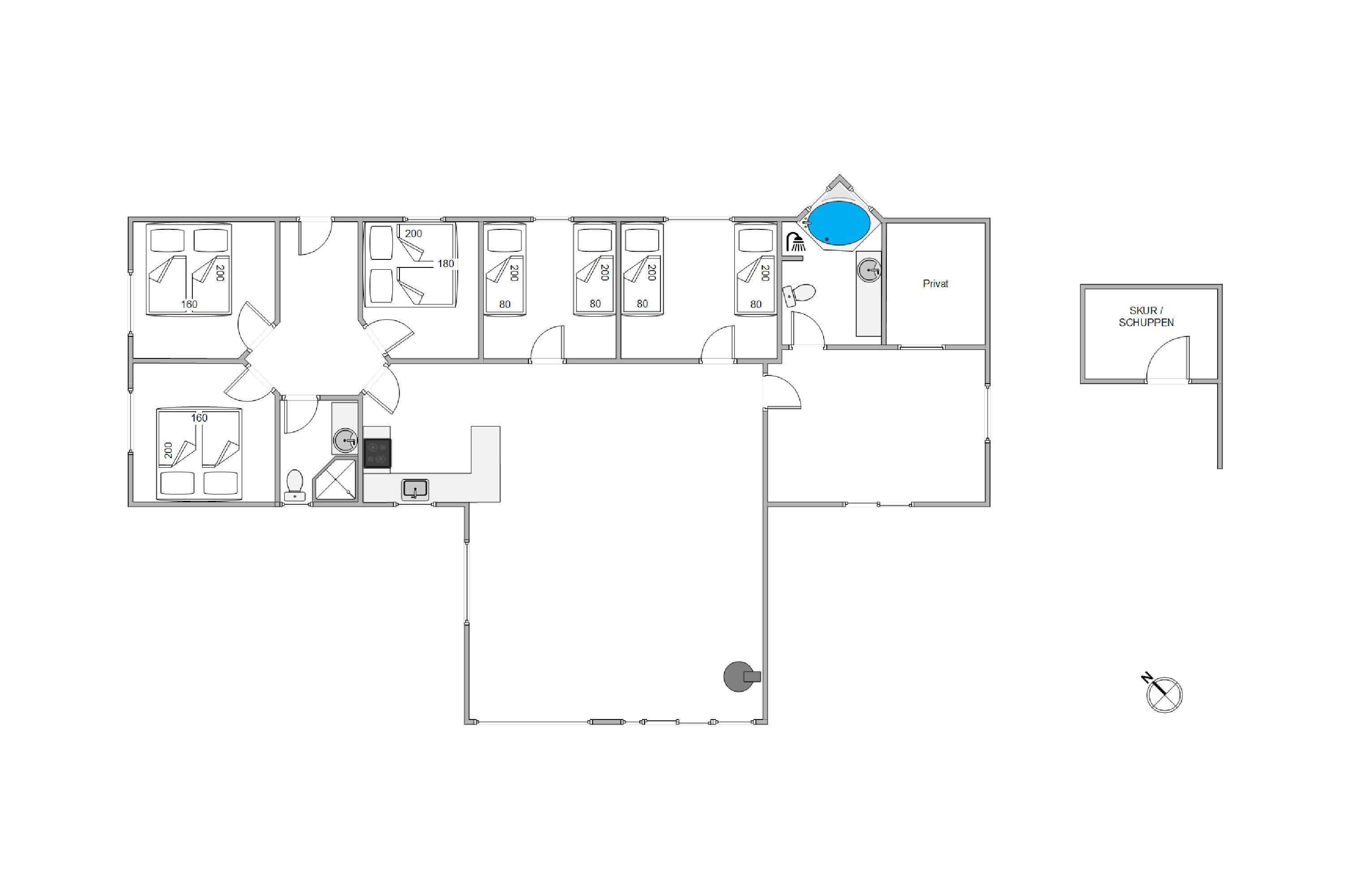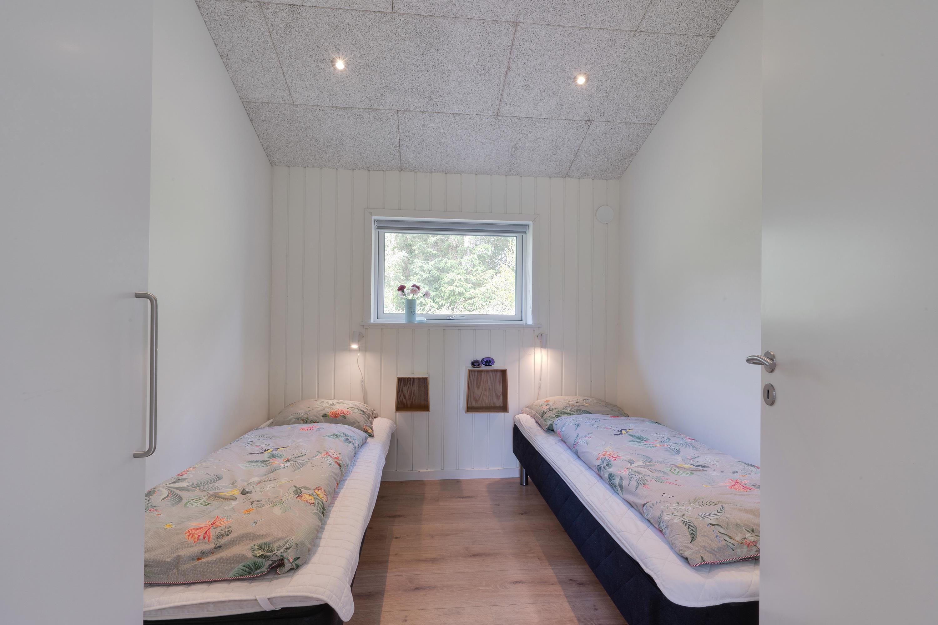 Sommerhusets 166 kvadratmeter er indrettet, så der er god plads til alle feriegæster. I feriehuset er der 5 soveværelser, hvor 3 af dem er indrettet med dobbeltsenge, og de resterende 2 er indrettet med 2 enkeltsenge hver.