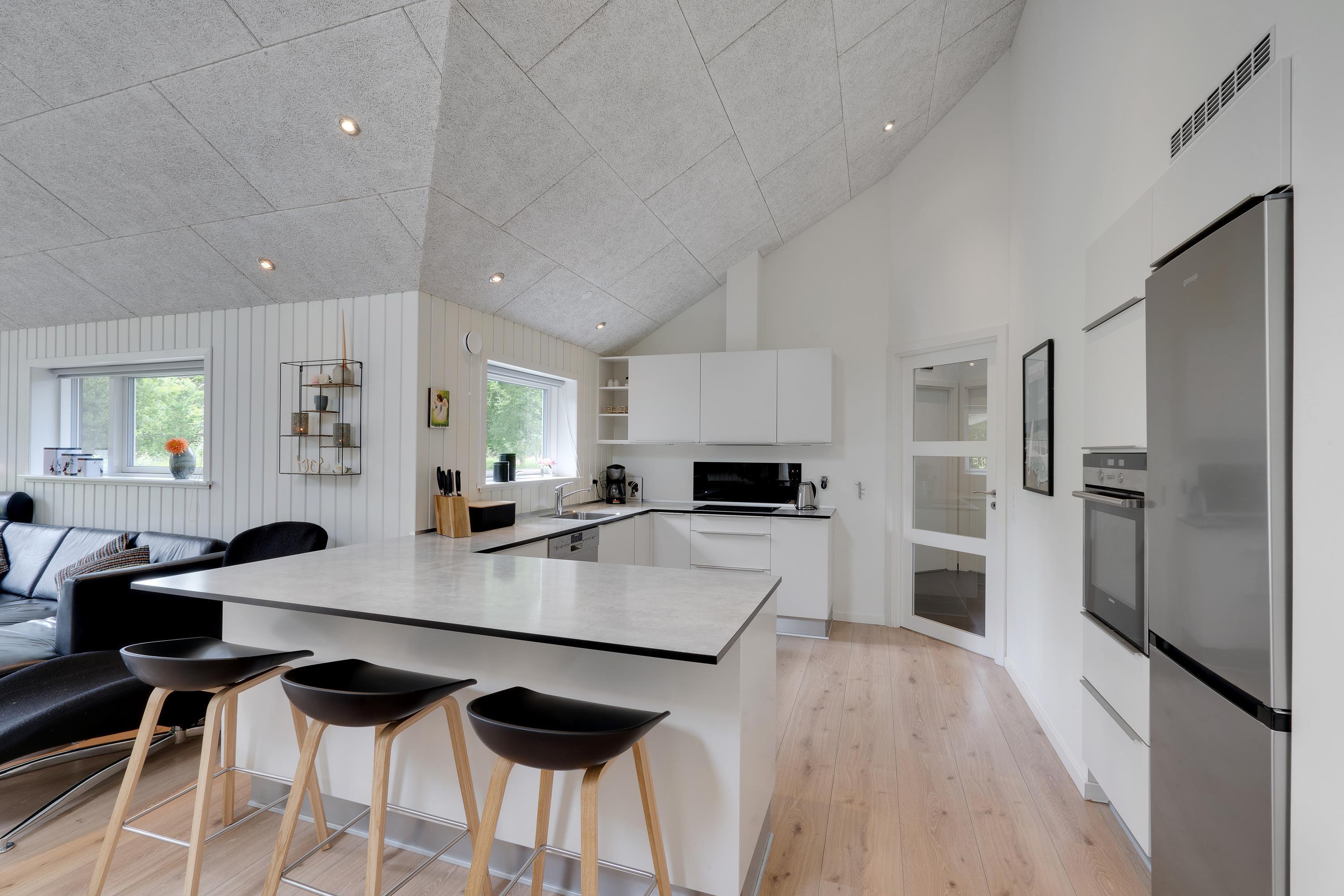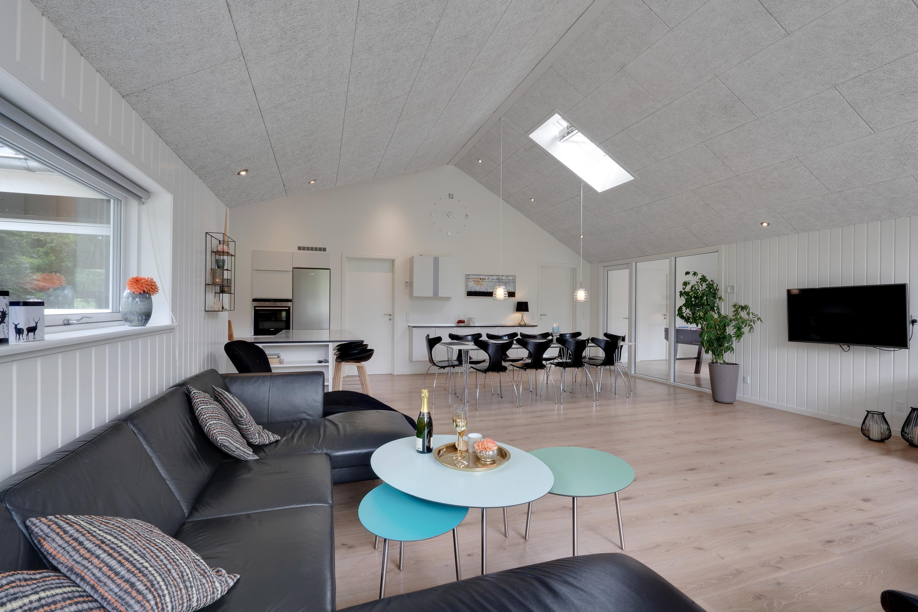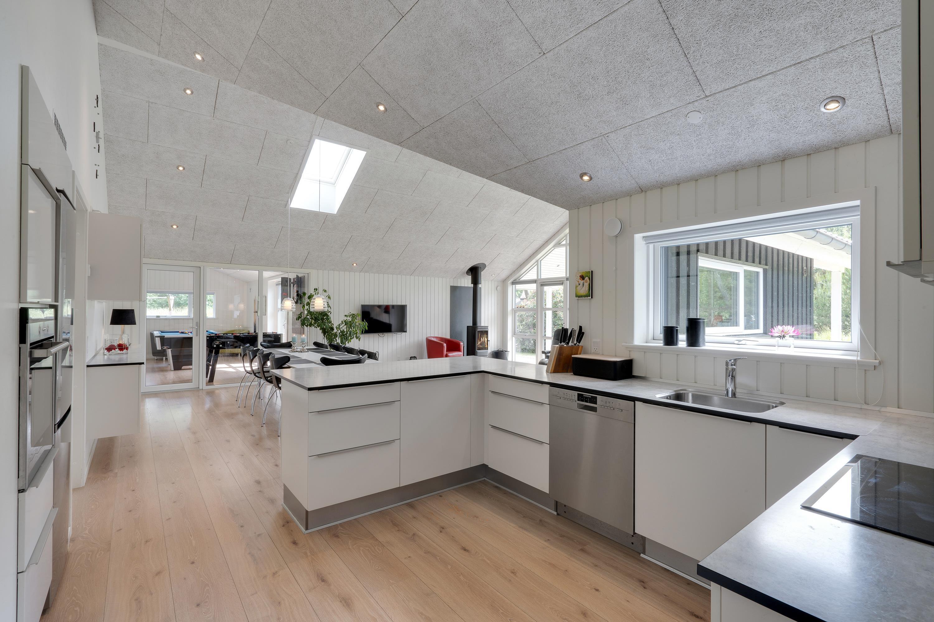 Fra aktivitetsrummet kan I både gå ud på terrassen eller ind i det store alrum, hvor køkken, stue og spisestue er samlet. I alrummet er der mulighed for mange dejlige feriestunder for alle feriegæster med blandt andet gode film – takket være Chromecasten kan I streame jeres yndlingsfilm i tv’et. I alrummet står brændeovnen også klar til at skrue helt op for den hyggelige feriestemning.