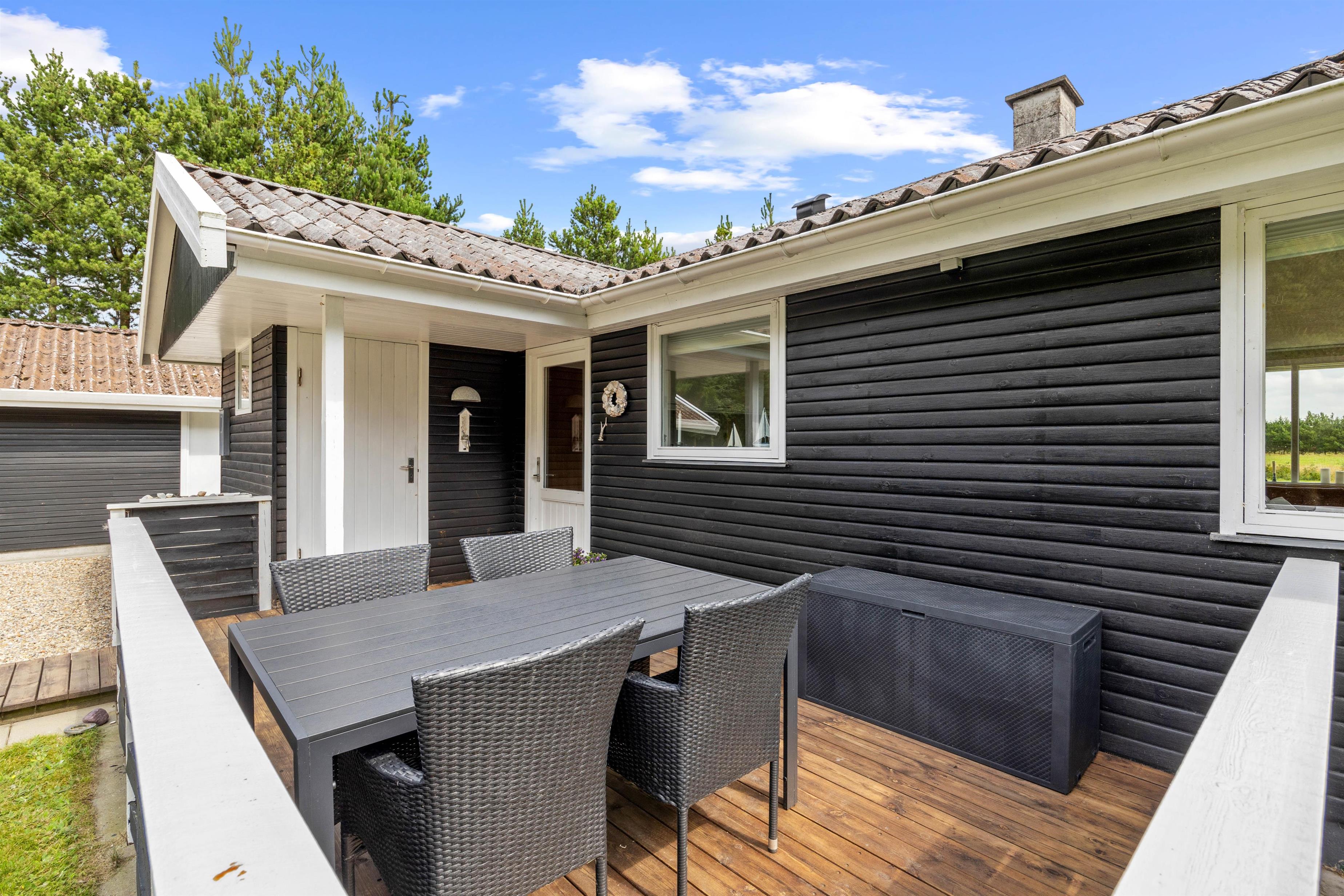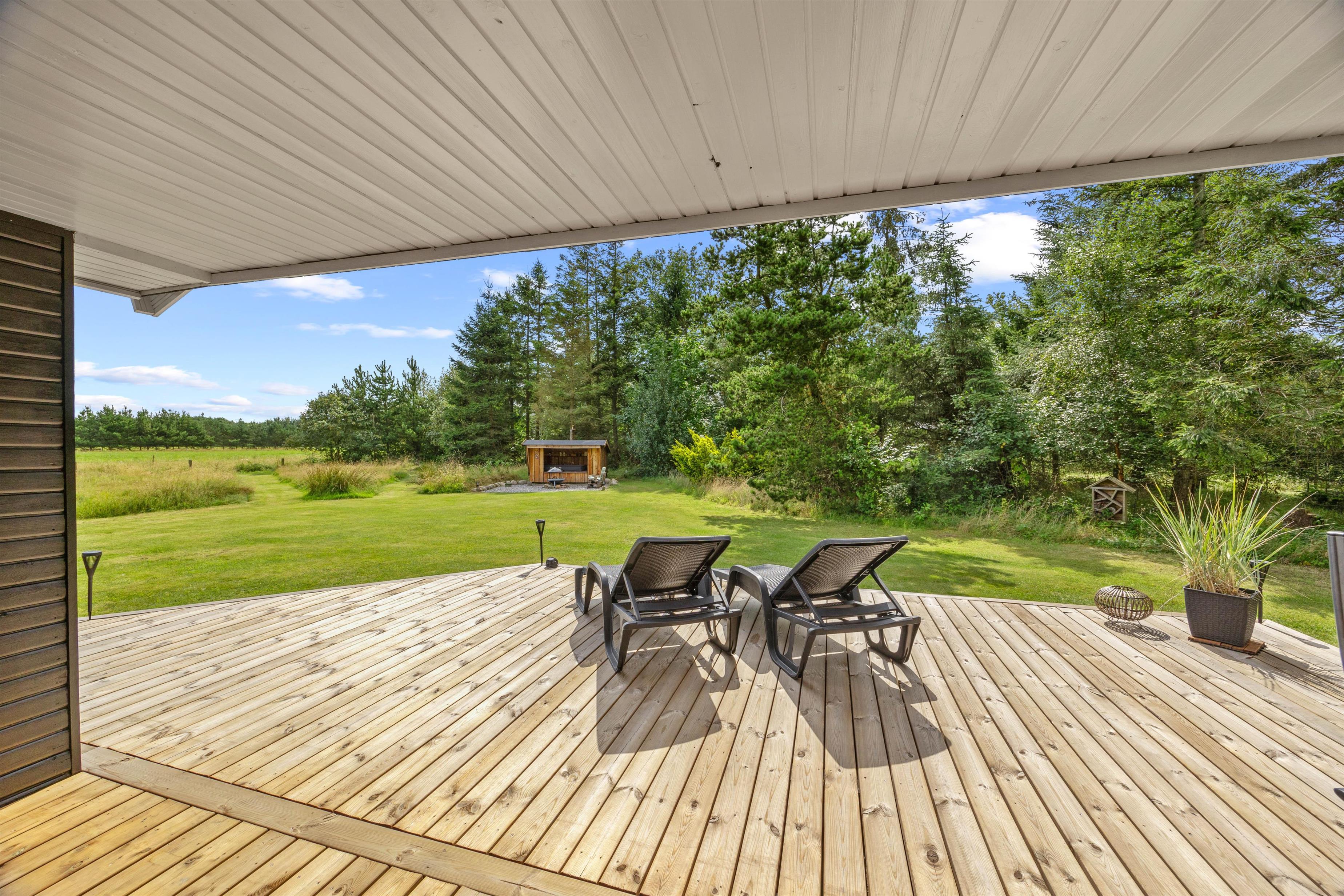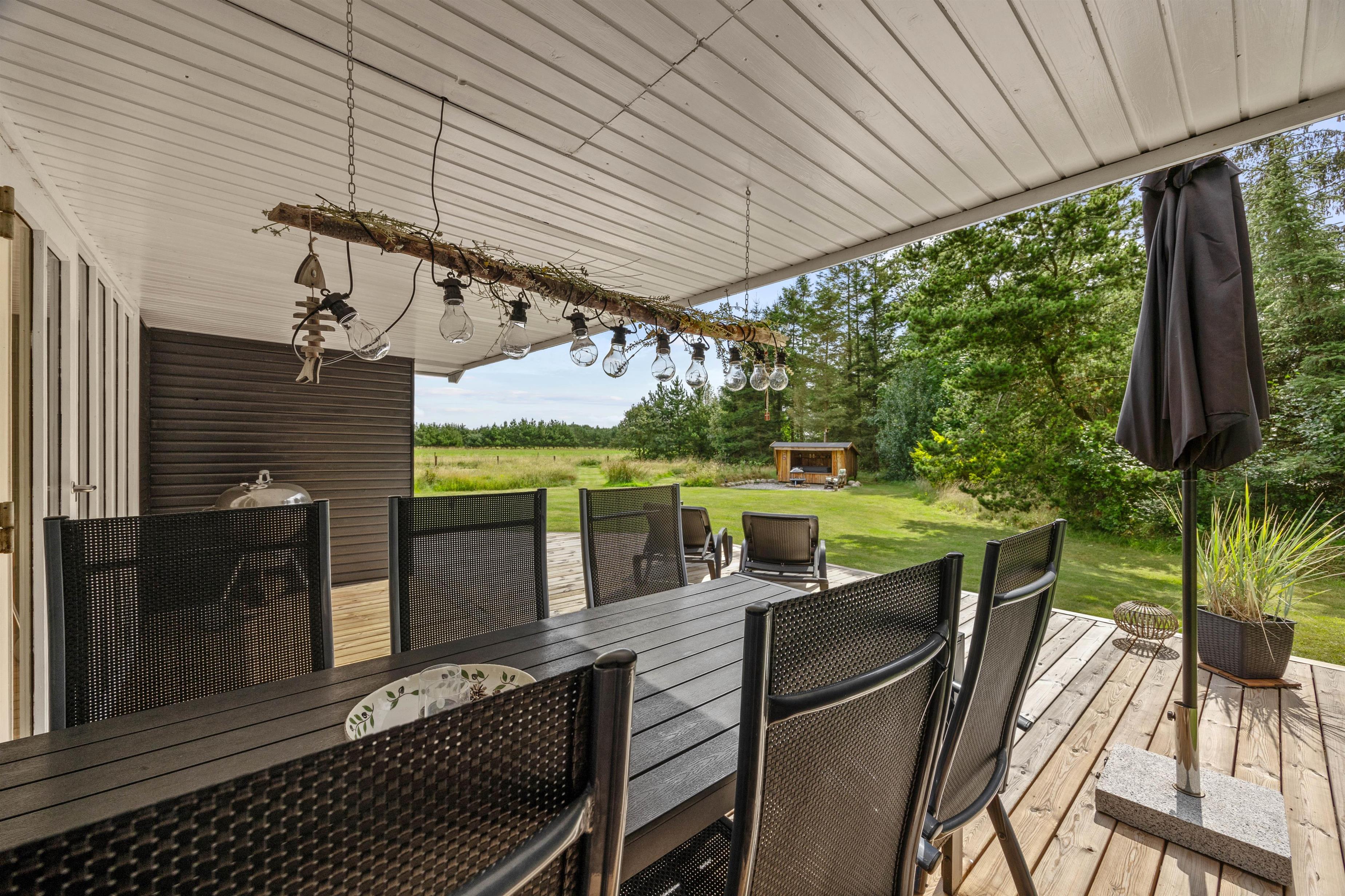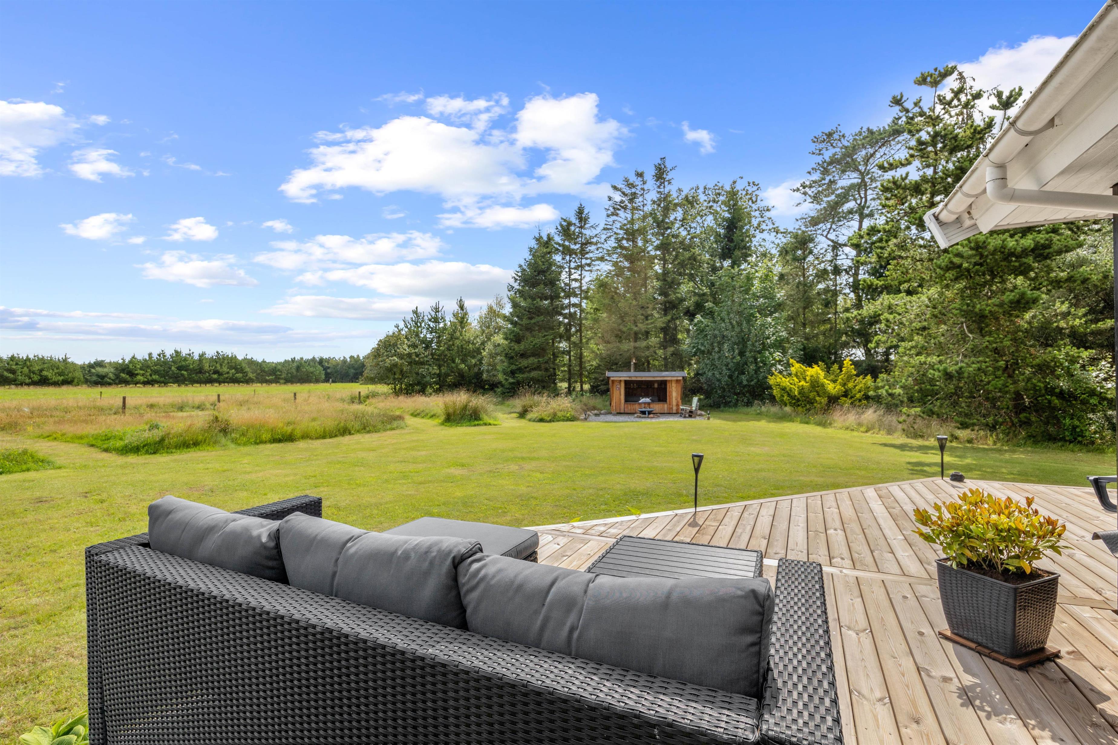 Fra stuen har I udgang til den store, dejlige træterrasse, som er delvis overdækket, så I kan sidde ude i alt slags vejr. Terrassen er åben og delvis afskærmet, og herfra er I omringet af den dejligste vestjyske natur. På den store naturgrund på 3080 m2 kan I spille en masse boldspil, kongespil og andet sjovt. Her kan de mindste løbe frit, mens de voksne kan slå sig ned i havemøblerne eller lægge sig på solvognene og nyde solens stråler. I kan også finde feriehusets grill frem og lave en dejlig middag.