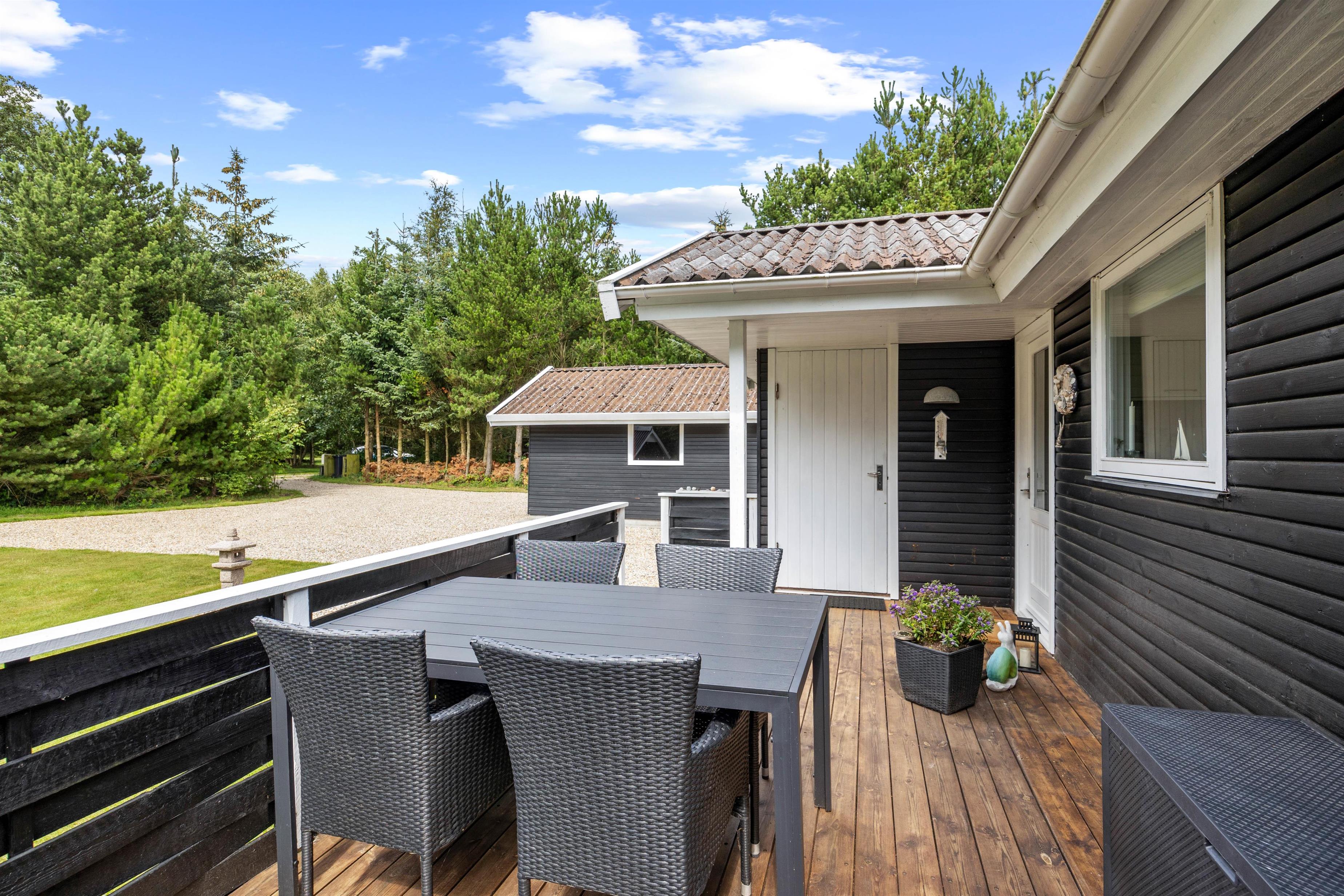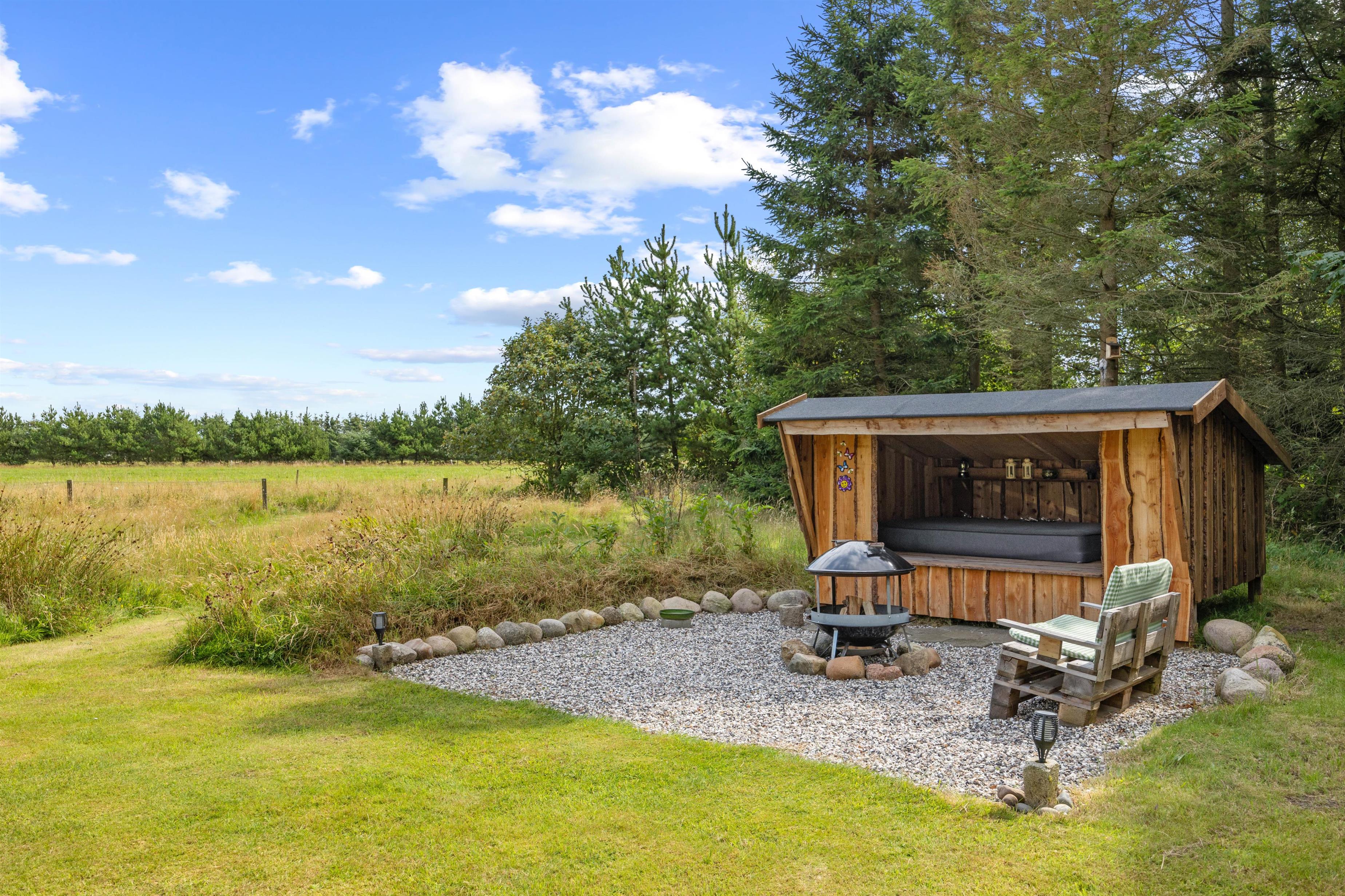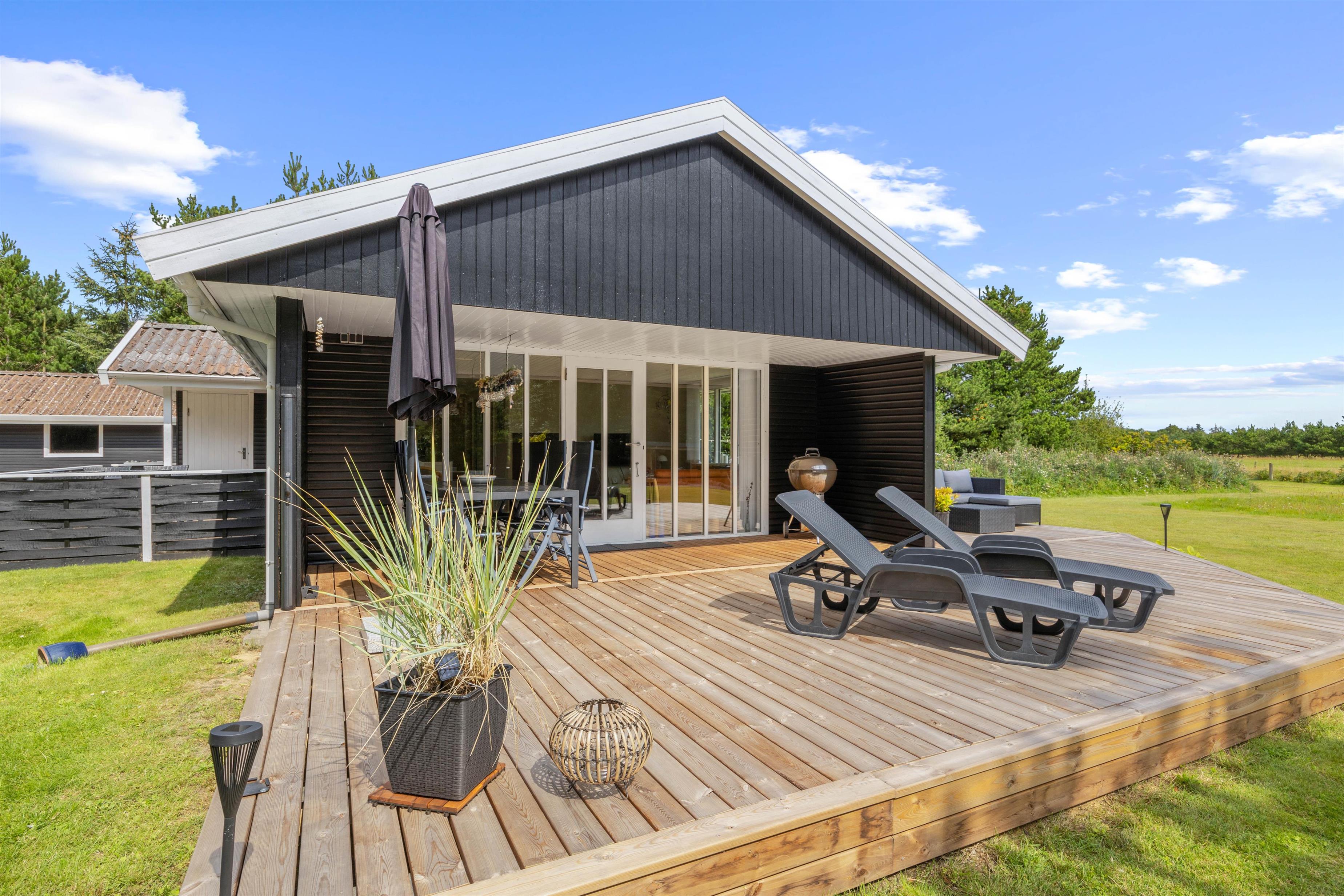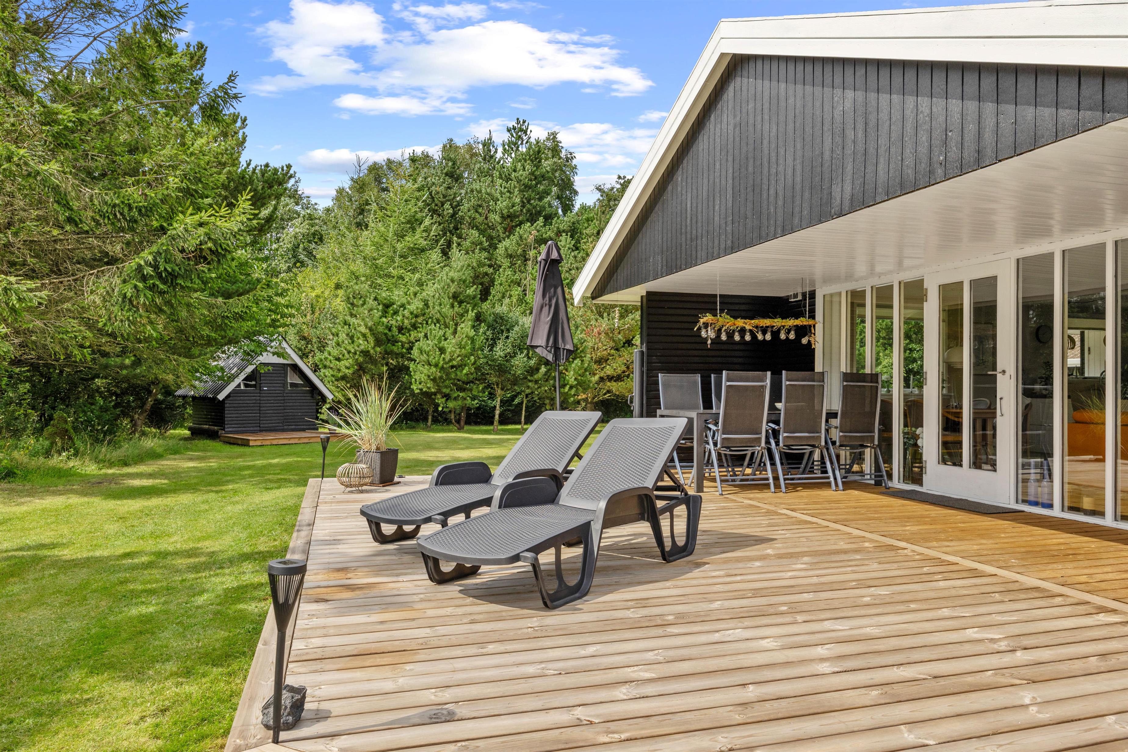 Fra stuen har I udgang til den store, dejlige træterrasse, som er delvis overdækket, så I kan sidde ude i alt slags vejr. Terrassen er åben og delvis afskærmet, og herfra er I omringet af den dejligste vestjyske natur. På den store naturgrund på 3080 m2 kan I spille en masse boldspil, kongespil og andet sjovt. Her kan de mindste løbe frit, mens de voksne kan slå sig ned i havemøblerne eller lægge sig på solvognene og nyde solens stråler. I kan også finde feriehusets grill frem og lave en dejlig middag.