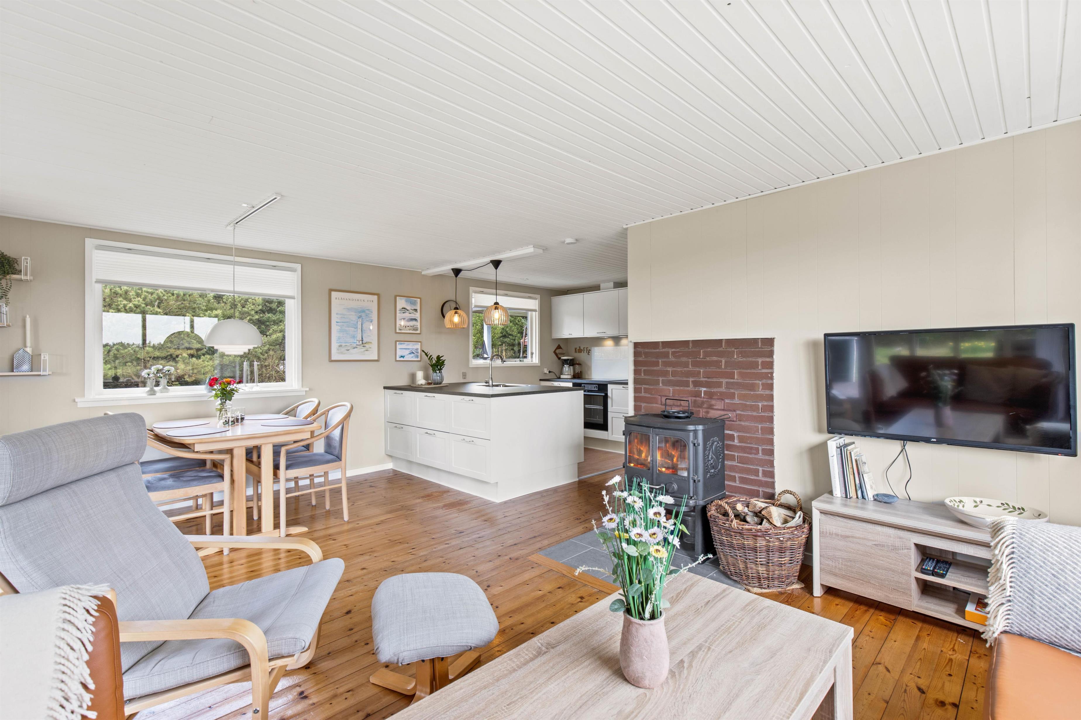 Fra entréen træder du ind i sommerhusets hjerte og samlingspunkt, som er det dejlige køkkenalrum. I det praktiske køkken, med både opvaskemaskine, mikroovn og fryser, kan I lave mad sammen og nyde det rundt om spisebordet, hvor I har udsigt til den dejlige grønne natur. Om aftenen kan I tænde op i brændeovnen og slå jer ned i de behagelige møbler, mens brændeovnen knitrer i baggrunden og skaber en hyggelig stemning.
