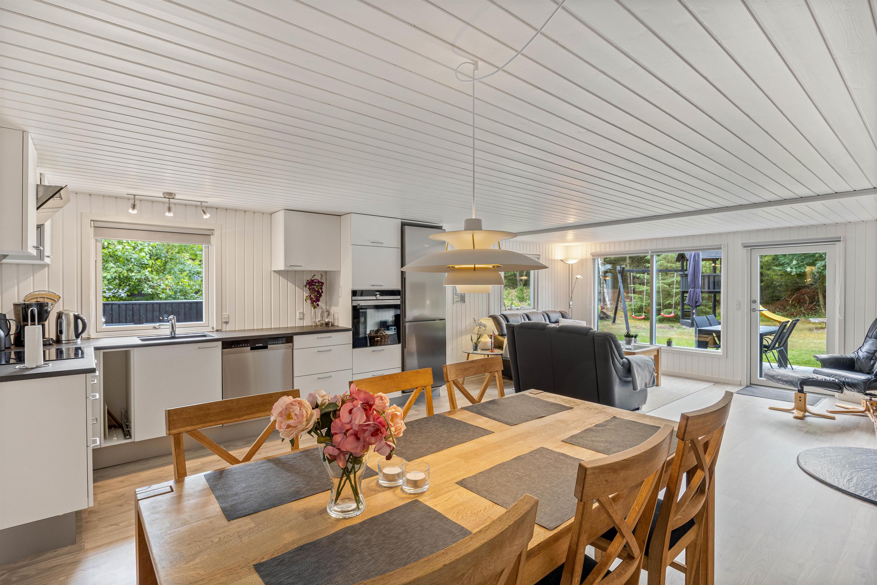 Alrummet i feriehuset forener køkken, stue og spisestue, og det vil uden tvivl blive jeres store samlingspunkt på ferien. Vær sammen om madlavningen i køkkenet, sjove spil ved spisebordet eller spændende film i tv’et. Alt sammen akkompagneret af brændeovnen, der med sin knitren og varme skruer op for feriestemningen.