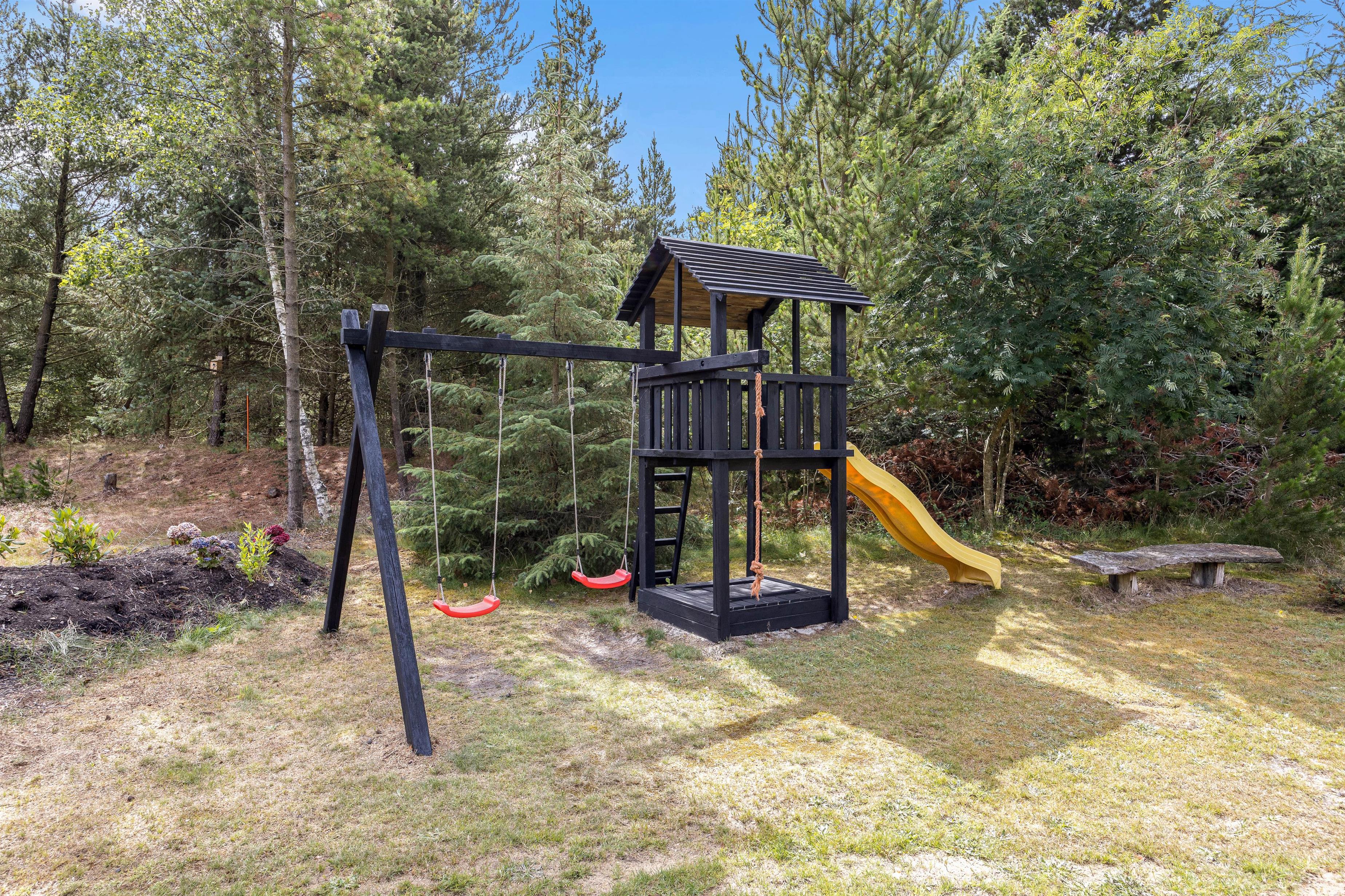 Udendørs venter jer et skønt udeområde, hvor der er noget for både voksne og børn. Til børnene er der en sandkasse, de kan bygge store sandslotte i, samt et gyngestativ, hvor de kan få sus i maven dagen lang.