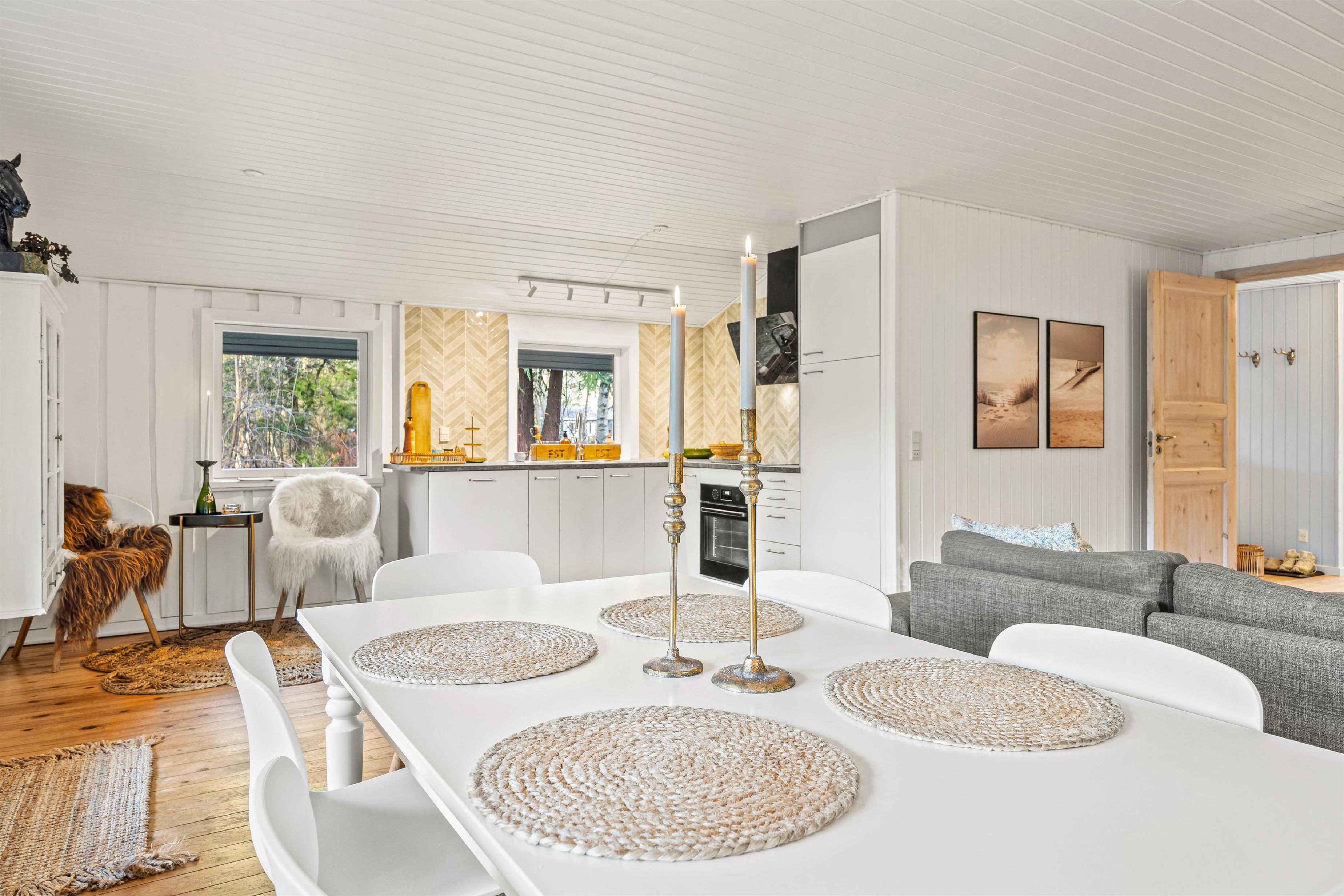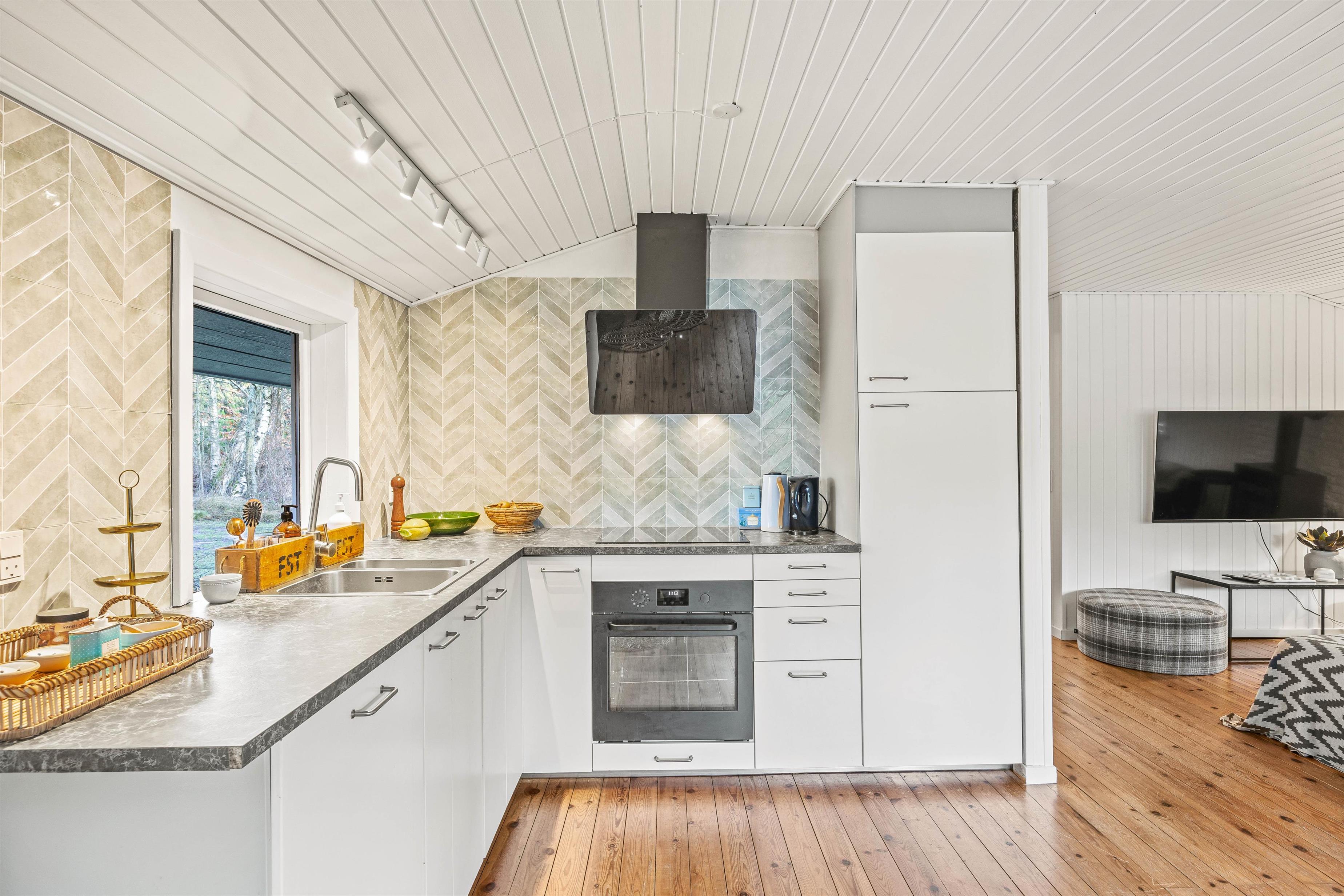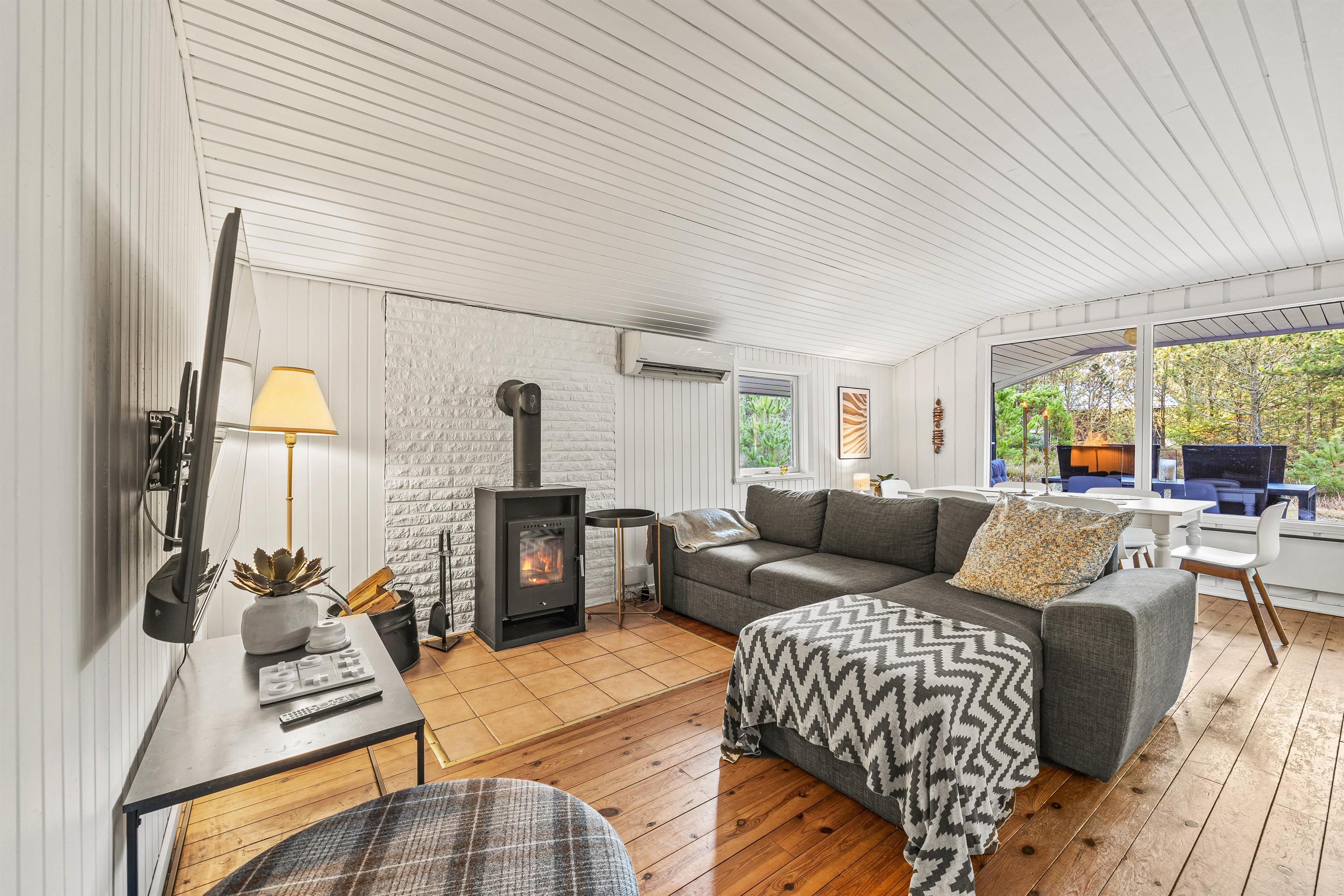 Sommerhusets hjerte er det kombinerede stue- og køkkenalrum. Her kan hele familien samles, til lækre feriemiddage rundt om spisebordet og hyggelige feriestunder foran brændeovnen. Køkkenet er udstyret med en opvaskemaskine, som tager sig af den værste oprydning for jer.