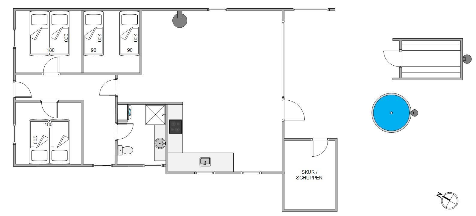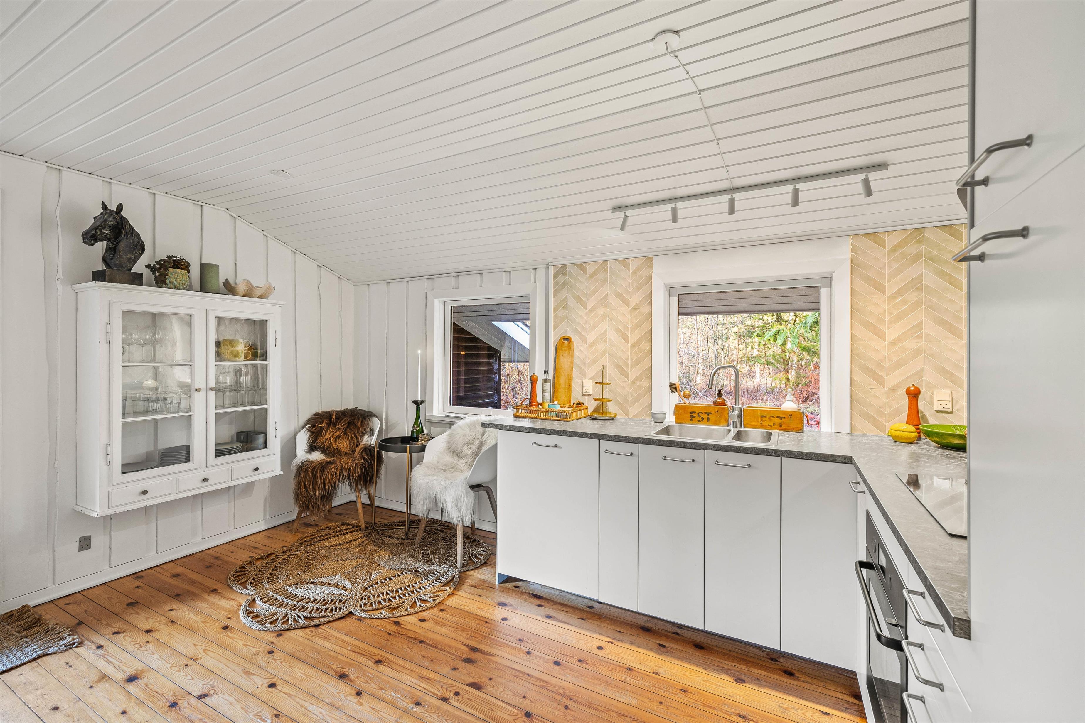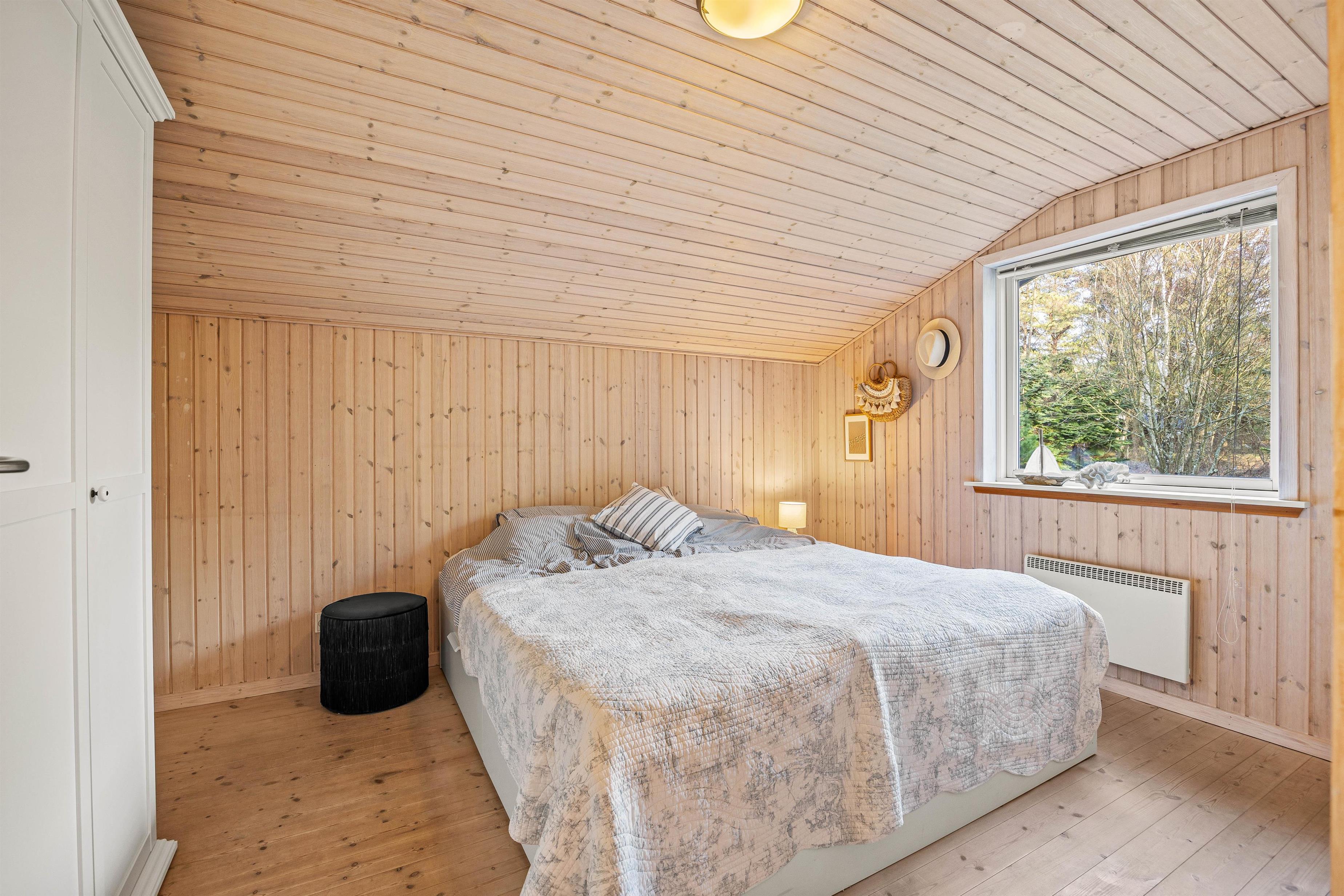 Sommerhusets hjerte er det kombinerede stue- og køkkenalrum. Her kan hele familien samles, til lækre feriemiddage rundt om spisebordet og hyggelige feriestunder foran brændeovnen. Køkkenet er udstyret med en opvaskemaskine, som tager sig af den værste oprydning for jer.