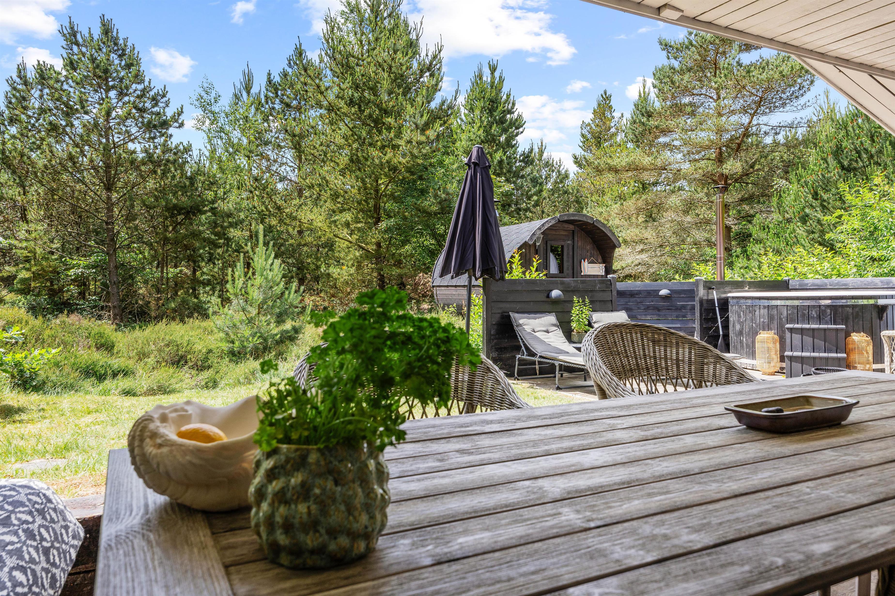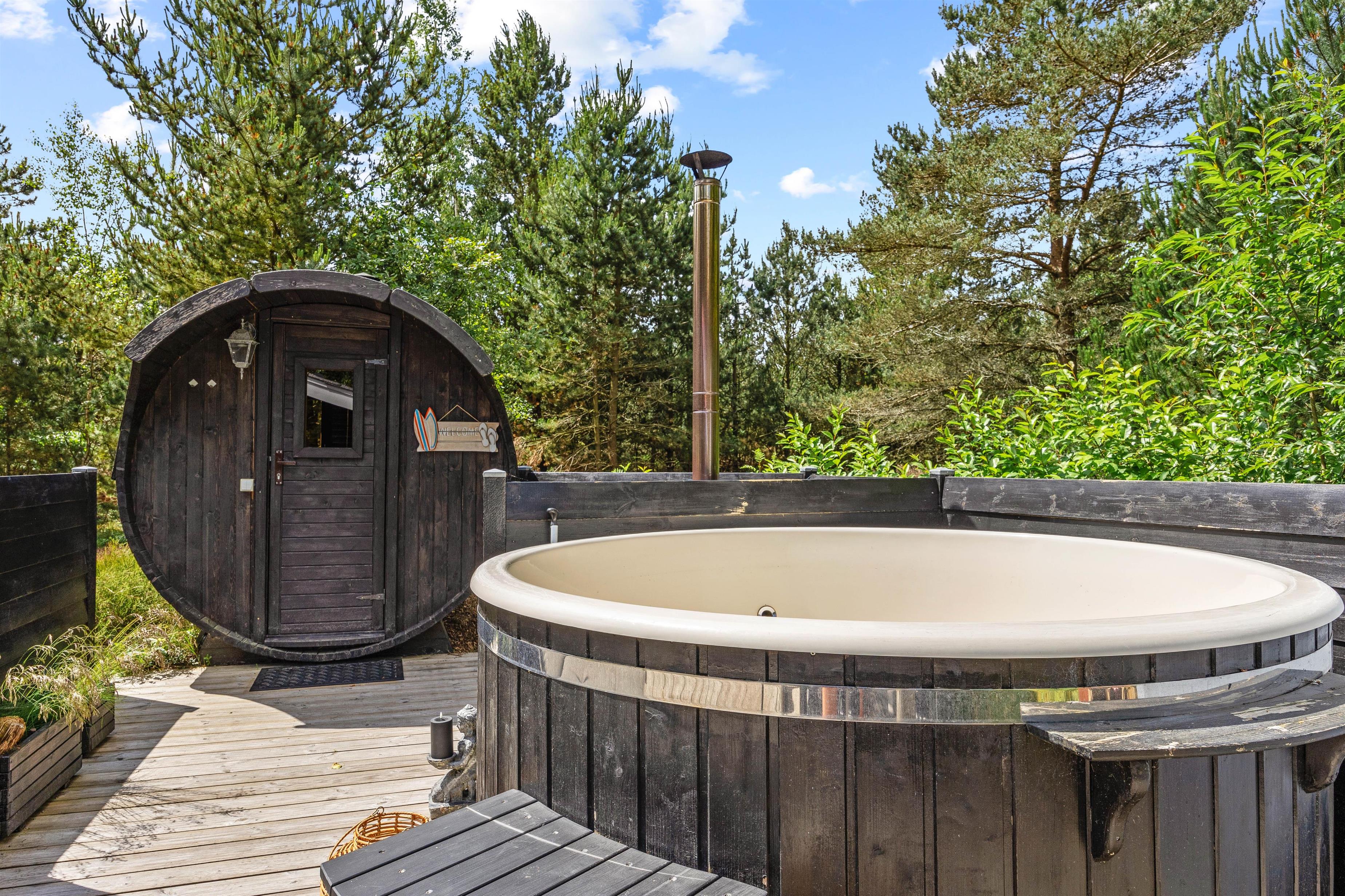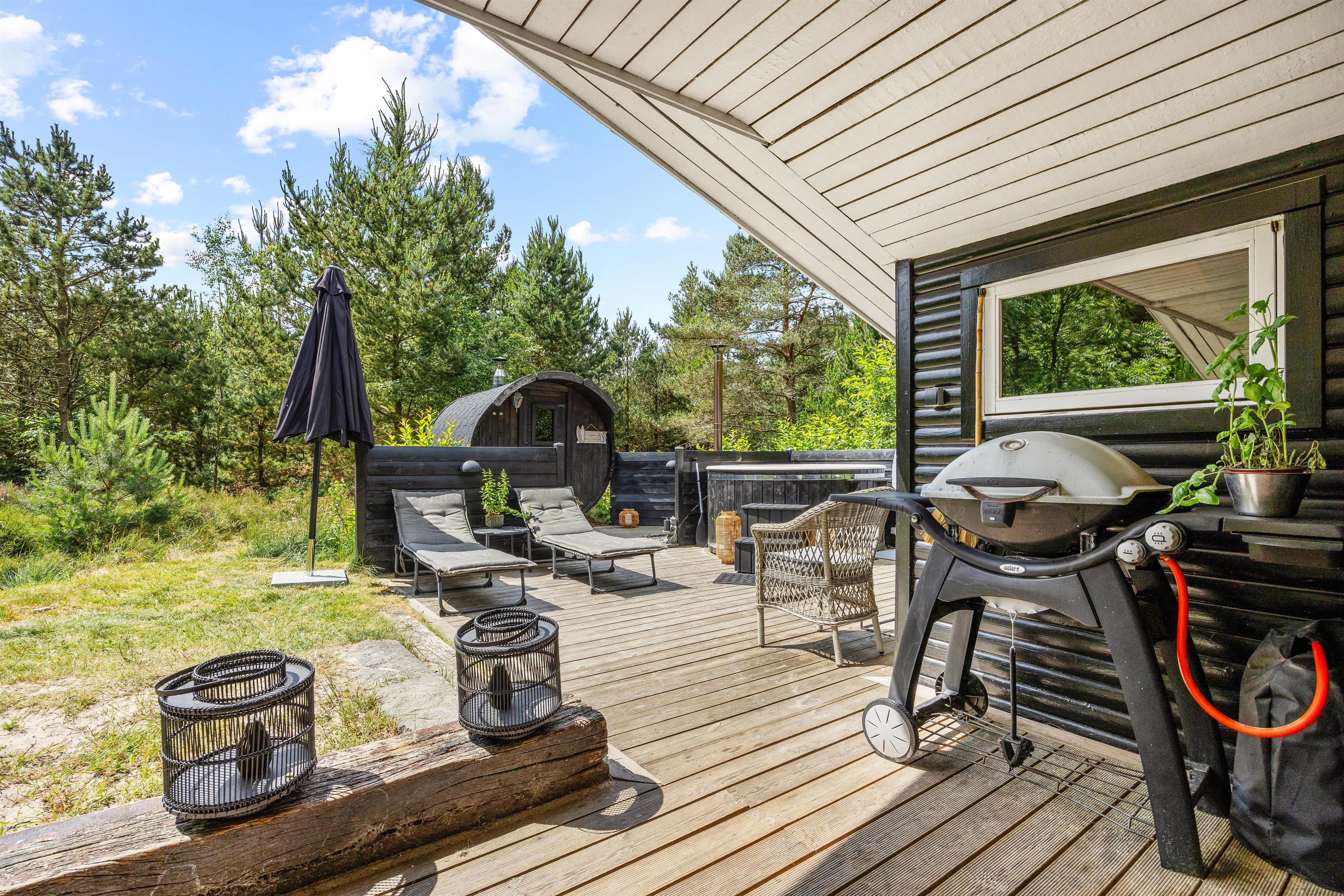 Sommerhuset ligger på en mere end 2.500 kvadratmeter stor naturgrund, omgivet af høje træer, der skærmer grunden og sørger for læ og privatliv. Her midt i den Vestjyske natur kan I forkæle jer selv med en tur i saunaen eller i vildmarksbadet, der begge opvarmes med brænde. Hvem kunne ikke tænke sig at tilbringe en aften med wellness under stjernehimlen. Rundt om sommerhuset er der flere terrasser og hyggelige siddekroge – blandt andet en overdækket del.