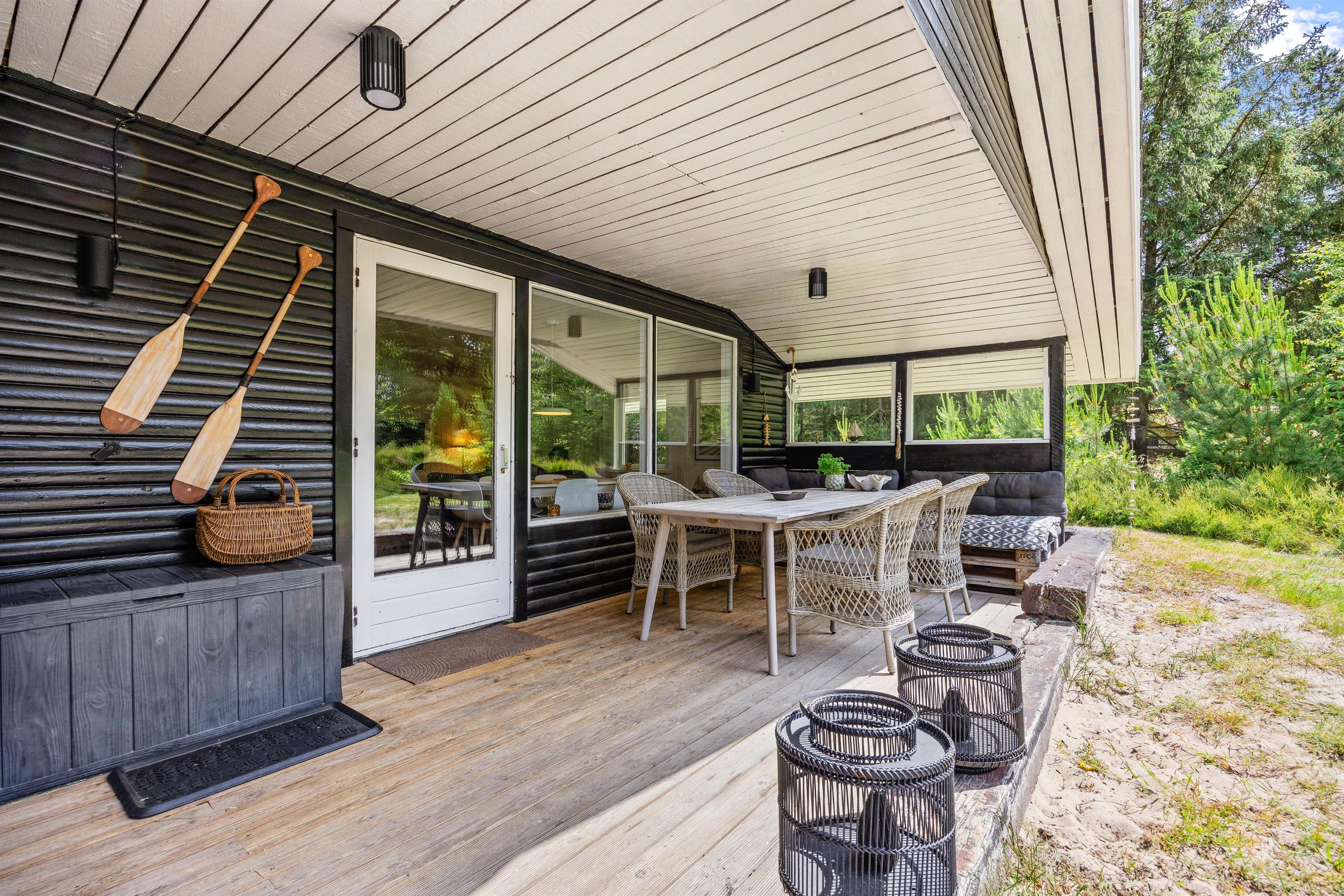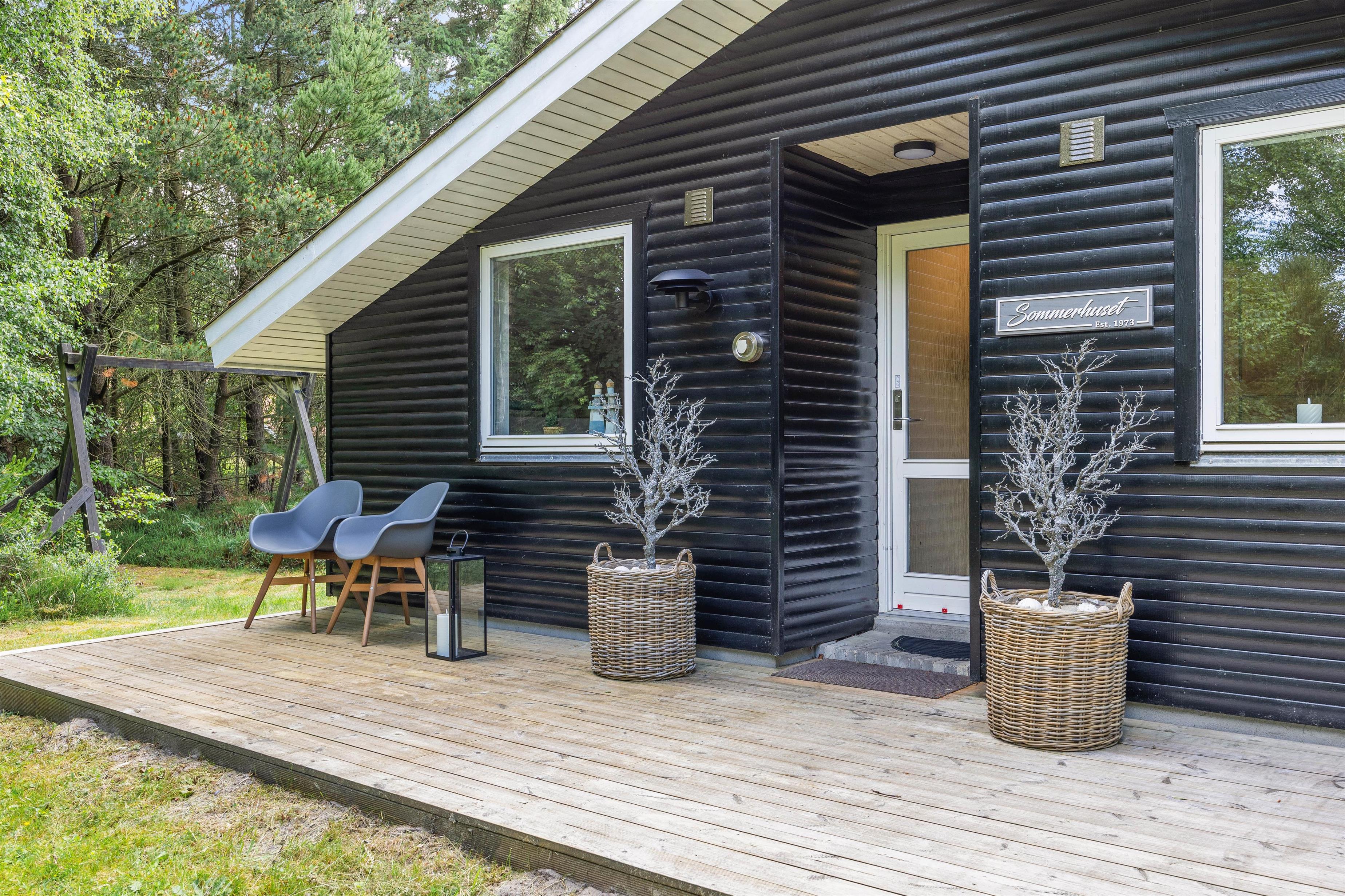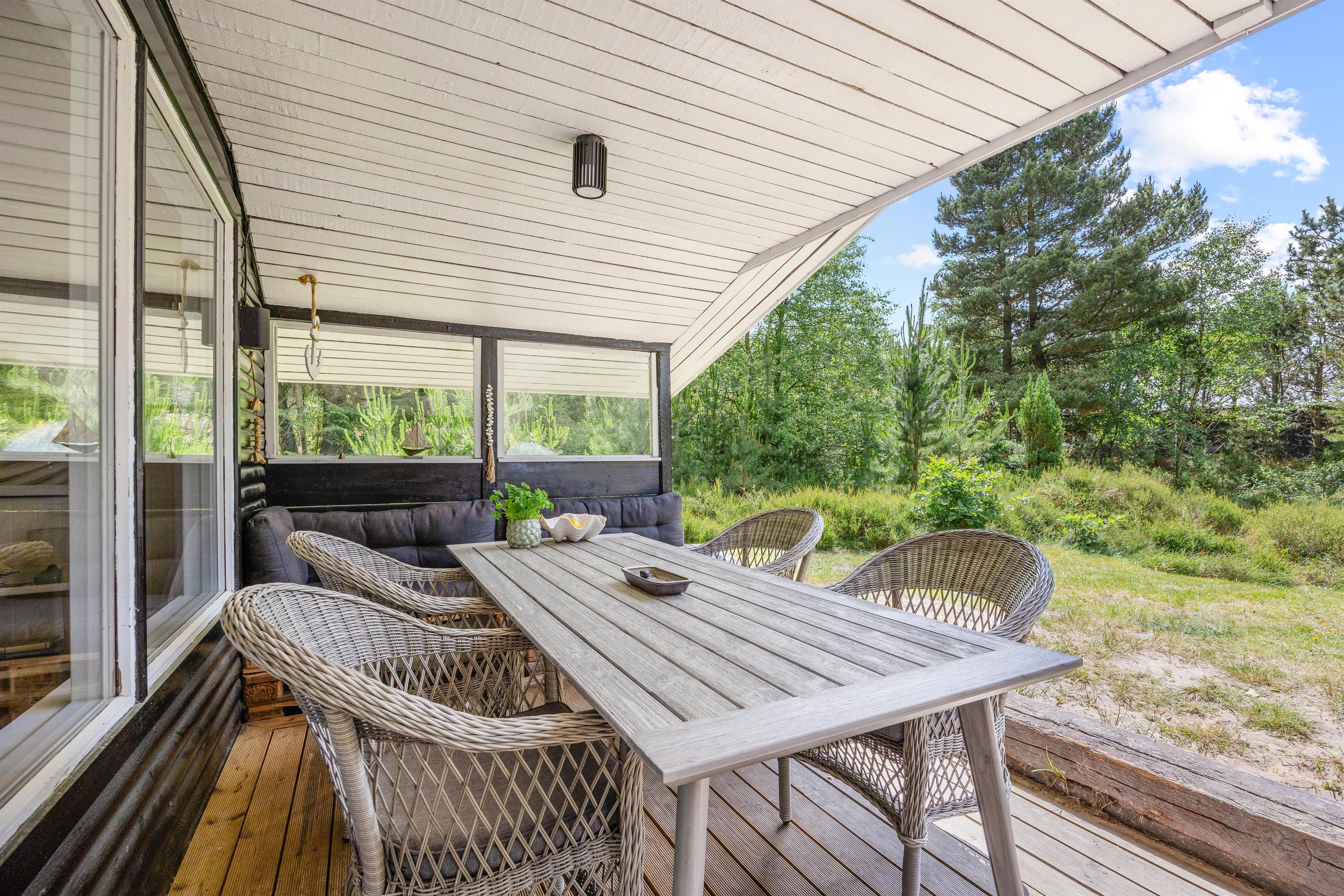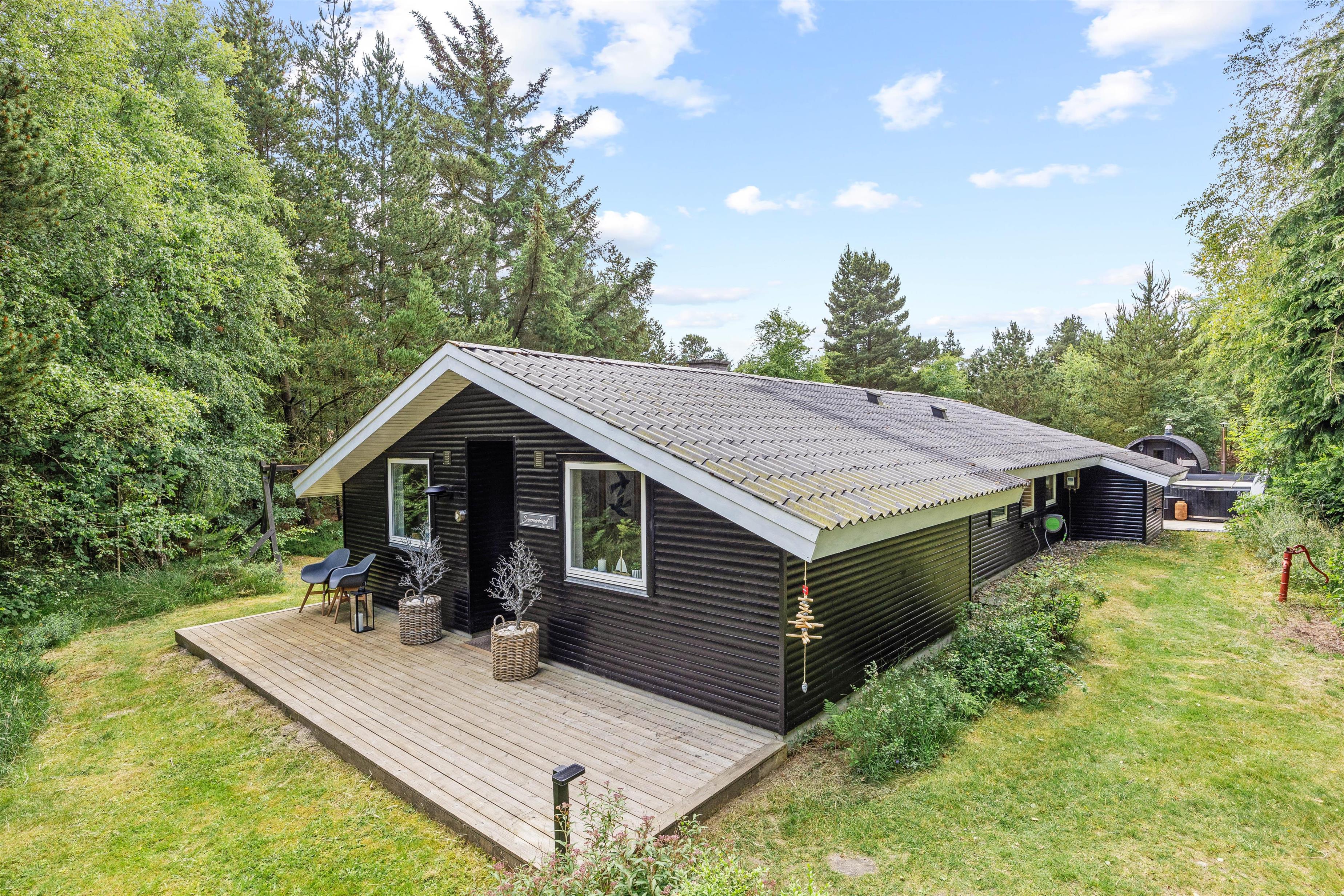 Sommerhuset ligger på en mere end 2.500 kvadratmeter stor naturgrund, omgivet af høje træer, der skærmer grunden og sørger for læ og privatliv. Her midt i den Vestjyske natur kan I forkæle jer selv med en tur i saunaen eller i vildmarksbadet, der begge opvarmes med brænde. Hvem kunne ikke tænke sig at tilbringe en aften med wellness under stjernehimlen. Rundt om sommerhuset er der flere terrasser og hyggelige siddekroge – blandt andet en overdækket del.