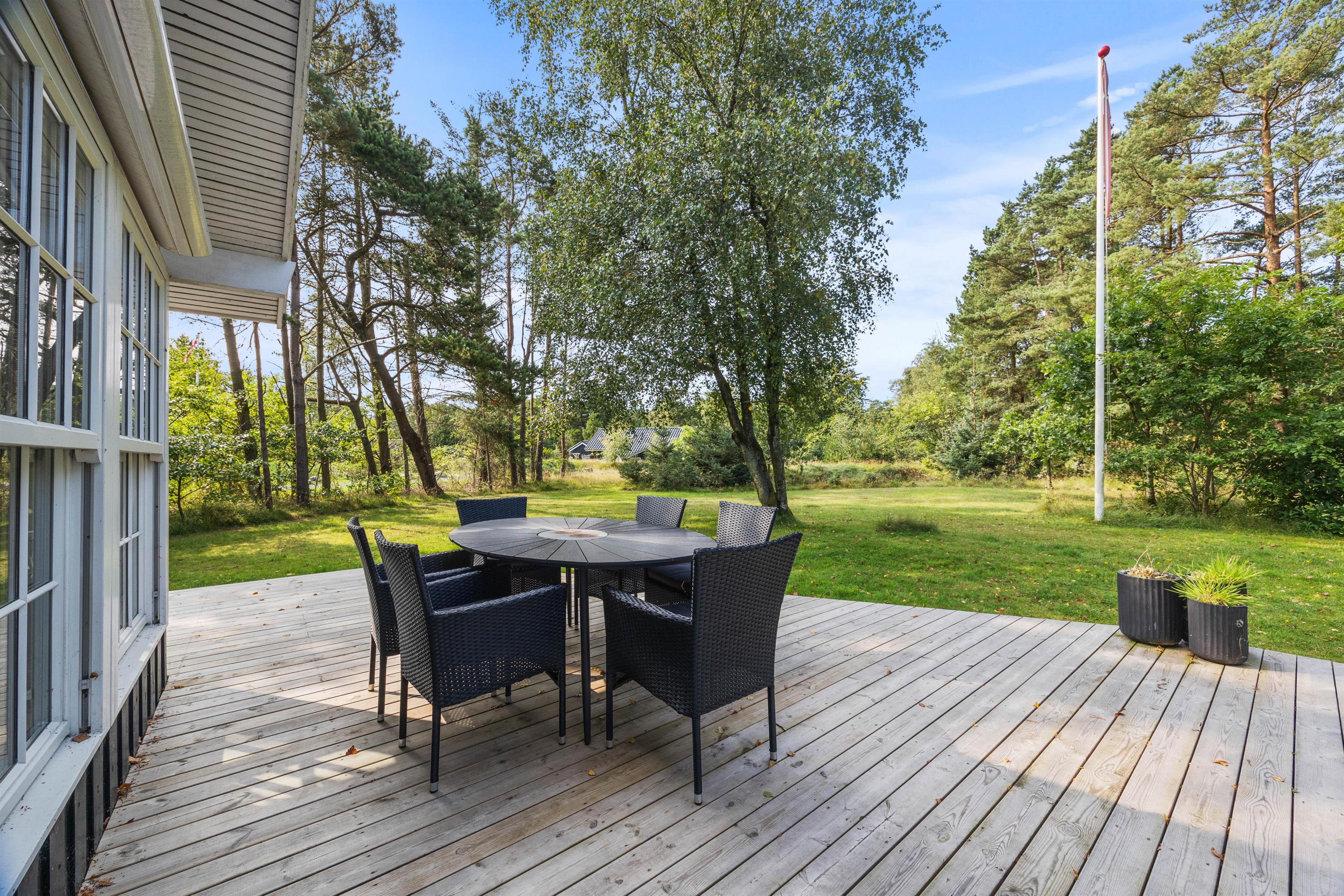 Der er rig mulighed for hygge, leg og afslapning på den 2585 m2 store plænegrund. Fra stuen er der udgang til en skøn træterrasse, hvor havemøbler og liggestolene venter på jer. Her kan I spille kort, solbade eller nyde en god krimi i solen. På de lune sommeraftner er det også her, at I kan nyde en lækker middag tilberedt på grillen. Imens maden forberedes, kan ungerne samle appetit og lege på den grønne plæne.