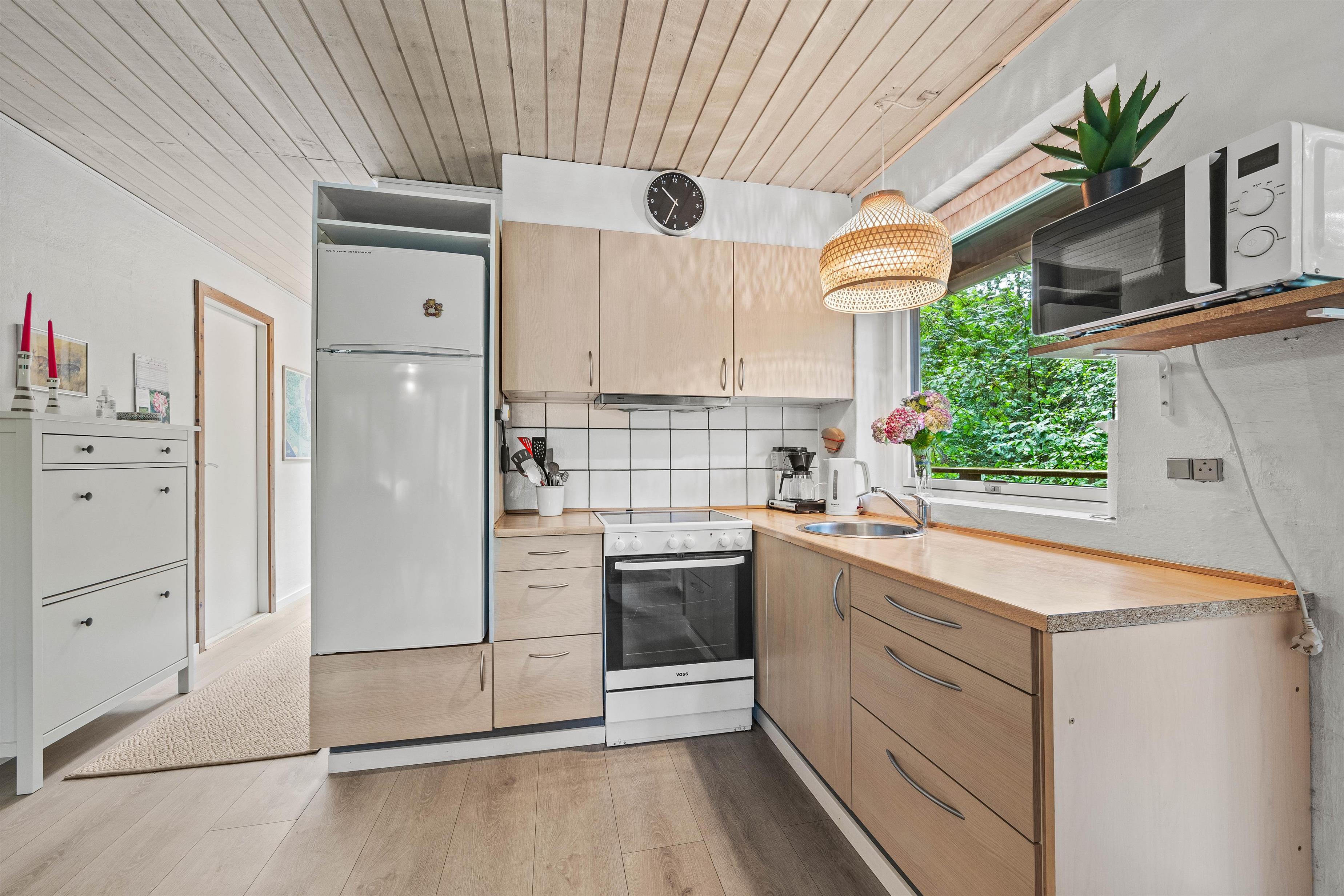 I stueplan er et åbent og lyst rum med køkken, spisestue og opholdsstue i ét. Her er plads til fælles madlavning, spilleaftner og meget mere! Saml familien omkring et hyggeligt brætspil og mærk brændeovnens varme brede sig i rummet - helt perfekt på en kølig aften. Det er også i stueplan I finder husets toilet og badeværelse samt det ene af de 3 soverum. Praktisk er her en energibesparende luft-til-luft varmepumpe, som holder strømomkostningerne nede, og en vaskemaskine, så I undervejs kan opfriske badehåndklæderne.