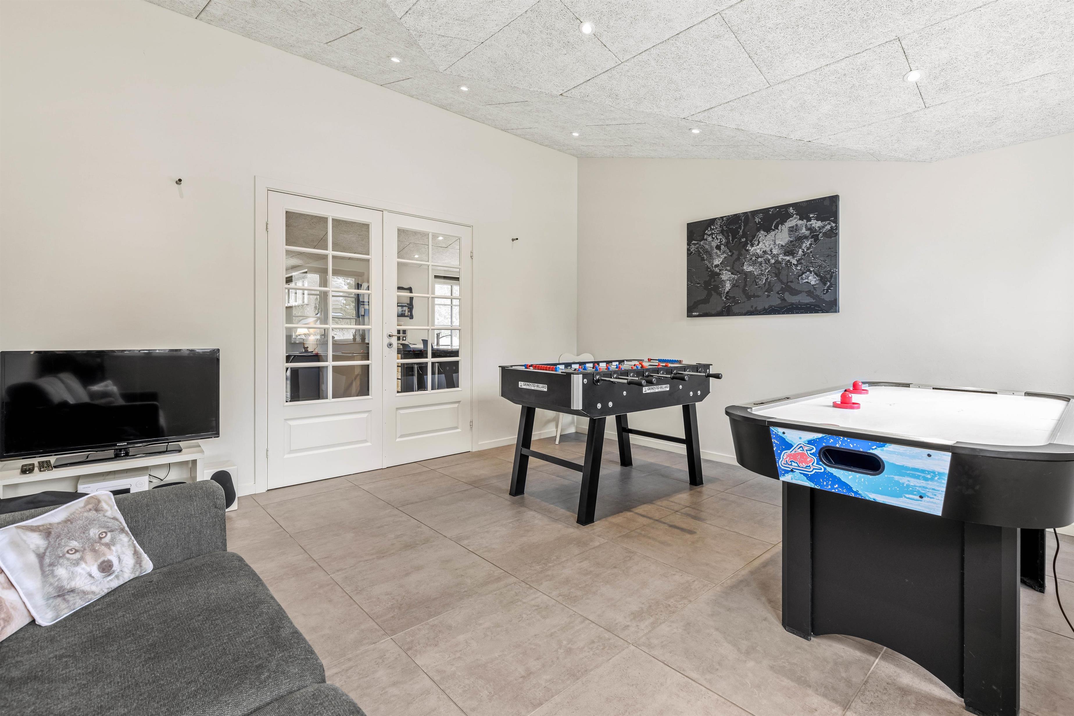 Der er gjort meget ud af, at alle skal befinde sig vel i feriehuset; fra det åbne stue- og køkkenområde kommer man ind i de konkurrenceglade gæsters base, aktivitetsrummet, hvor der både står et airhockeybord og et spil bordfodbold til rådighed. Her kan I rigtig slå jer løs og udfordre hinanden på kryds og tværs.