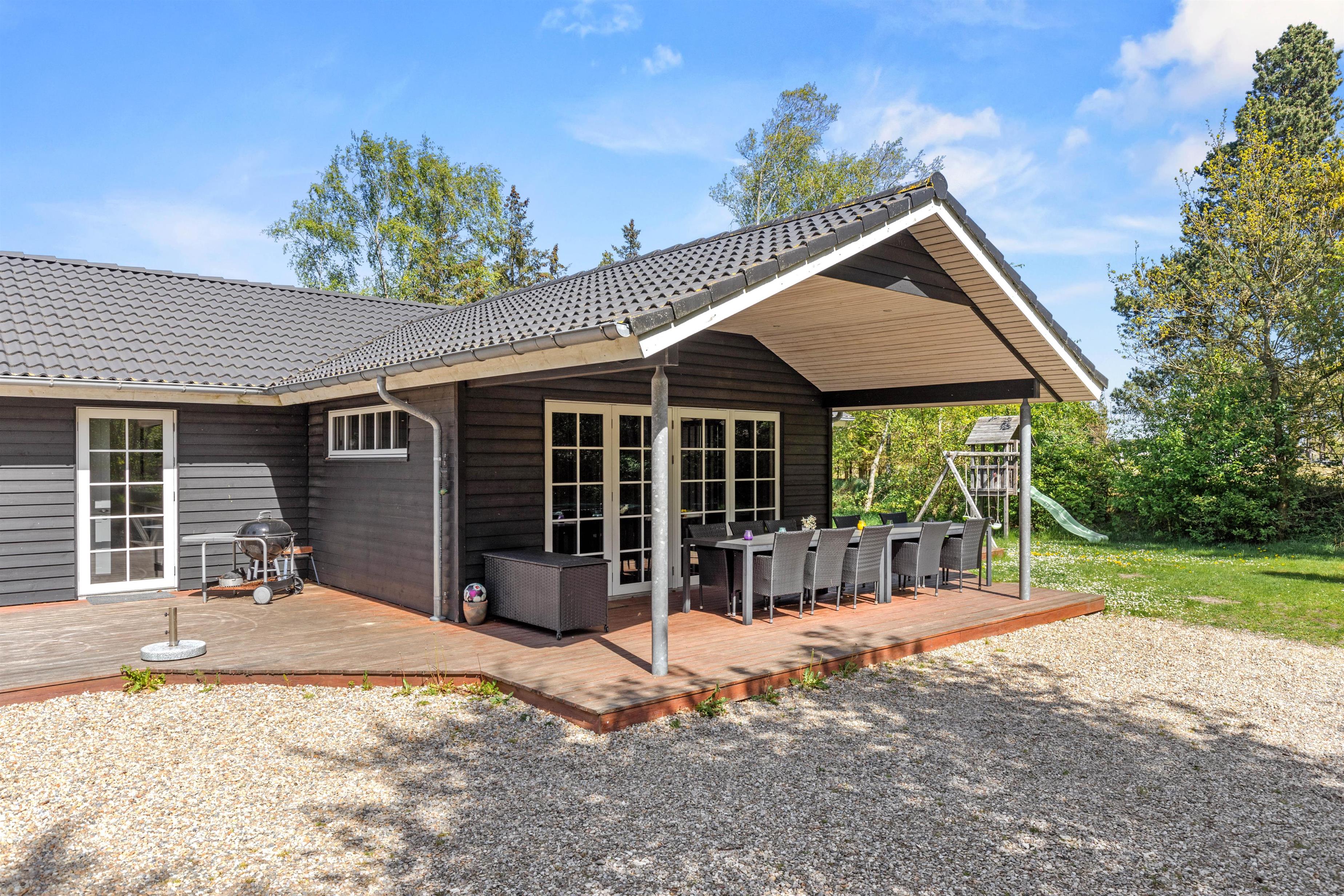 Rundt om feriehuset på de skønne terrasser finder alle hurtigt en plads i solen - eller skyggen under den overdækkede del af terrassen, hvis man er mere til det. De gode havemøbler og liggestole sørger for, at I kan nyde den friske luft og det gode vejr i fulde drag, og de høje træer, der omgiver grunden, giver jer en fantastisk, rolig beliggenhed.