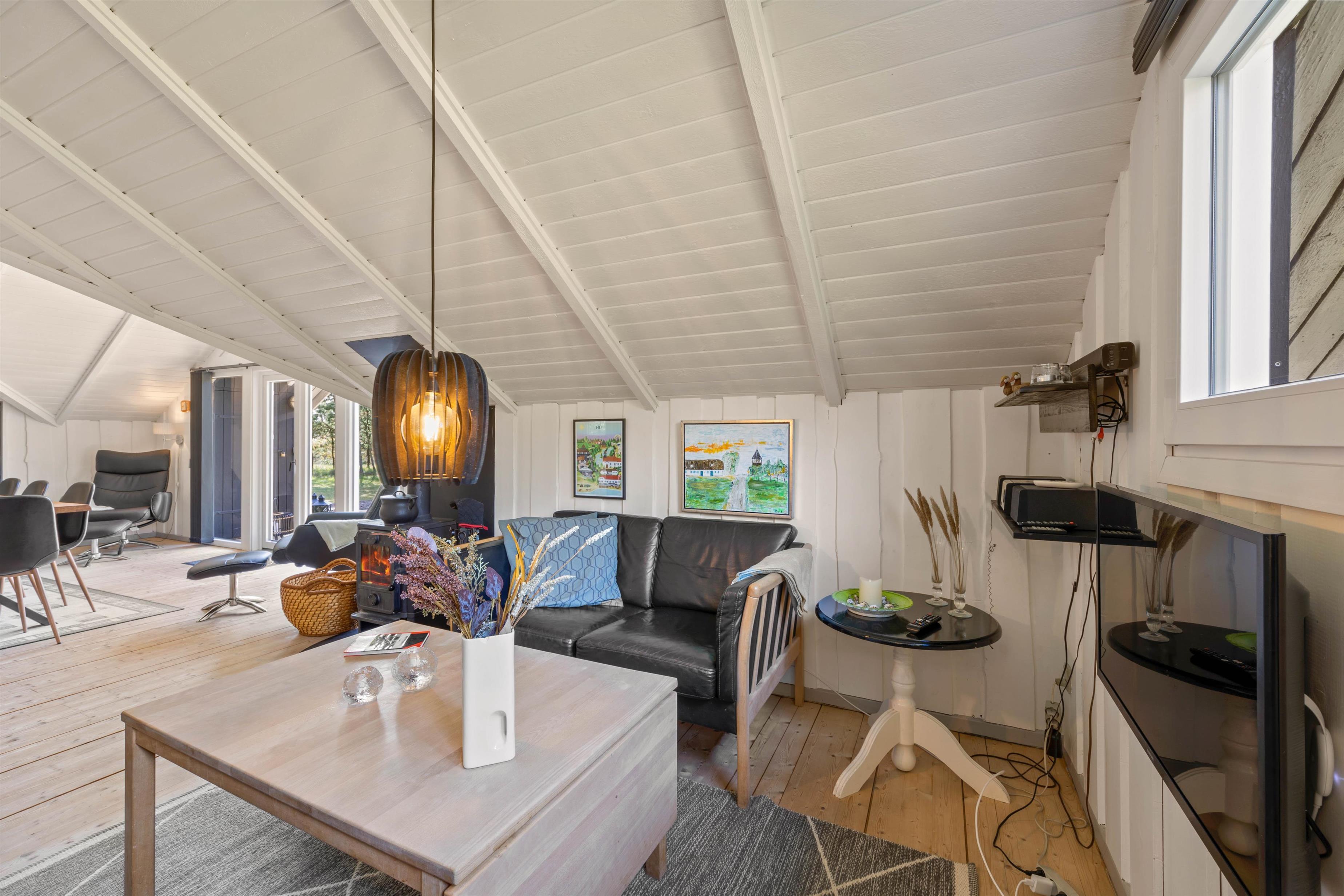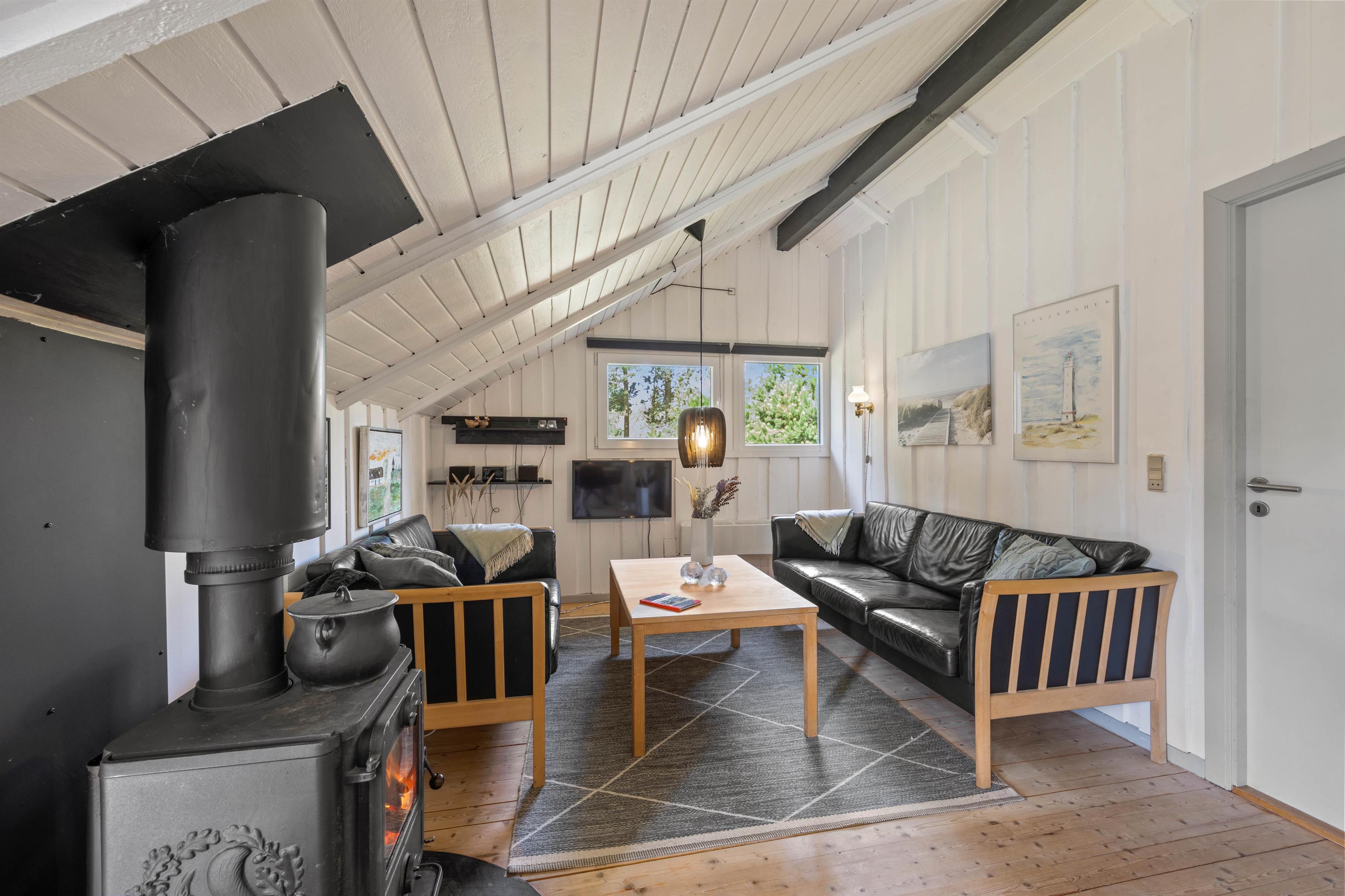 Hjertet i feriehuset på Toftevej 15 i Ho er alrummet, hvor køkken, stue og spiseplads ligger i åben forbindelse. I alrummet er der lagt op til mange hyggelige feriestunder for hele familien, og her sørger brændeovnen for, at feriestemningen er helt i top.