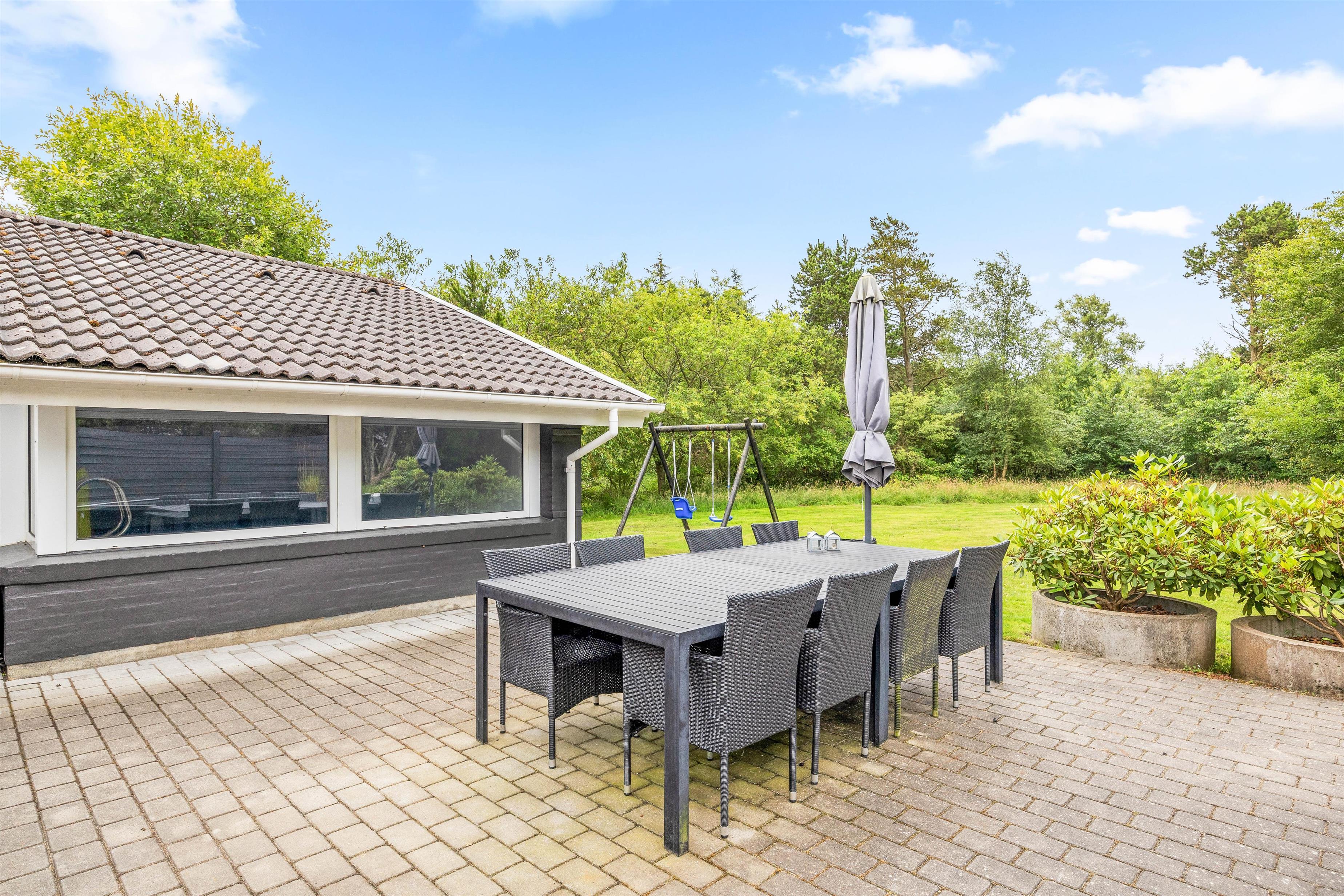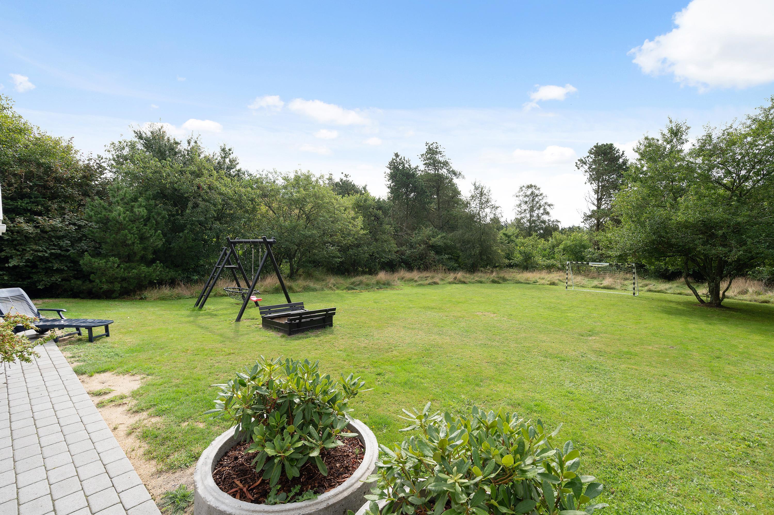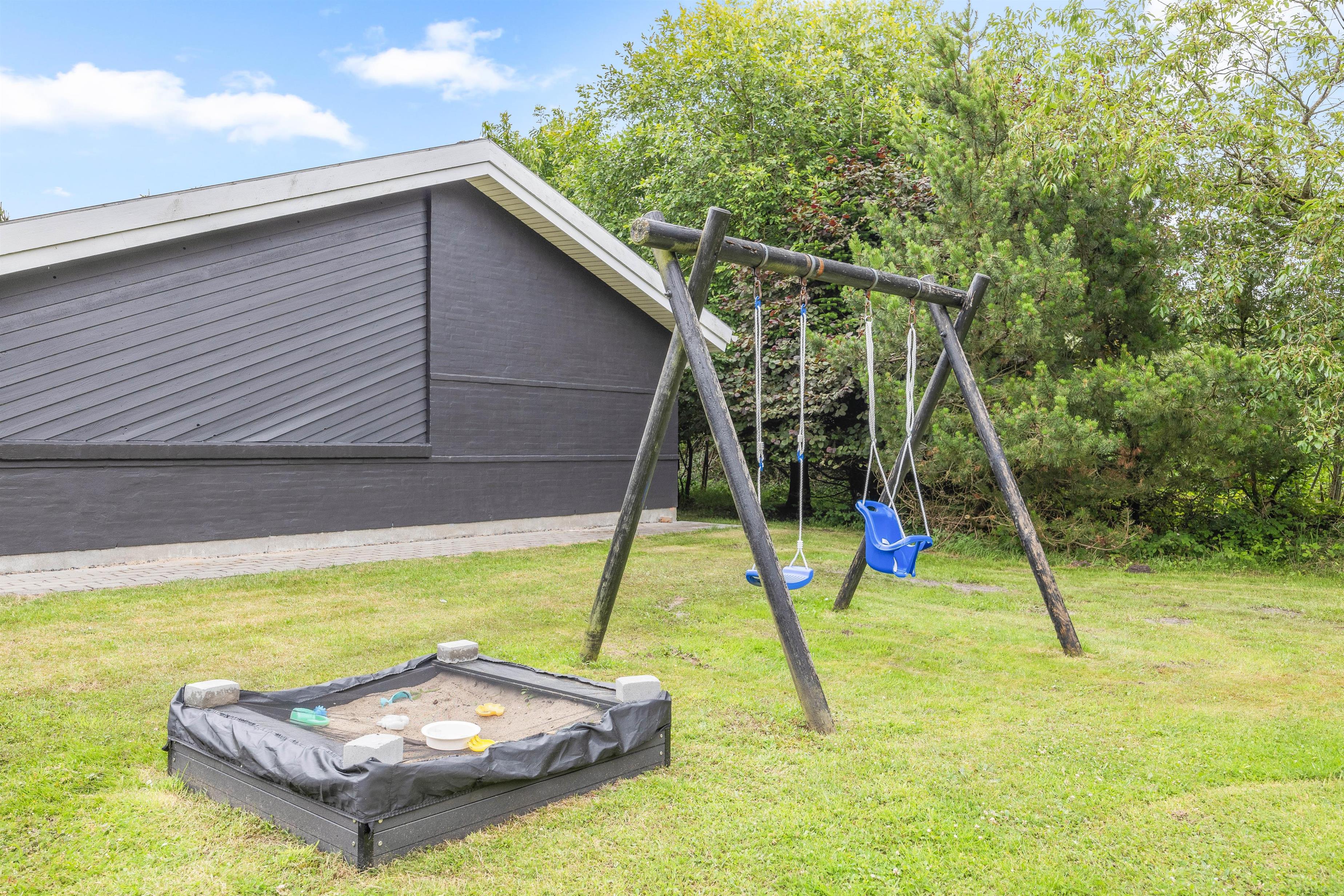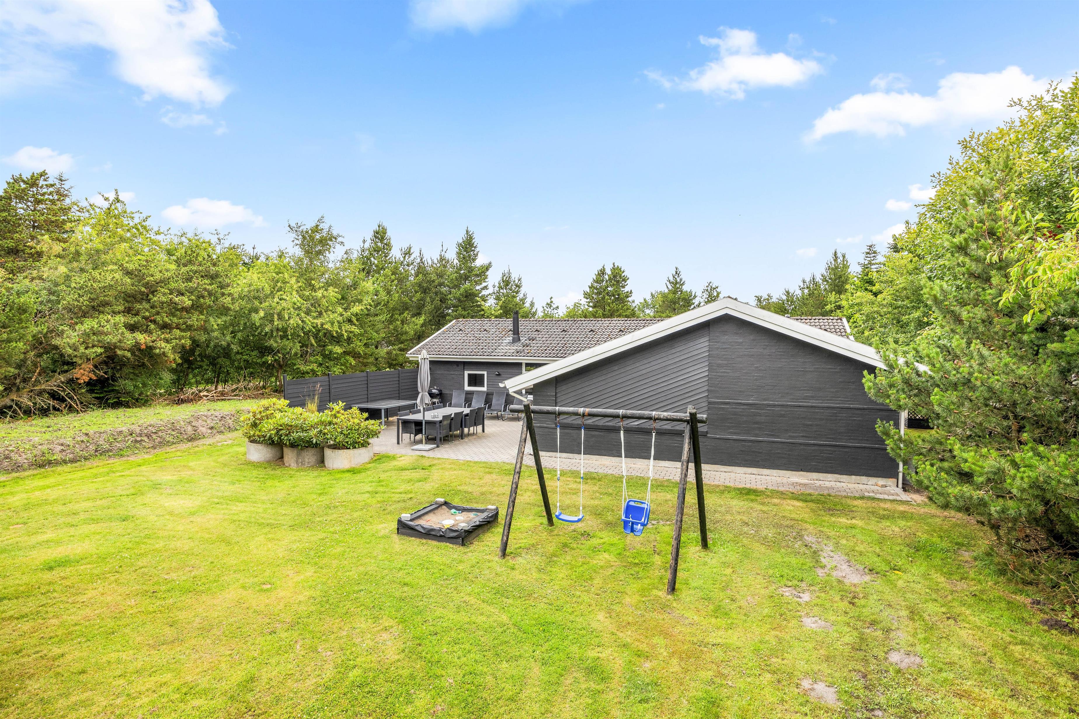 På de solrige dage kan I rykke feriehyggen ud på den store terrasse. Her står både havemøbler, liggestole og grill klar til jer. Den 2.500 kvadratmeter store grund er godt afskærmet af høje træer og råder over en stor græsplæne, hvor børnene og hundene kan tumle rundt, mens I ser på fra terrassen. Der er både gyngestativ, sandkasse og fodboldmål på grunden.