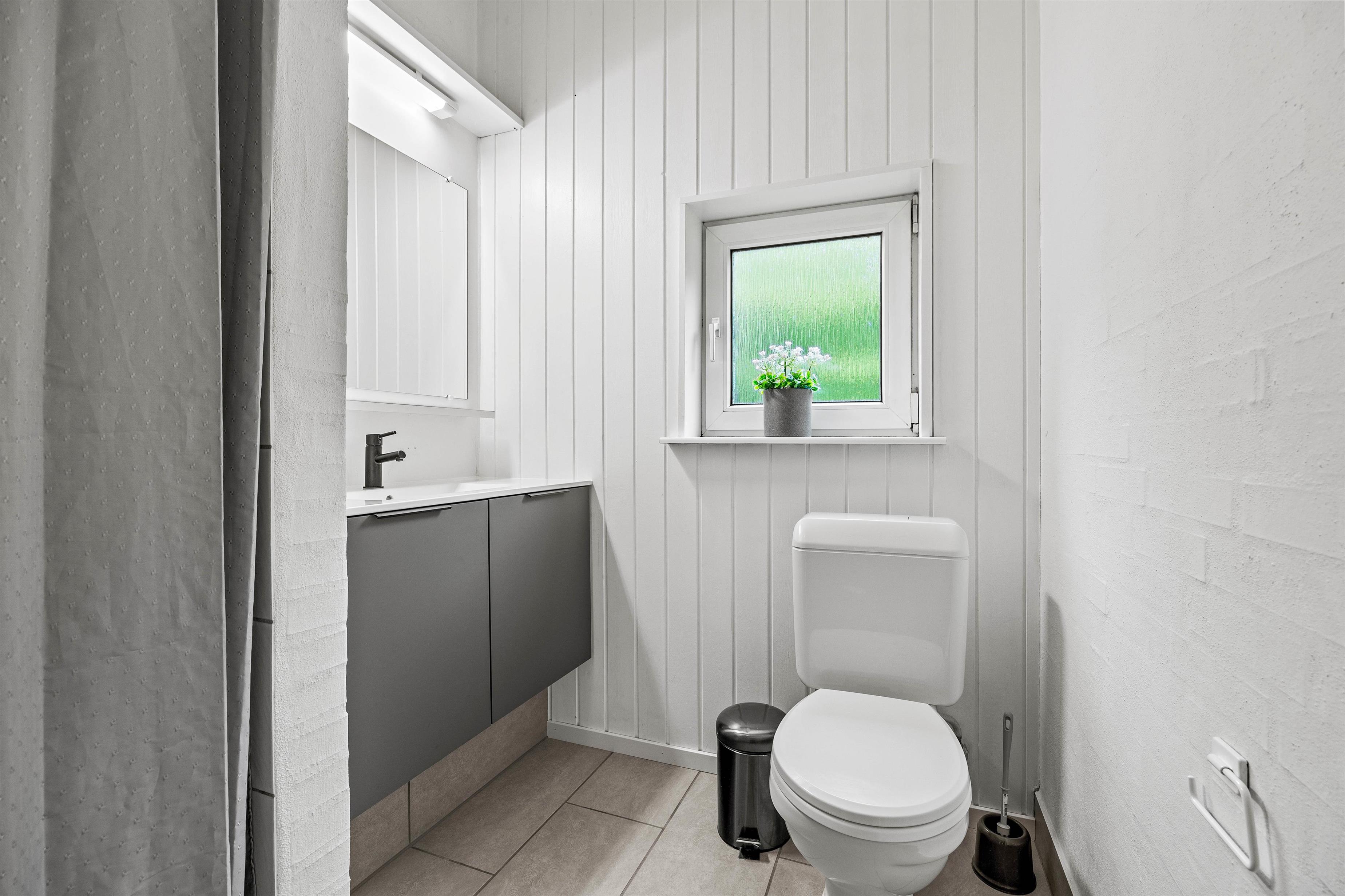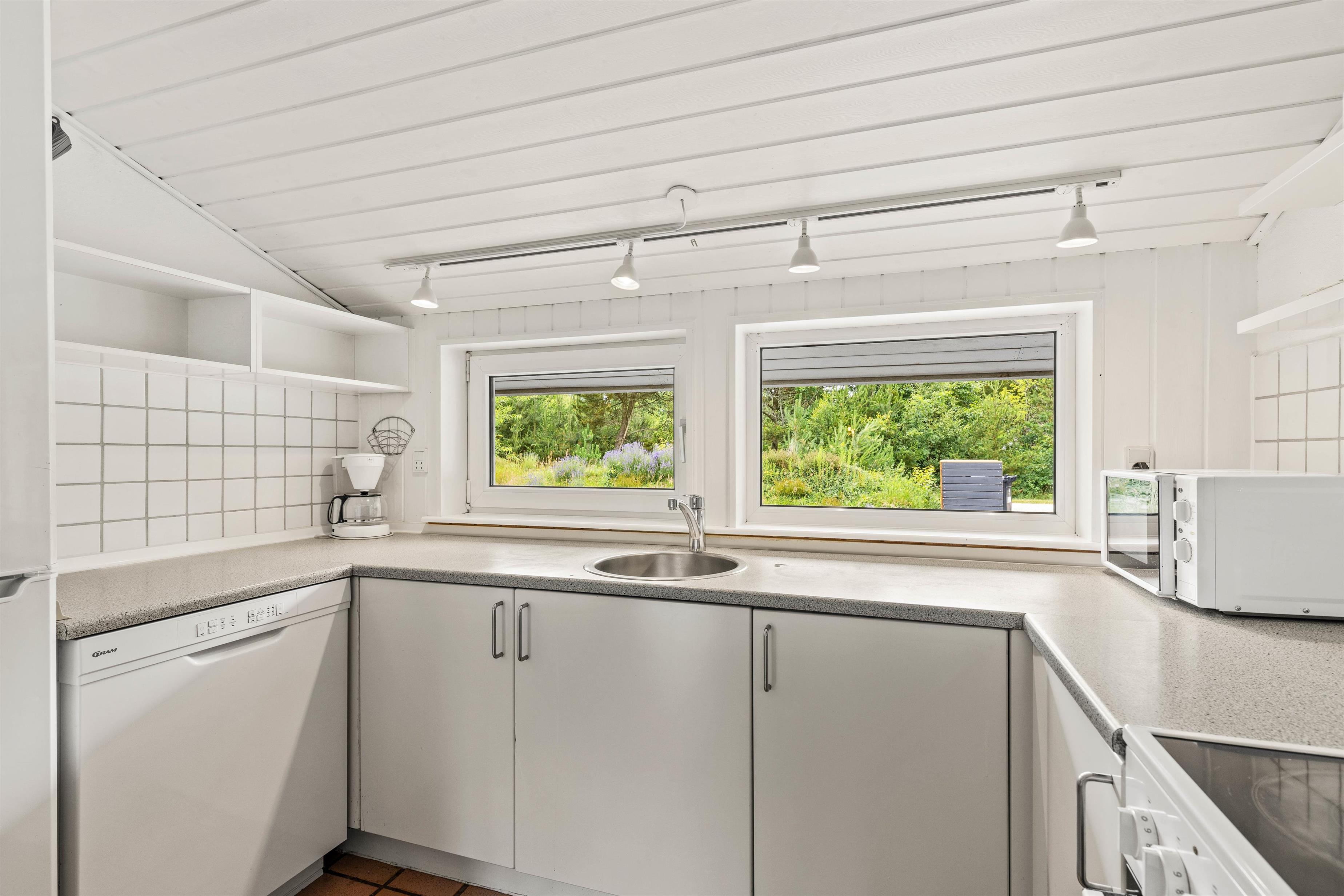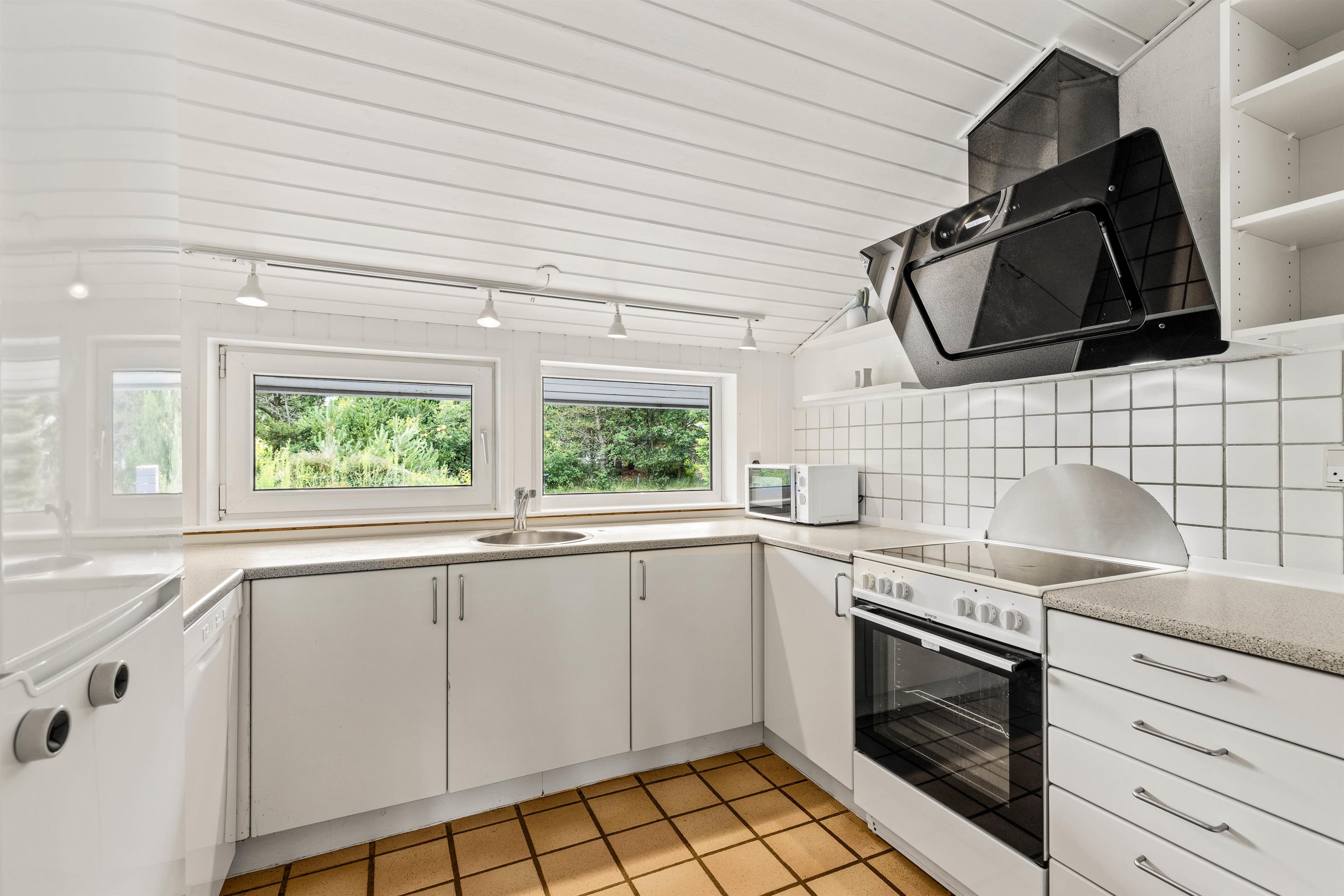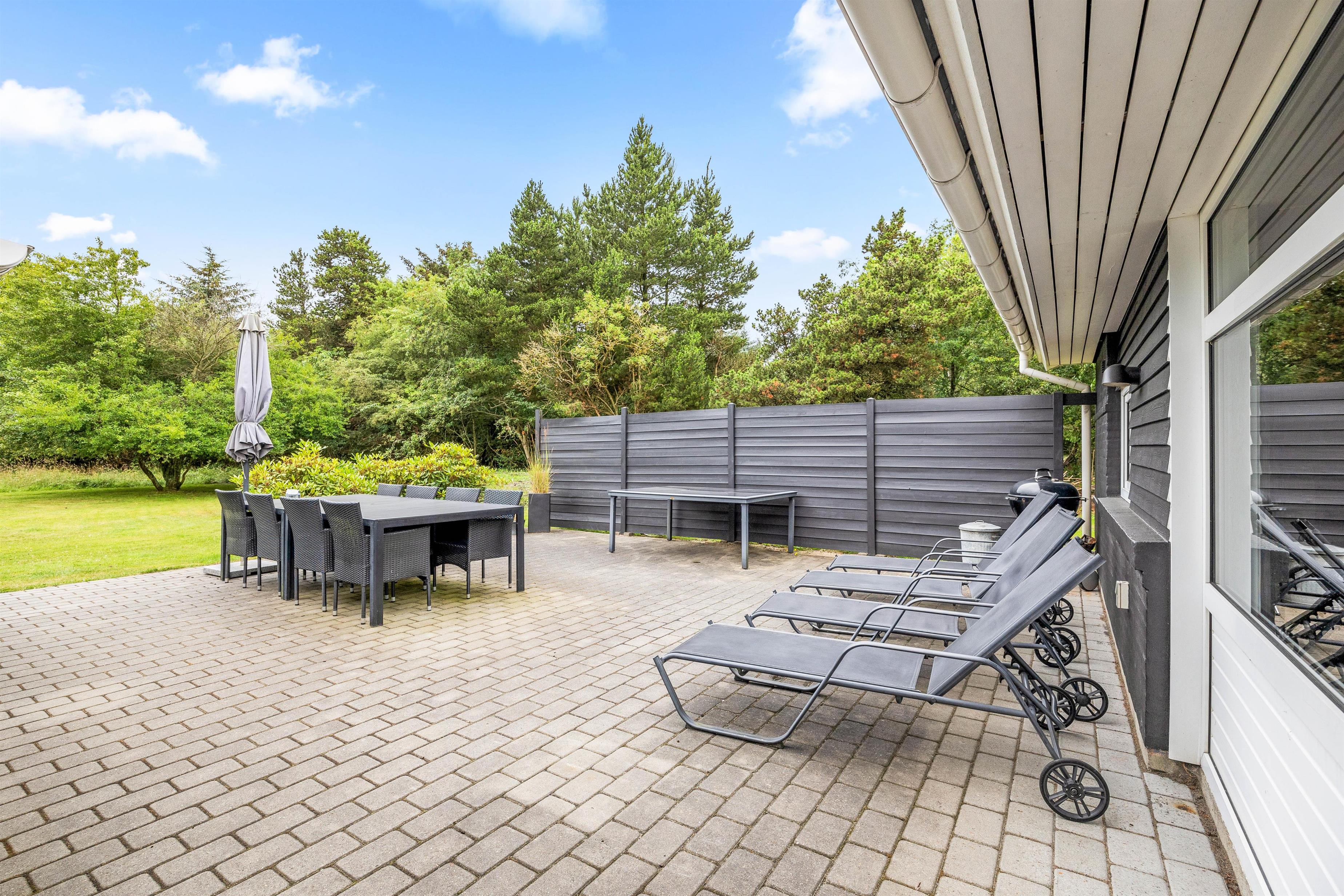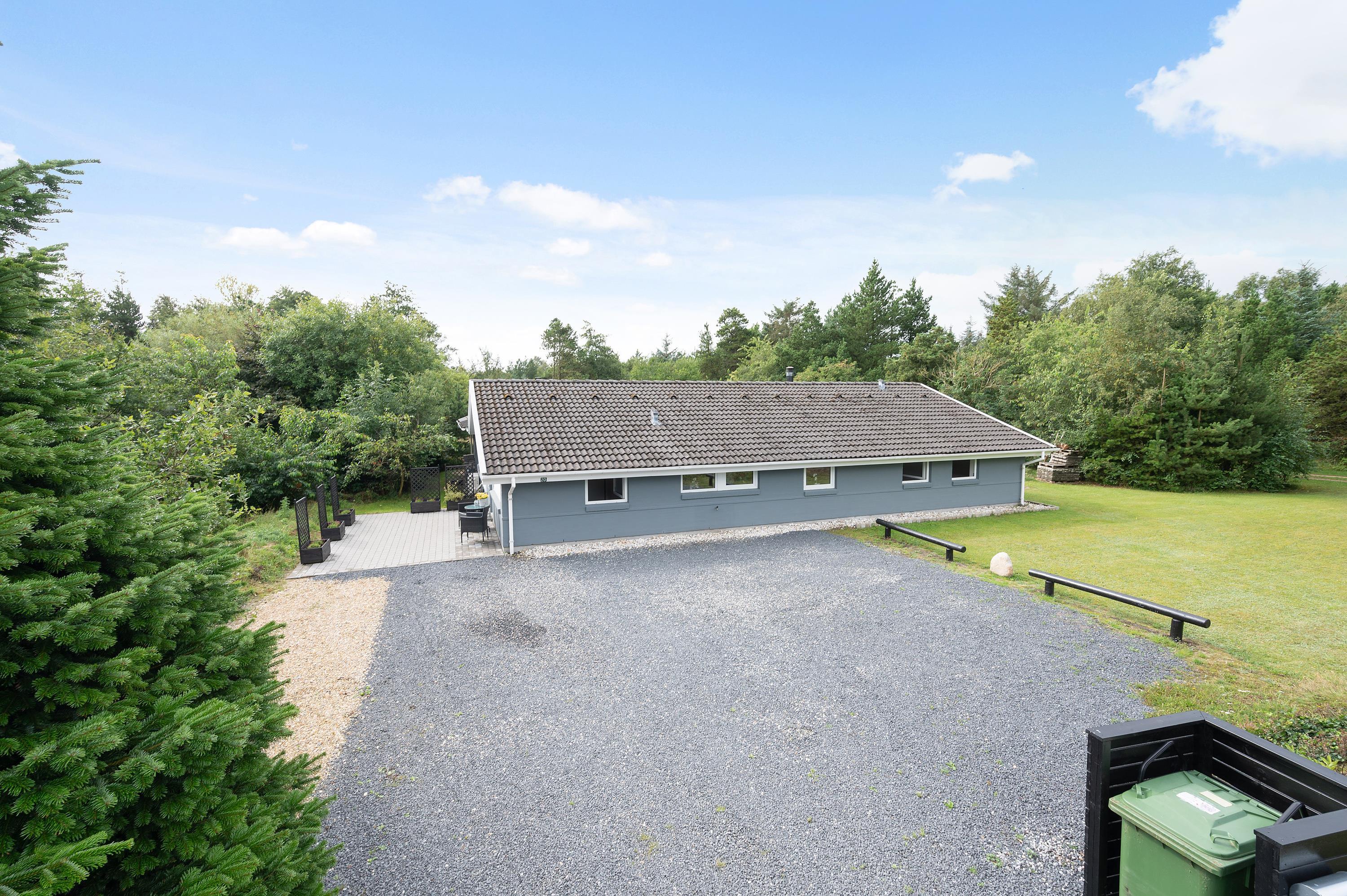 På de solrige dage kan I rykke feriehyggen ud på den store terrasse. Her står både havemøbler, liggestole og grill klar til jer. Den 2.500 kvadratmeter store grund er godt afskærmet af høje træer og råder over en stor græsplæne, hvor børnene og hundene kan tumle rundt, mens I ser på fra terrassen. Der er både gyngestativ, sandkasse og fodboldmål på grunden.