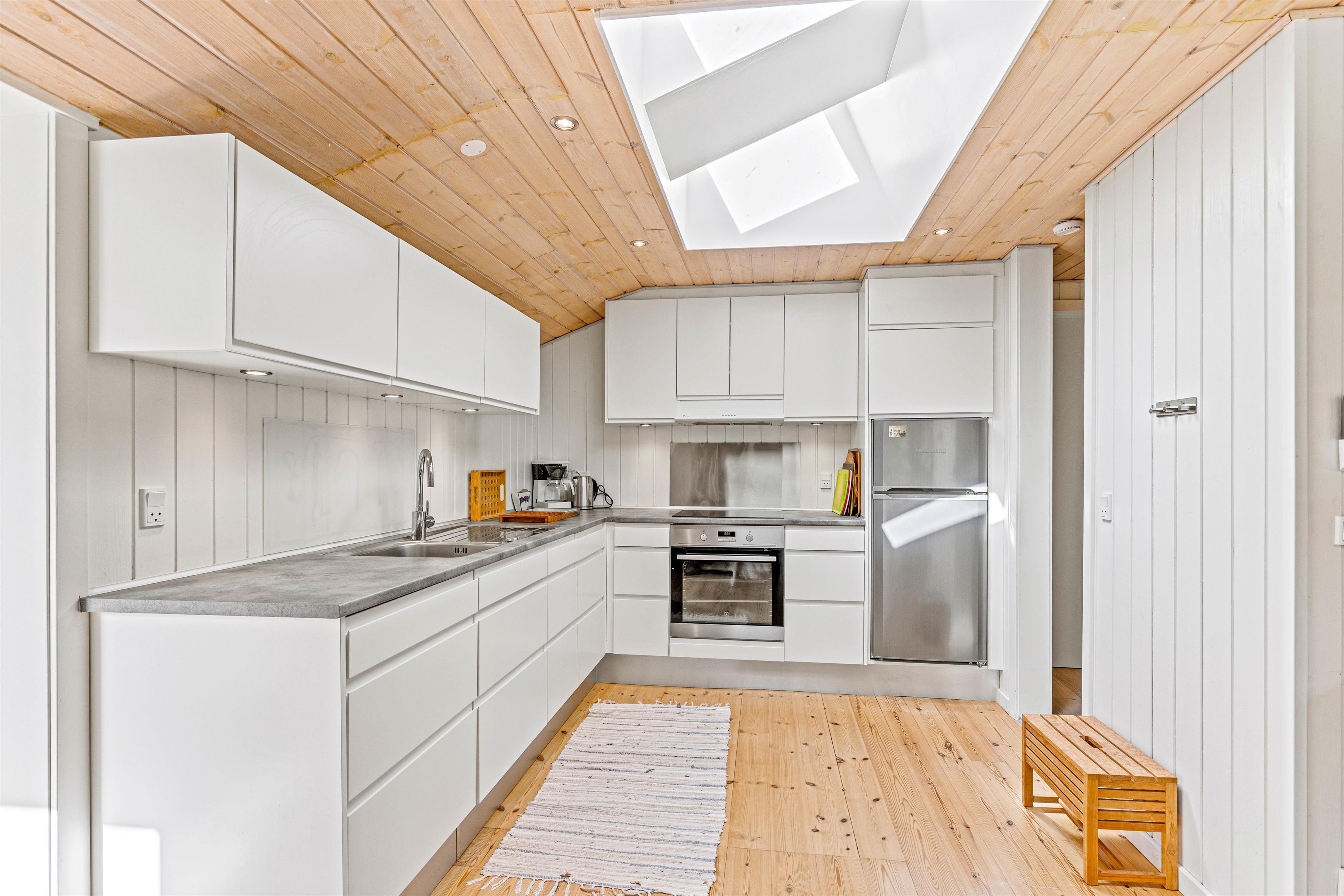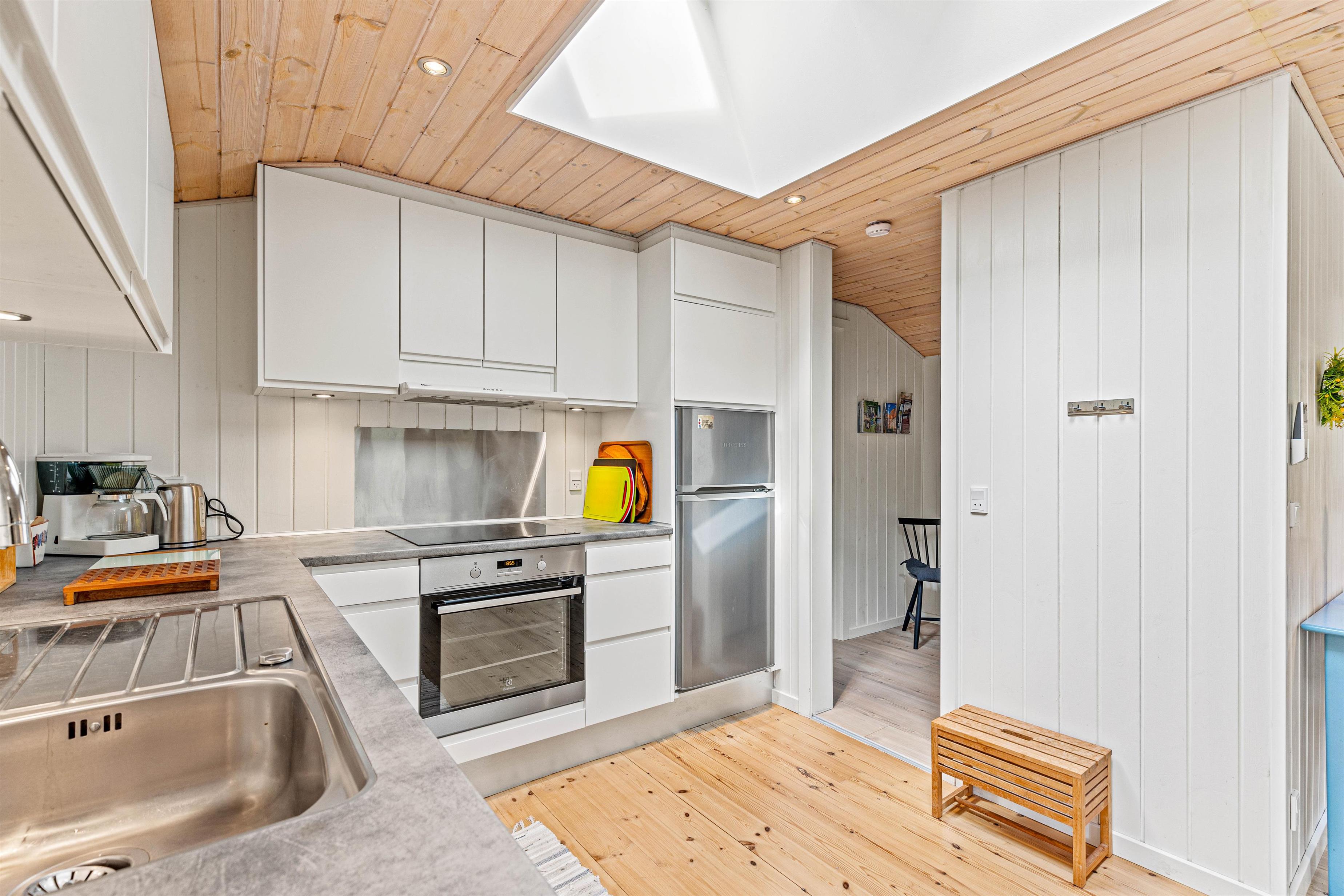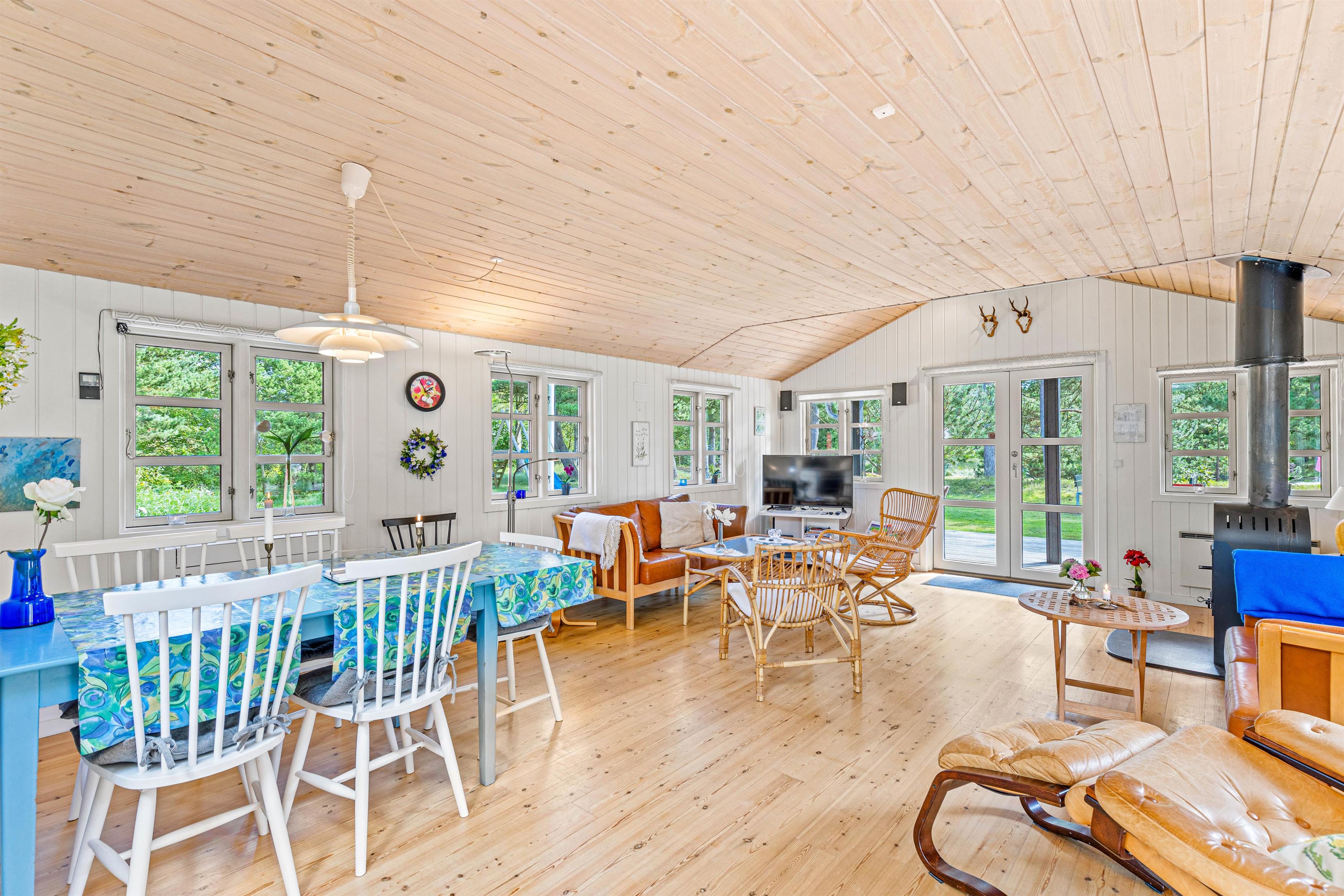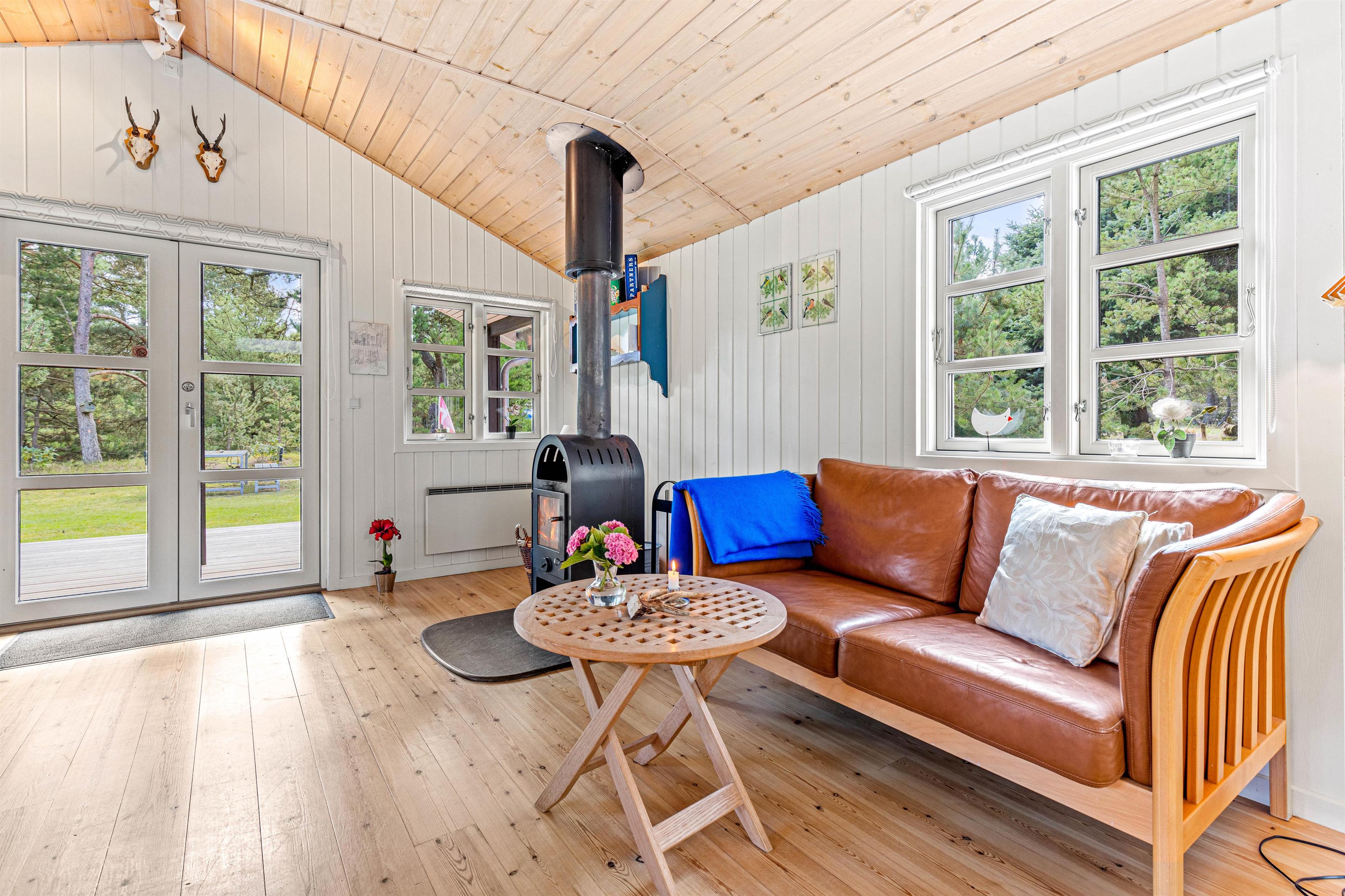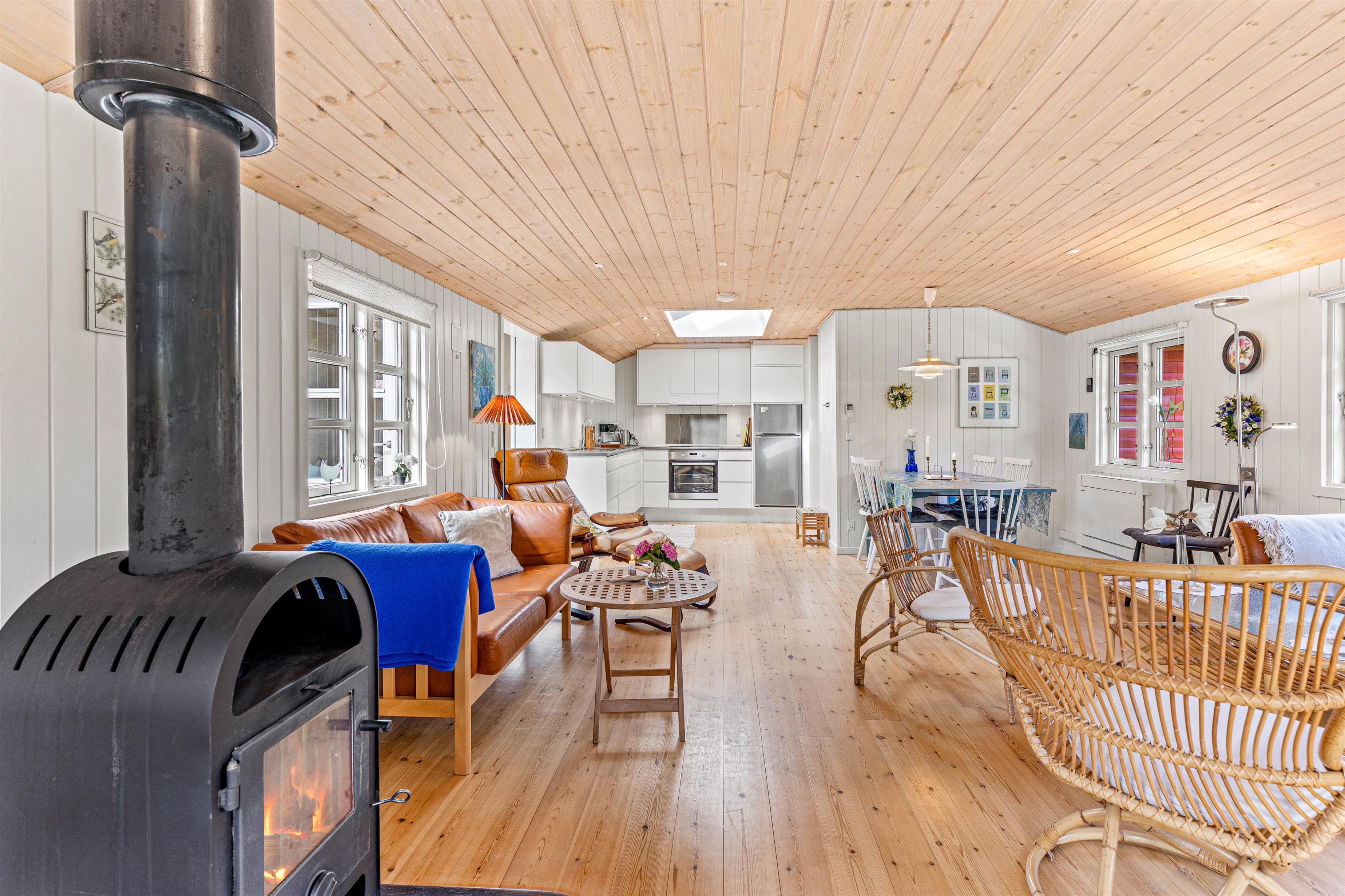 Det 70 m2 store træhus fra 1975 er utroligt godt indrettet med både åbent lyst køkken med opvaskemaskine, mikroovn og induktionskogeplade i direkte sammenhæng med spiseplads og stuen. Her er der flere hyggepladser tæt på brændeovnen, så I kan slappe af med spil, en spændende film eller en god bog, mens ilden knitrer og kaffen brygges.