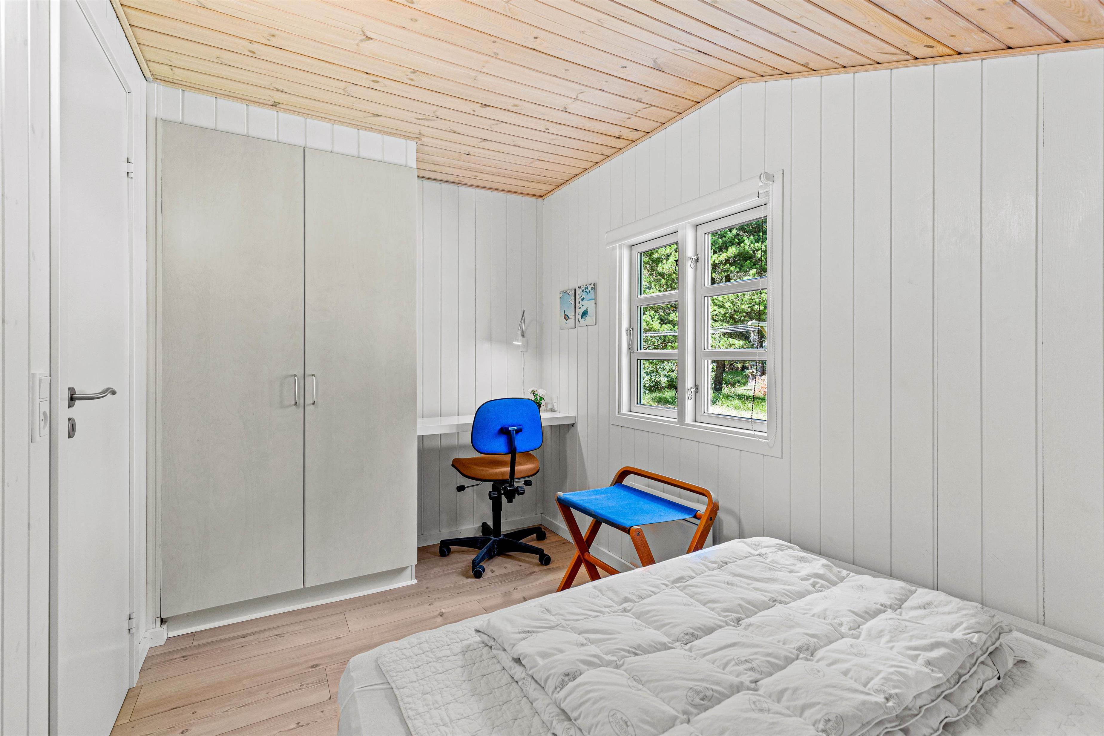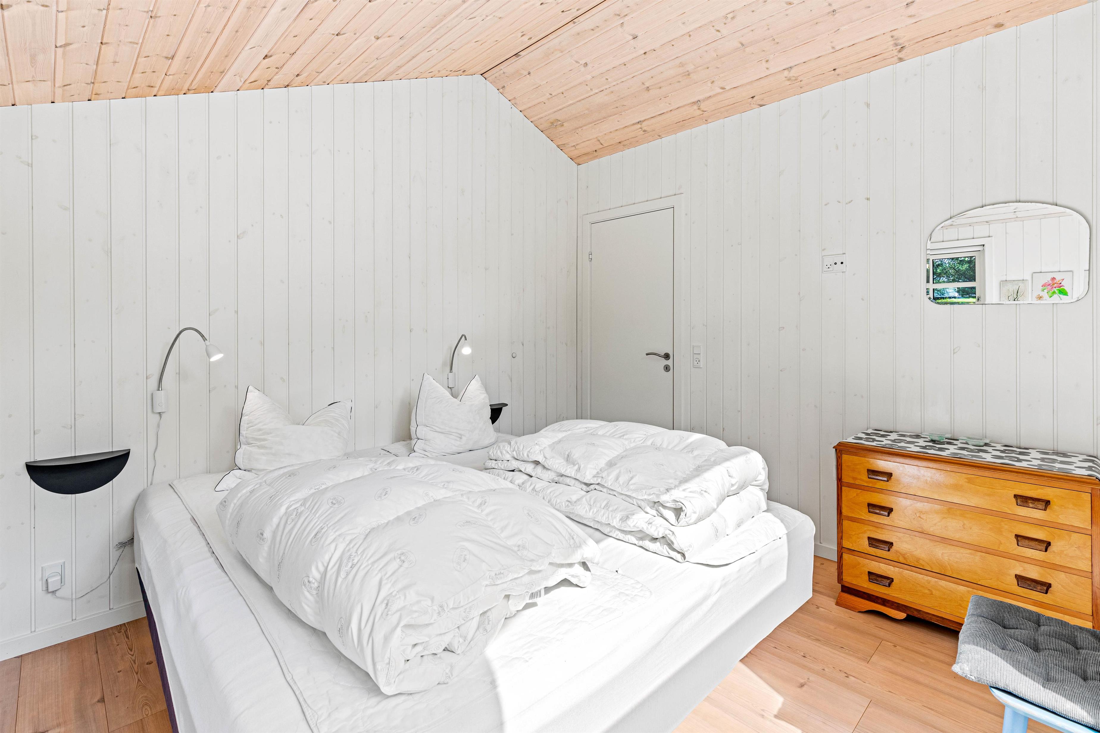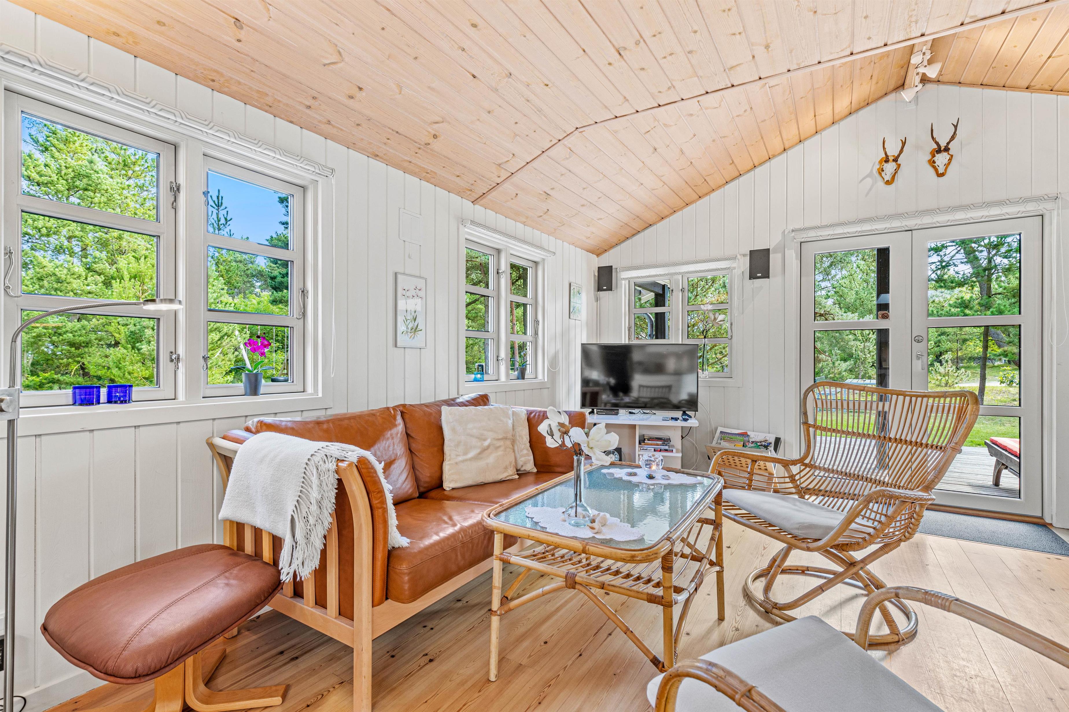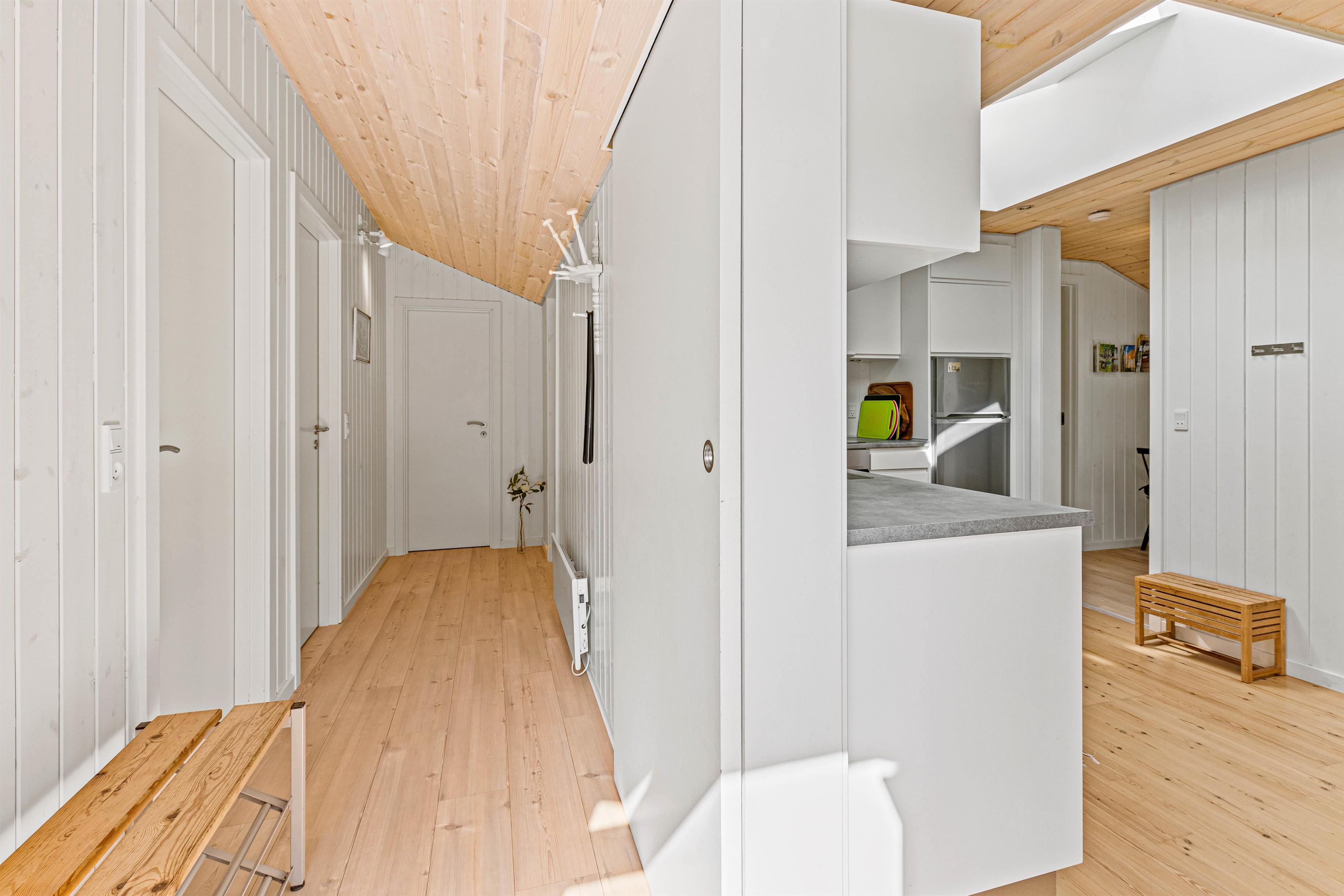 Det 70 m2 store træhus fra 1975 er utroligt godt indrettet med både åbent lyst køkken med opvaskemaskine, mikroovn og induktionskogeplade i direkte sammenhæng med spiseplads og stuen. Her er der flere hyggepladser tæt på brændeovnen, så I kan slappe af med spil, en spændende film eller en god bog, mens ilden knitrer og kaffen brygges.