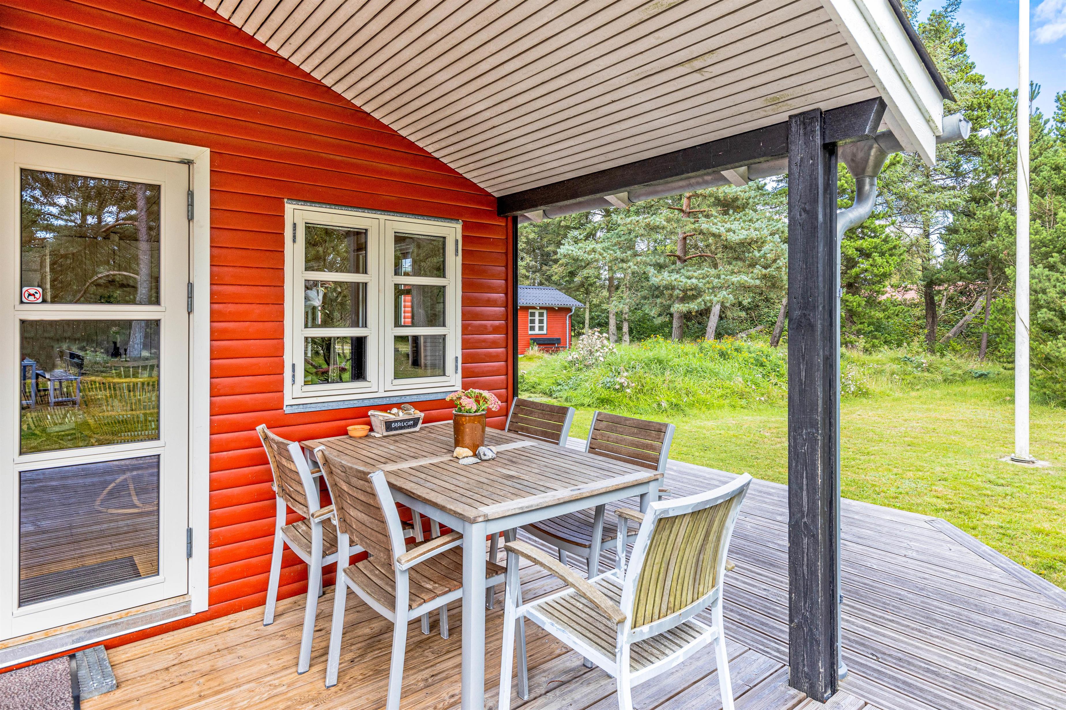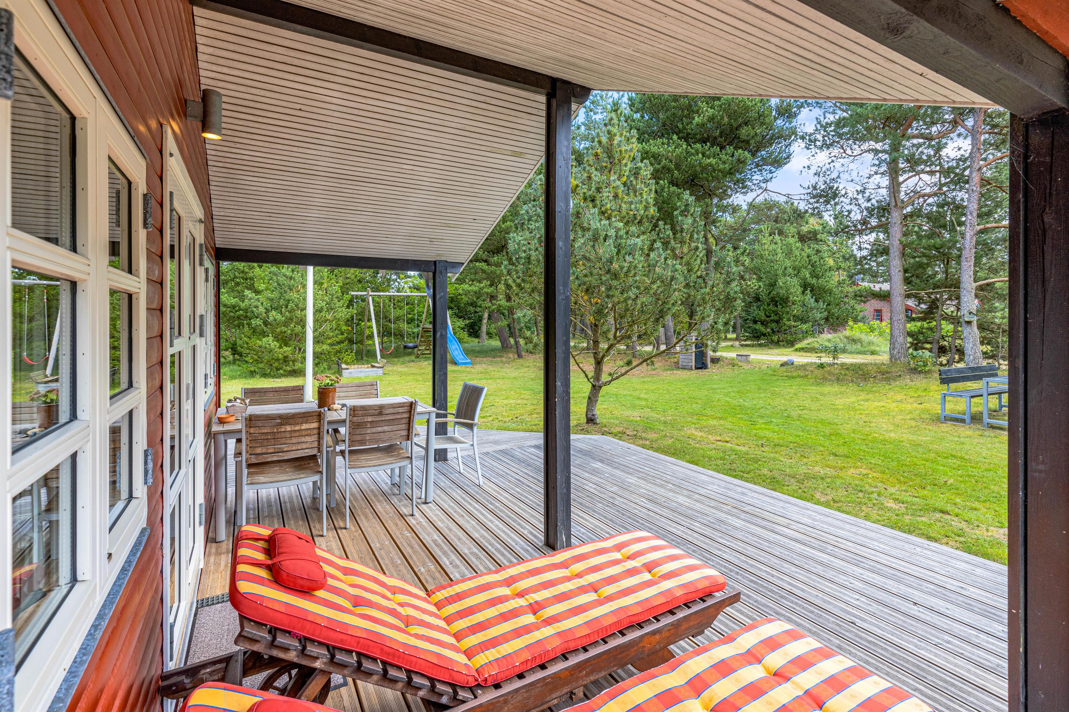 Overalt vælter lyset ind af de hvidsprossede vinduer og giver godt udsyn til den 2796 m2 store grund, som er omkranset af træer, der giver læ og privatliv. Rundt om huset er der bygget en lækker træterrasse, så I altid har mulighed for at sidde ude, hvis vejret tillader det. Der er dog også en overdækket terrasse, så en lille regnbyge skal ikke holde jer indendørs.
