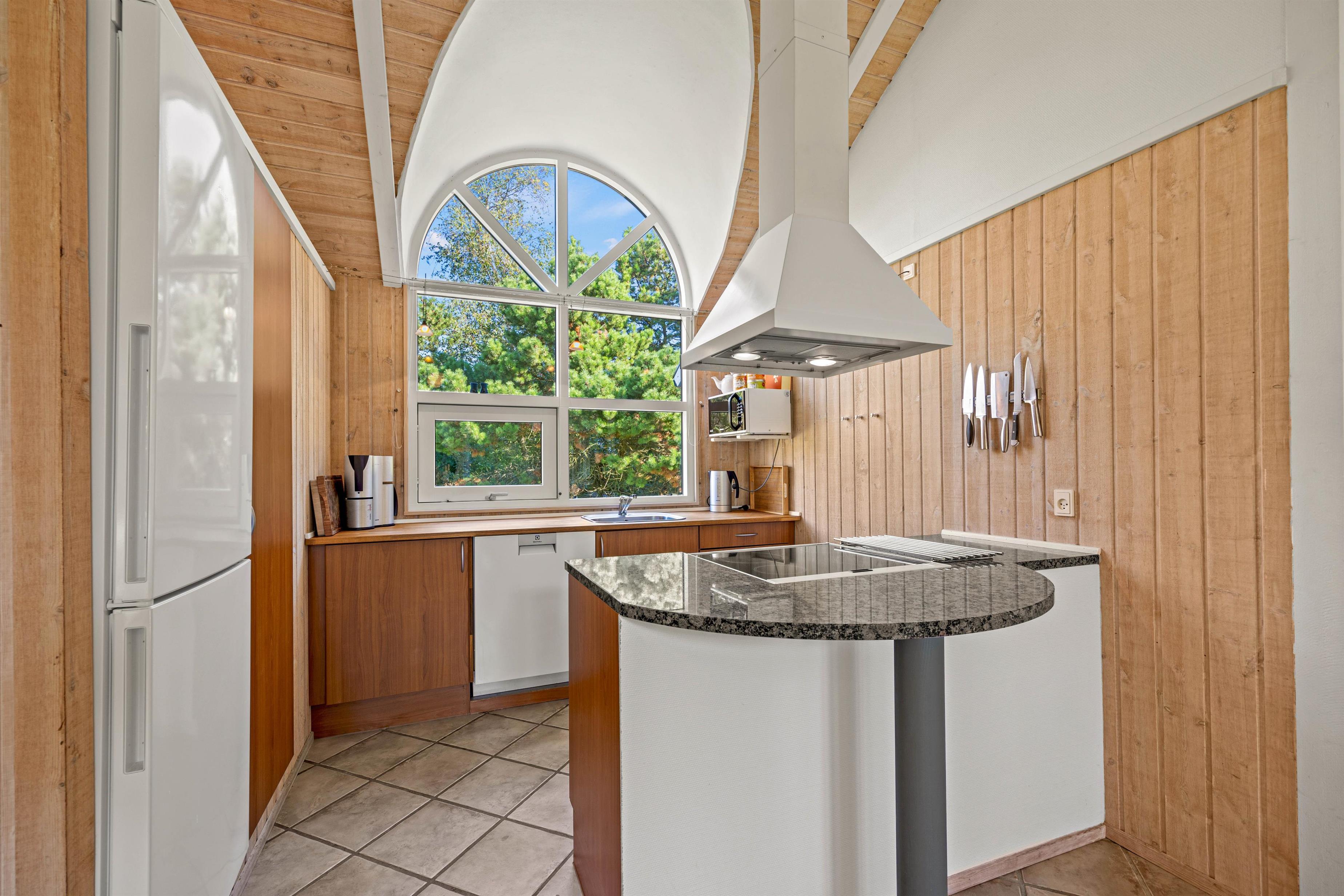 Sommerhusets hjerterum er uden tvivl det store lyse køkken/alrum med det store lysindfald, der giver mulighed for at nyde den dejlige natur udenfor. Køkkenet er udstyret med en opvaskemaskine og induktionskogeplade og har en lille køkken-ø, hvor man kan følge med i madlavningen. Det ligger i øvrigt i åben forbindelse med både spiseplads og stue. I de komfortable sofaer kan I samles til en filmaften foran brændeovnen eller nyde en god kop kaffe med en god bog i stolene ved de store vinduer.