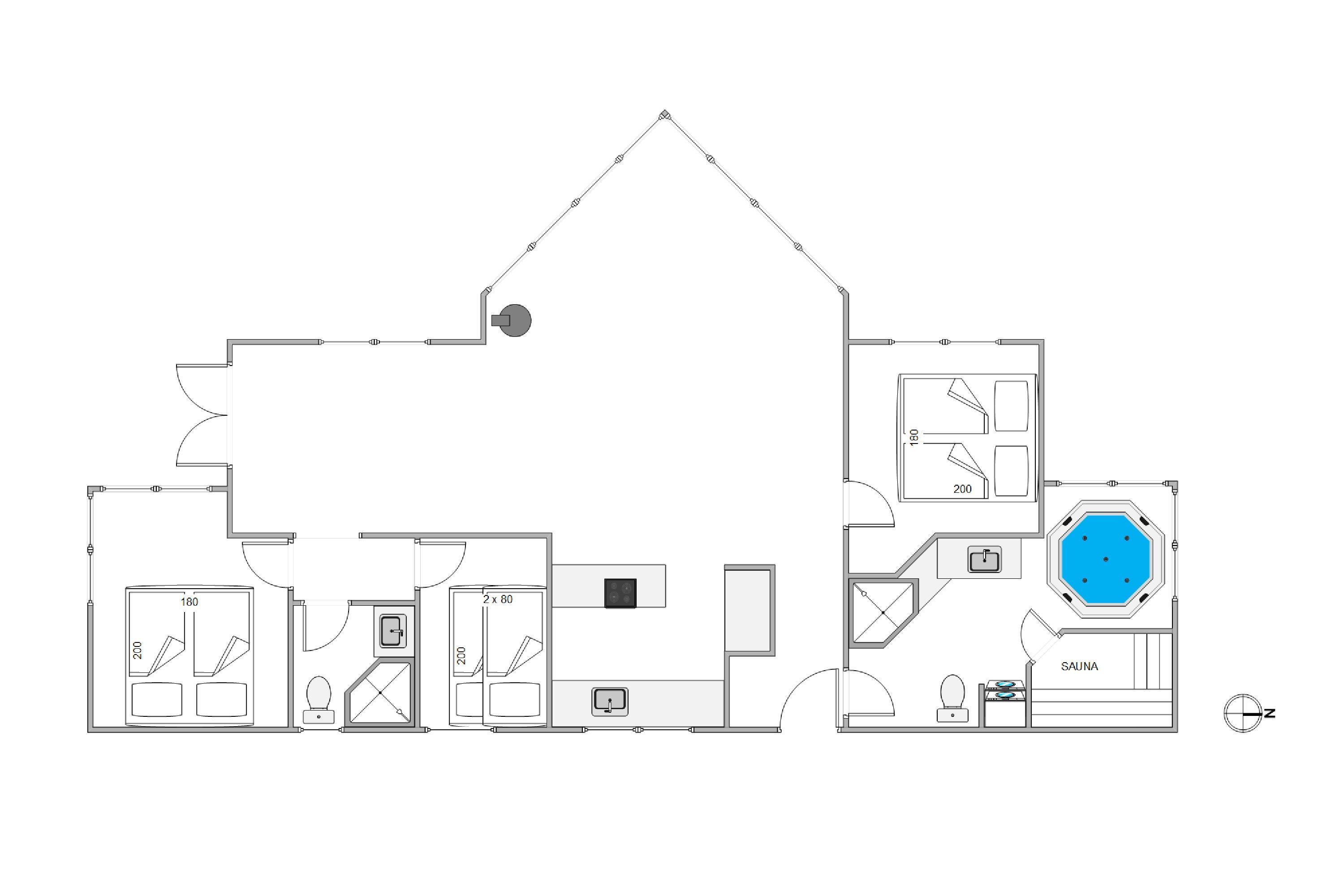 Sommerhuset har i alt 3 soveværelser – 2 af soveværelserne med dobbeltseng og det sidste med en køjeseng, som især børnene vil elske. Der er desuden en hems med yderligere 2 madrasser. De 2 badeværelser mindsker køen om morgenen, ligesom der er rig mulighed for en wellness-tur i den 5 personer-spa med efterfølgende saunasessioner. Der er i øvrigt installeret både vaskemaskine og tørretumbler og en energibesparende varmepumpe, der automatisk sørger for en behagelig temperatur i hele huset.