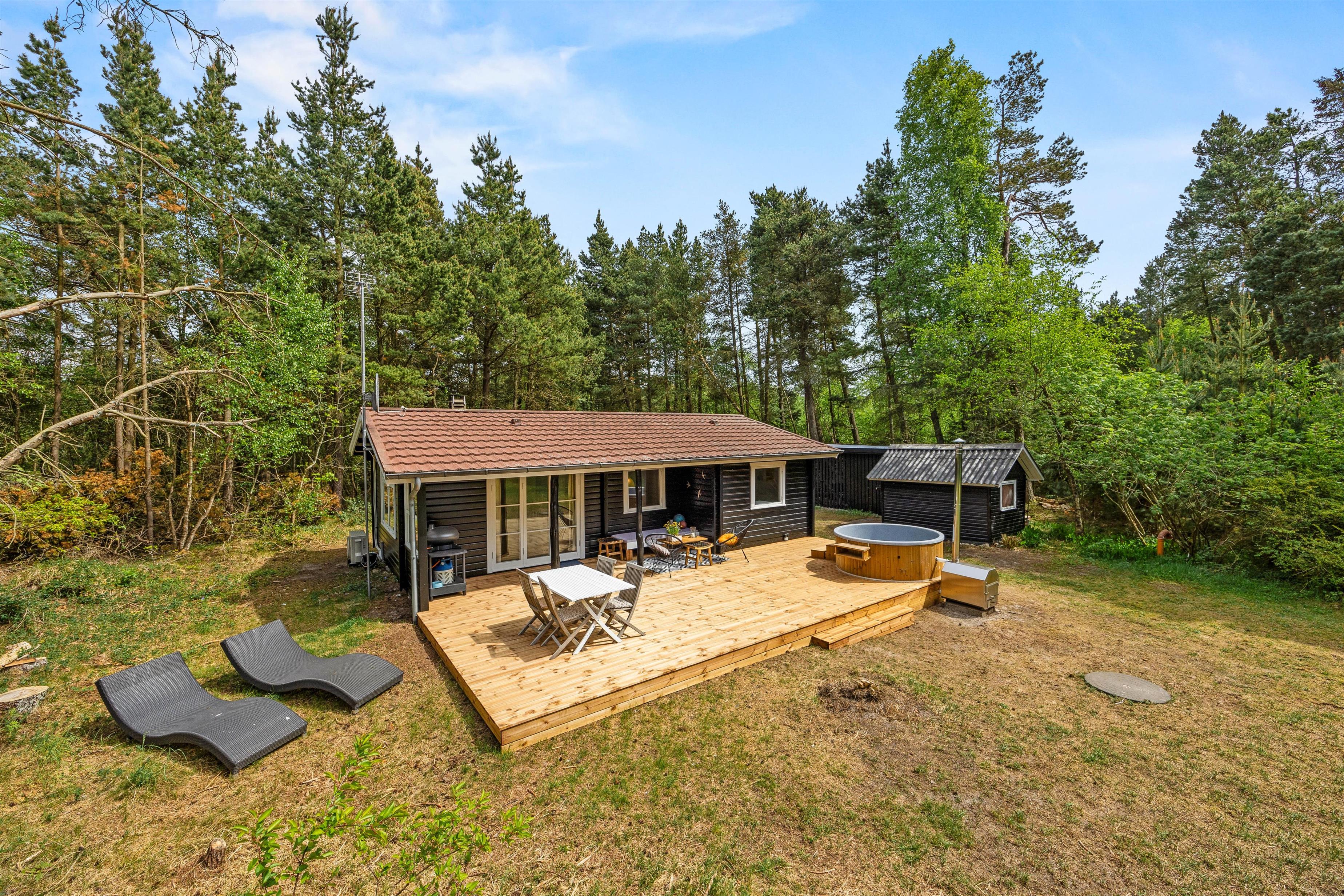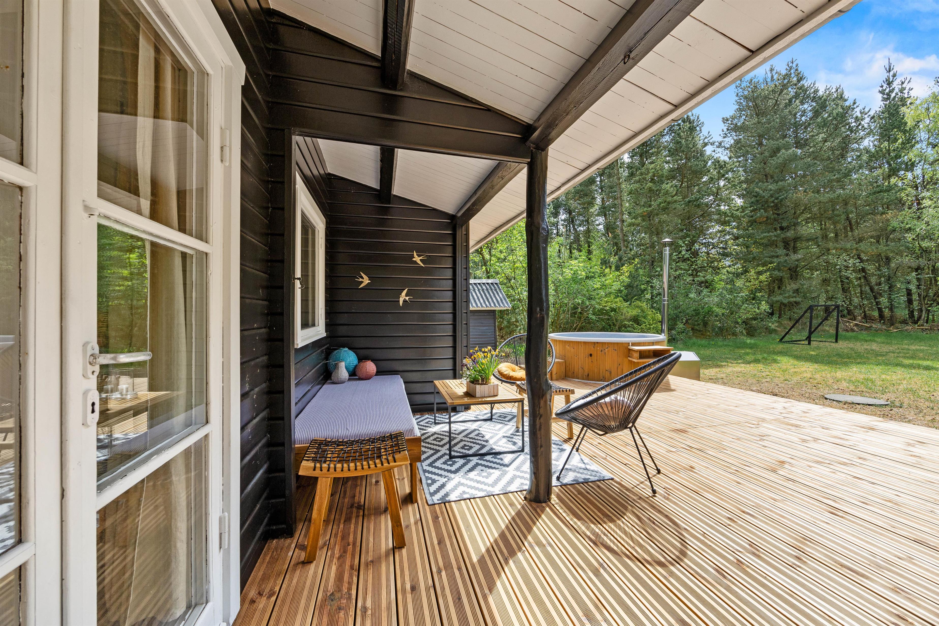 På den store grund på hele 2907 m2 og på den store, flotte terrasse med vildmarksbadet har I masser af plads til at nyde udendørslivet fuldt ud, og sommerhuset egner sig til 4 personer, uanset om I er par, familie eller venner.