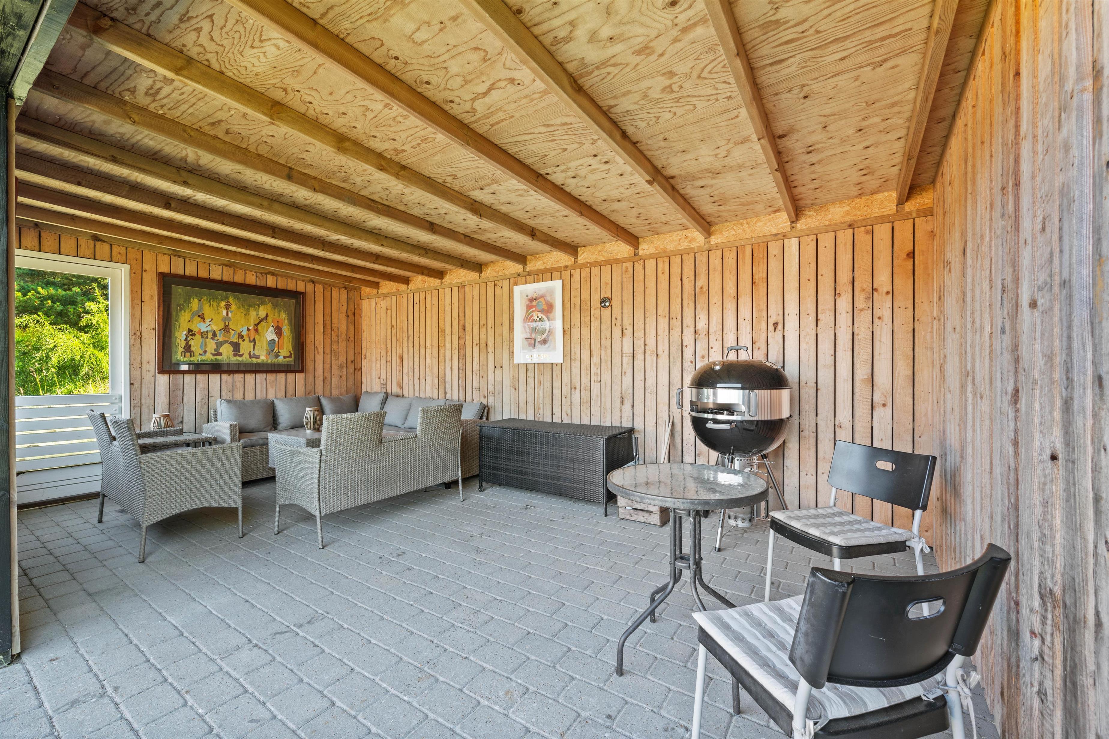 Fra feriehusets stue er der udgang til den dejlige delvist overdækkede terrasse med de lyse rattanmøbler, hvor I kan nyde dagens solskinstimer og måske et lækkert måltid fra grillen. Rundt om hjørnet står et par behagelige lænestole, som indbyder til at smække fødderne op og tage en middagslur. Hele grunden er desuden indhegnet, så I kan roligt lade hunden snuse rundt i haven.