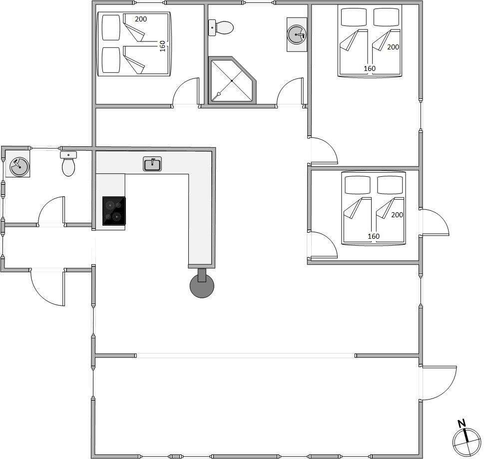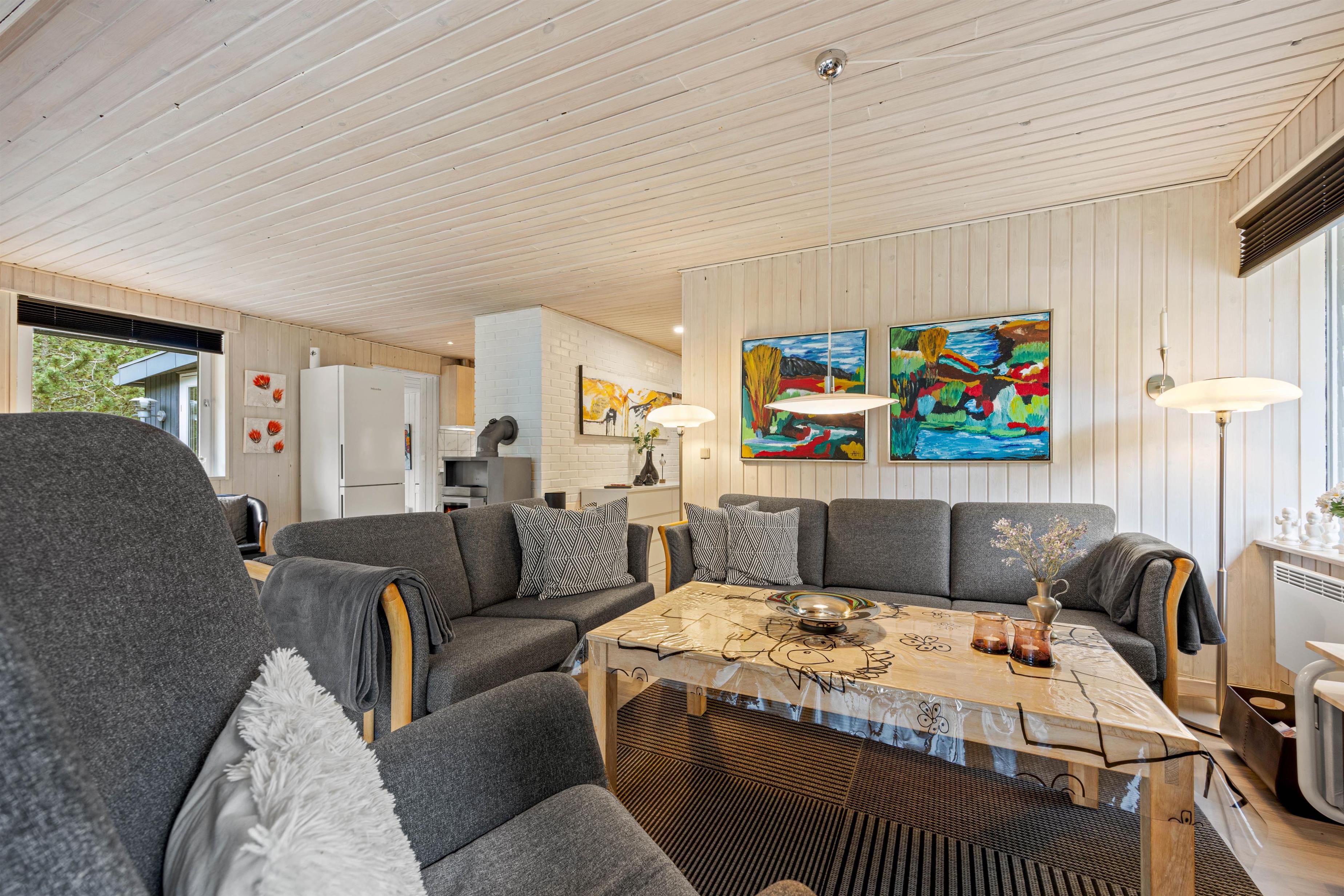 På Brdr. Lauridsensvej 3 i Ho er der god plads til 6 personer, fordelt på 3 soverum med gode dobbeltsenge. Her har man ikke kun et stort pænt badeværelse med gulvvarme, men også et gæste-wc, så der ikke opstår kø om morgenen. I det store køkken finder I alt til tilberedelsen af lækre måltider, og imens opvaskemaskinen klarer resten, kan I hygge omkring det store spisebord med familiespil eller sætte jer til rette med en god bog eller film i lædersofaen. For den optimale stemning sørger den store, centralt placerede brændeovn.