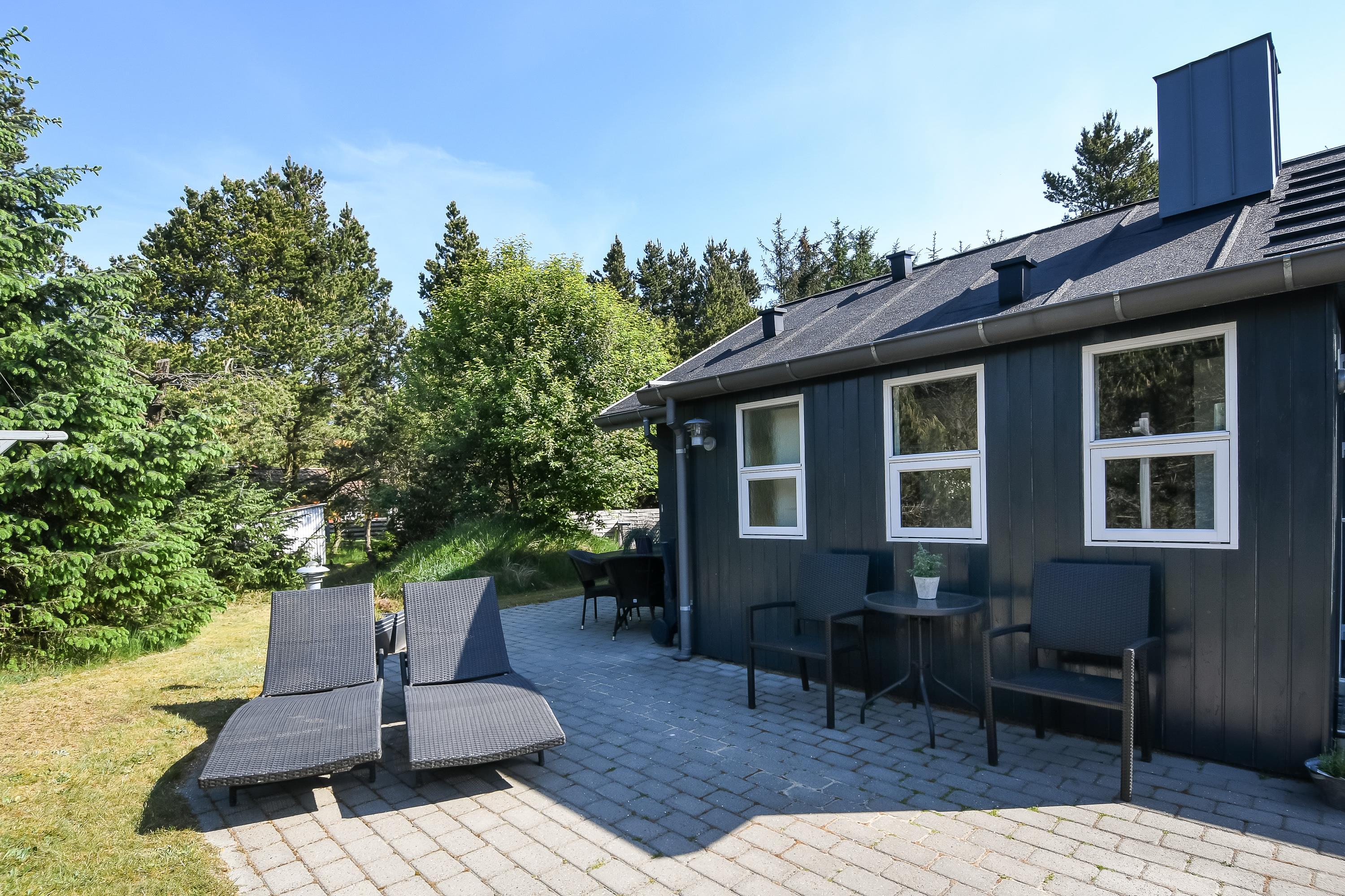 Gennem stuen eller soveværelset kommer man ud på en dejlig stor terrasse med gode havemøbler med solvogne, et fint bålsted og grill, - et skønt sted at tilbringe dagen eller aftenen med grillmad.