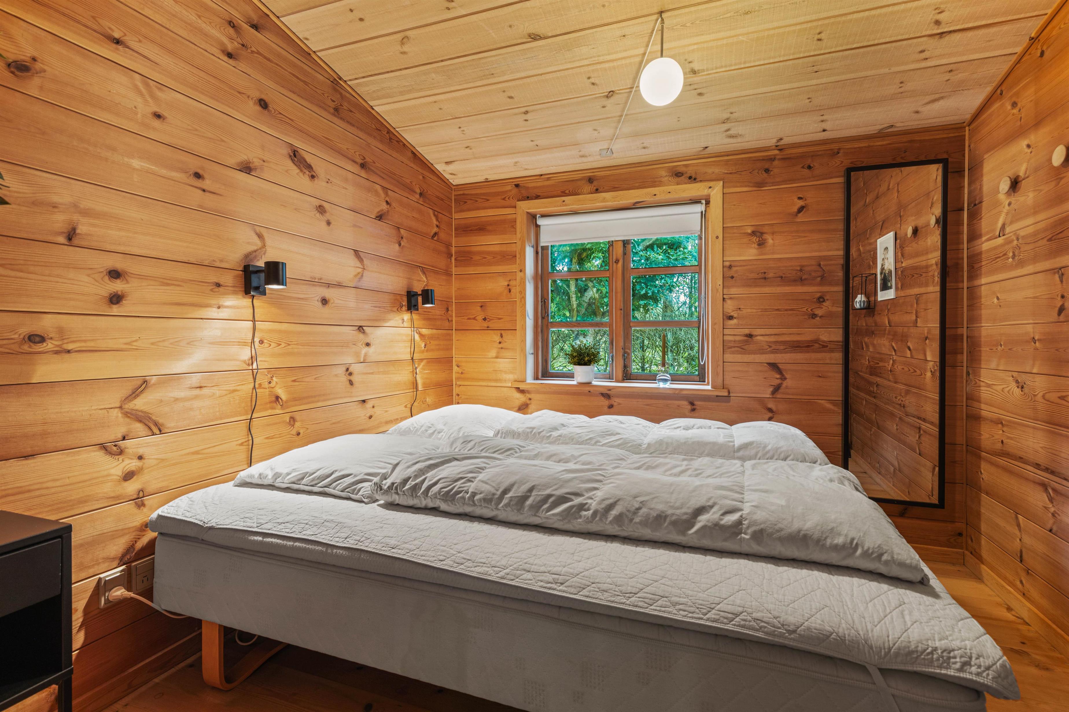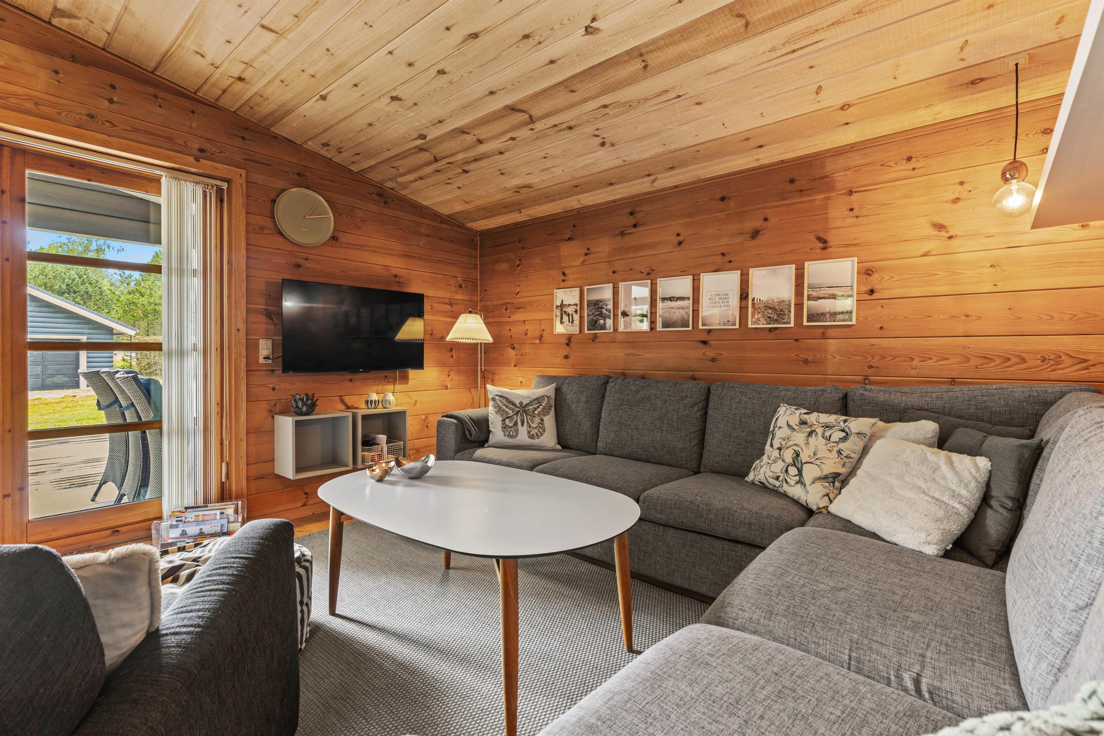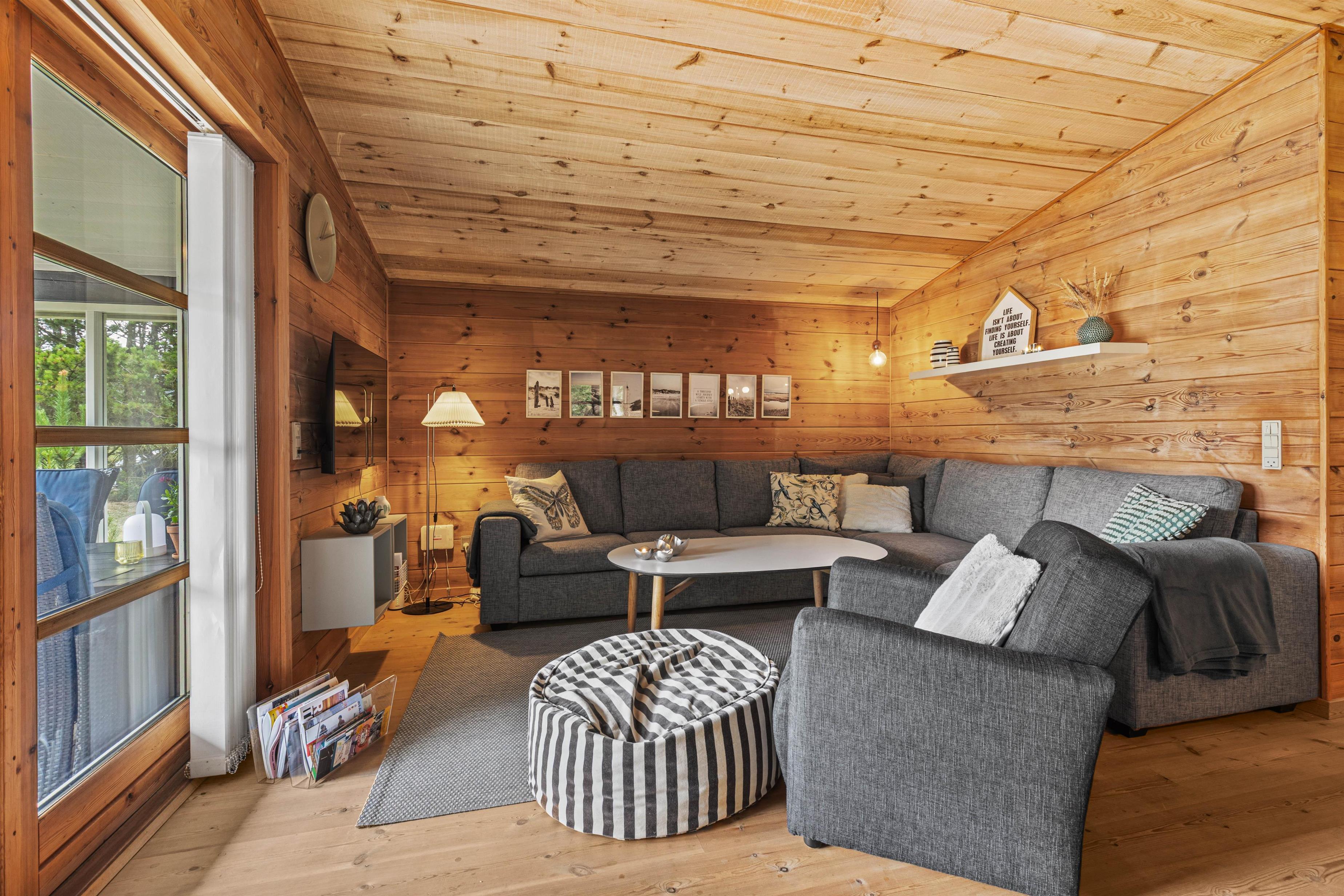 Det klassisk indrettede sommerhus har varme trævægge og en afslappet atmosfære. I stuen kan I tænde op i brændeovnen og nyde en god bog, film i fjernsynet eller en brætspilsaften, mens varmepumpen sørger for behagelig temperatur året rundt. I køkkenet finder I de nødvendige redskaber til madlavningen – dog uden opvaskemaskine. Til gengæld er der tid til at tage opvasken i fællesskab, mens dagens indtryk bliver vendt.