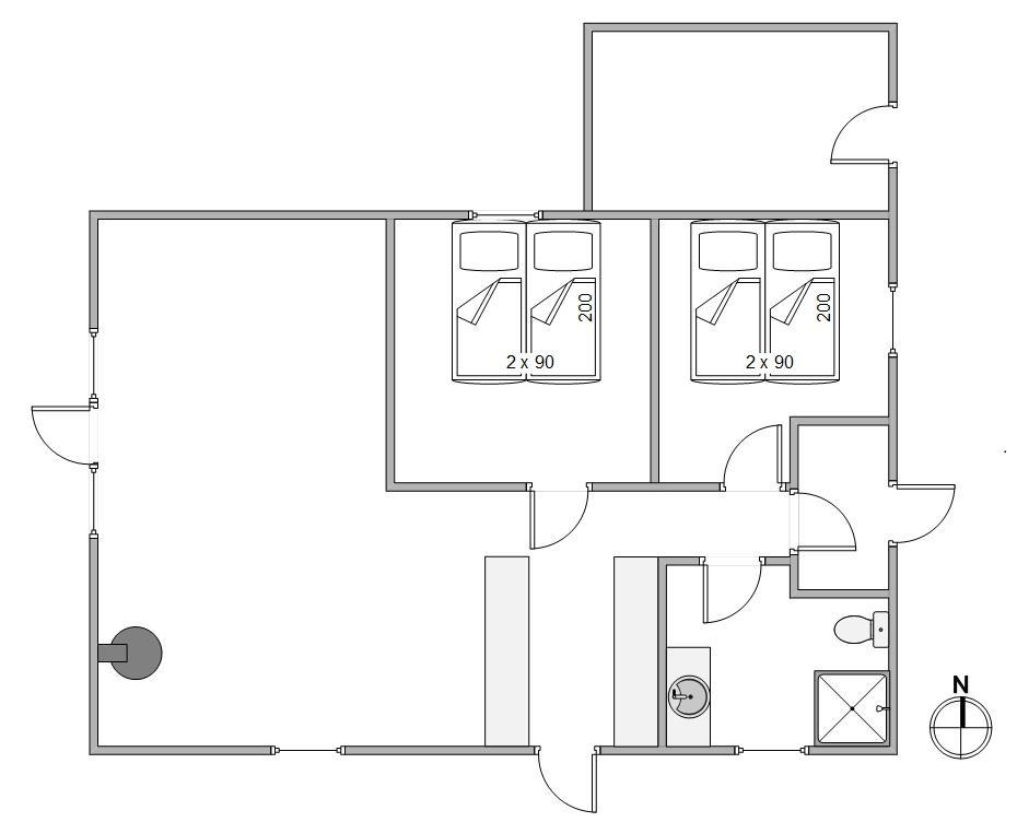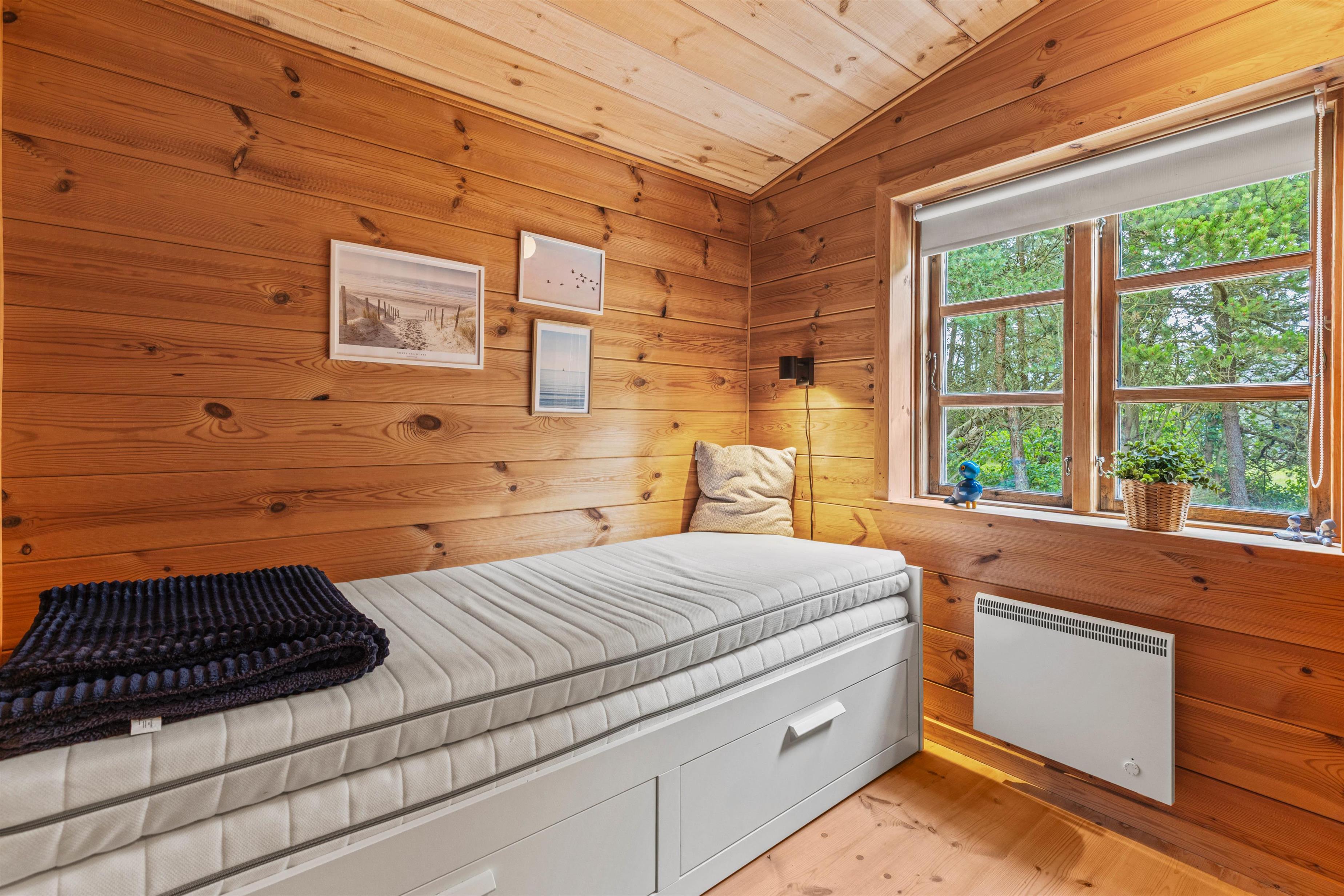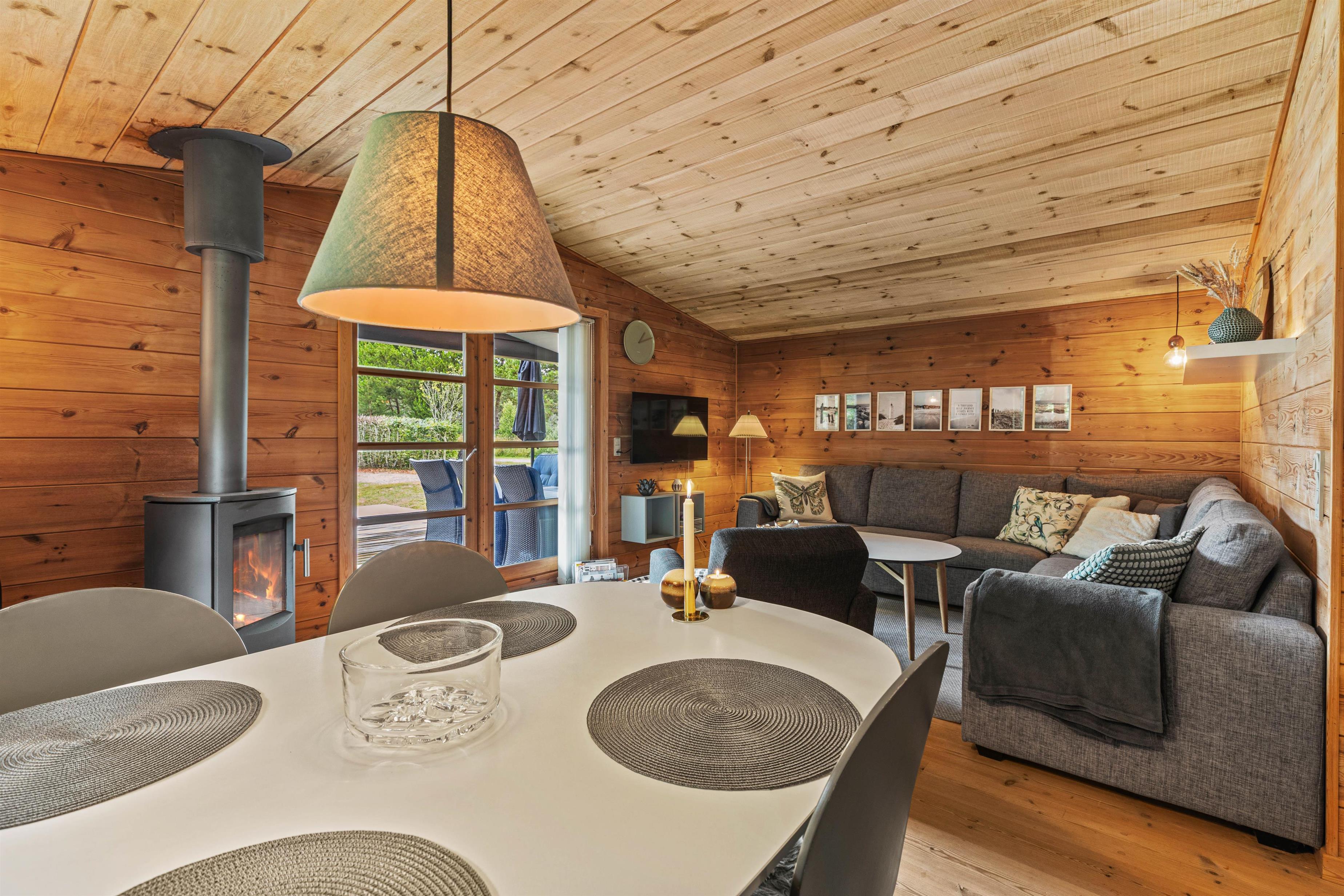 Det klassisk indrettede sommerhus har varme trævægge og en afslappet atmosfære. I stuen kan I tænde op i brændeovnen og nyde en god bog, film i fjernsynet eller en brætspilsaften, mens varmepumpen sørger for behagelig temperatur året rundt. I køkkenet finder I de nødvendige redskaber til madlavningen – dog uden opvaskemaskine. Til gengæld er der tid til at tage opvasken i fællesskab, mens dagens indtryk bliver vendt.