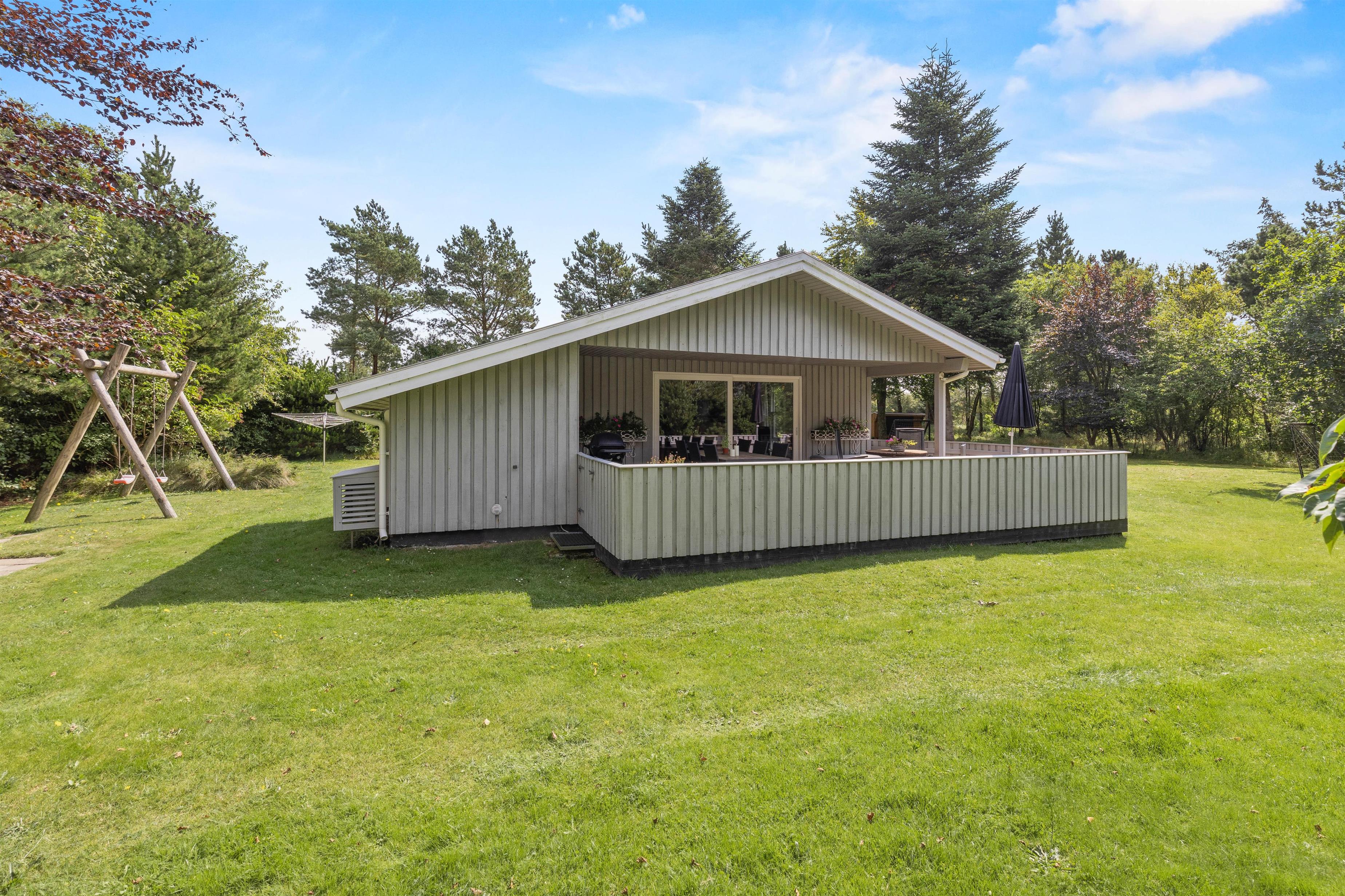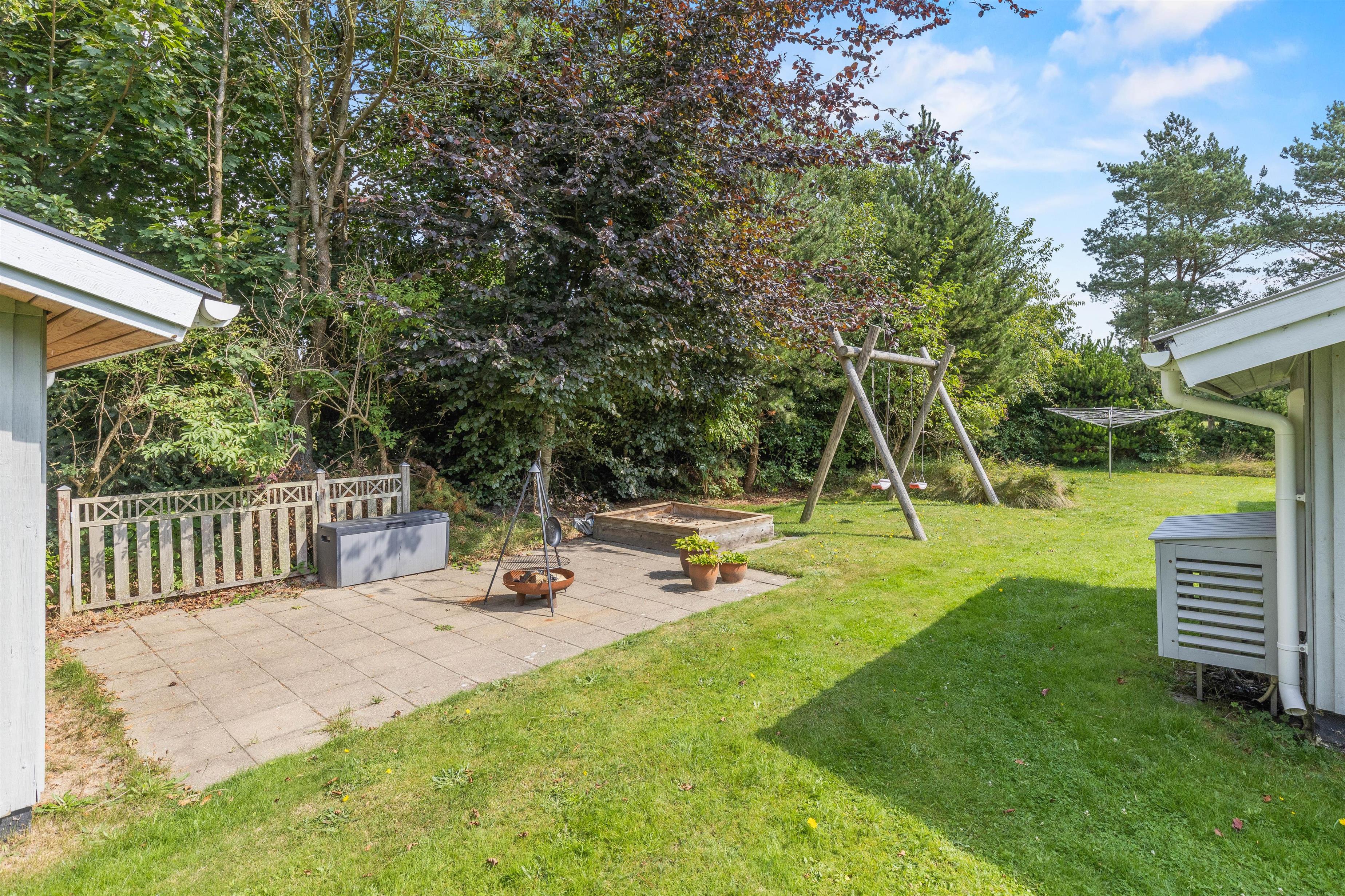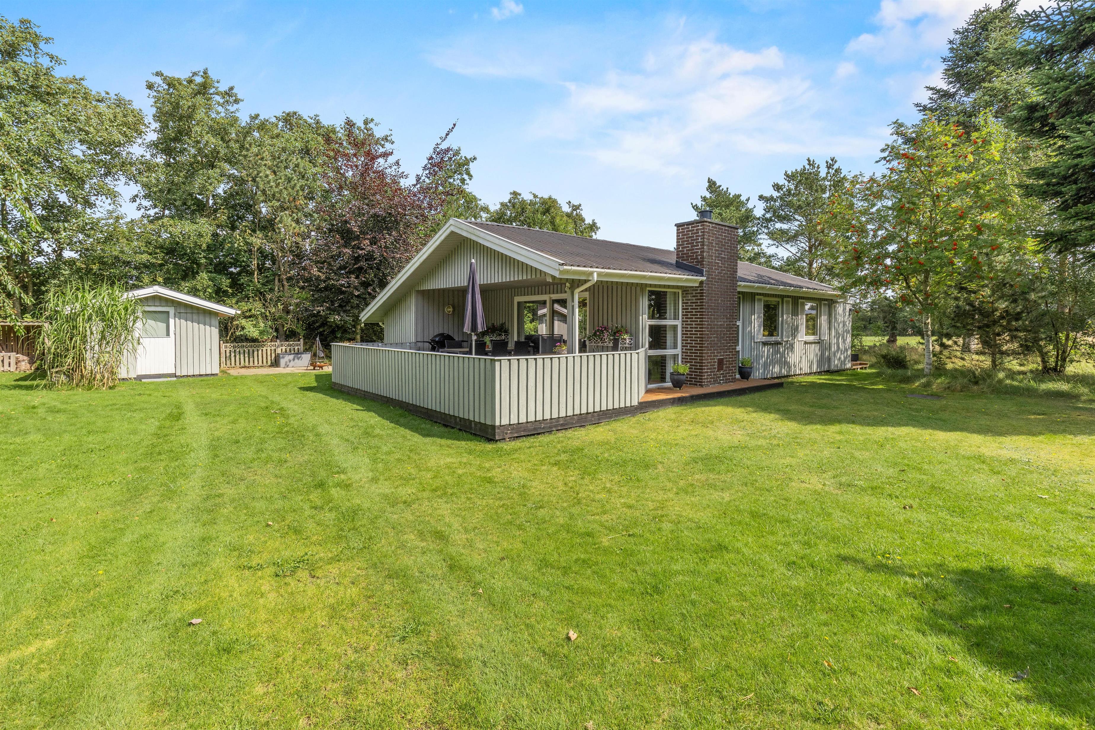 Sommerhuset er beliggende på en plænegrund på mere end 2.200 kvadratmeter, hvor I blandt andet kan slappe af i havemøbler og liggestole på den lukkede og delvist overdækkede terrasse.