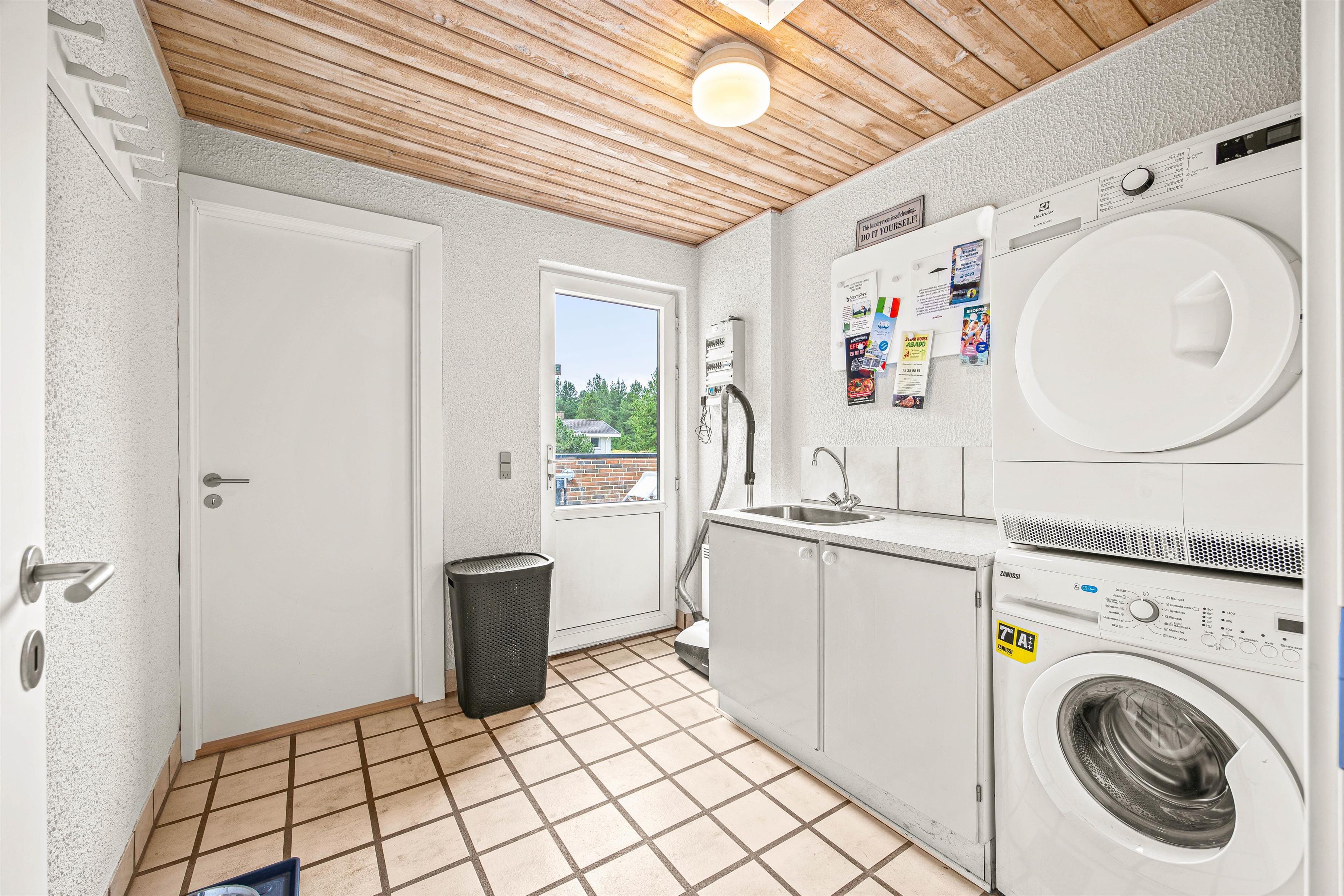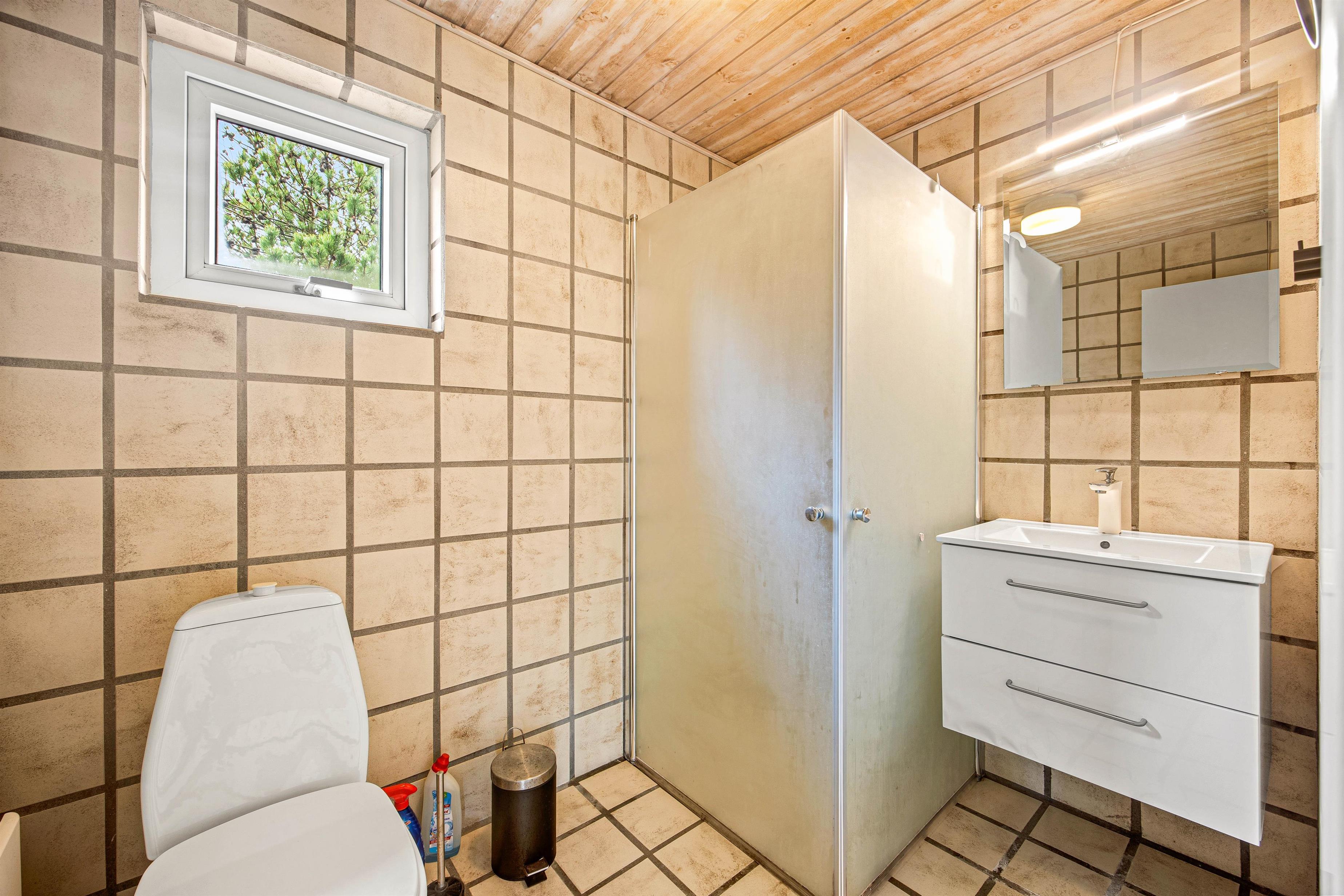 Sommerhusets absolutte highlight er poolrummet, hvor hele familien kan hygge sig i løbet af ferien. Her er der en 18 m² stor pool til sjov og leg samt et spabad og sauna til afslapning. I forlængelse heraf finder I det ene af sommerhusets i alt 2 badeværelser. Der er gulvvarme på dem begge, så I ikke kommer til at fryse om fødderne. Som et ekstra plus er der både vaskemaskine og tørretumbler i feriehuset, så I kan vaske lidt håndklæder undervejs.