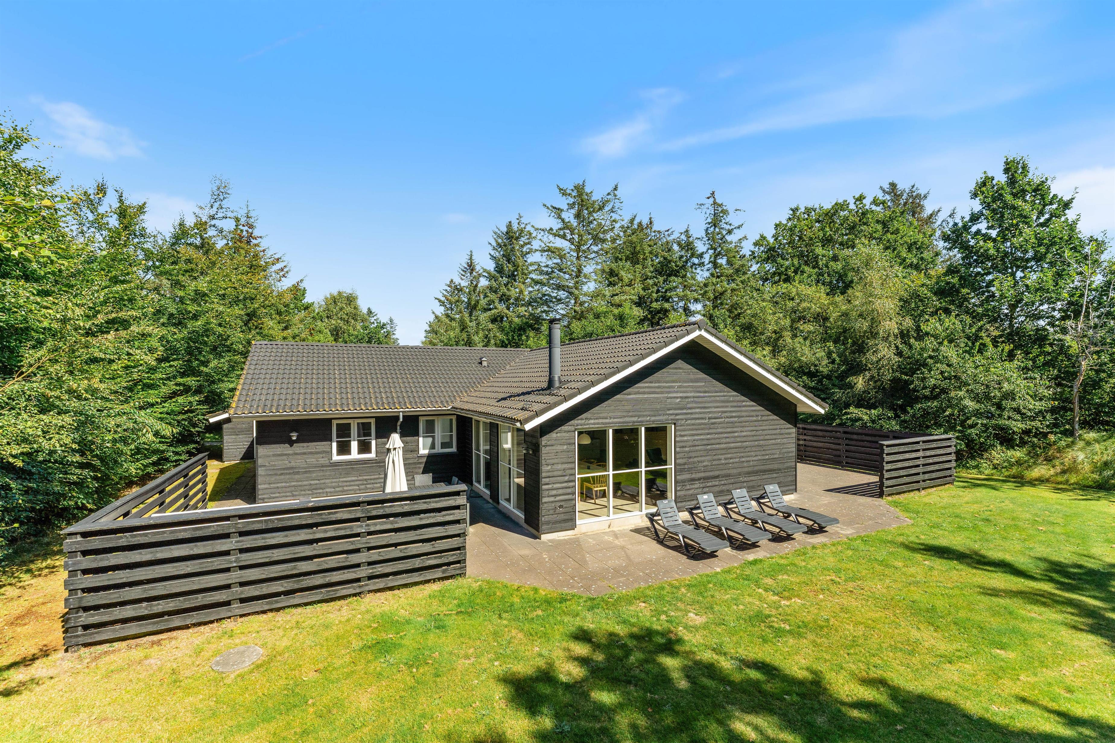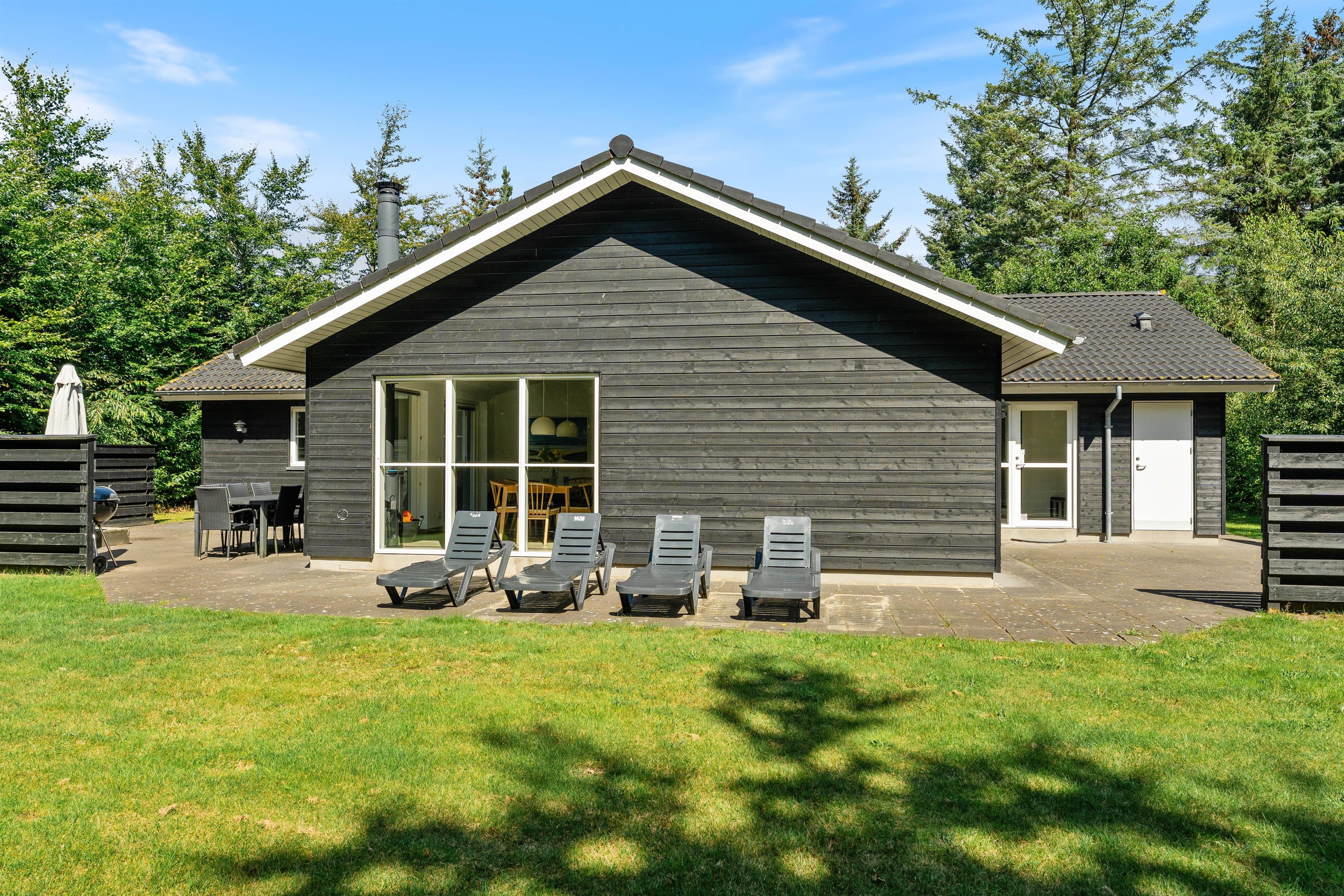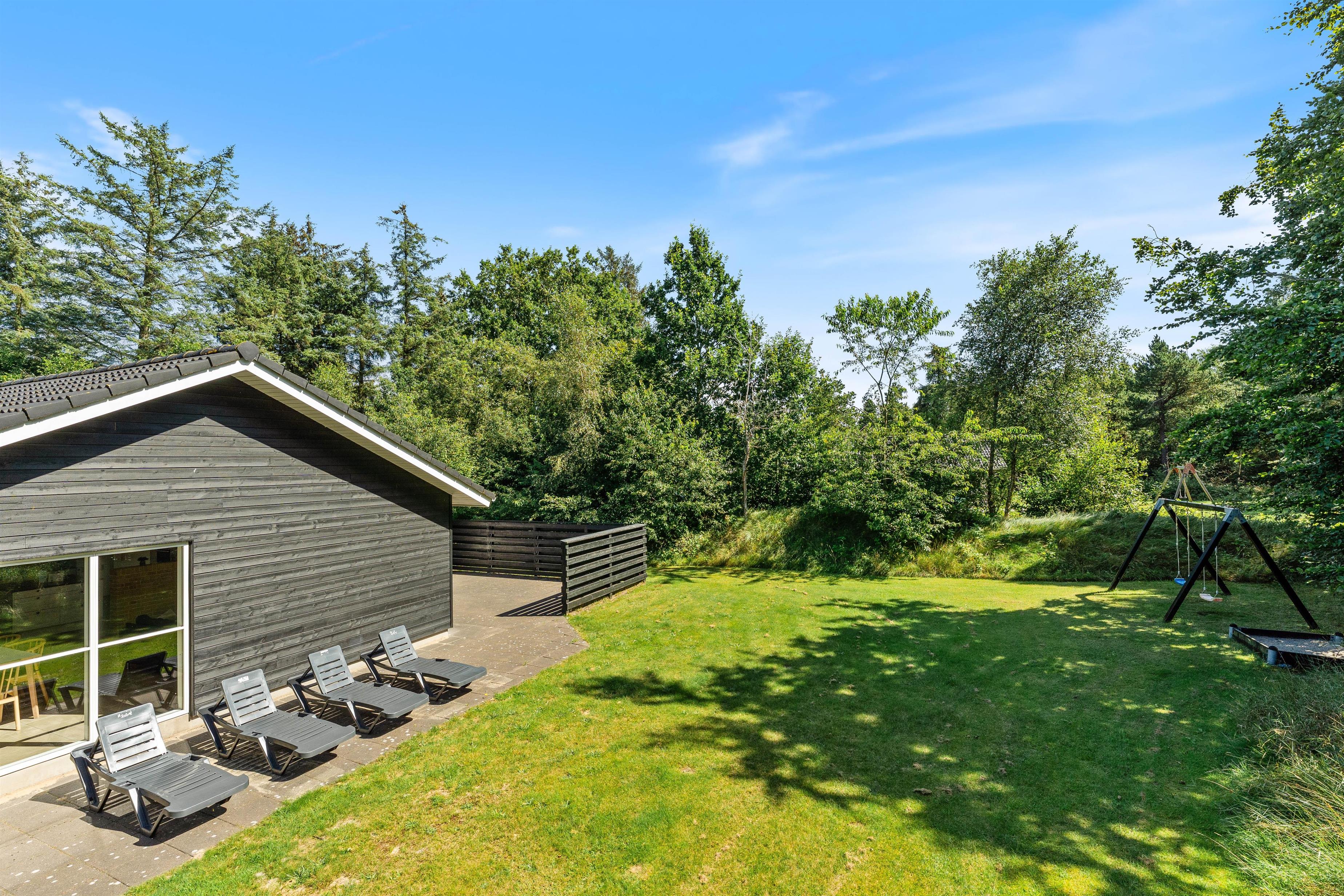 Den afskærmede terrasse lægger op til masser af dejlig afslapning, specielt på de solrige dage. Find liggestolene frem og læn jer tilbage i varmen, mens fuglene synger i trækronerne, og børnene leger på den store græsplæne med sandkasse og gyngestativ.