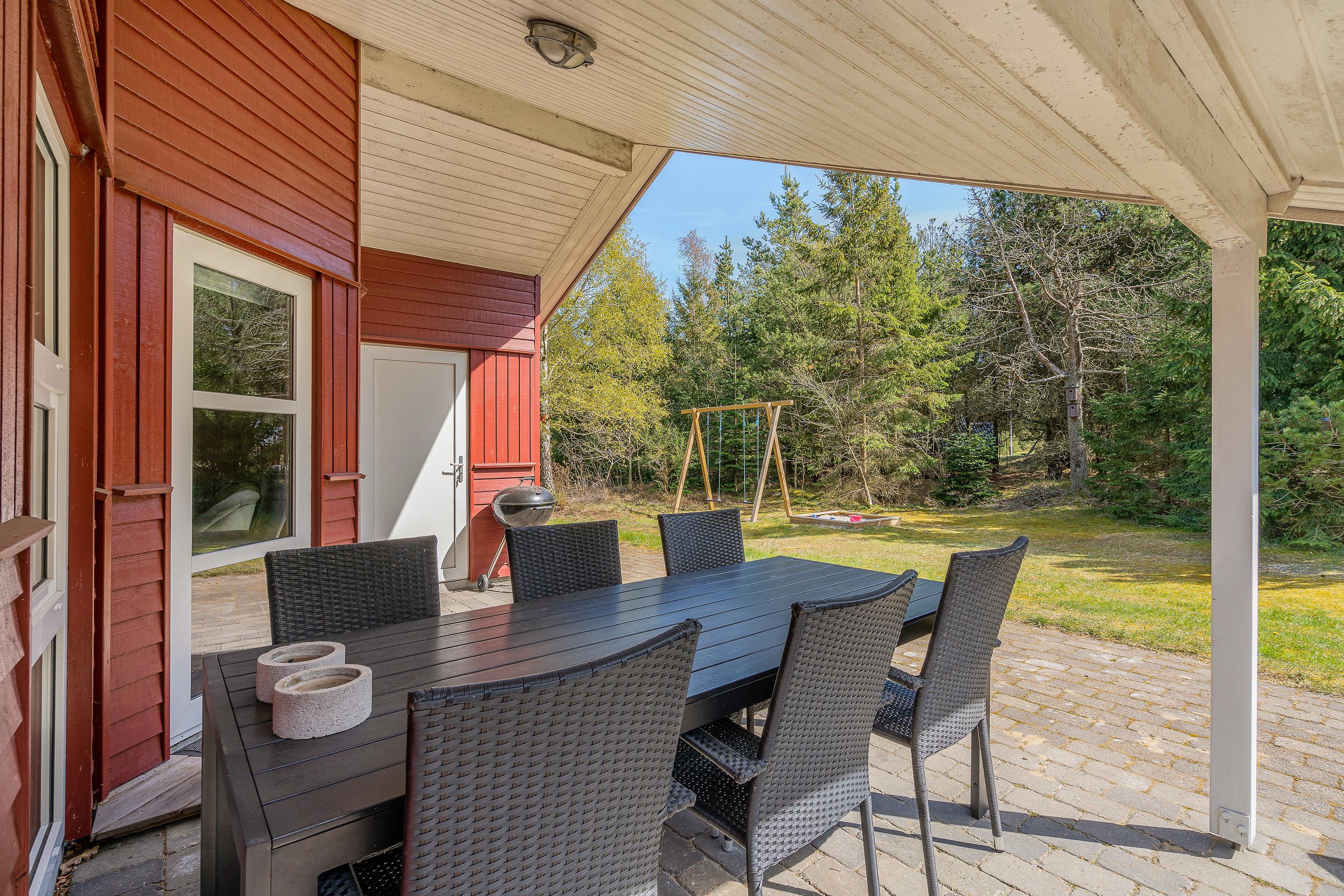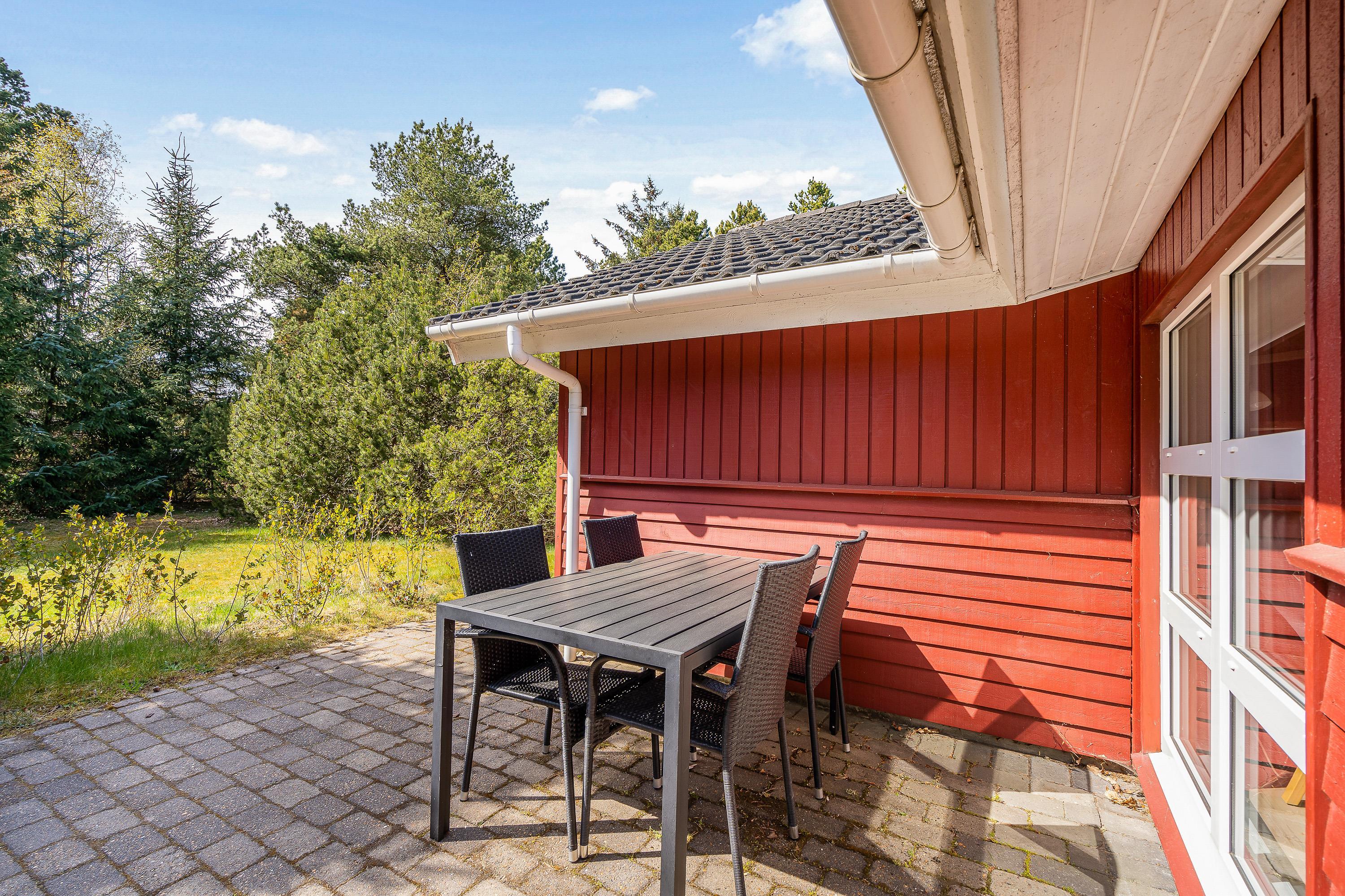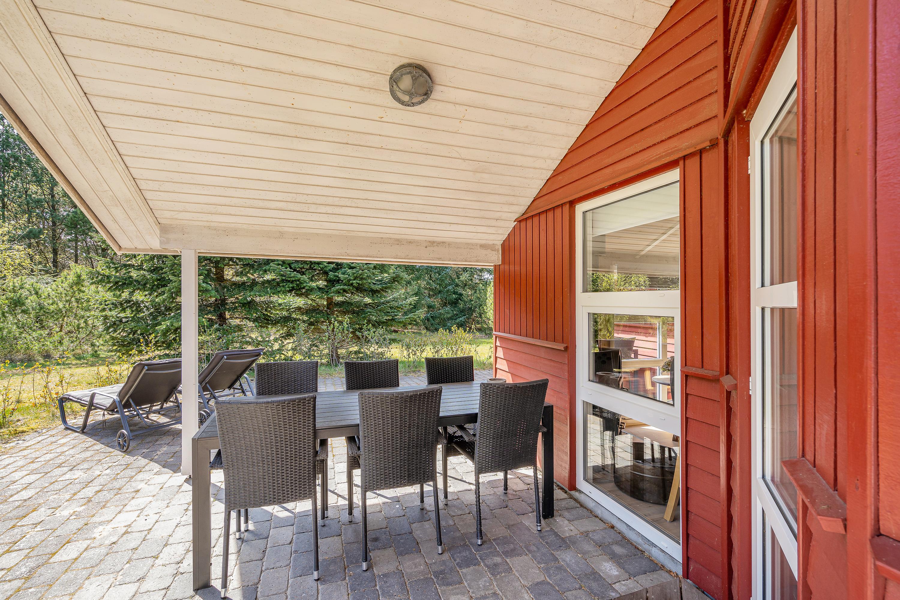 Er vejret i top, skal I da ud at nyde det. Dét kan I gøre på sommerhusets terrasse, hvor havemøbler og liggestole står klar til, at I kan finde jer godt til rette på et dejligt solspot. Terrassen er delvist overdækket, så får I brug for en pause fra solen, kan I rykke ind under den overdækkede del.