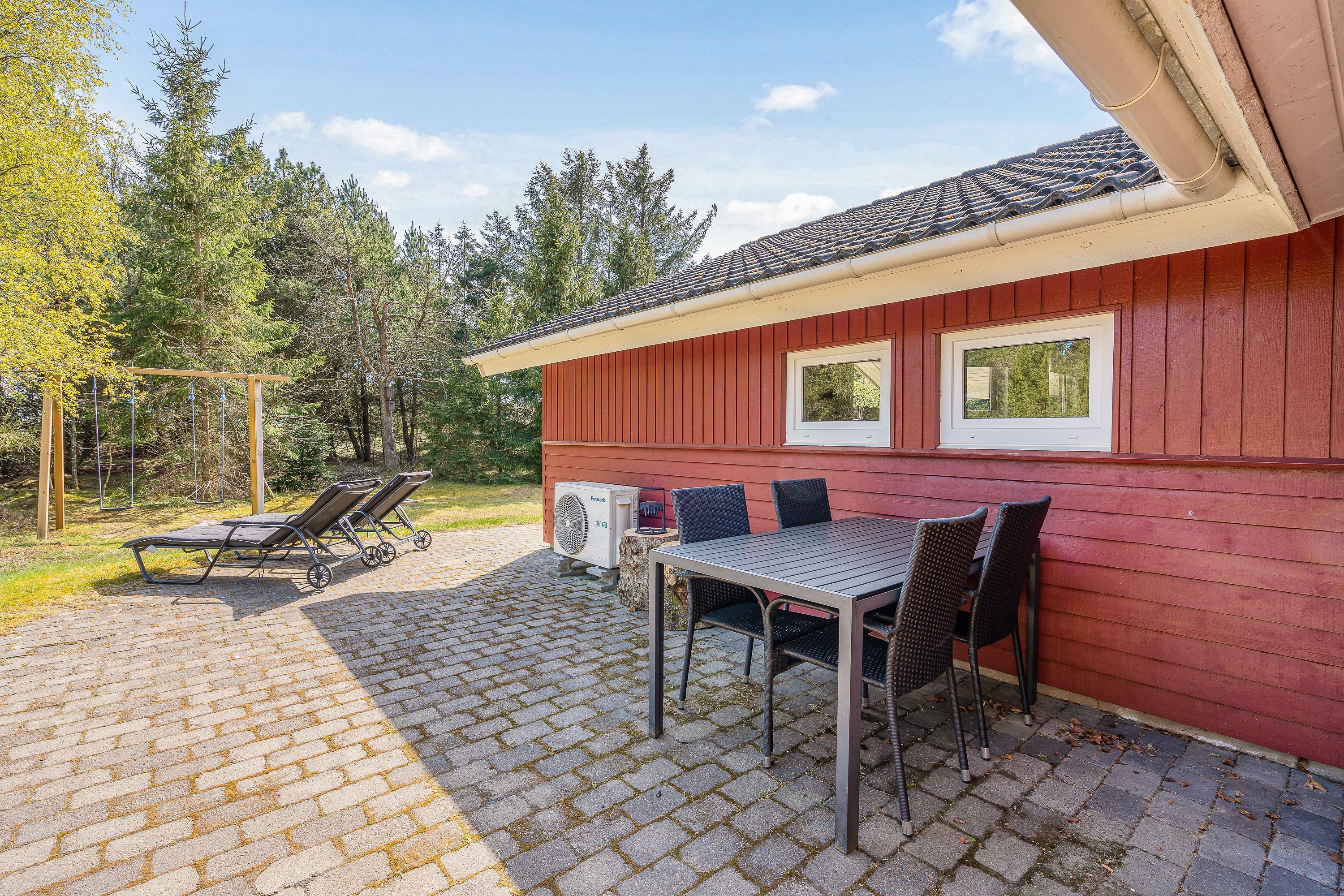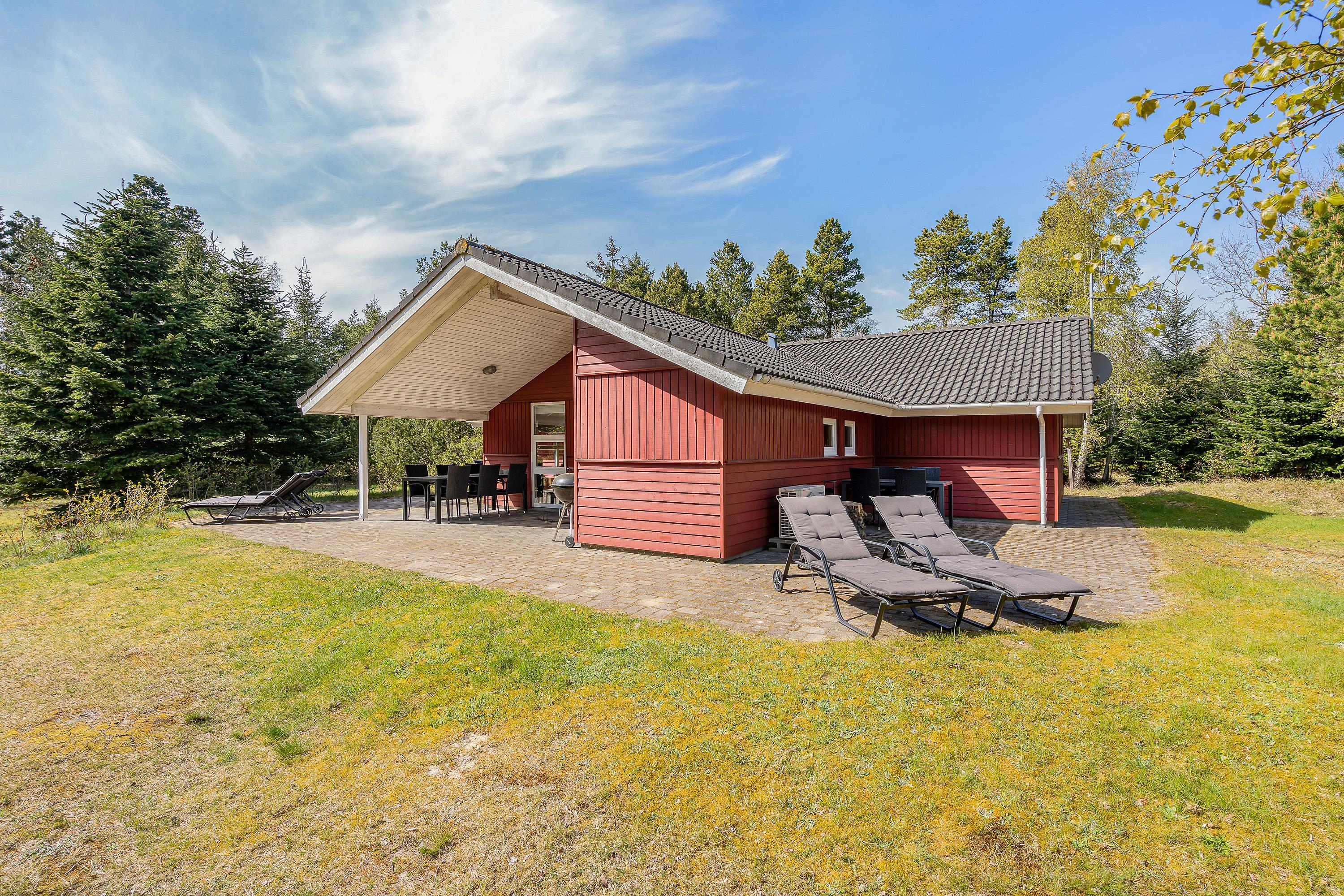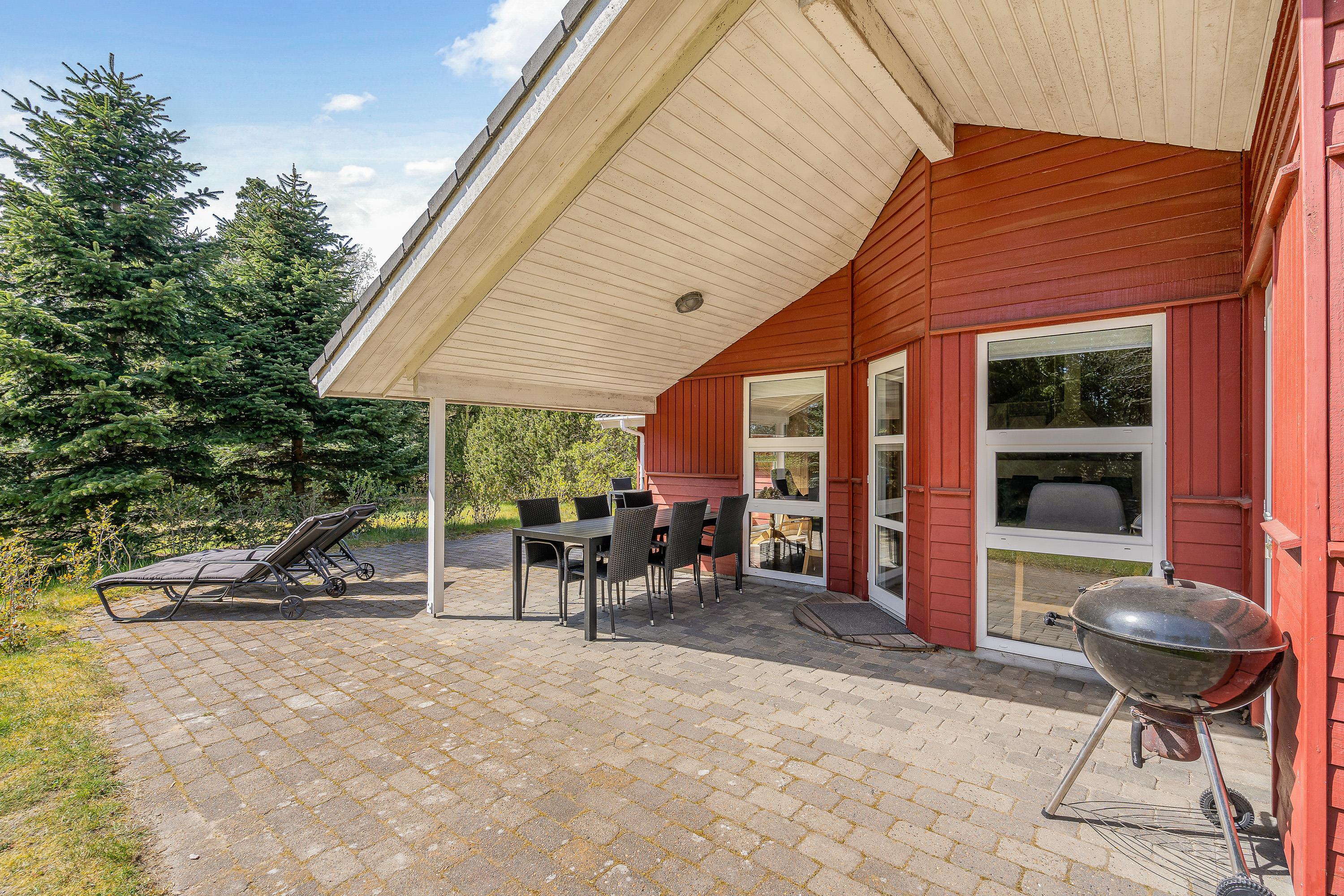Er vejret i top, skal I da ud at nyde det. Dét kan I gøre på sommerhusets terrasse, hvor havemøbler og liggestole står klar til, at I kan finde jer godt til rette på et dejligt solspot. Terrassen er delvist overdækket, så får I brug for en pause fra solen, kan I rykke ind under den overdækkede del.