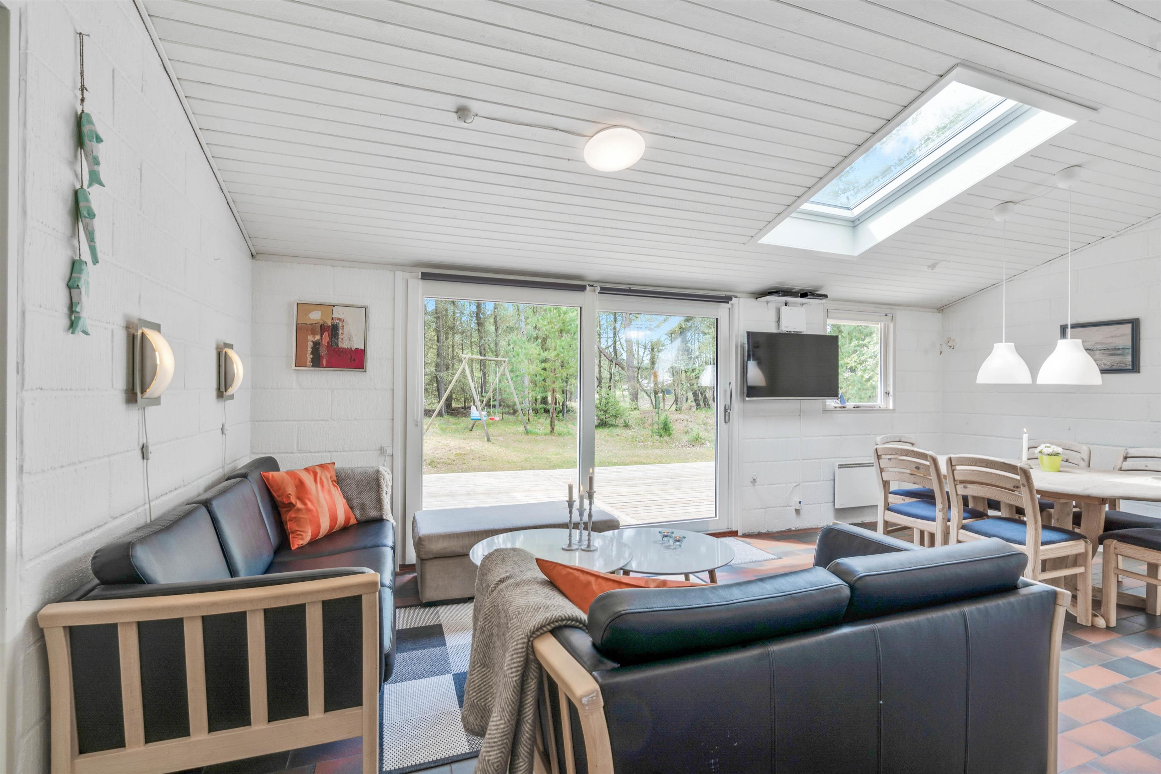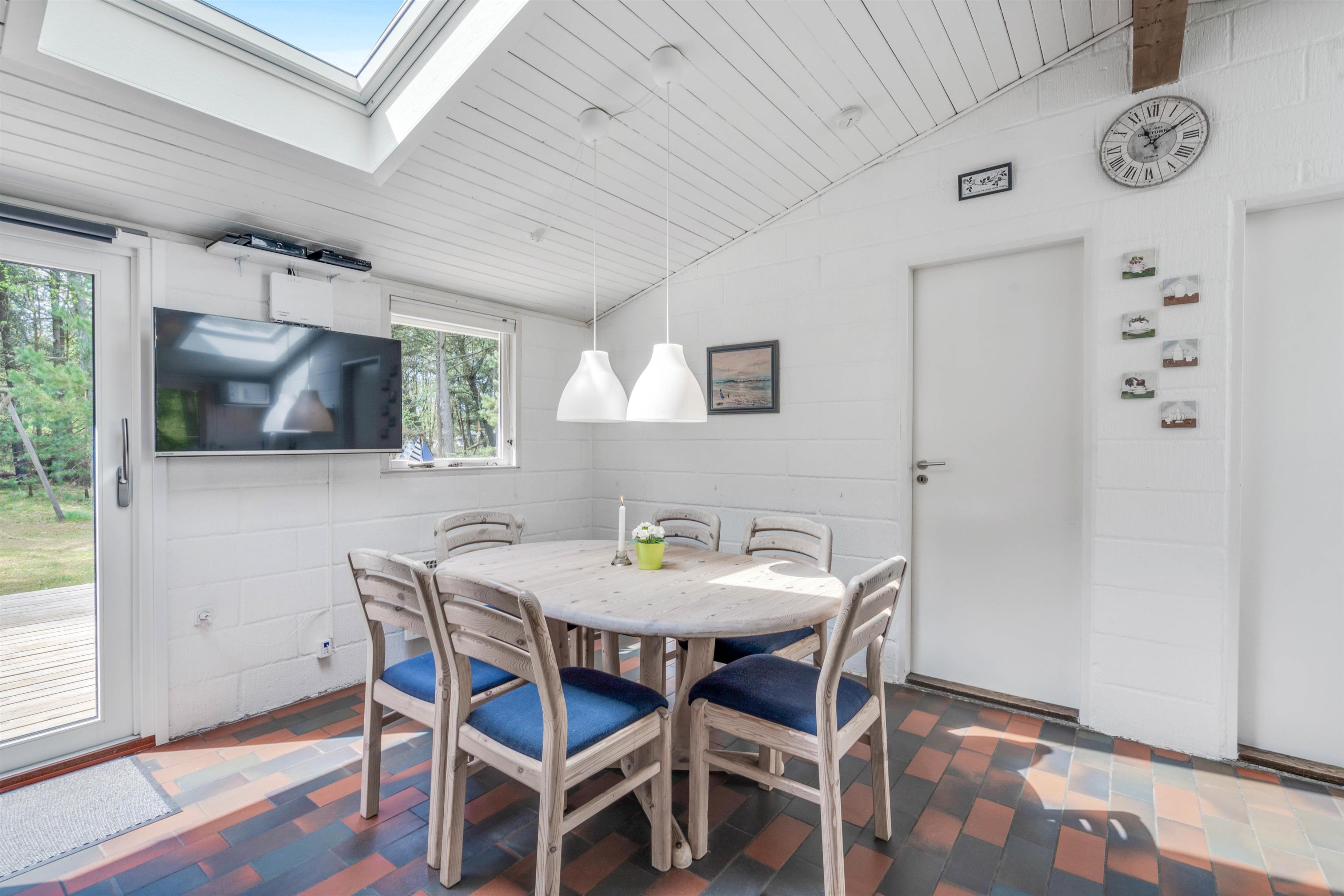 I feriehuset er der åben forbindelse mellem køkken, stue og spiseplads, som tilsammen danner alrummet, der er sommerhusets hjerte. Her vil I utvivlsomt tilbringe mange timer af jeres ferie, hvor I blandt andet kan lave mad, spille spil og se film sammen. Samtidig fuldender brændeovnen feriestemningen med sin knitren og varme.