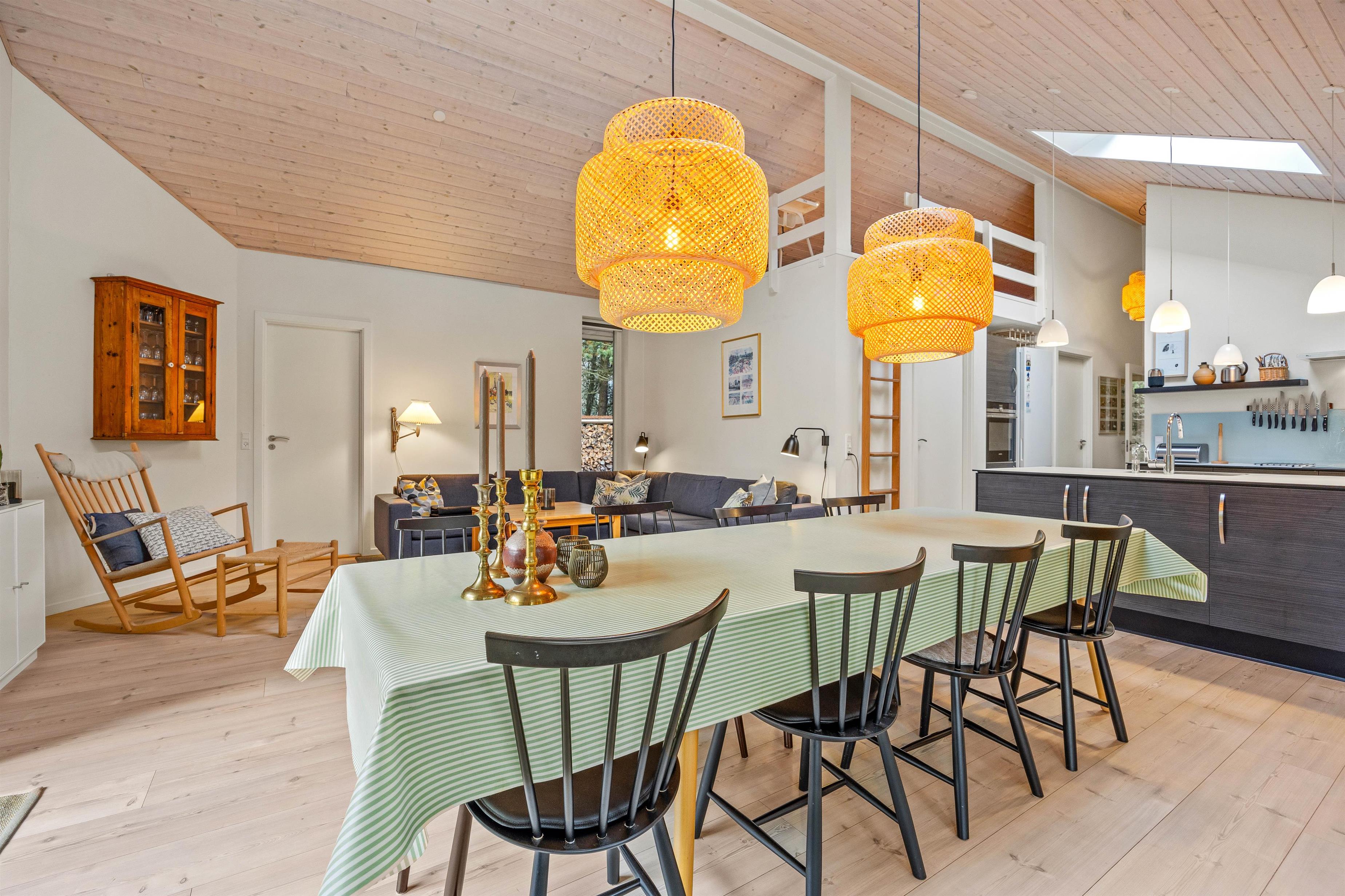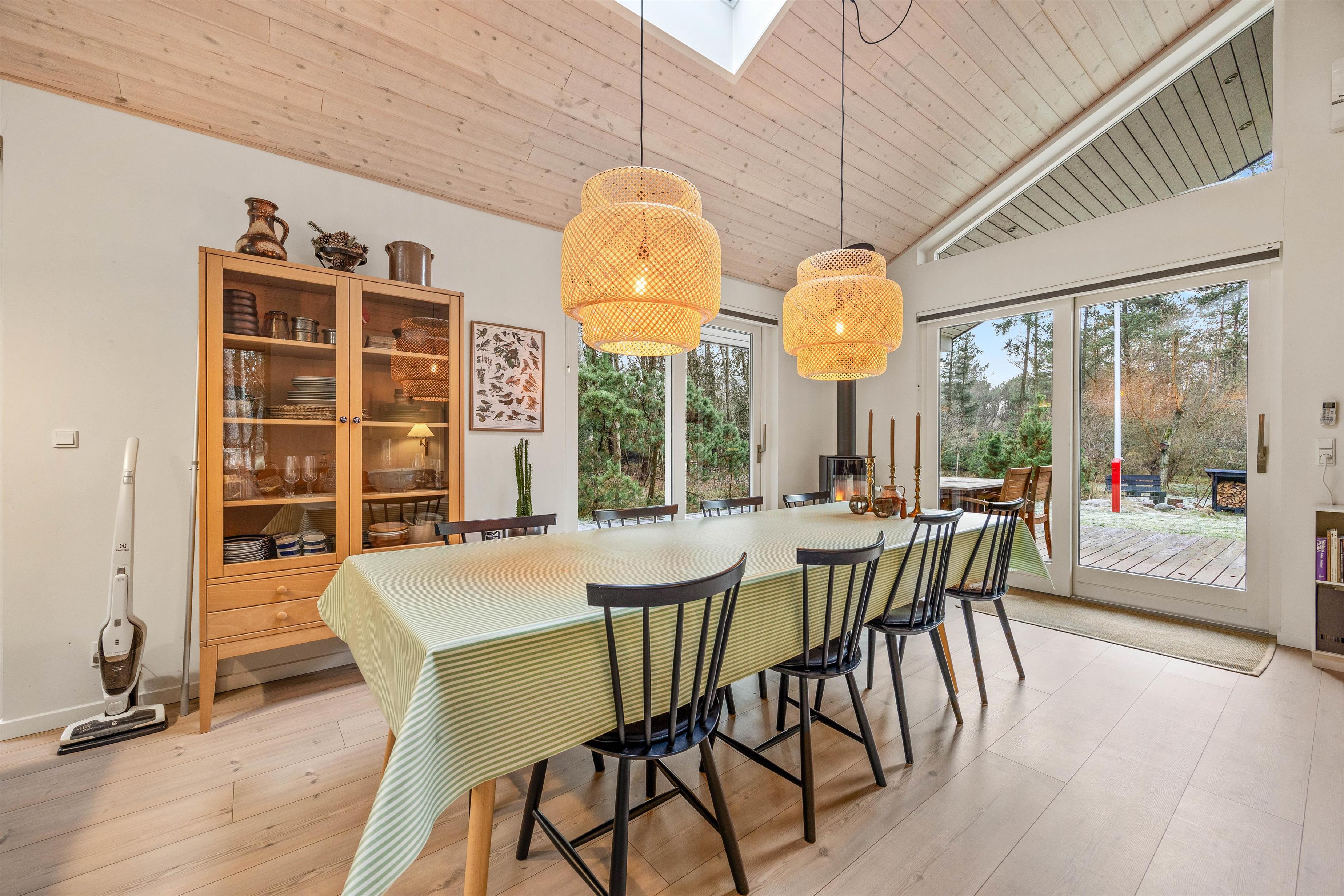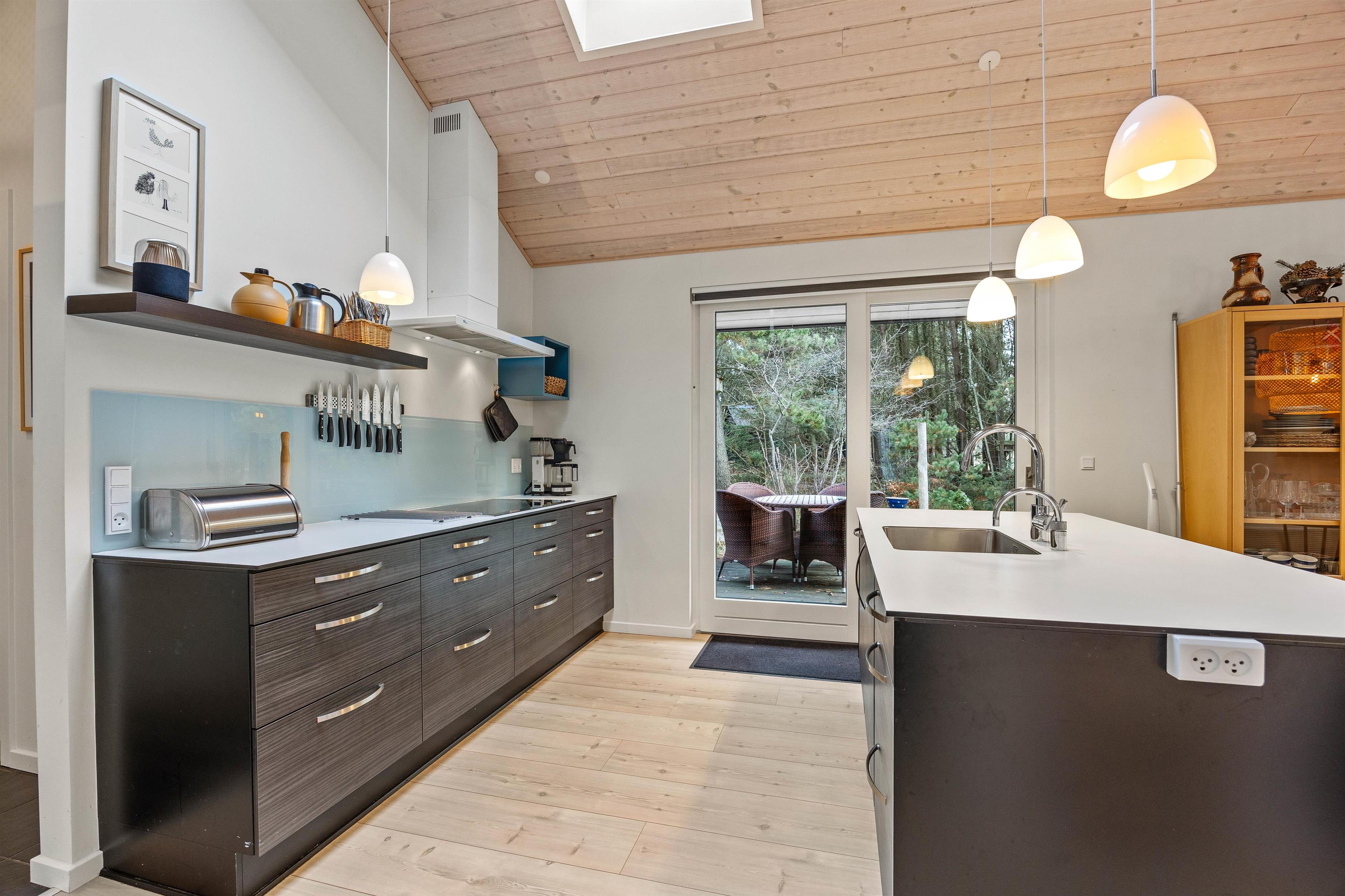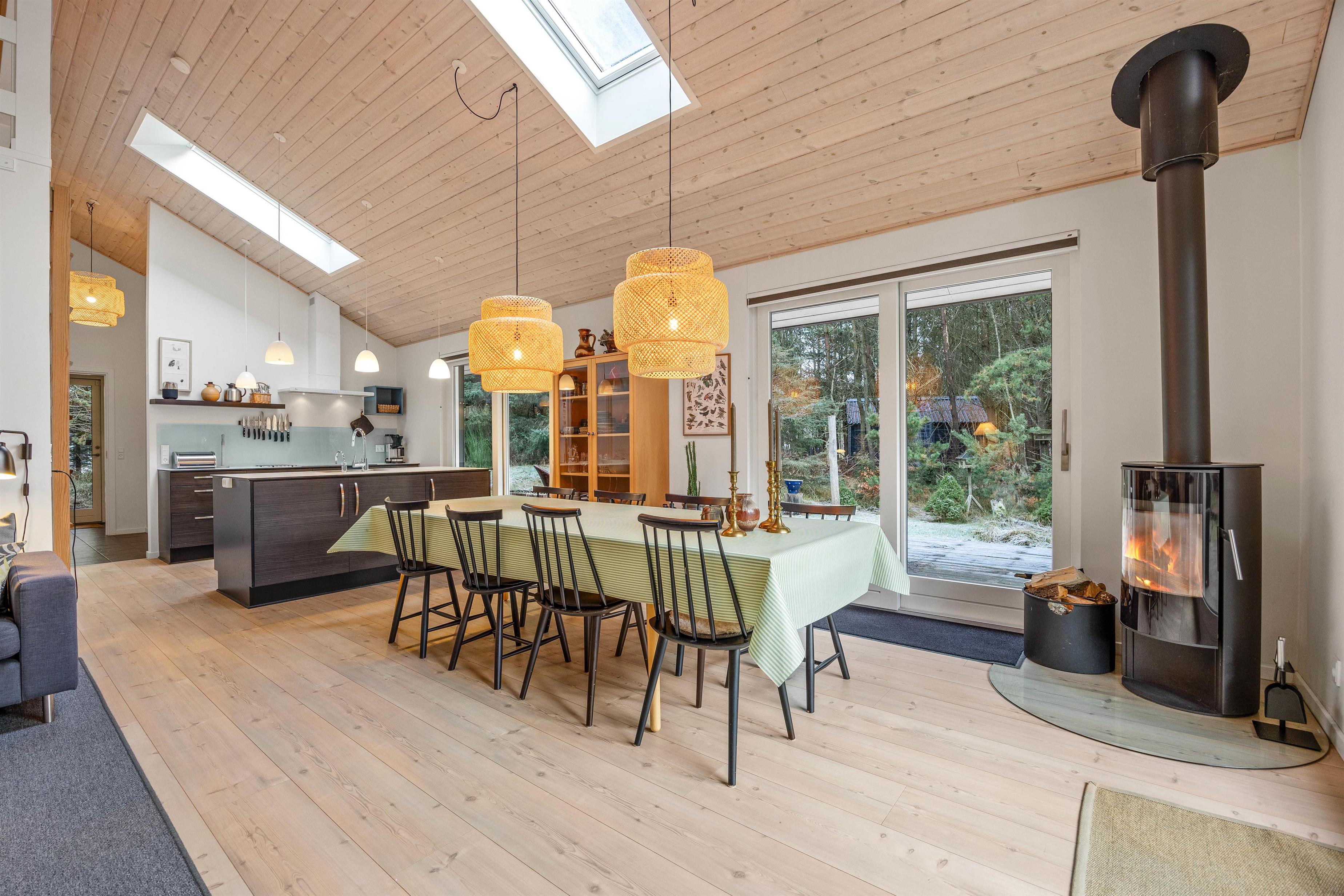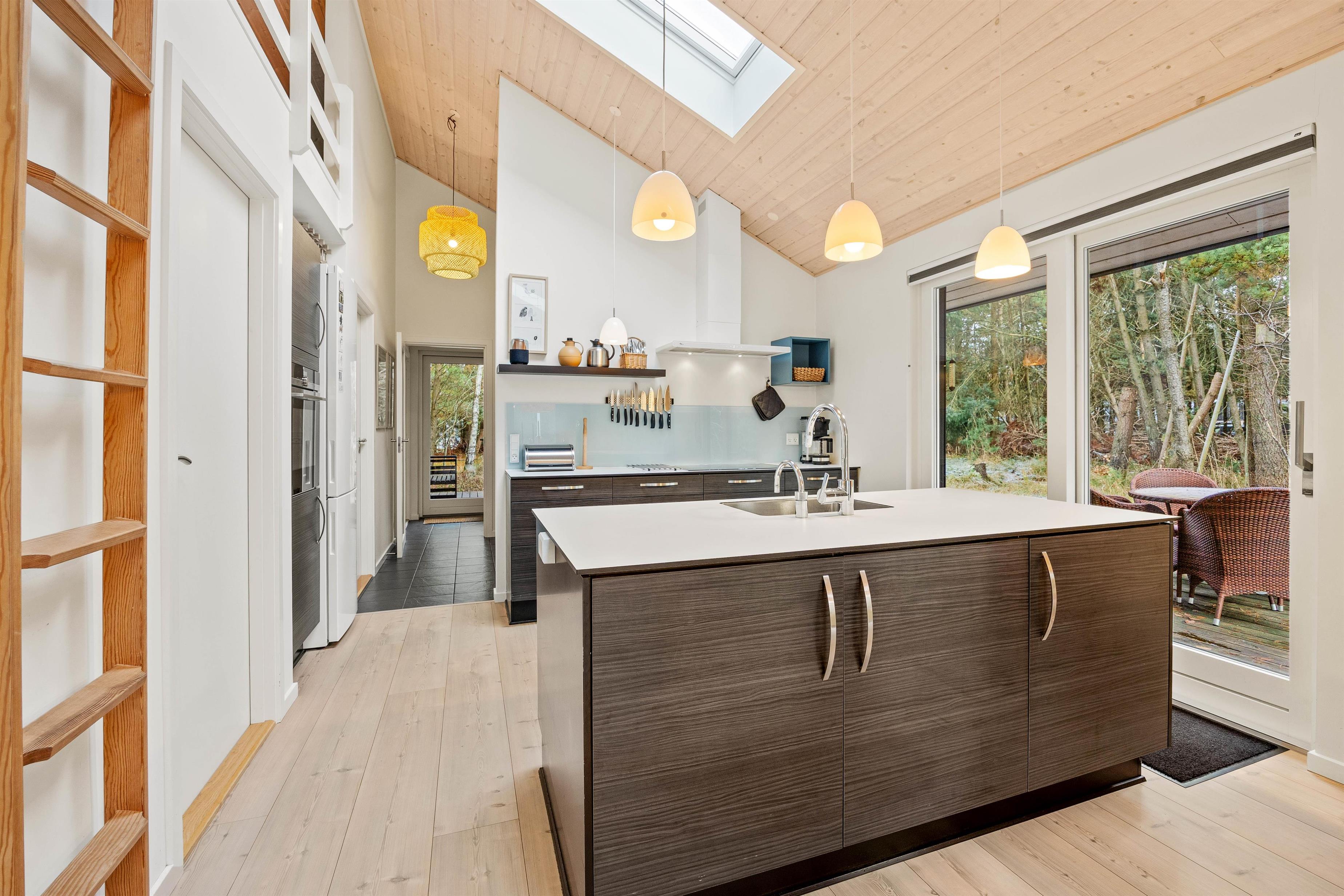Det åbne og fuldt udstyrede køkken er hjertet i sommerhuset. Med en separat fryser på 50 liter, en opvaskemaskine og en vaskemaskine har du alt, hvad du behøver til et behageligt ophold. Tilbered dine yndlingsretter og nyd dem på den hyggelige spiseplads ved de store vinduer eller på den solrige terrasse.