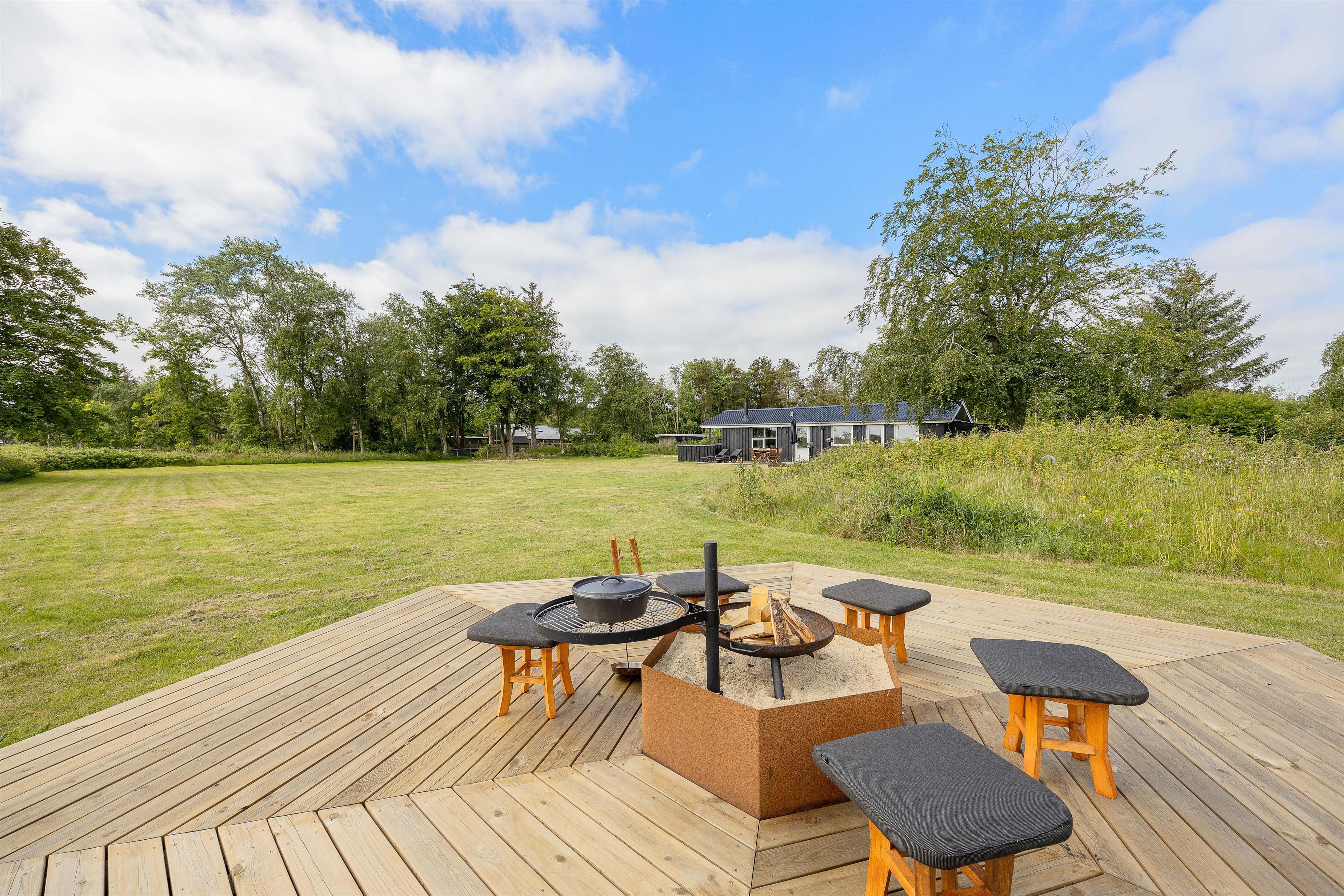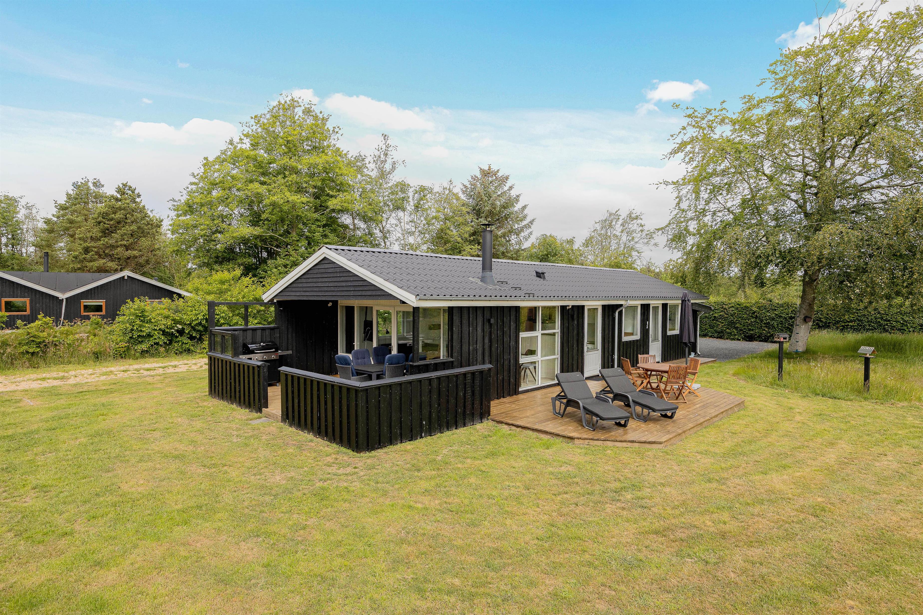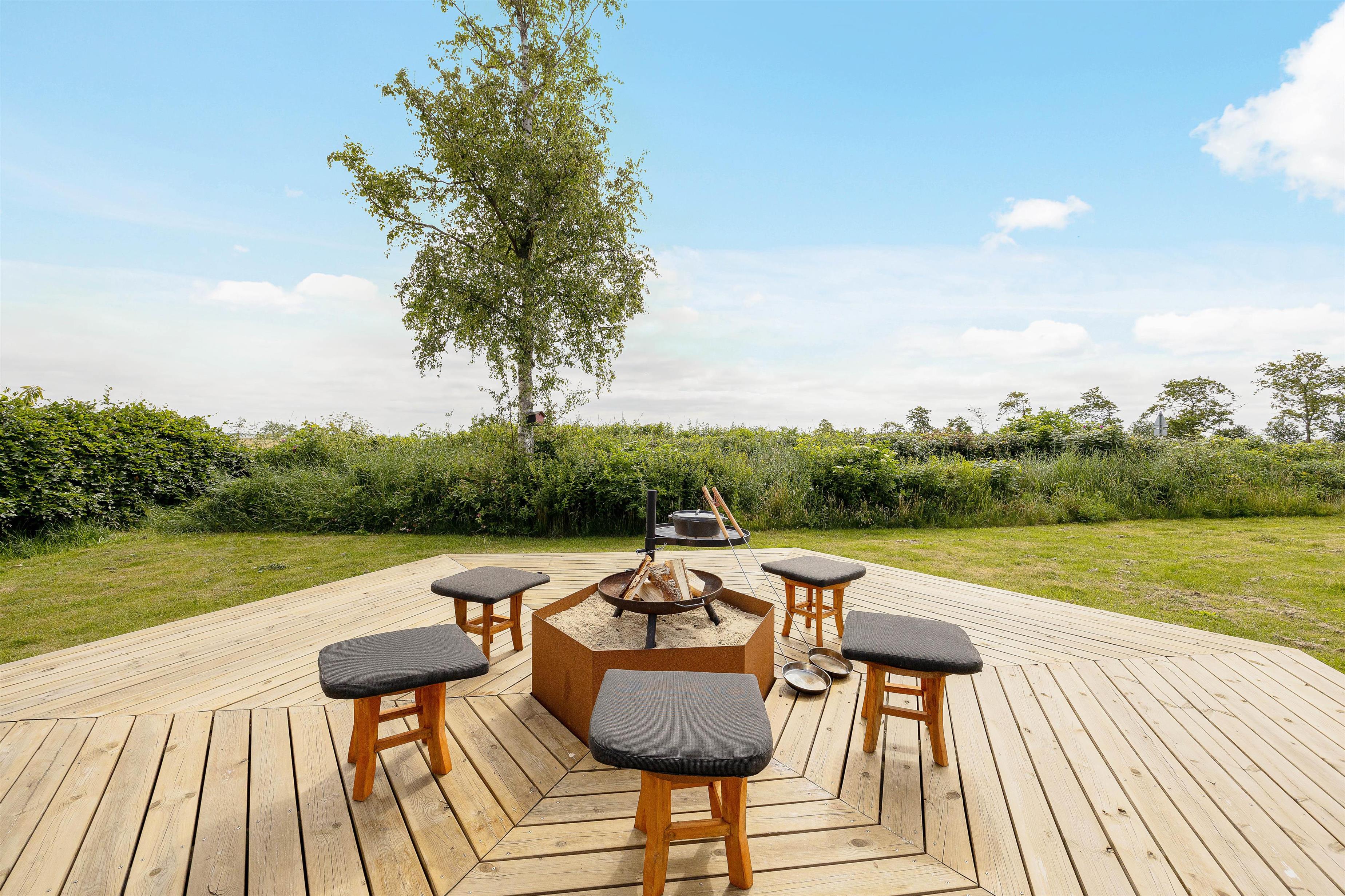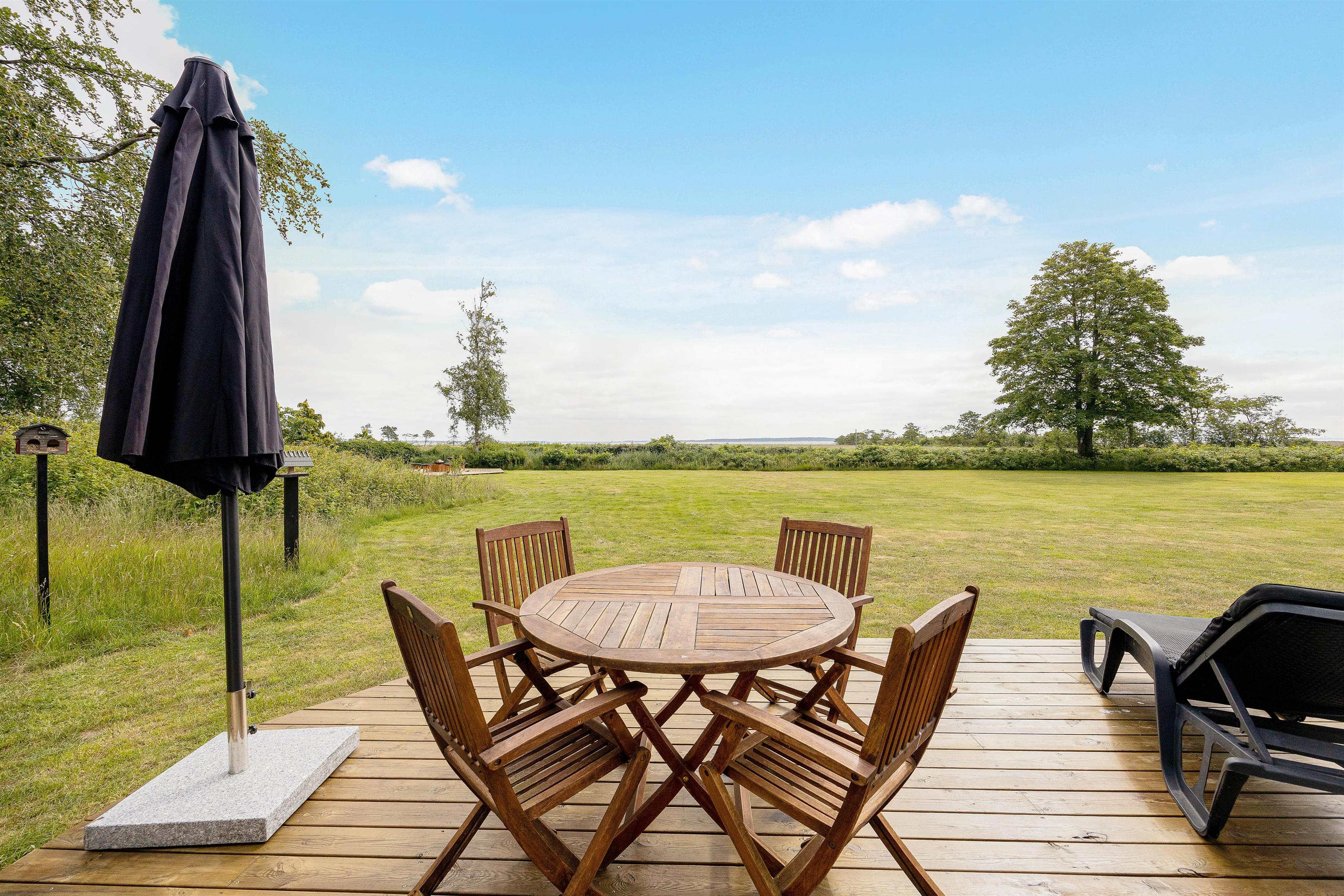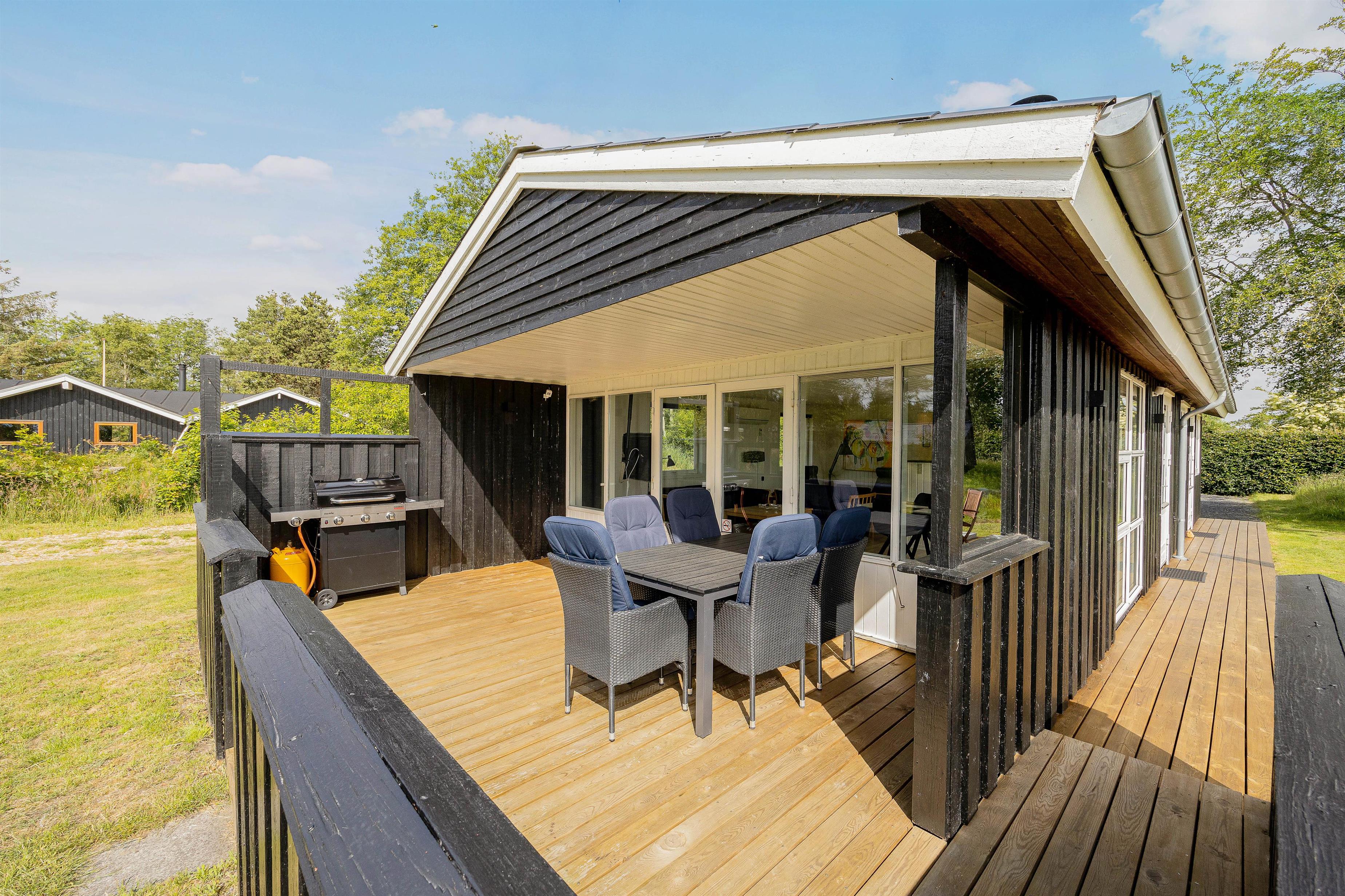 Sommerhusets terrasse er delvist overdækket, så om I foretrækker at sidde i sol eller skygge, har I altså mulighed for det her. Derudover er terrassen afskærmet, så I kan sidde i læ for vinden. På terrassen har I havemøbler og liggestole til rådighed, som I kan læne jer godt tilbage i og bare slappe helt af.