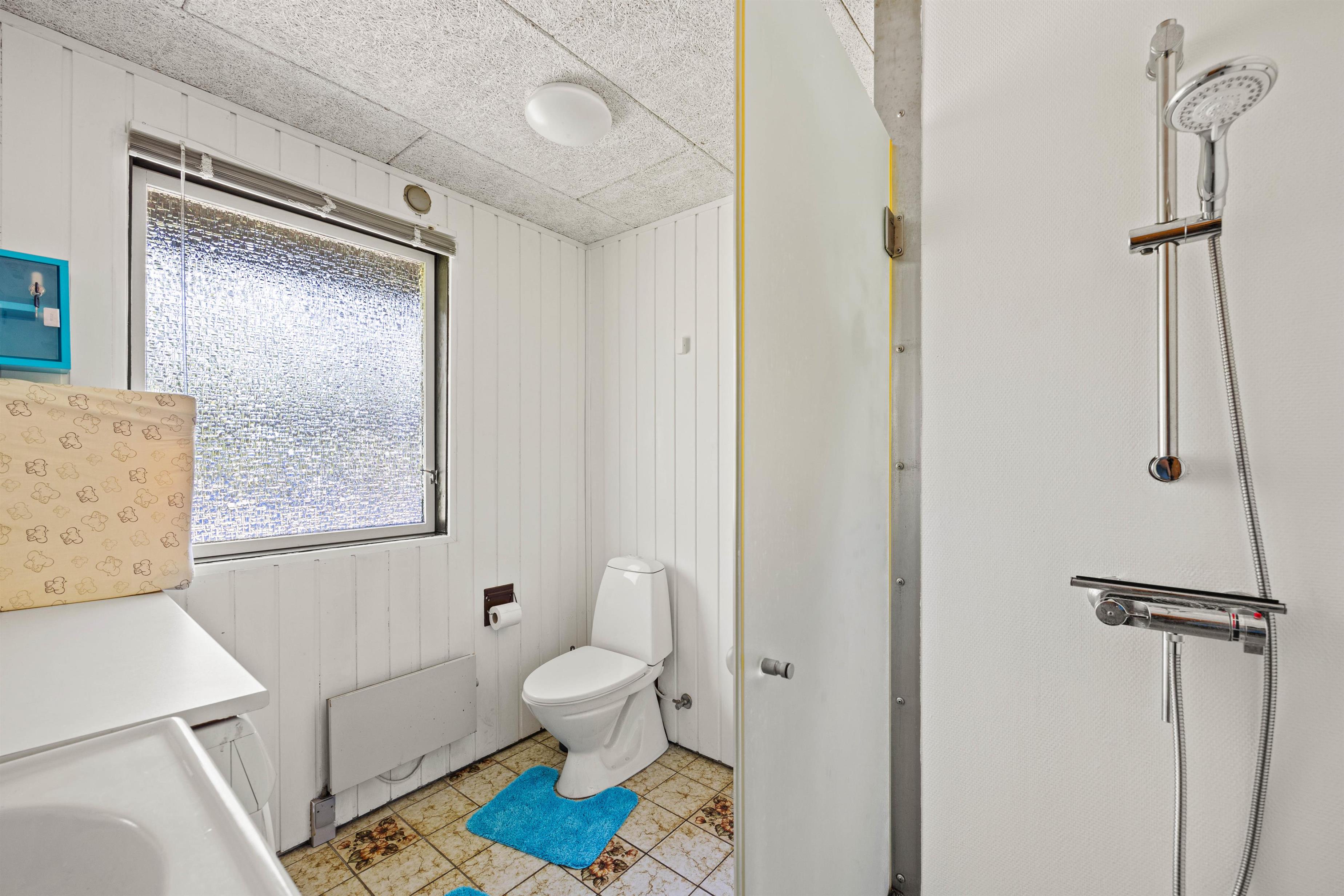 Når I har taget et forfriskende bad i sommerhusets badeværelse, hvor gulvvarmen luner jeres fødder, kan I i køkkenet på Fyrrevænget 29 kokkerere dejlig feriemad og samtidigt følge med i de øvrige aktiviteter i husets hjerte.